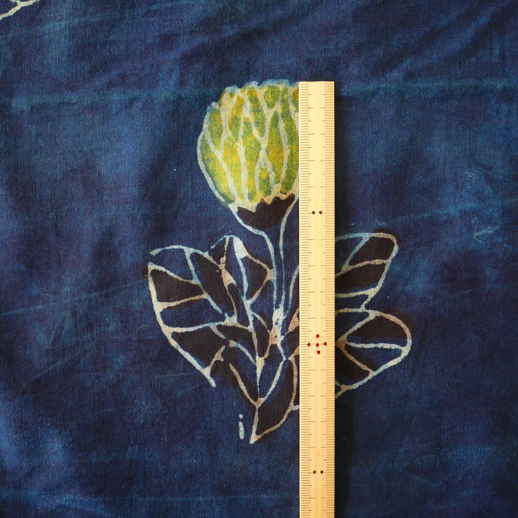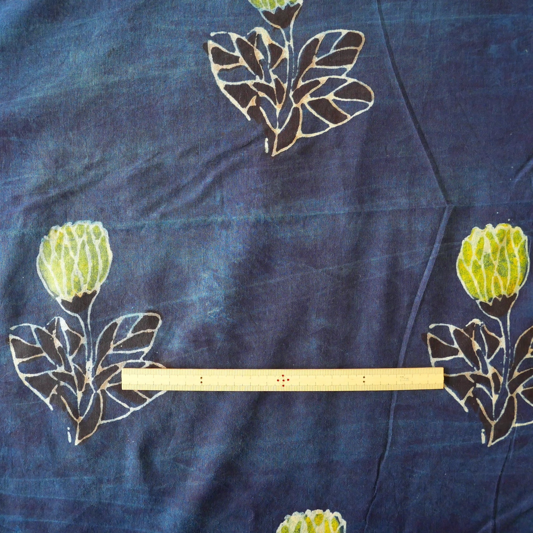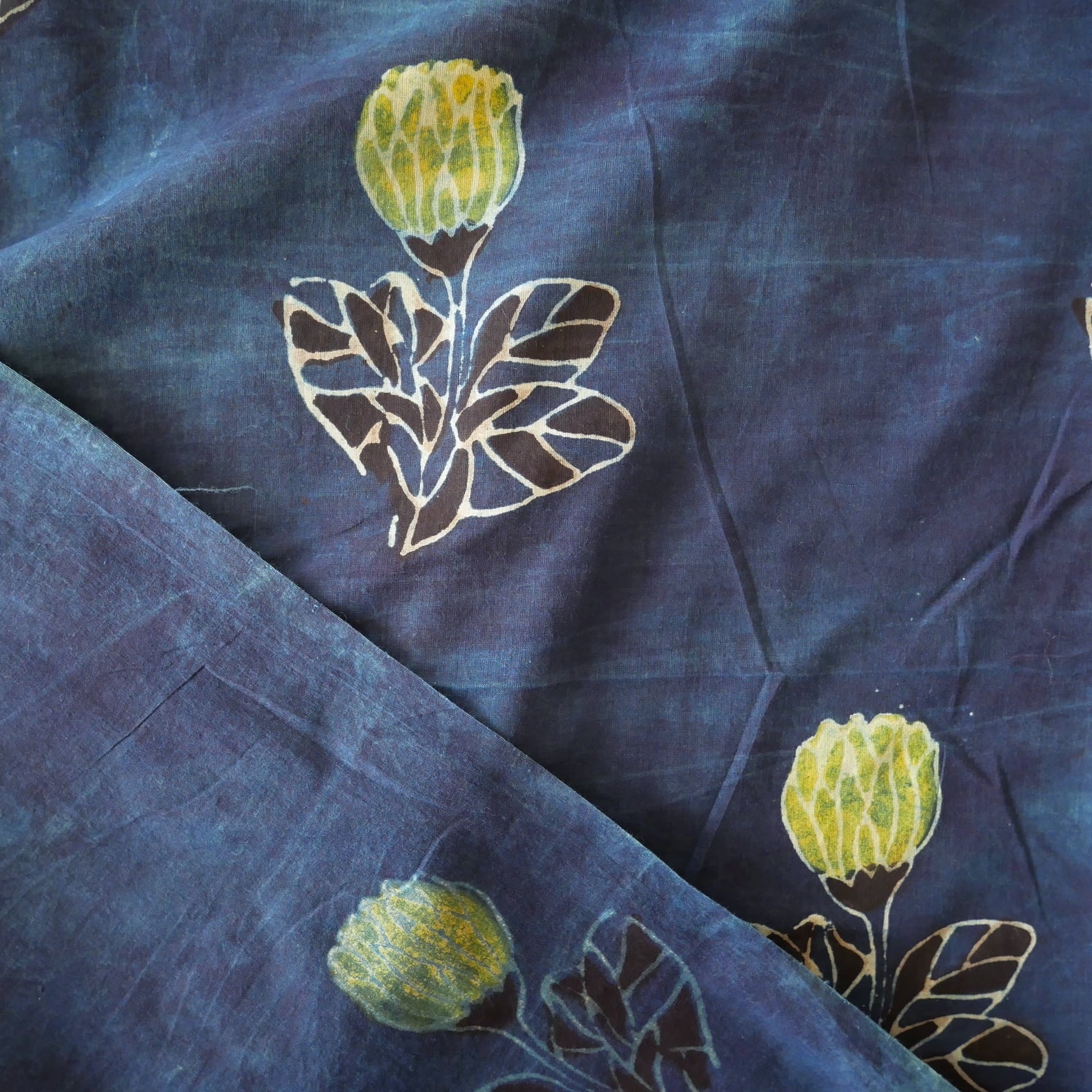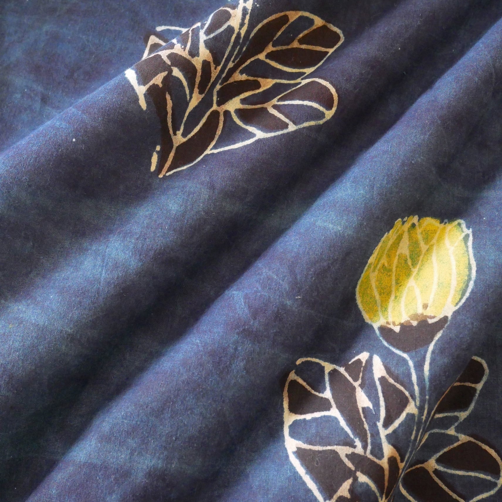 深みのあるインディゴブルーをベースに、やさしい黄色で彩られた花モチーフが静かに浮かび上がる、天然染めのハンドブロックプリント生地です。