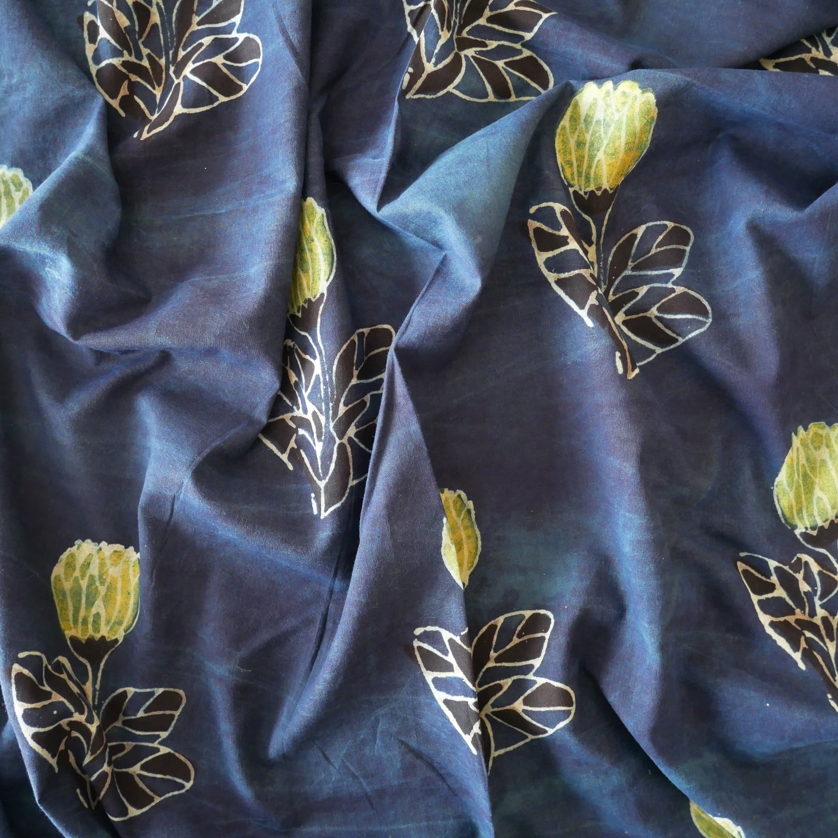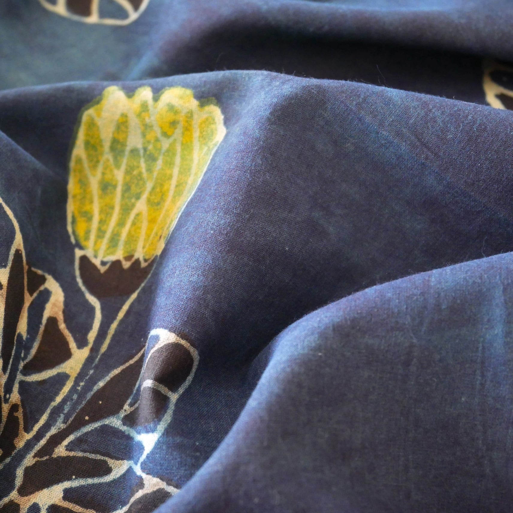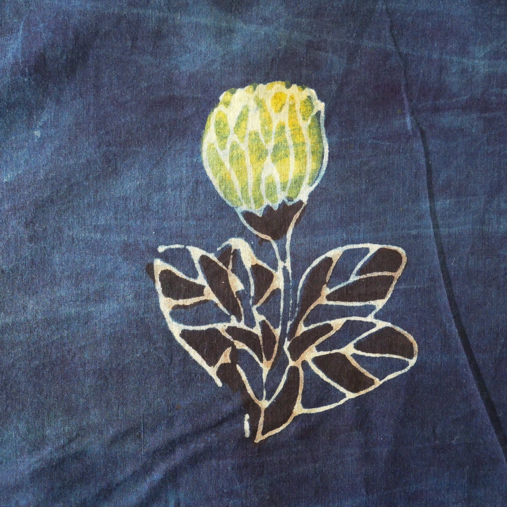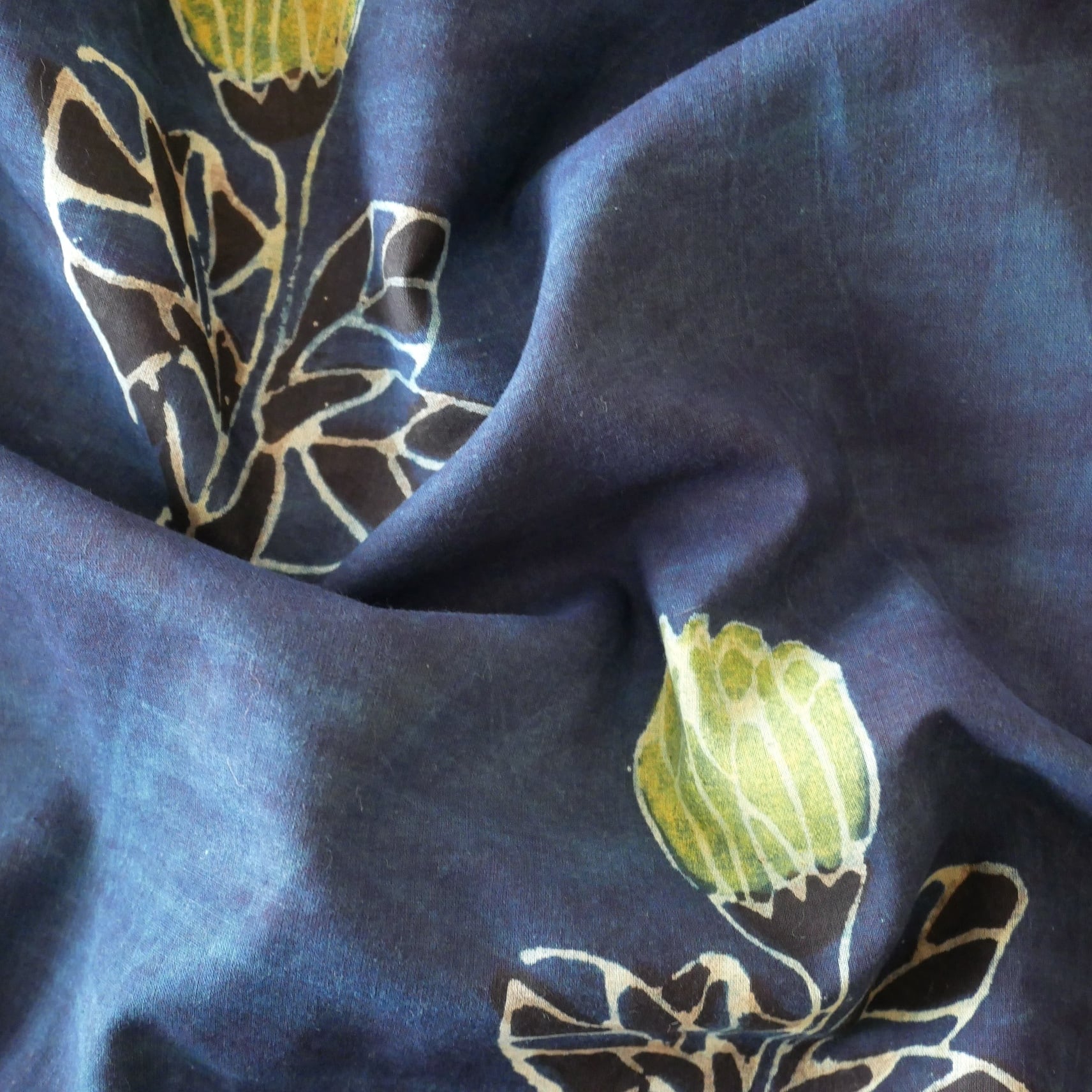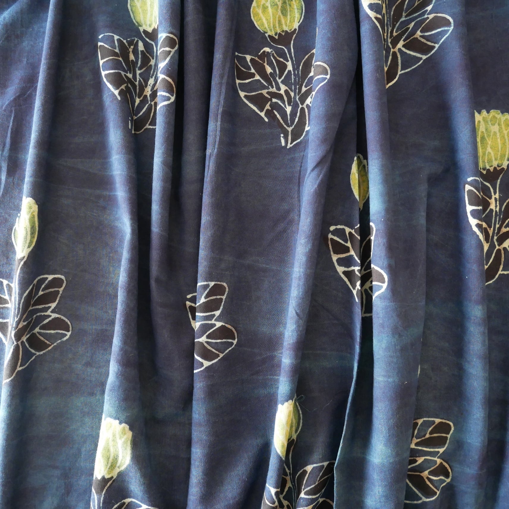 深みのあるインディゴブルーをベースに、やさしい黄色で彩られた花モチーフが静かに浮かび上がる、天然染めのハンドブロックプリント生地です。