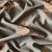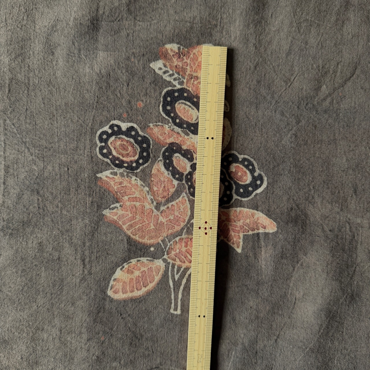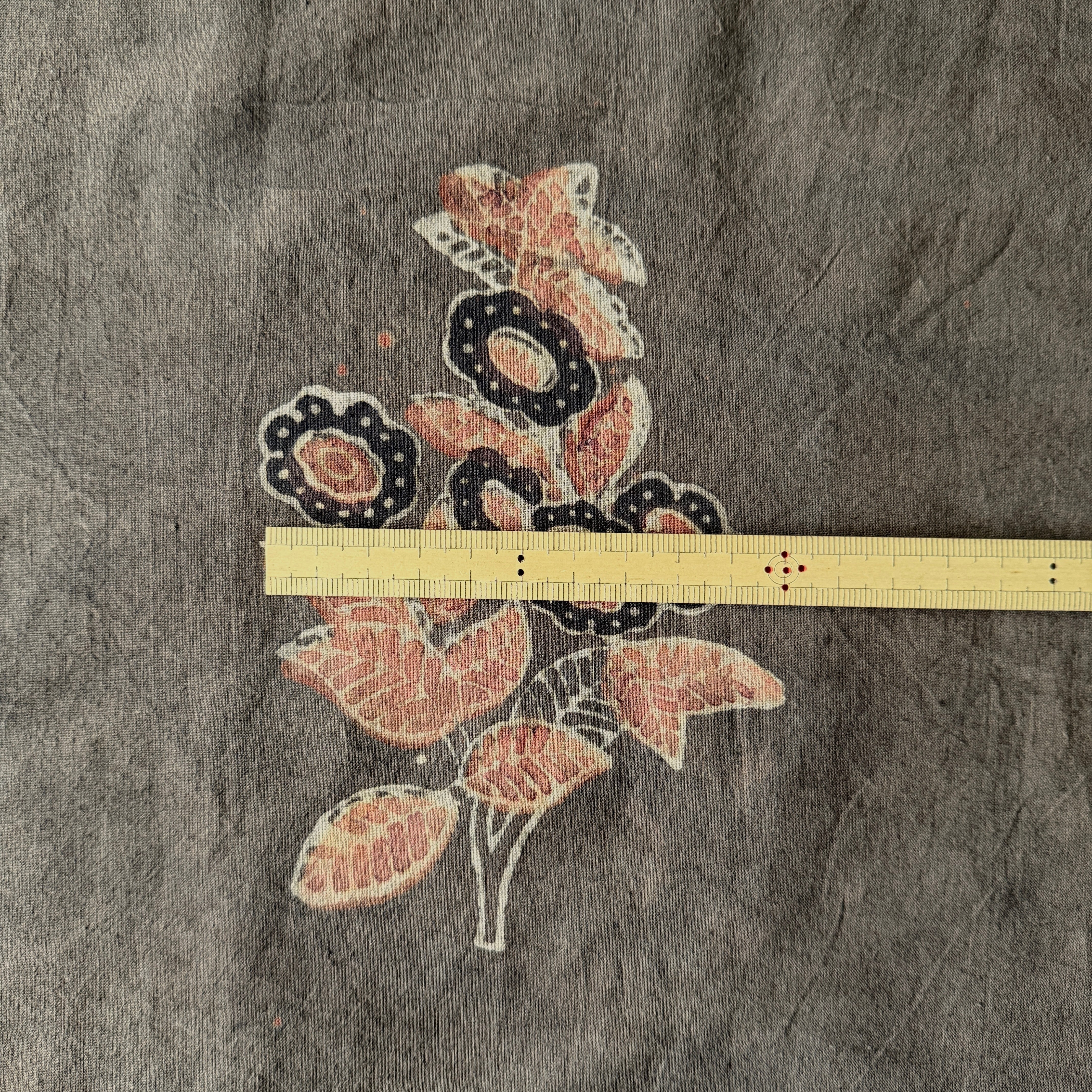 やわらかく落ち着いたブラウンをベースに、ブラックで描かれた花と、くすみを含んだピンクの葉が印象的な、天然染めのハンドブロックプリント生地です。