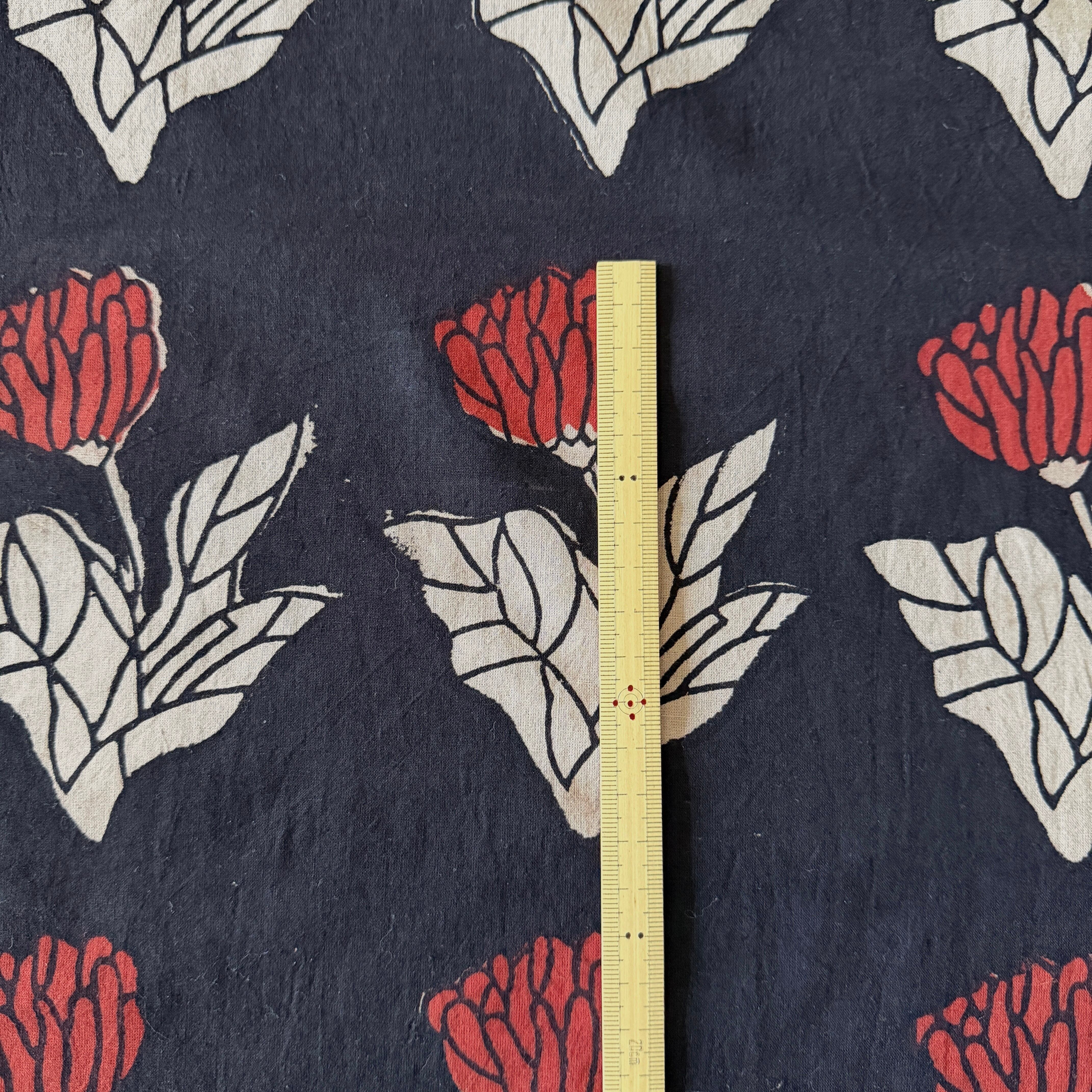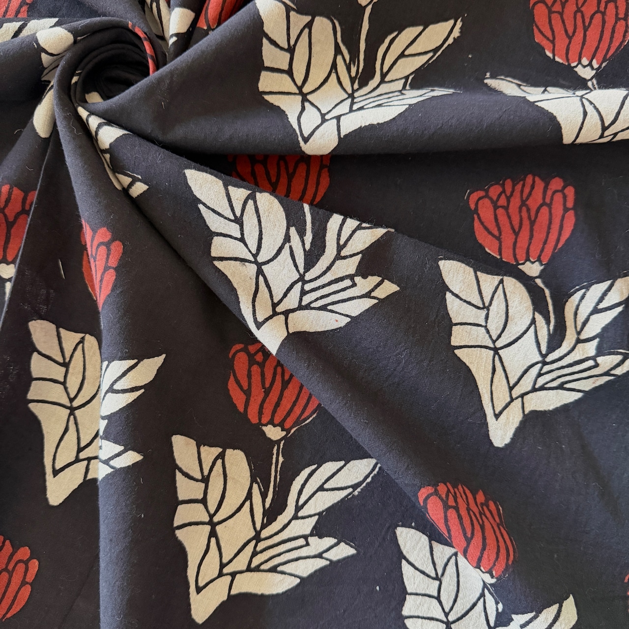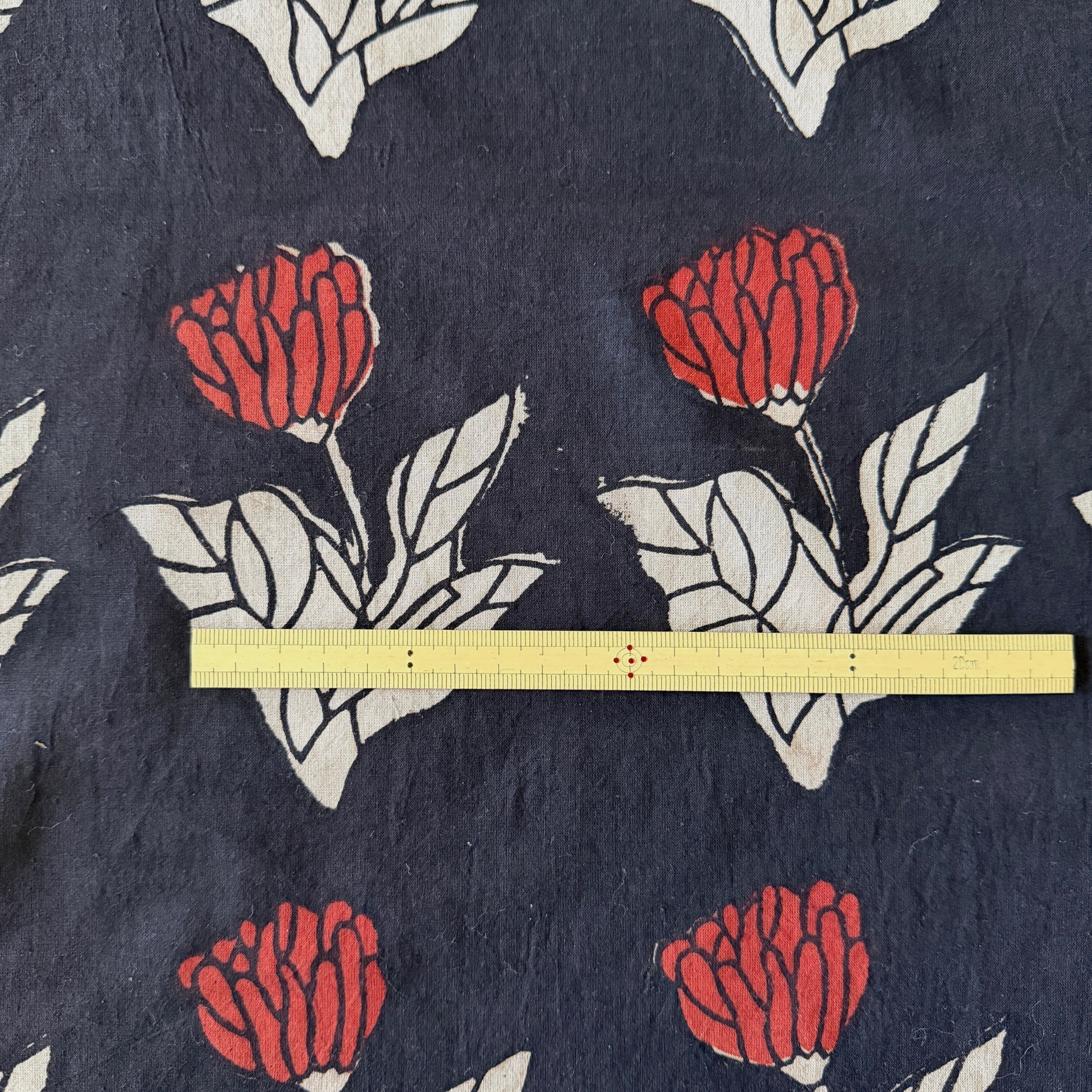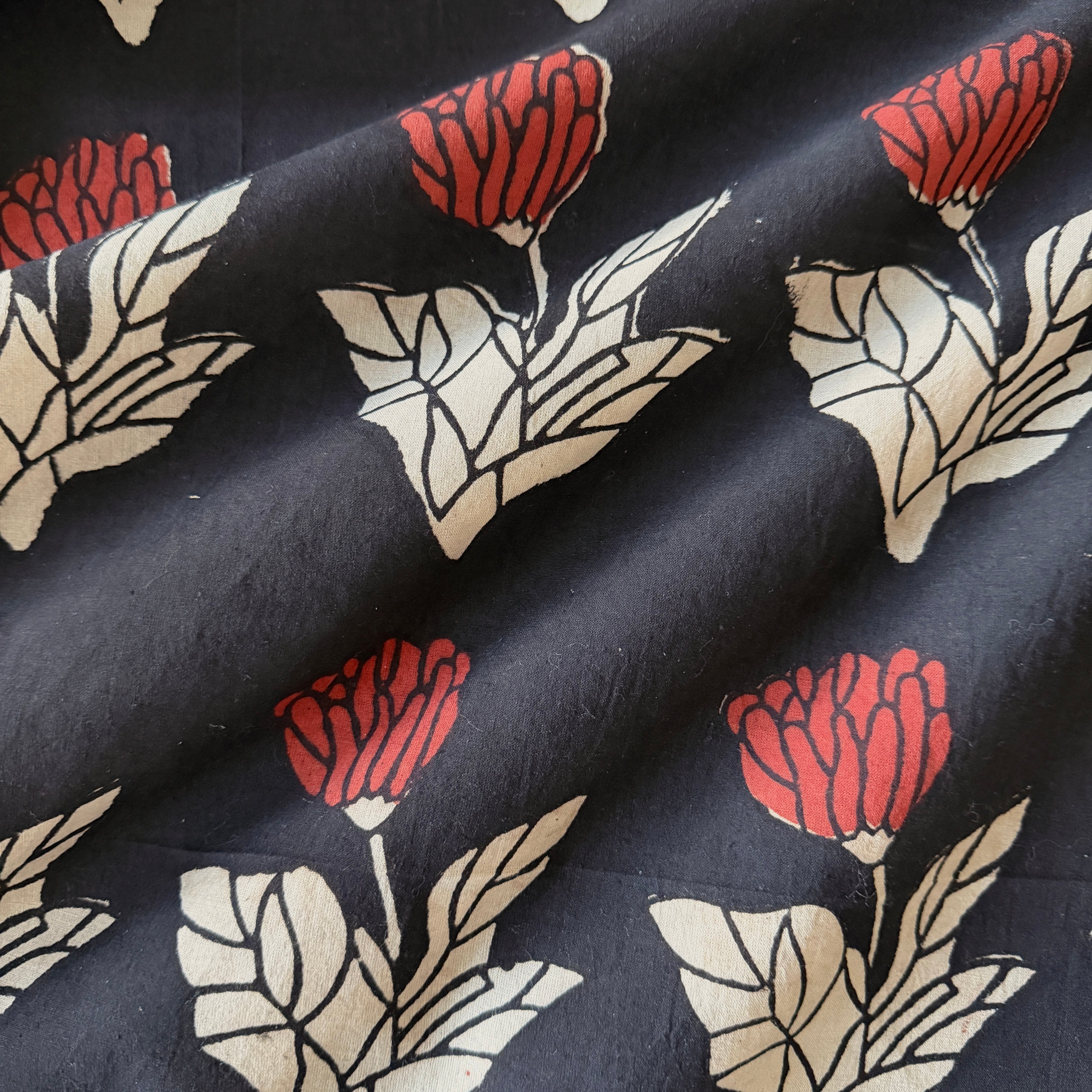ハンドブロックプリント生地 インド更紗 綿生地 Bagru ブラックベース×レッドフラワー 薄手コットン JE-260116