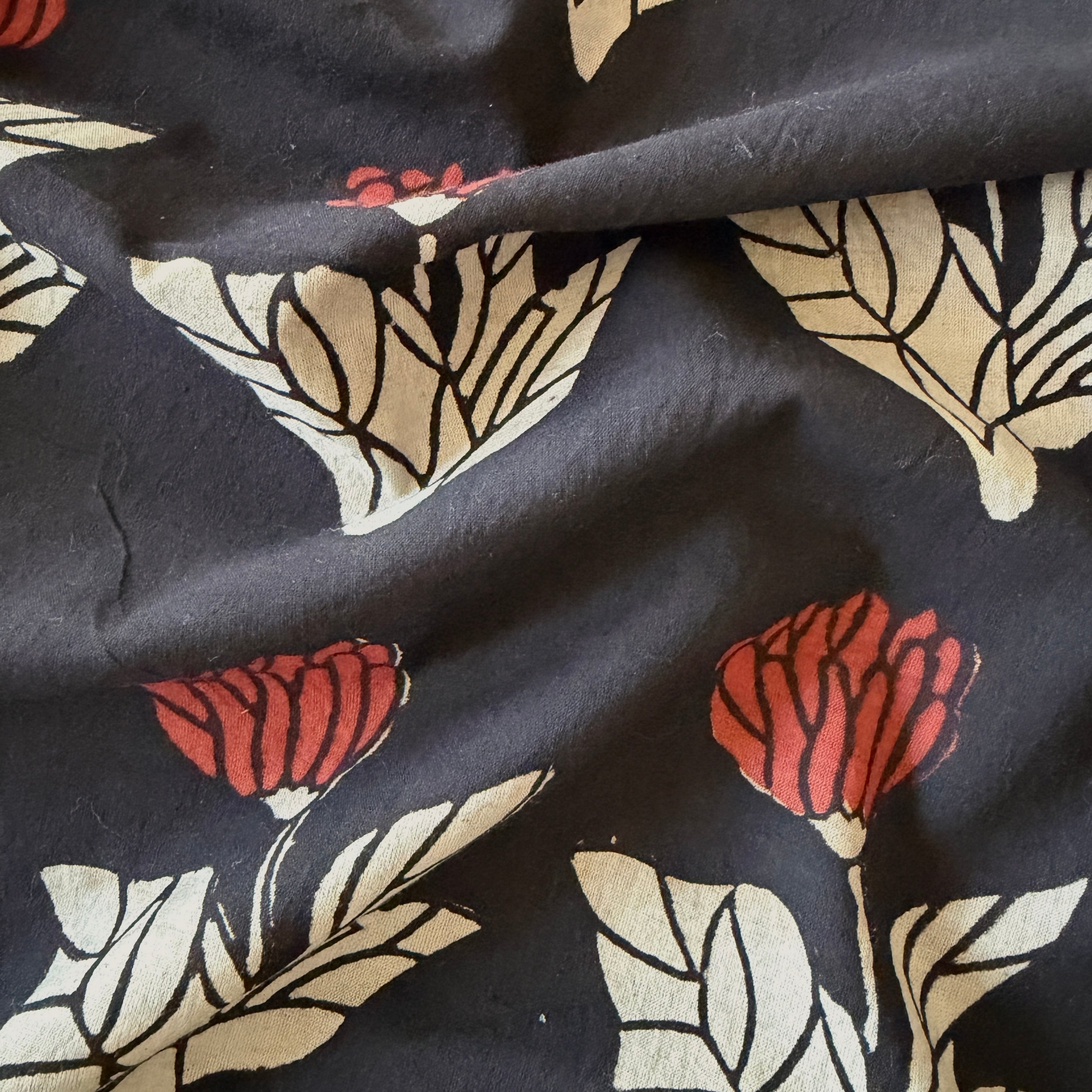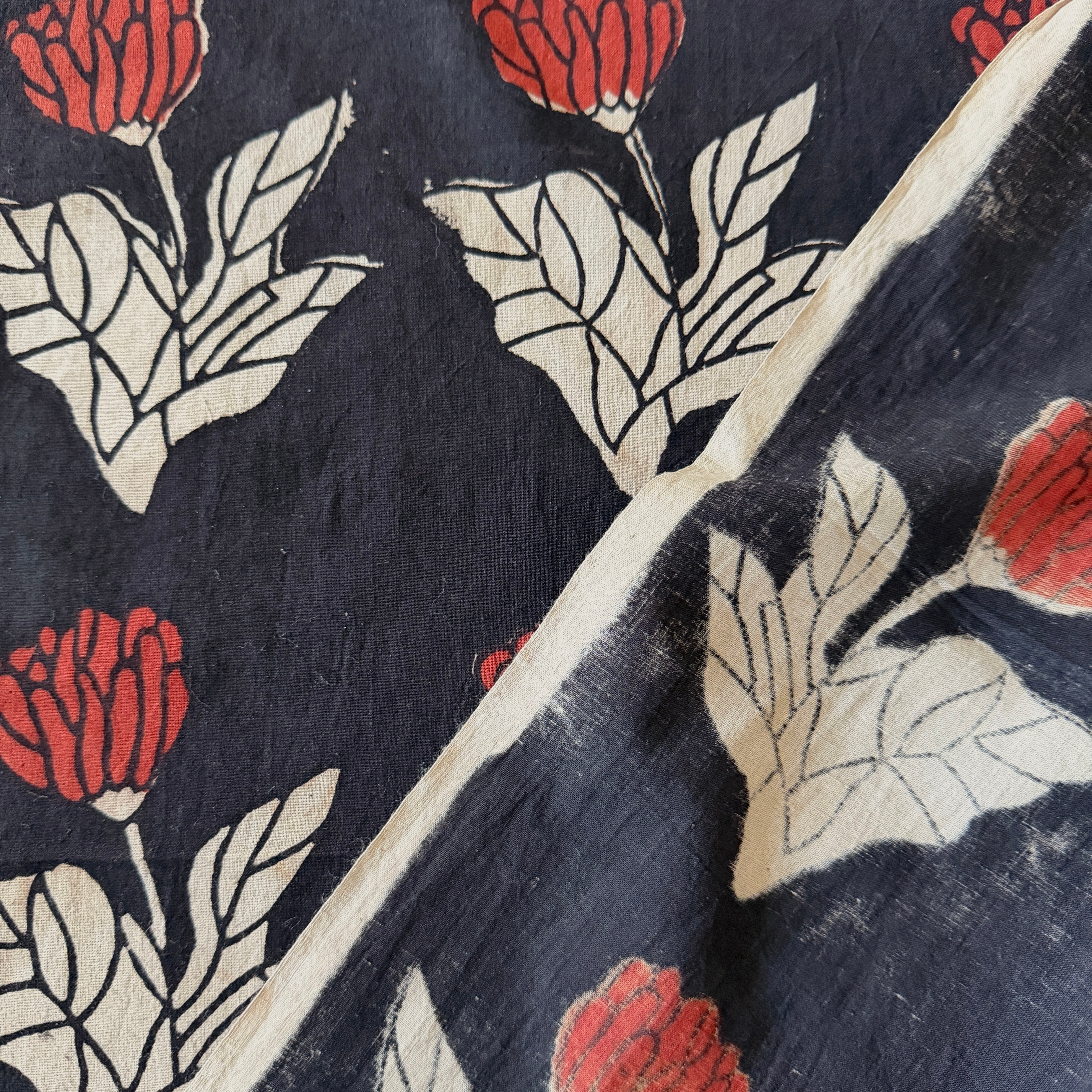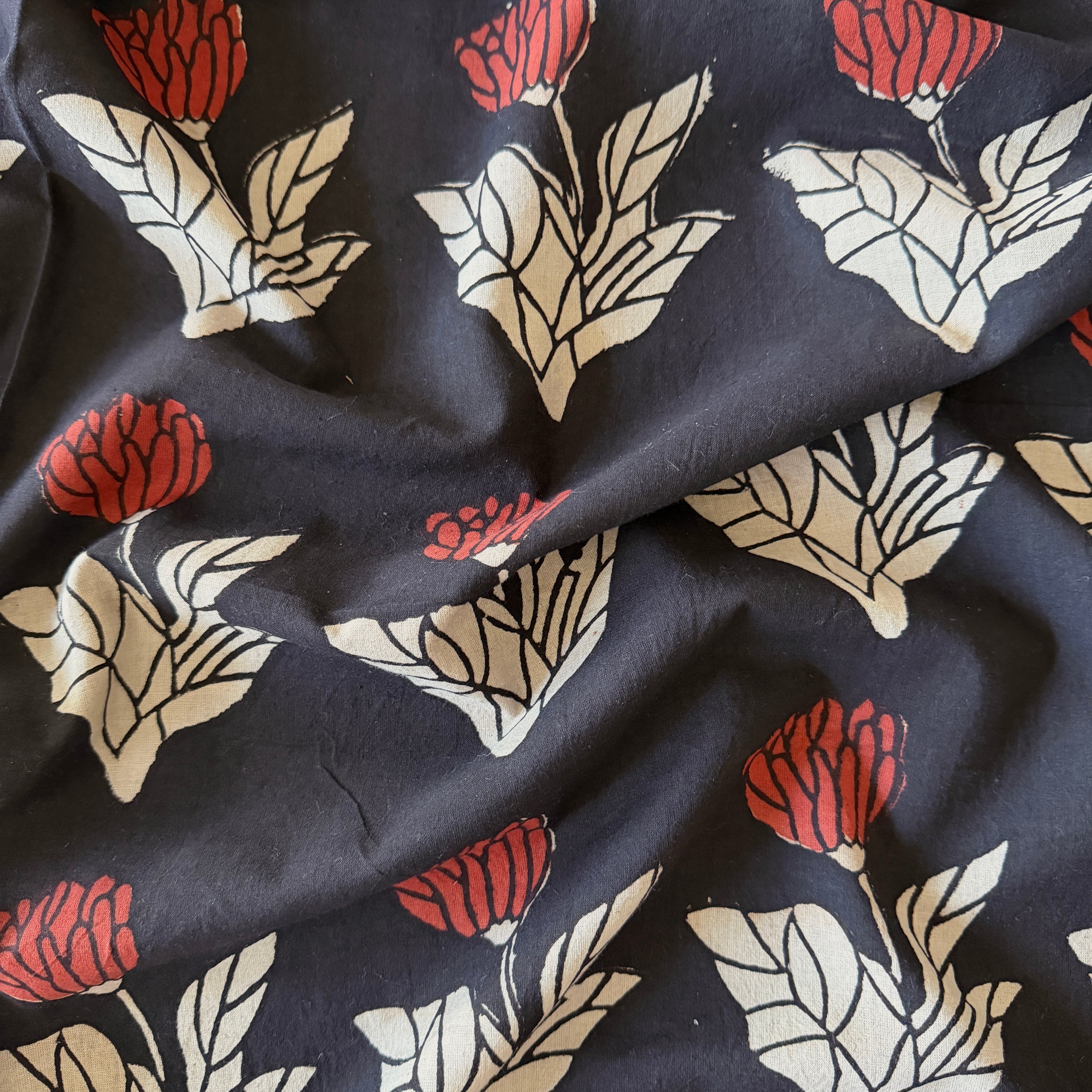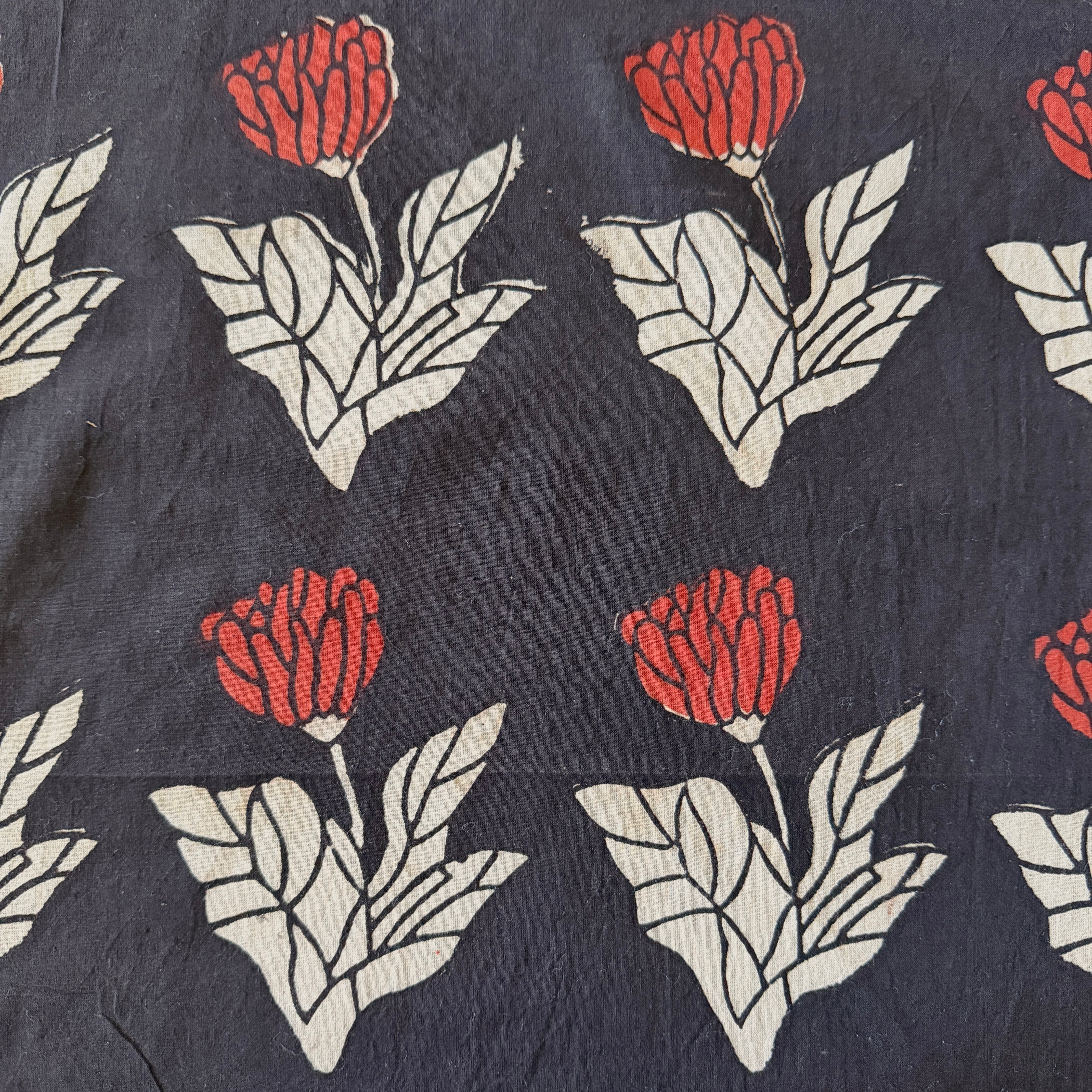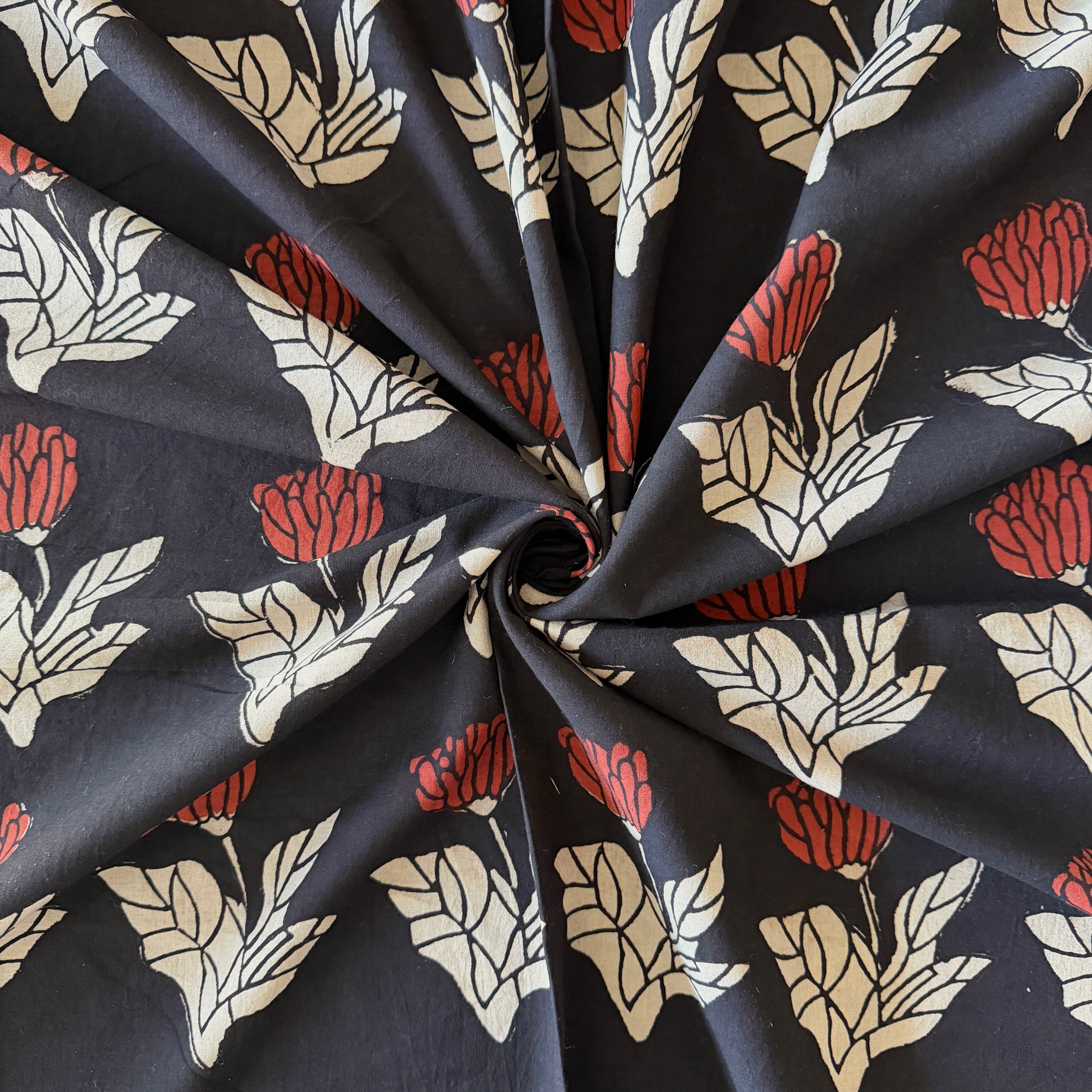 ハンドブロックプリント生地 インド更紗 綿生地 Bagru ブラックベース×レッドフラワー 薄手コットン JE-260116