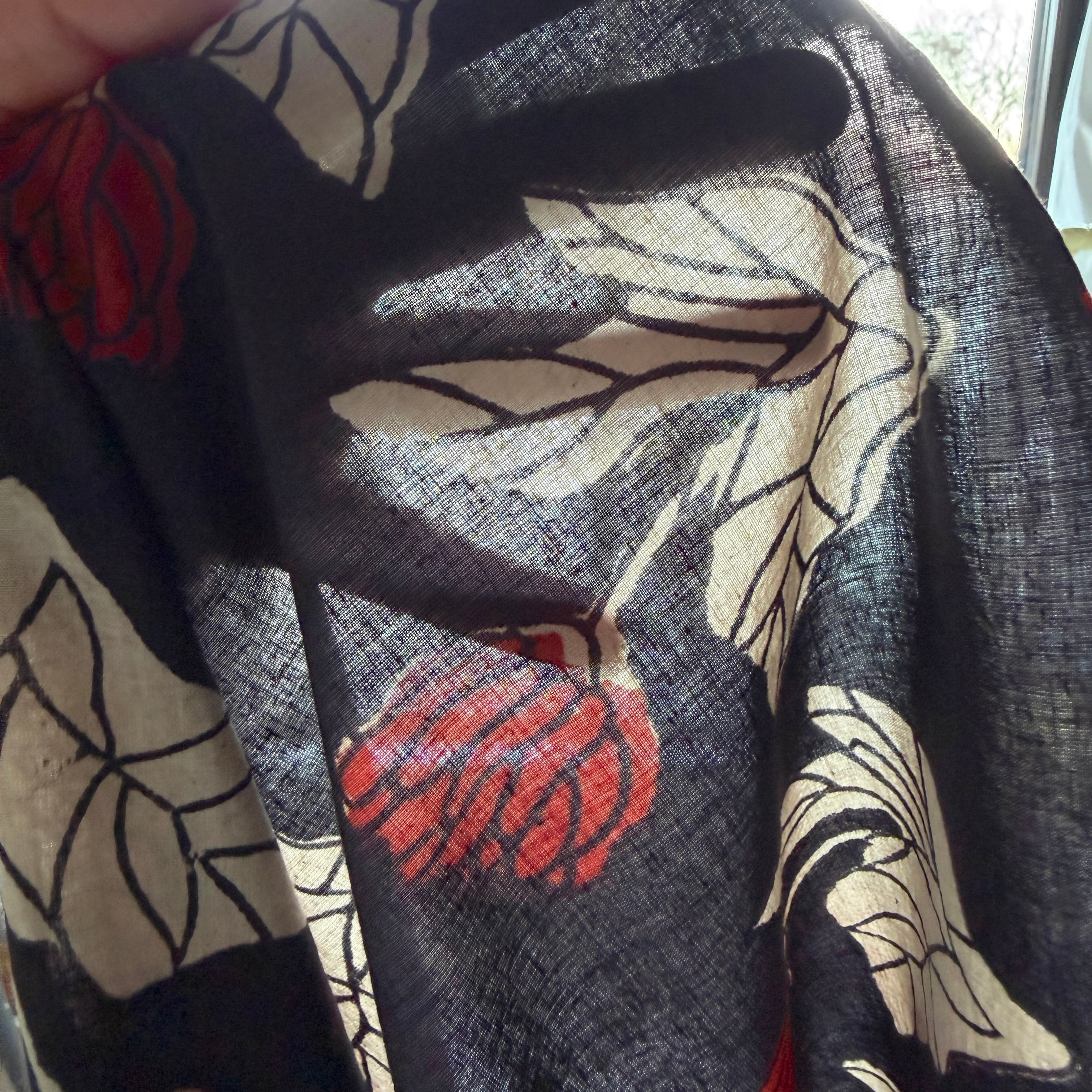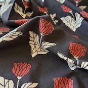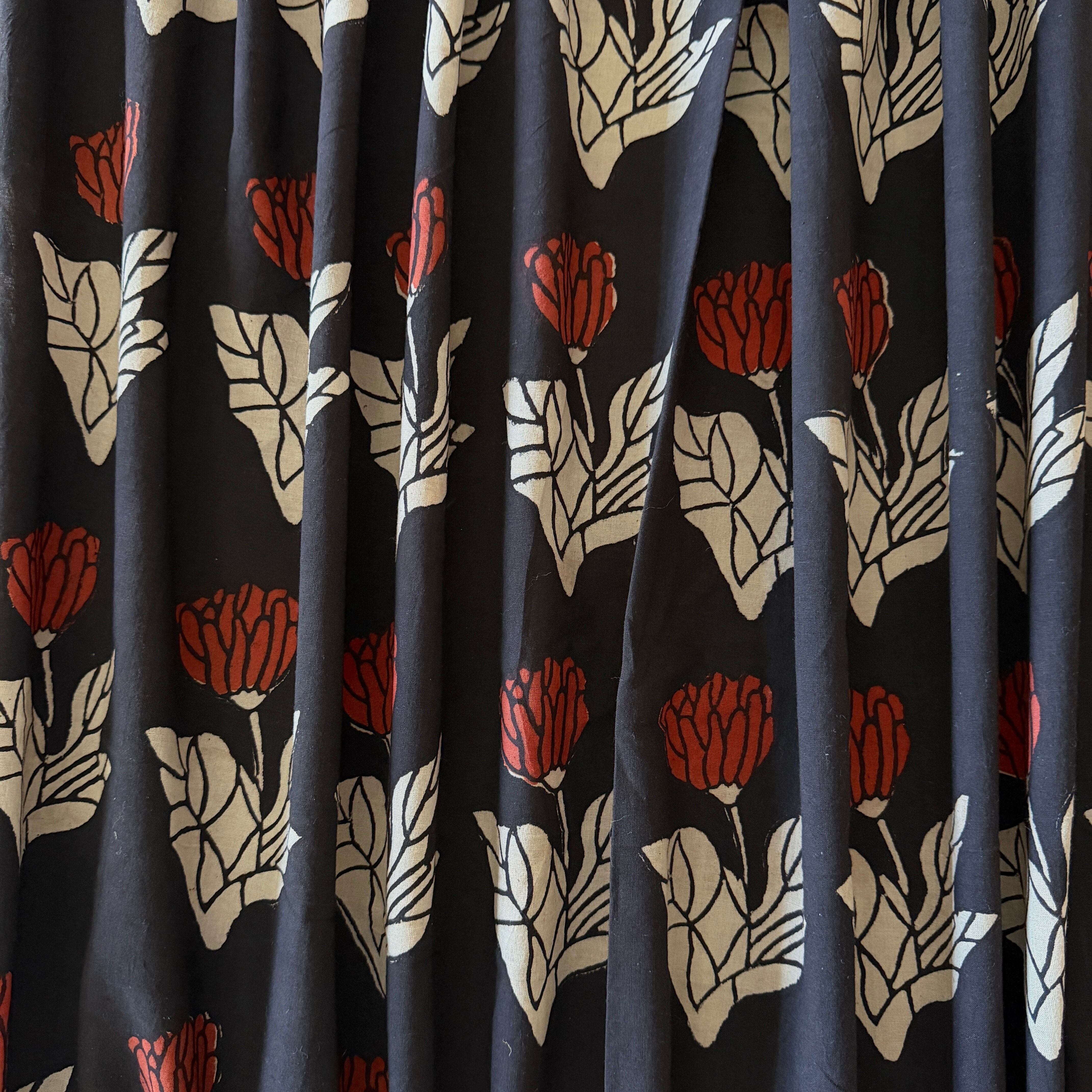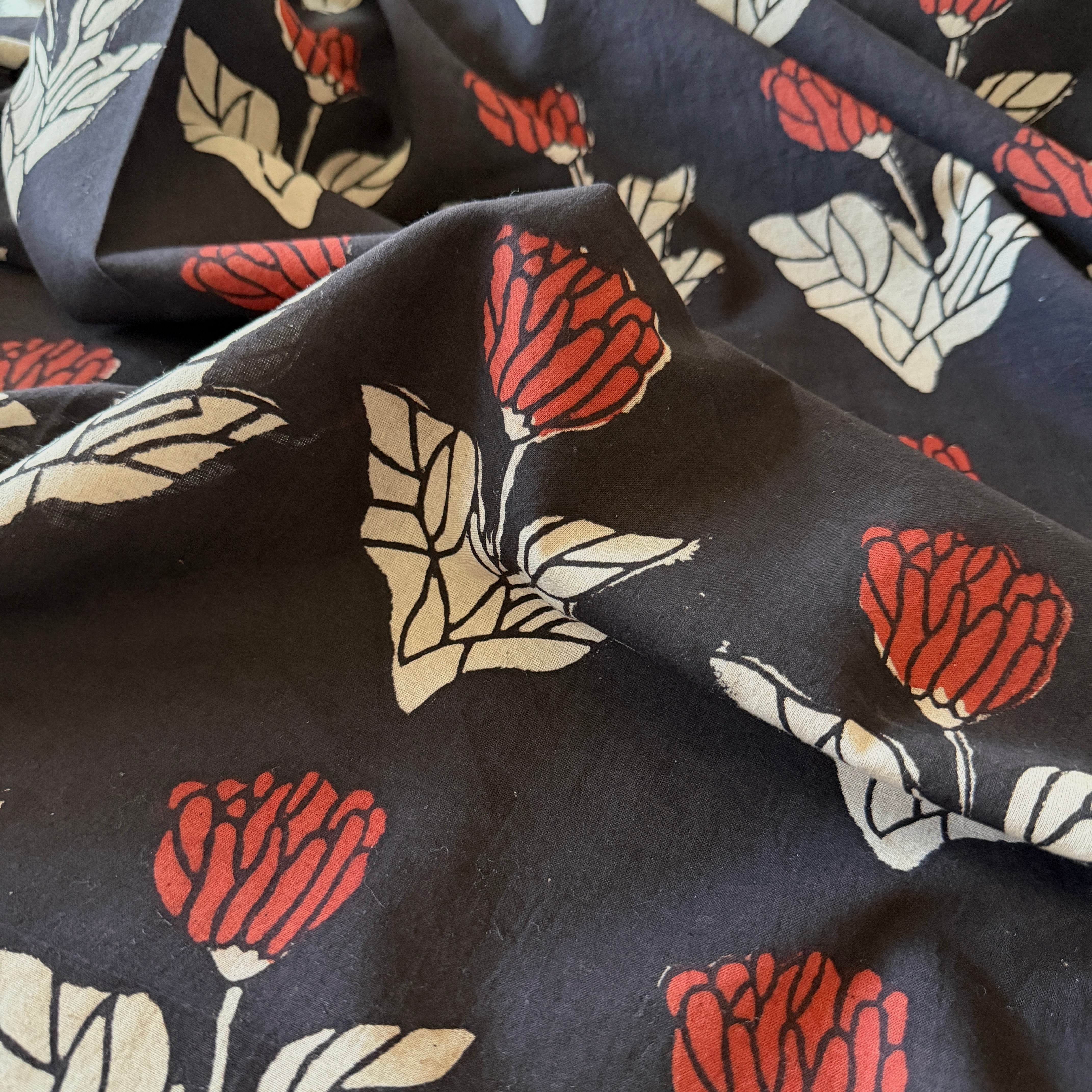 ブラックベースに、赤い花が印象的に描かれた、バグルーのハンドブロックプリント生地です。