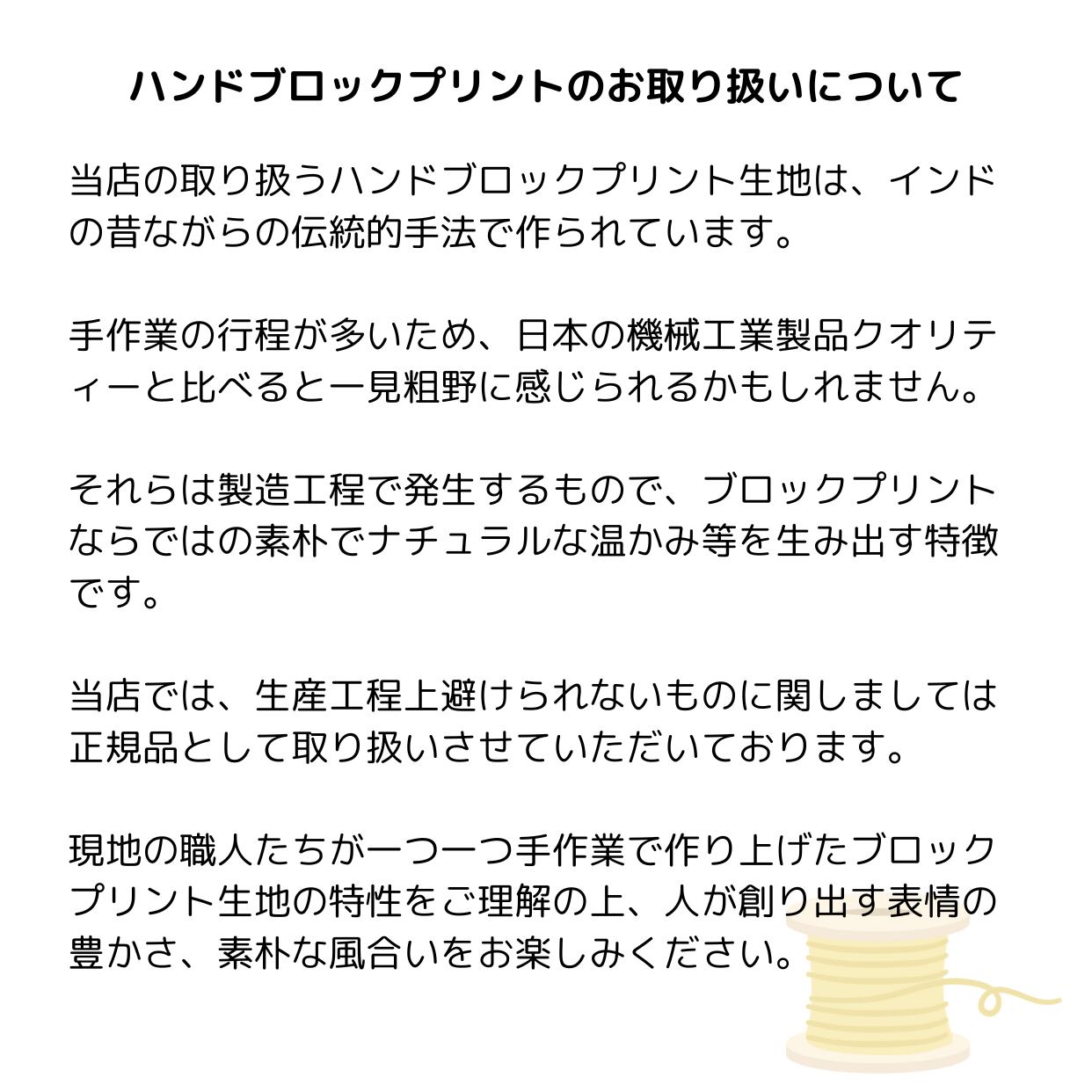 ・ハンドブロックプリント特有のにじみやズレ、かすれや色ムラが見られることがあります。手仕事ならではの表情としてお楽しみいただけますと幸いです。