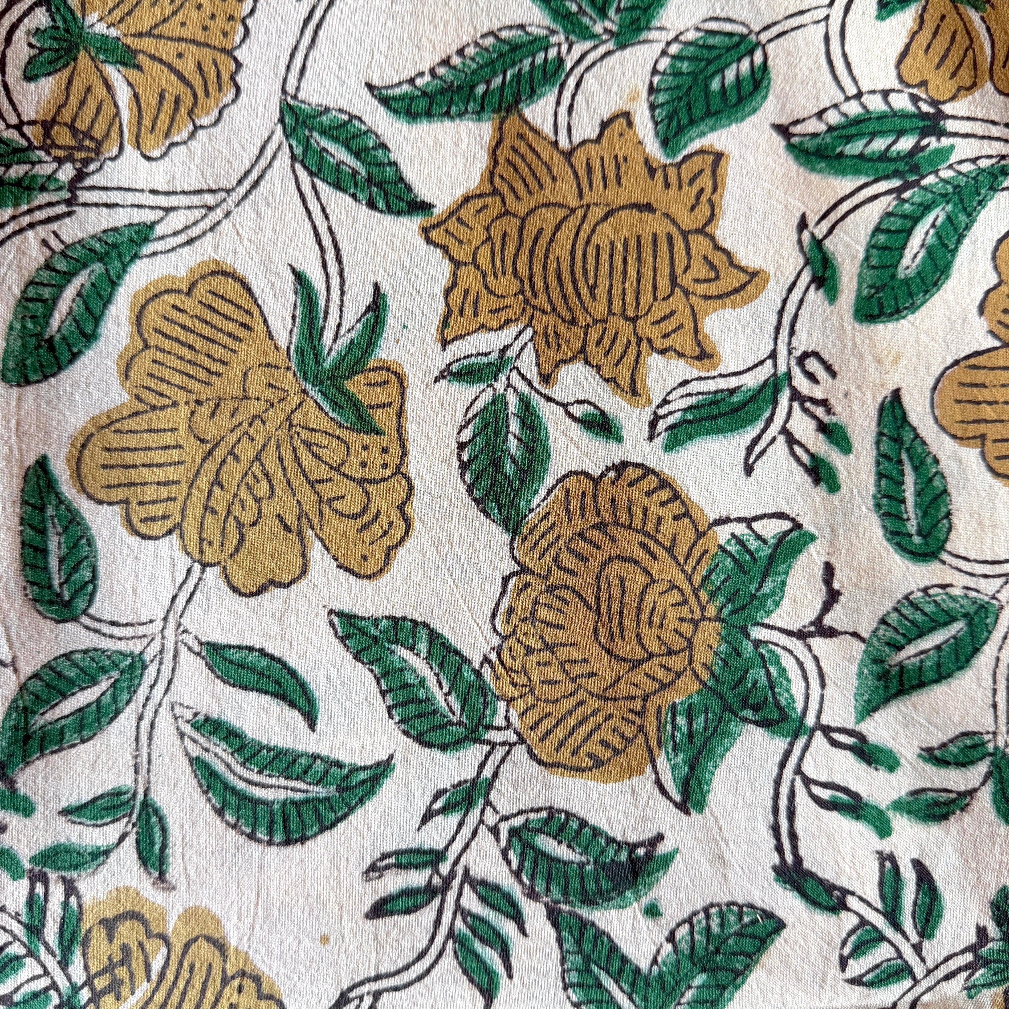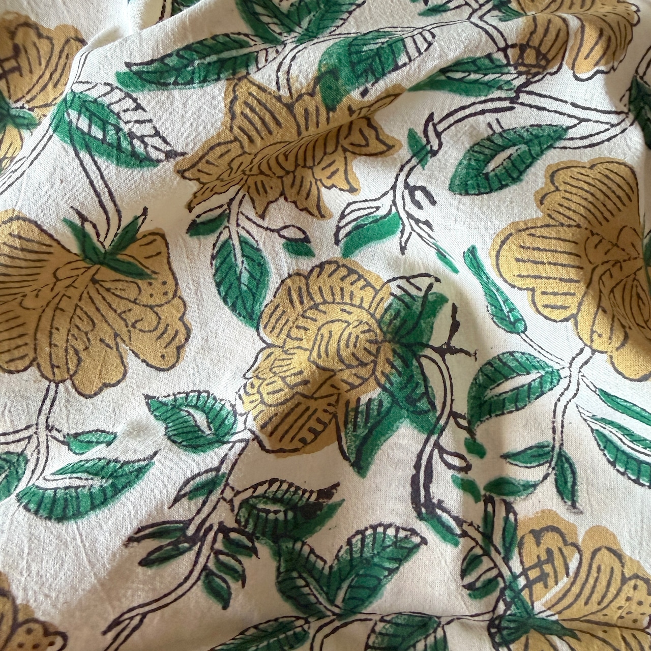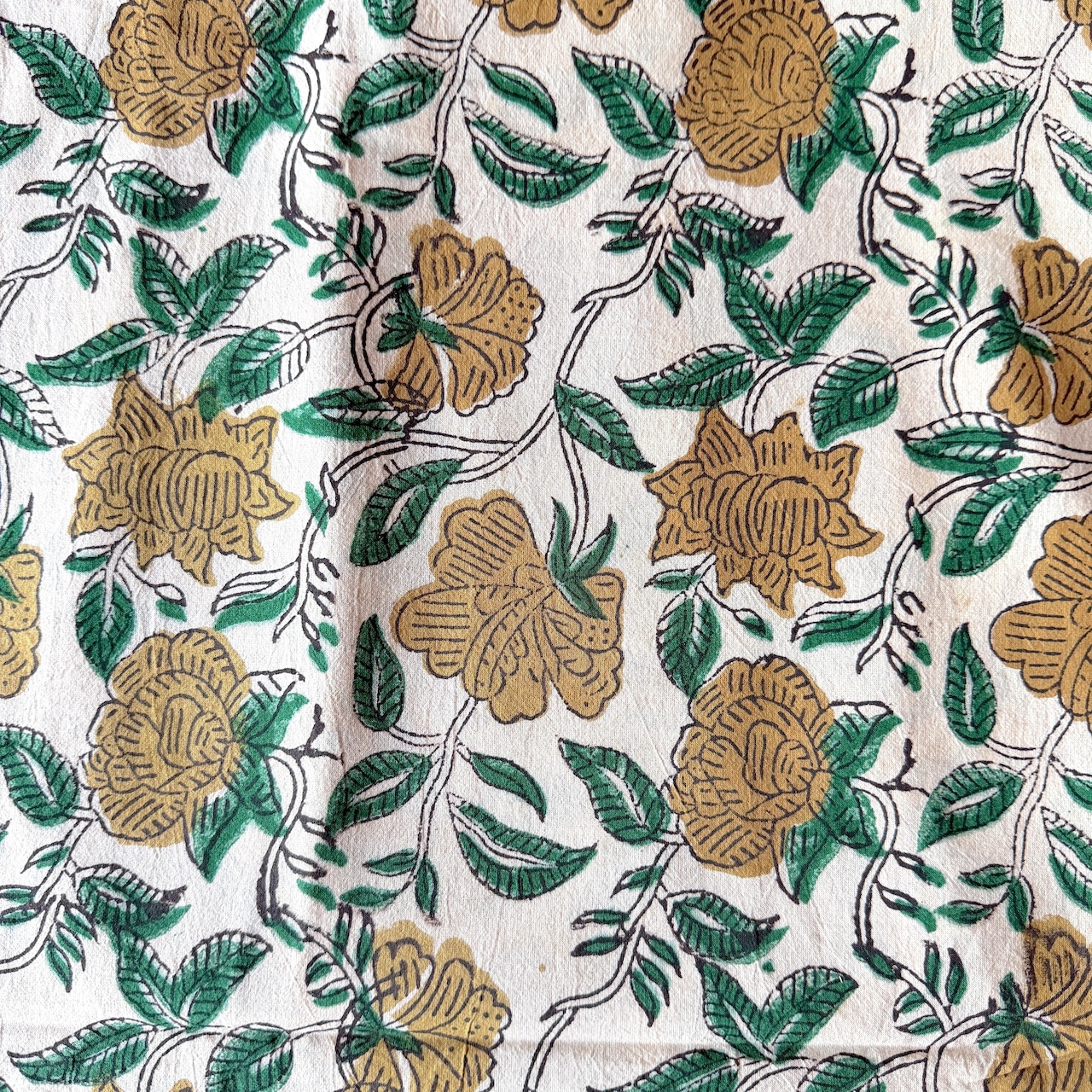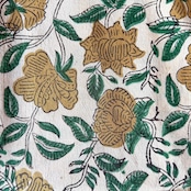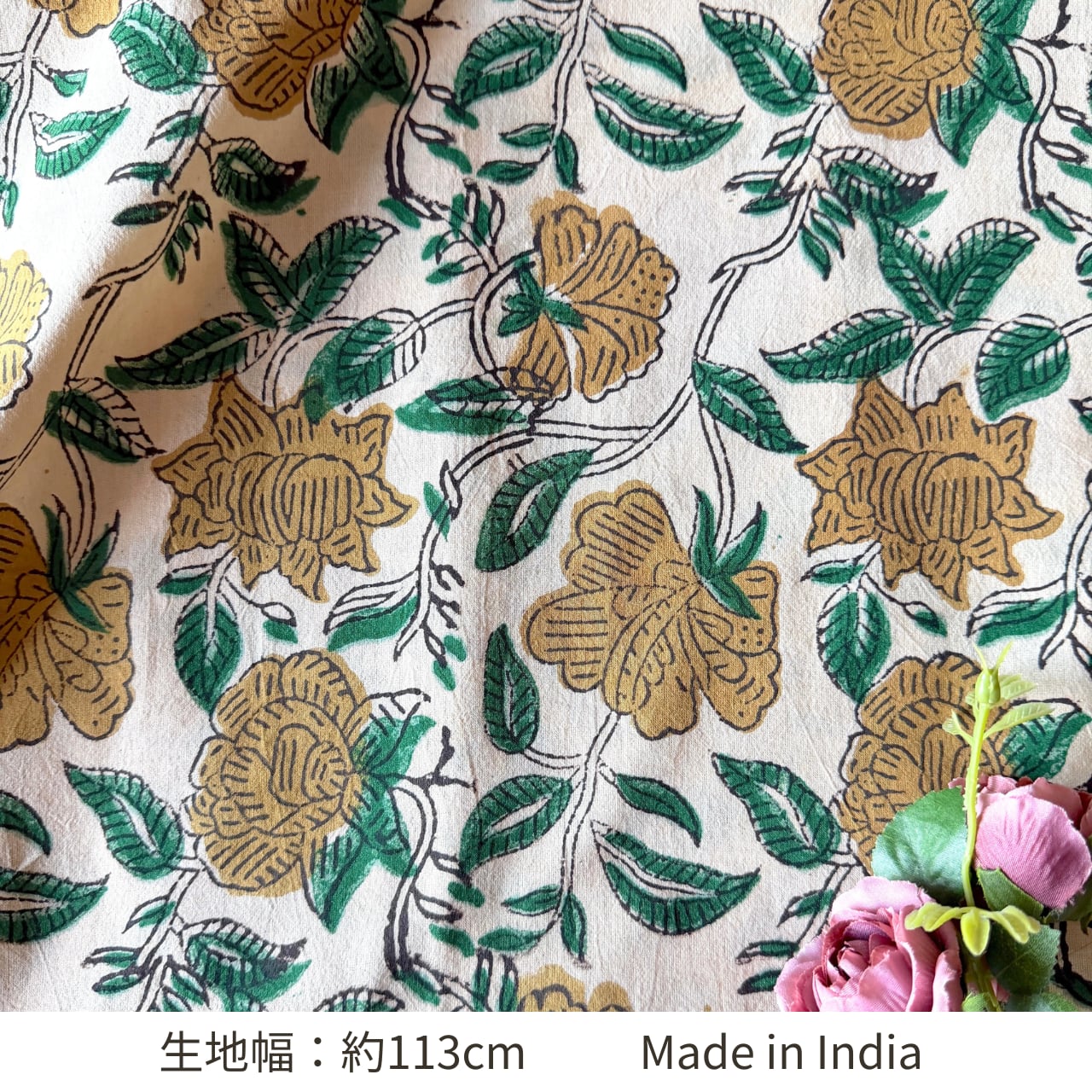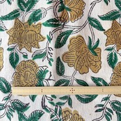 生成り色のやわらかなコットン地に、ベージュの花とグリーンの葉が描かれた、バグルーのハンドブロックプリント生地です。