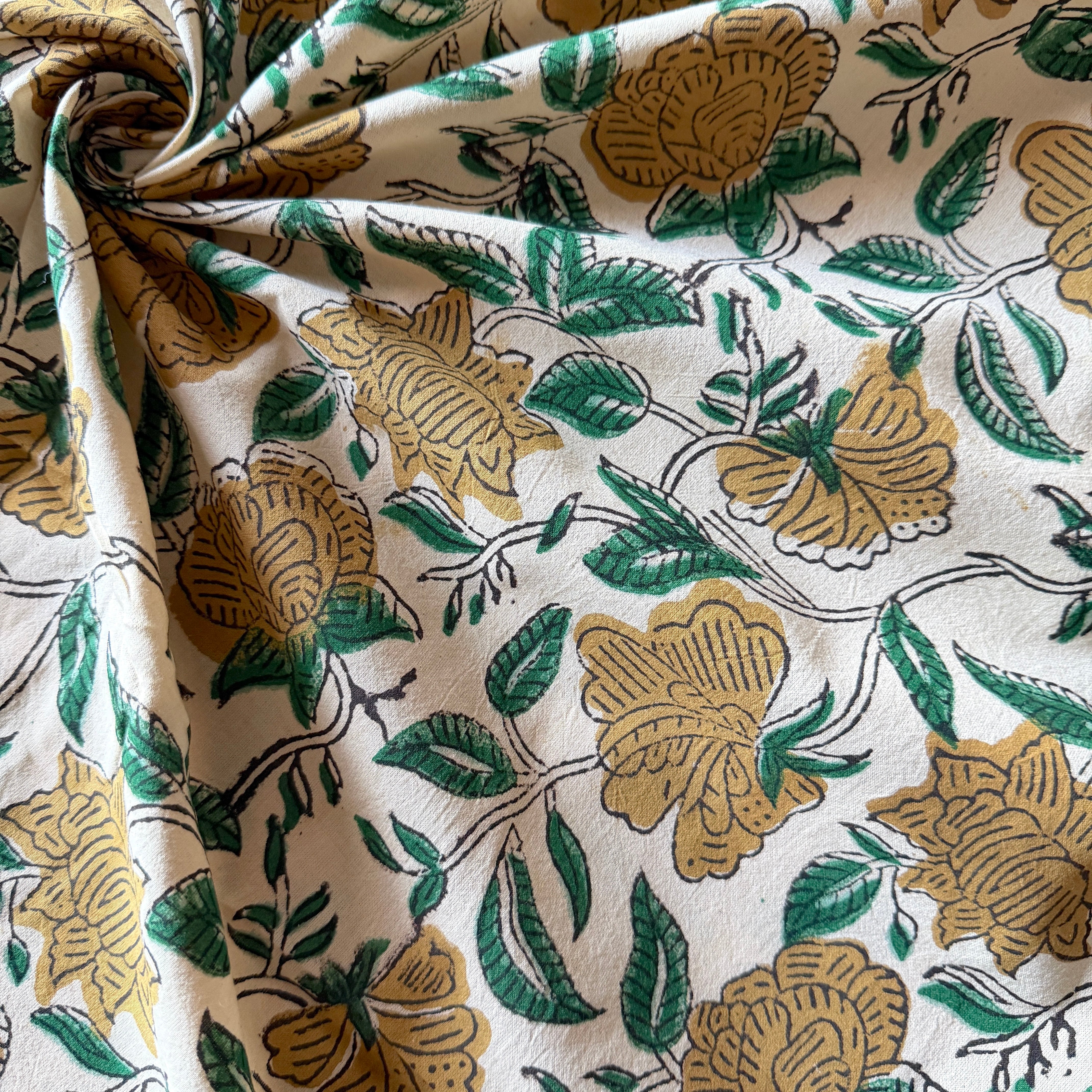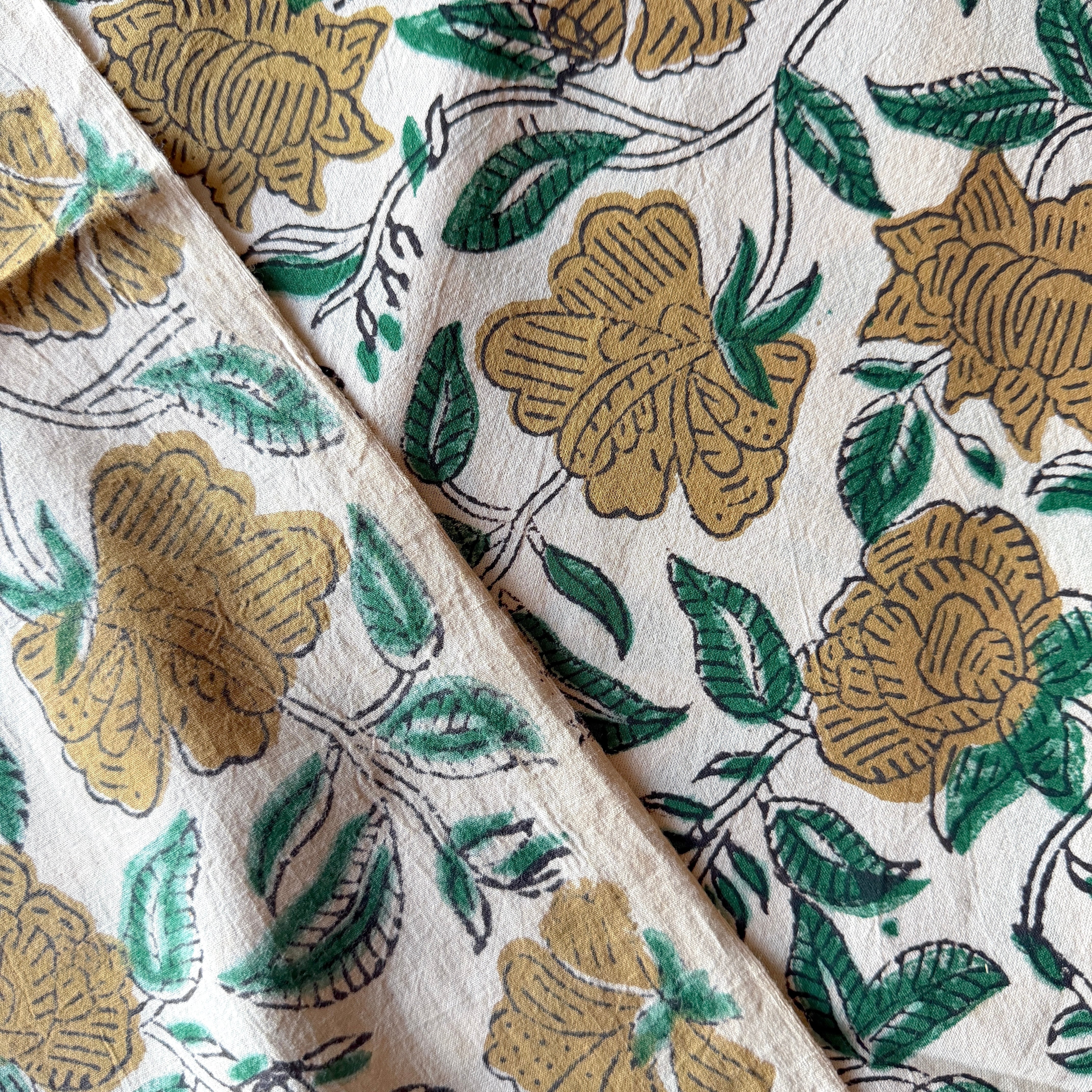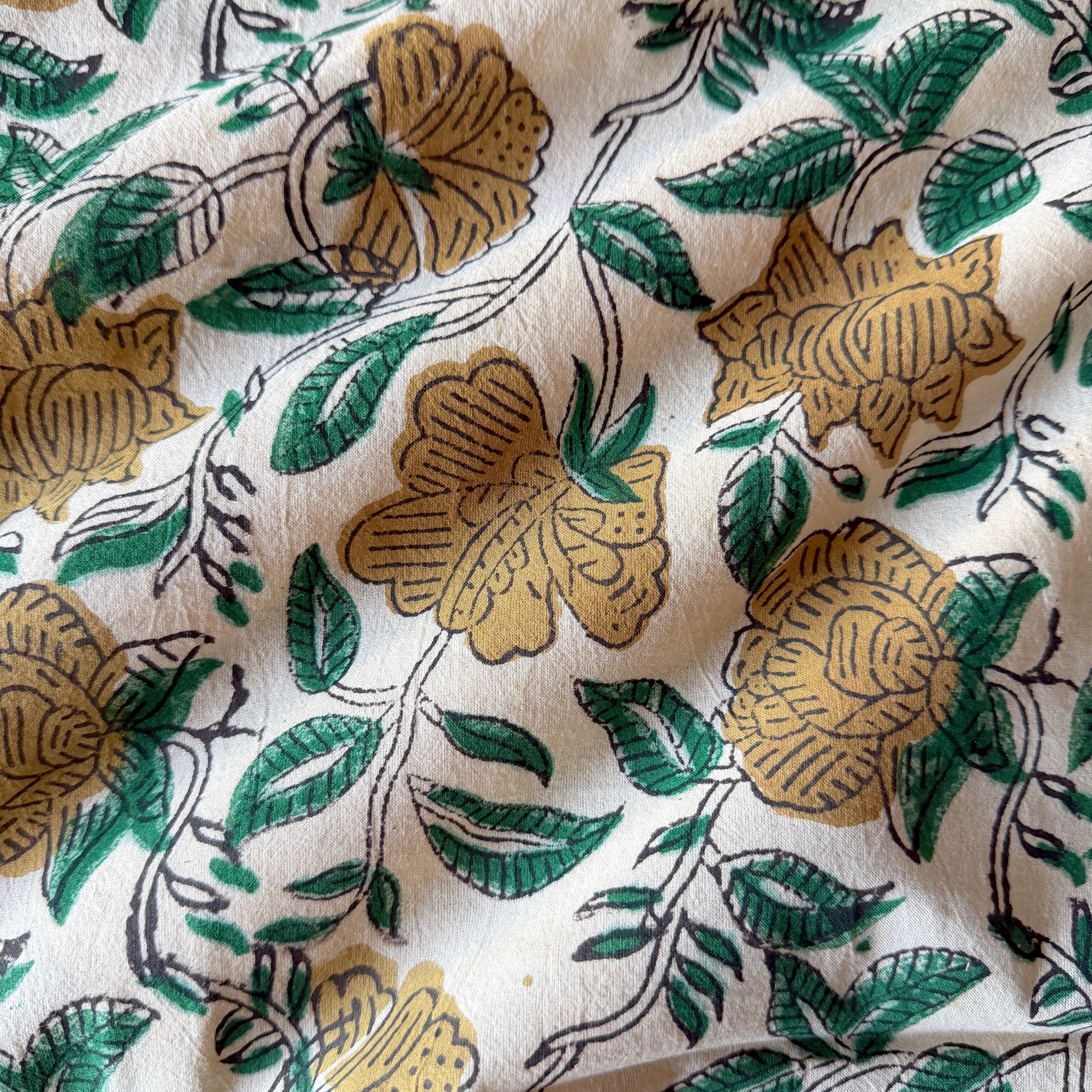 生成り色のやわらかなコットン地に、ベージュの花とグリーンの葉が描かれた、バグルーのハンドブロックプリント生地です。