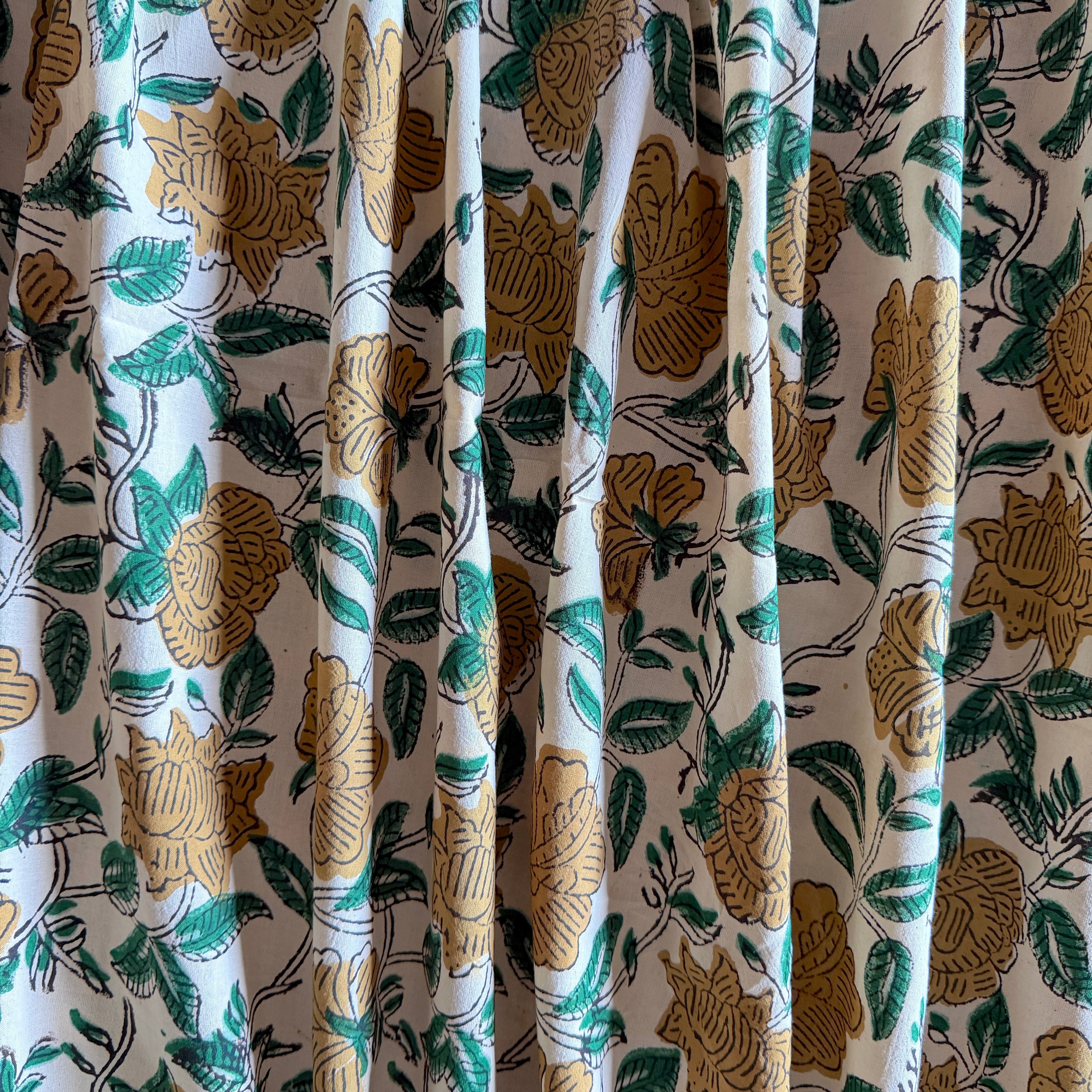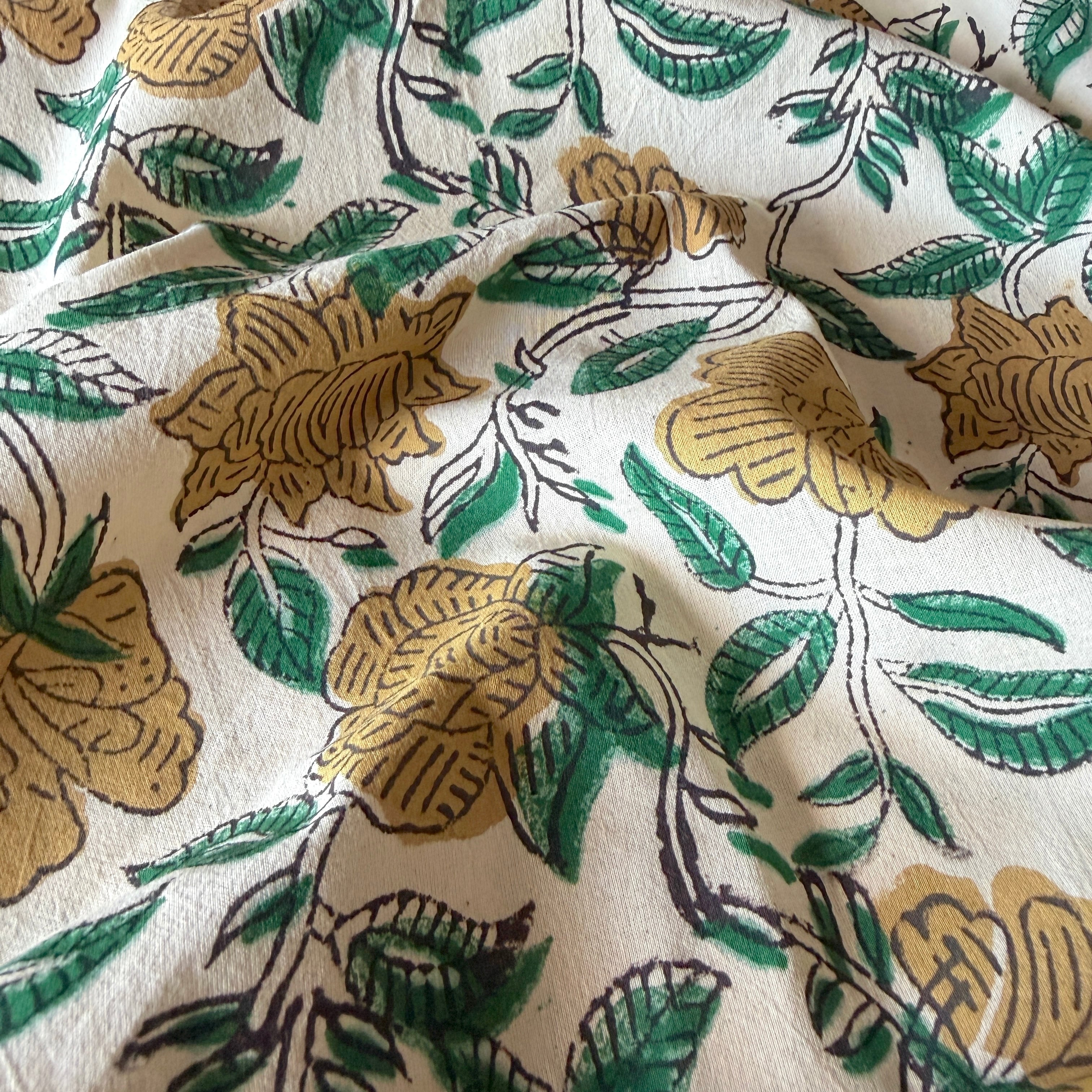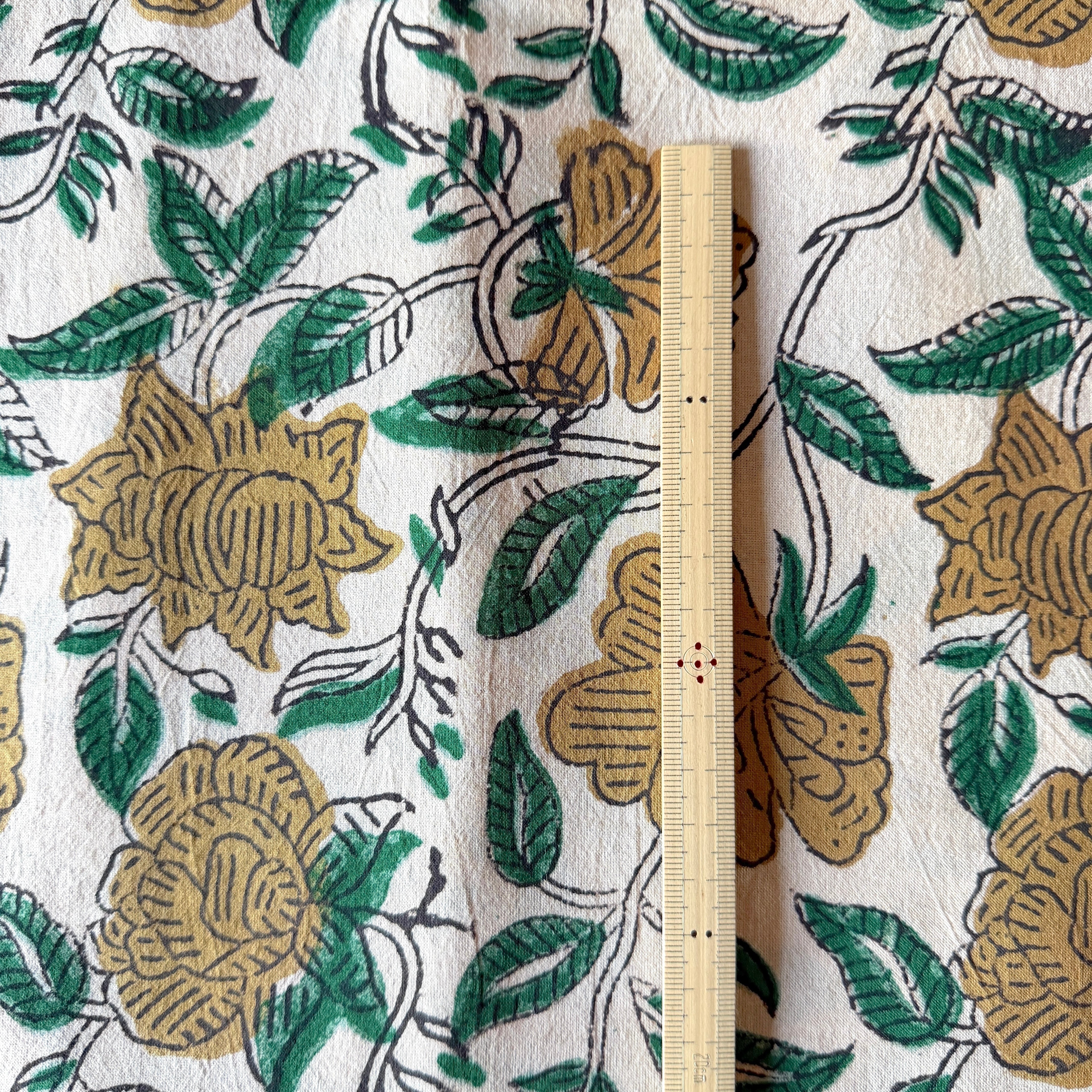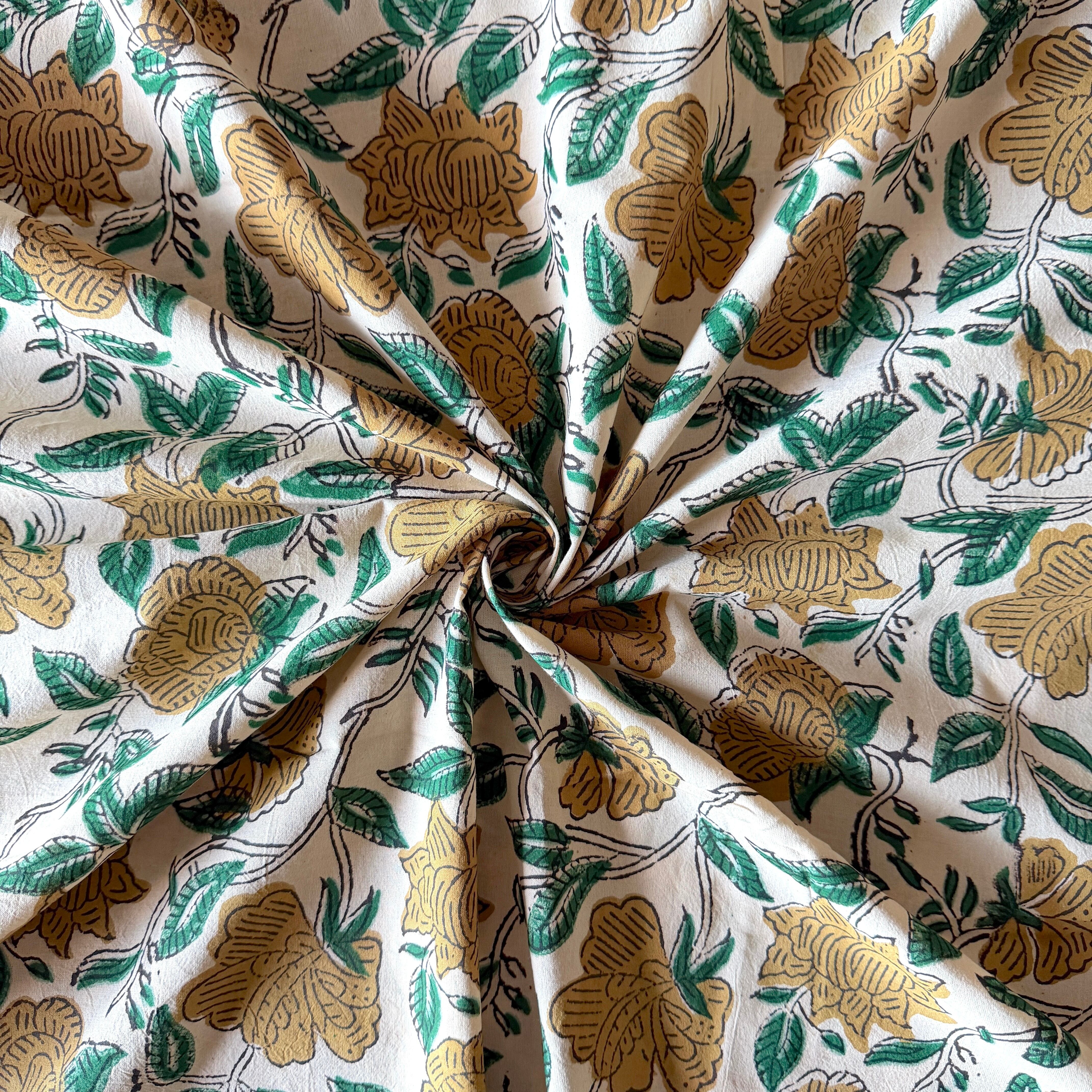 生成り色のやわらかなコットン地に、ベージュの花とグリーンの葉が描かれた、バグルーのハンドブロックプリント生地です。