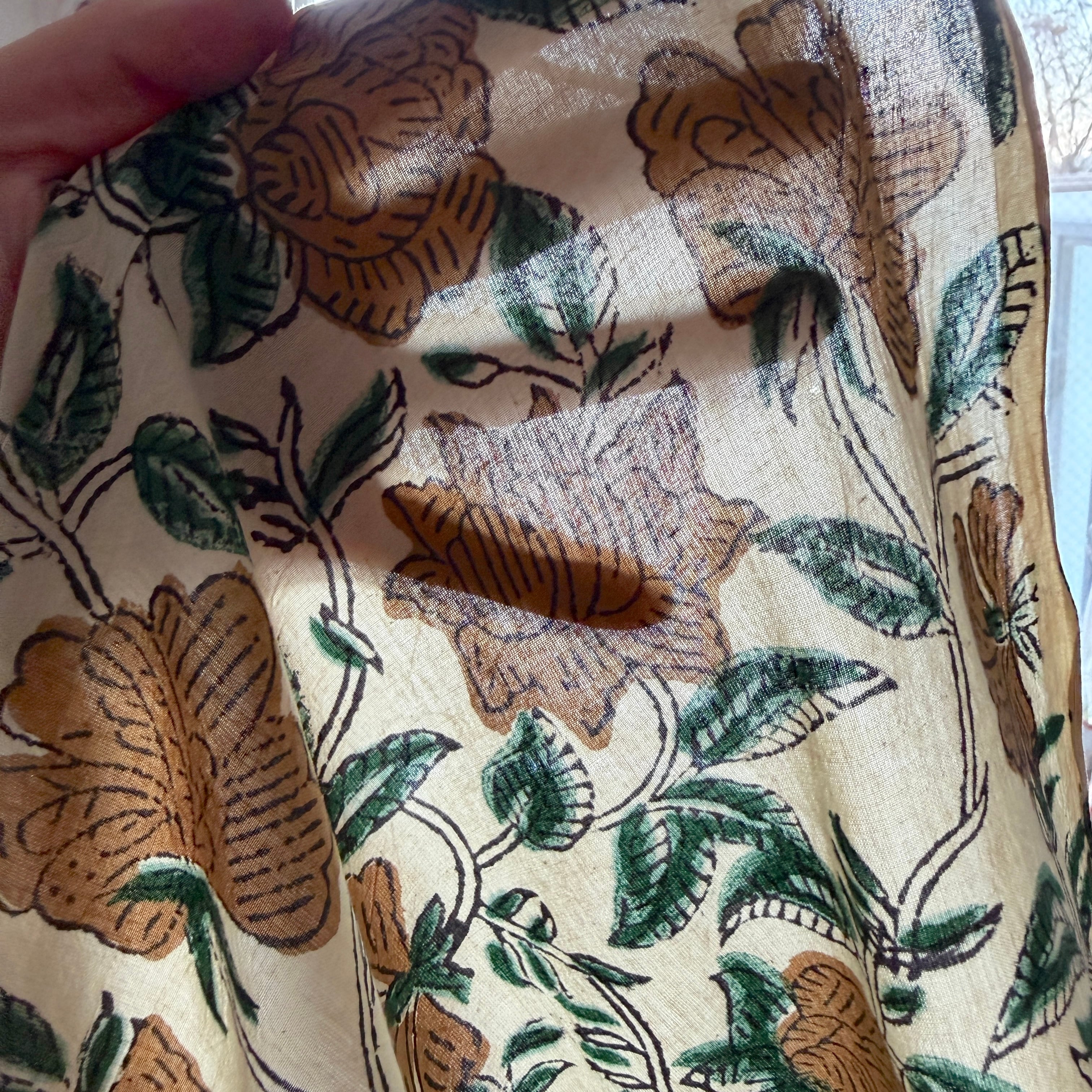 ハンドブロックプリント生地 インド更紗 綿生地 Bagru ナチュラル生成りベース×ベージュフラワー・グリーンリーフ ボタニカル 薄手コットン JE-260117