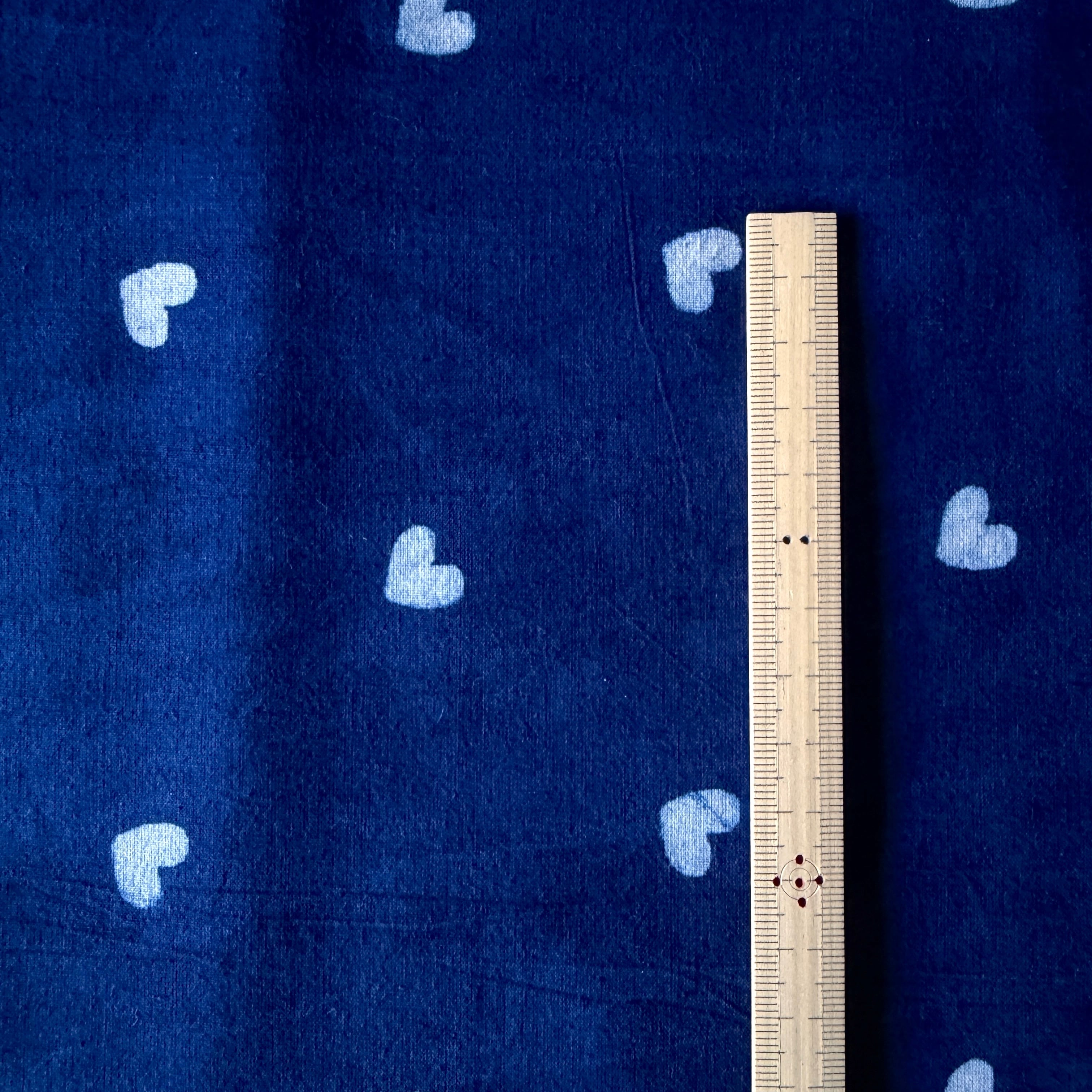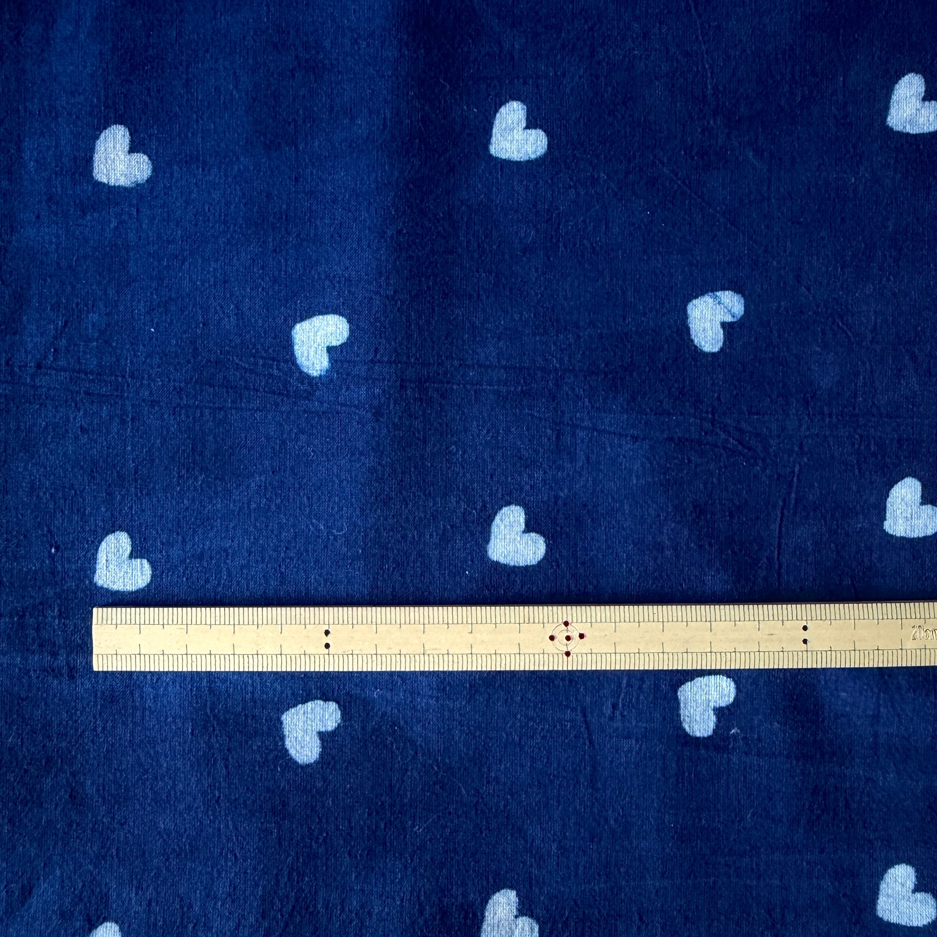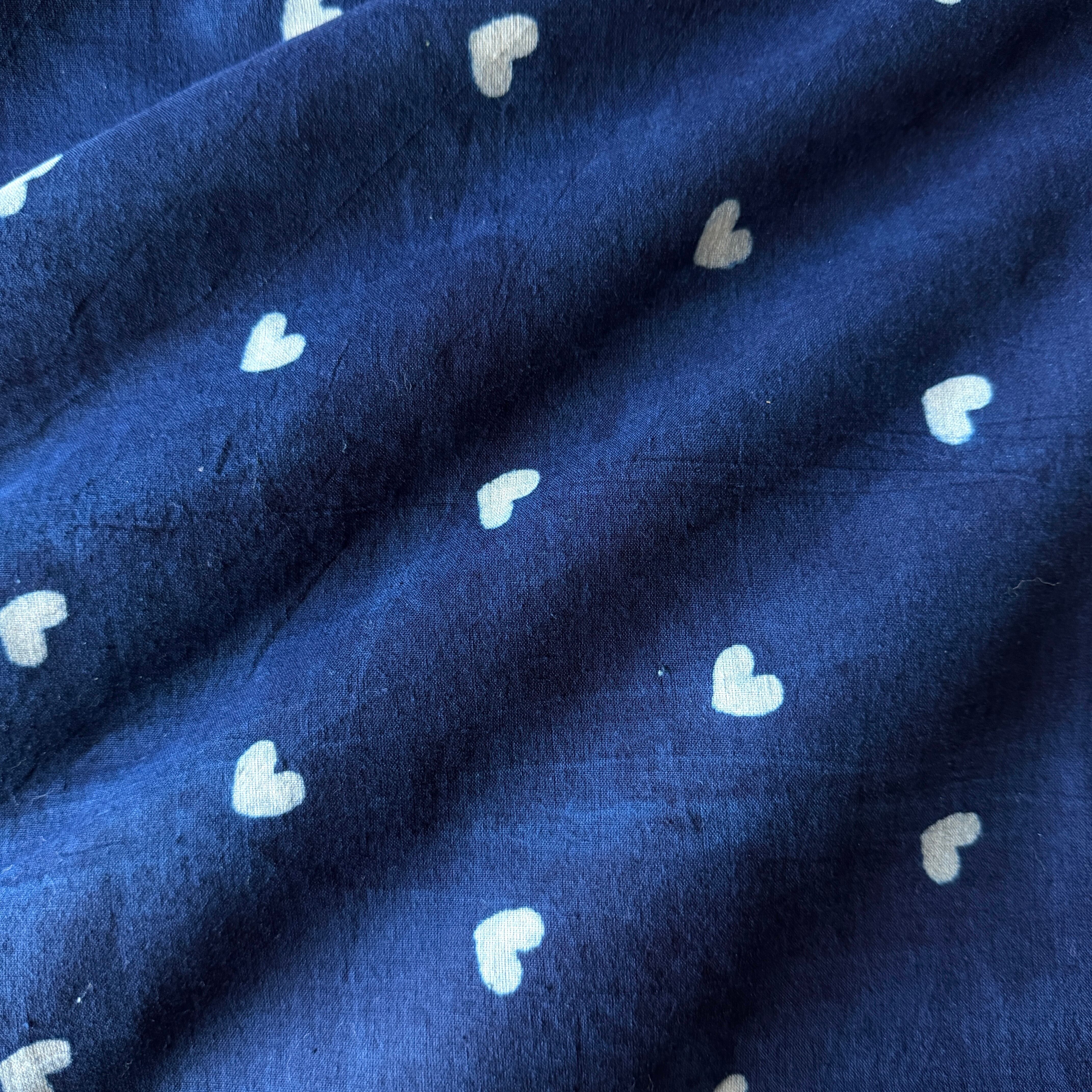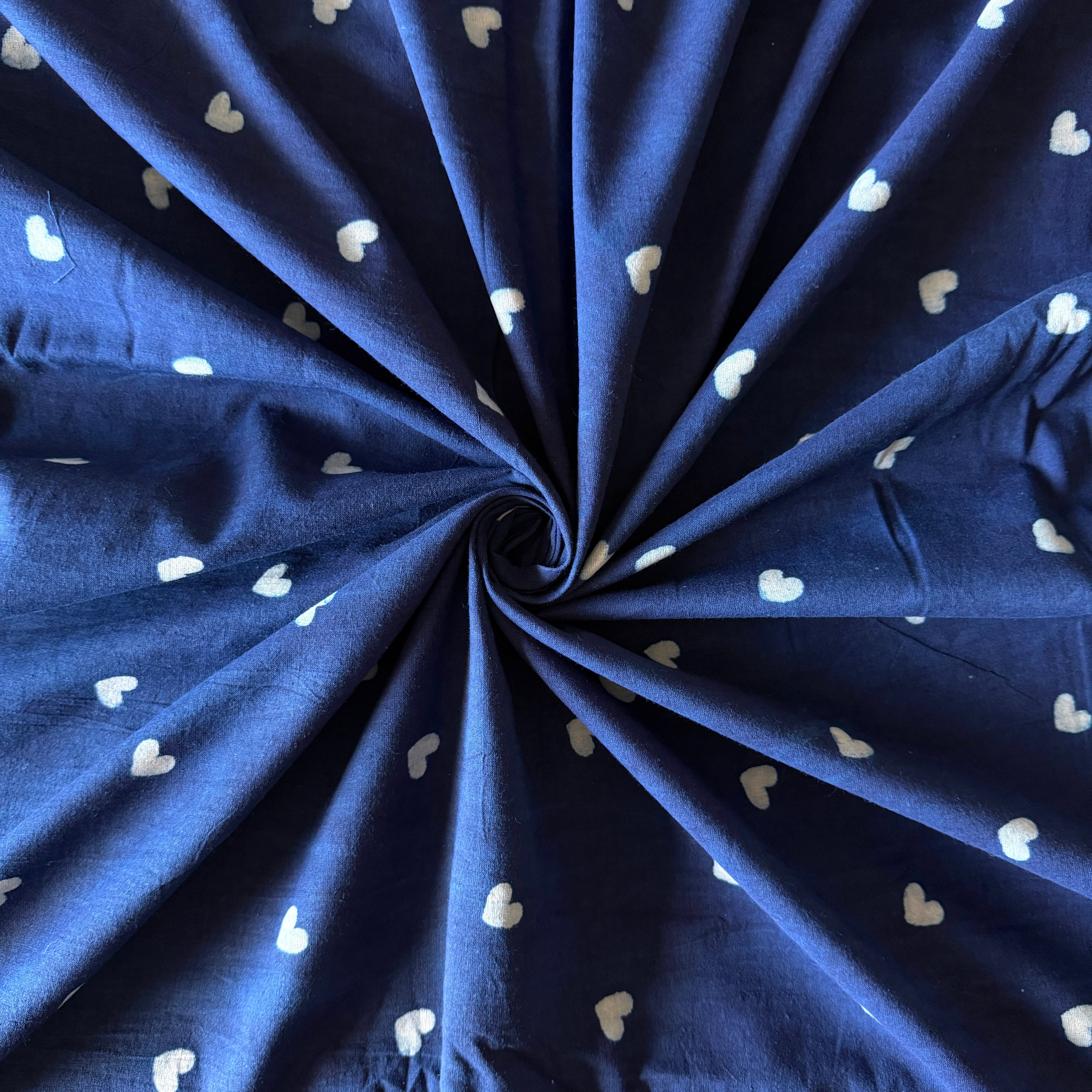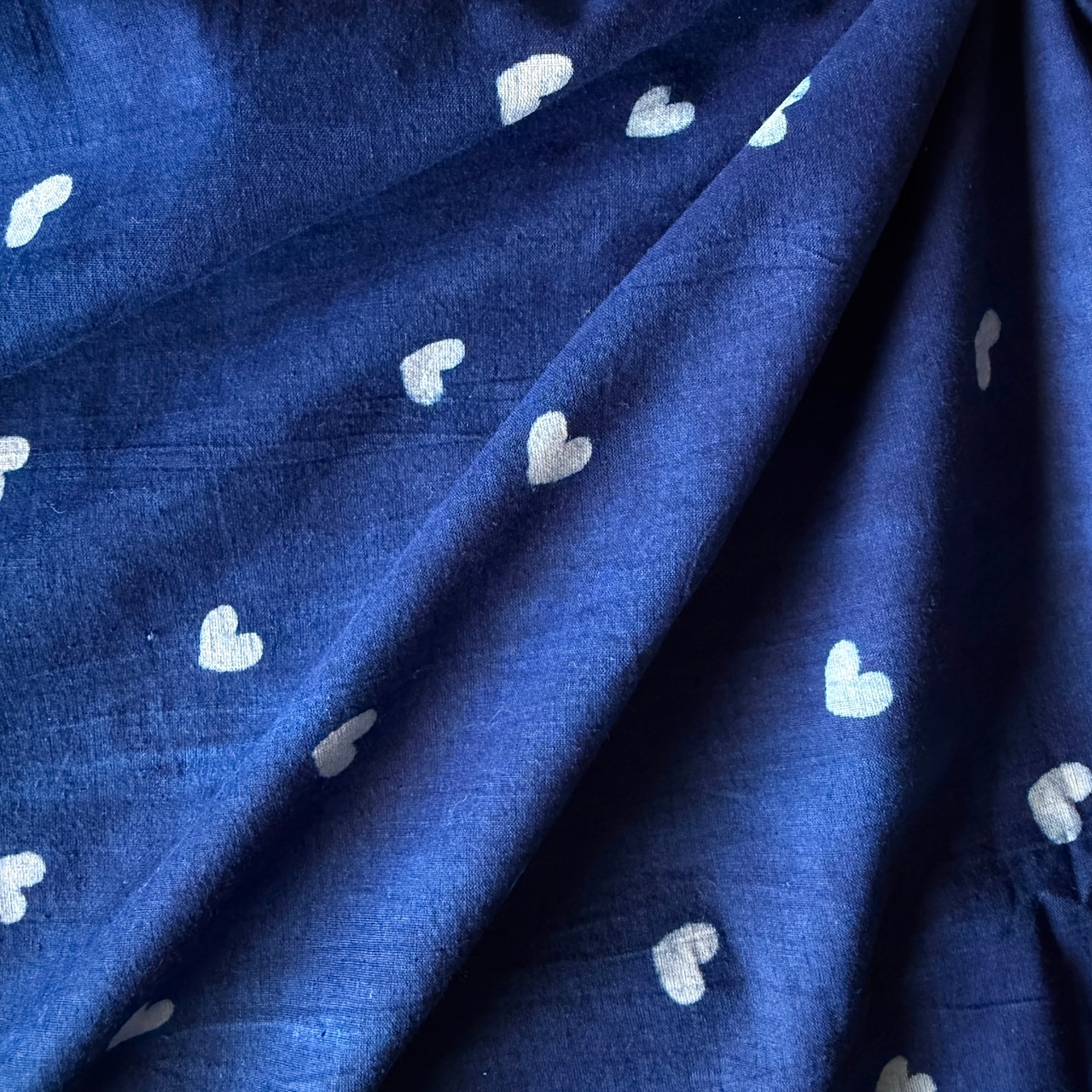 深みのあるインディゴブルーに、小さなホワイトのハートが散りばめられたハンドブロックプリント生地です。