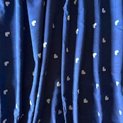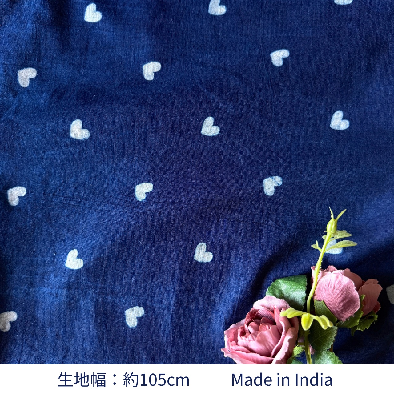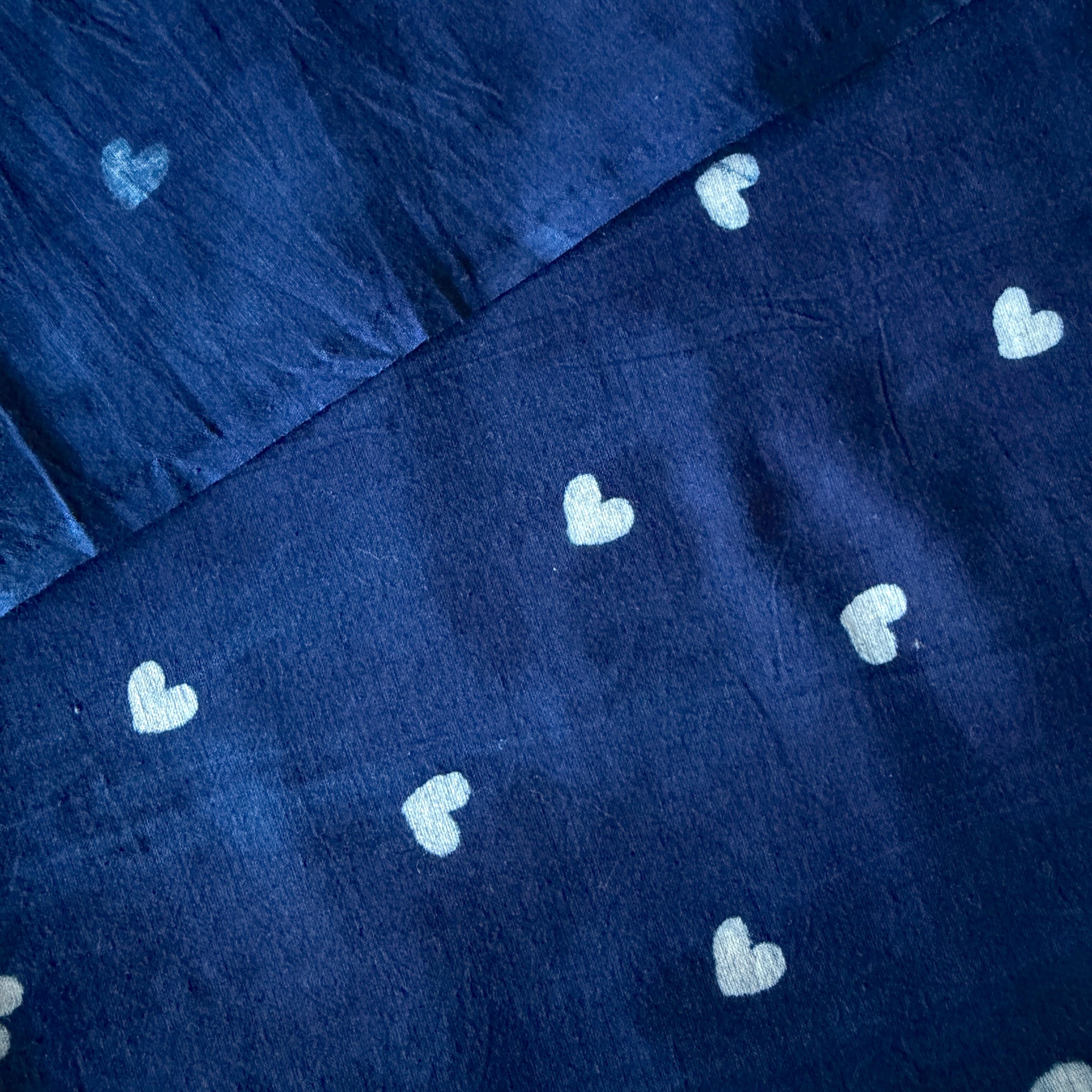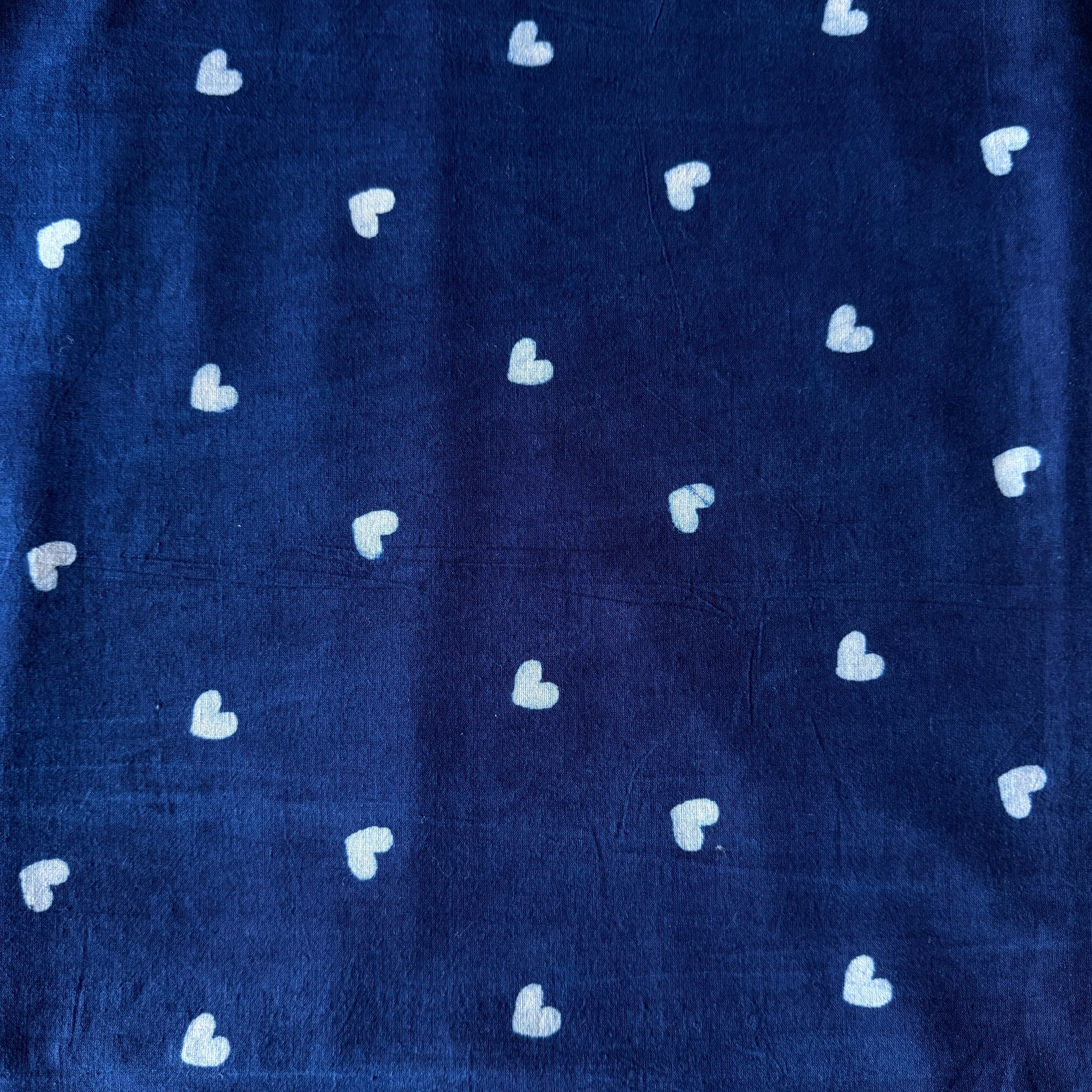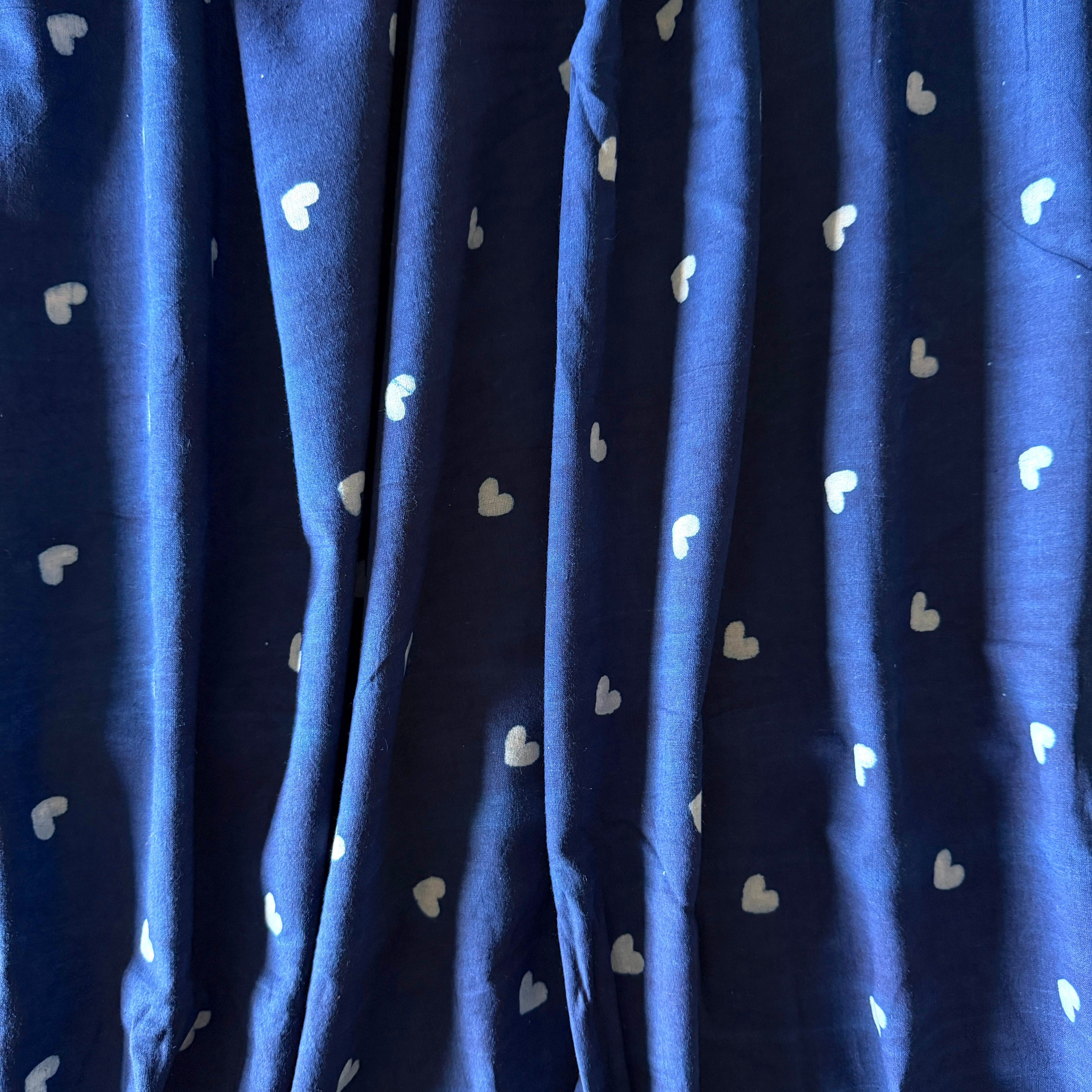 深みのあるインディゴブルーに、小さなホワイトのハートが散りばめられたハンドブロックプリント生地です。
