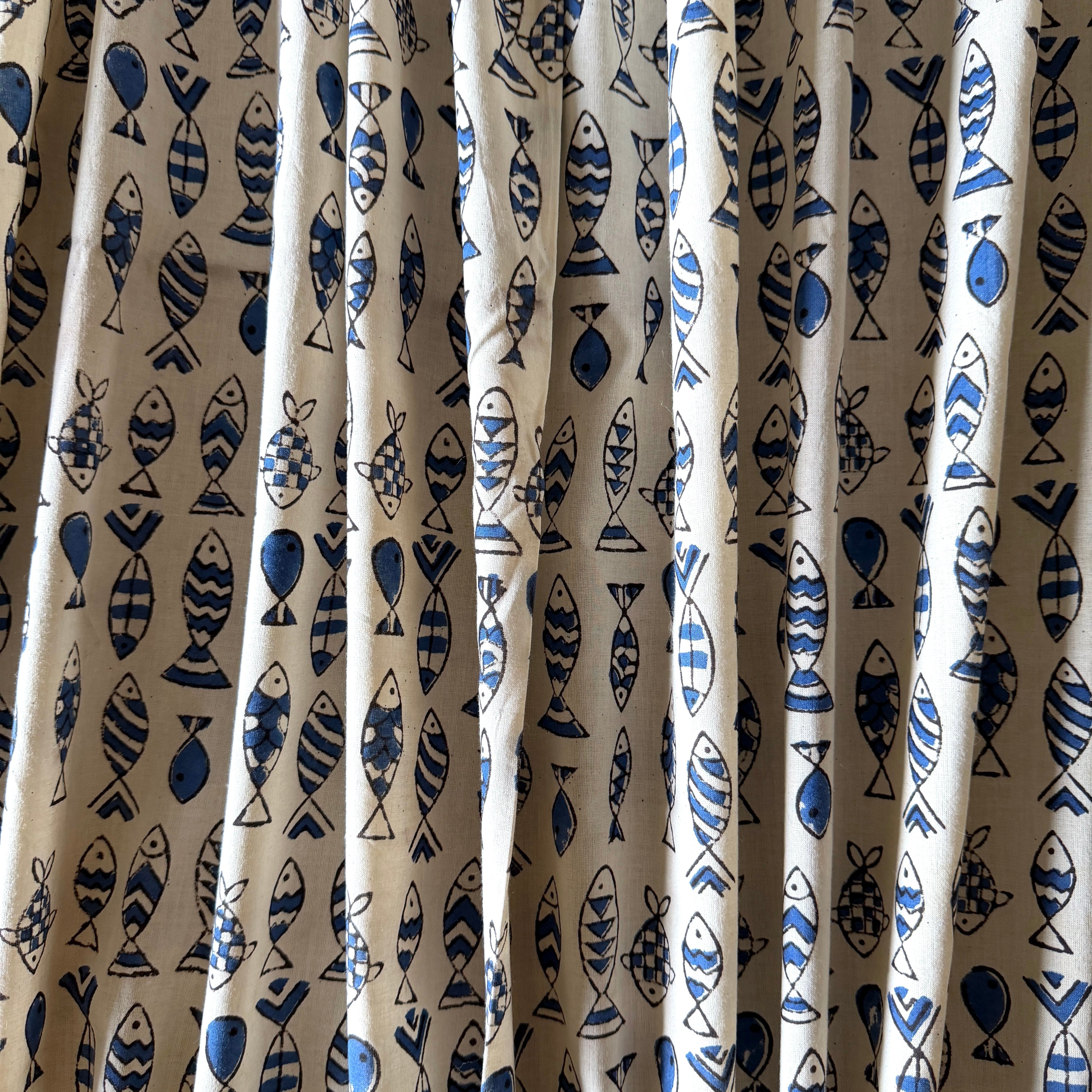 ハンドブロックプリント生地 インド更紗 綿生地 Bagru ナチュラル生成りベース×ブルー お魚柄 薄手コットン JE-260202