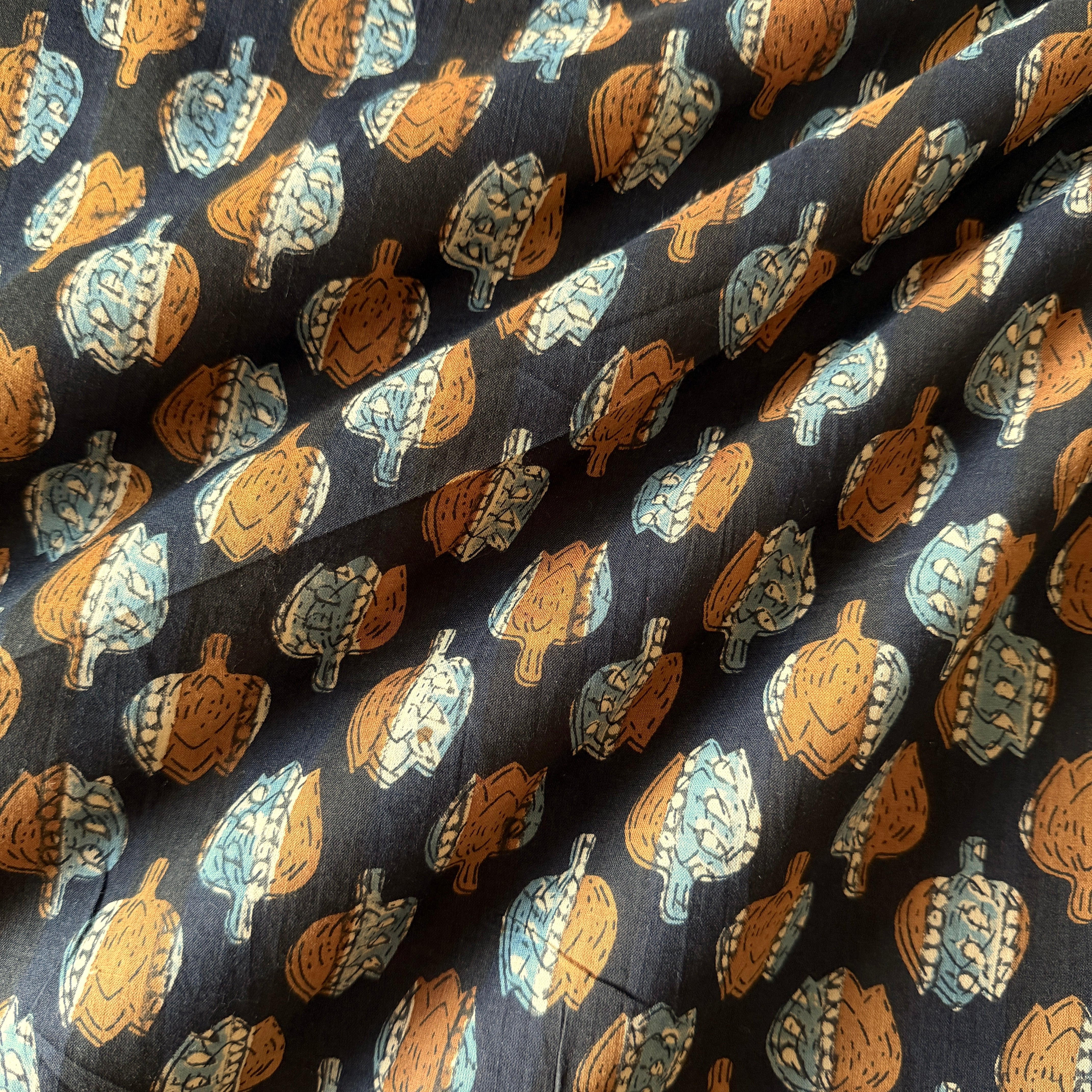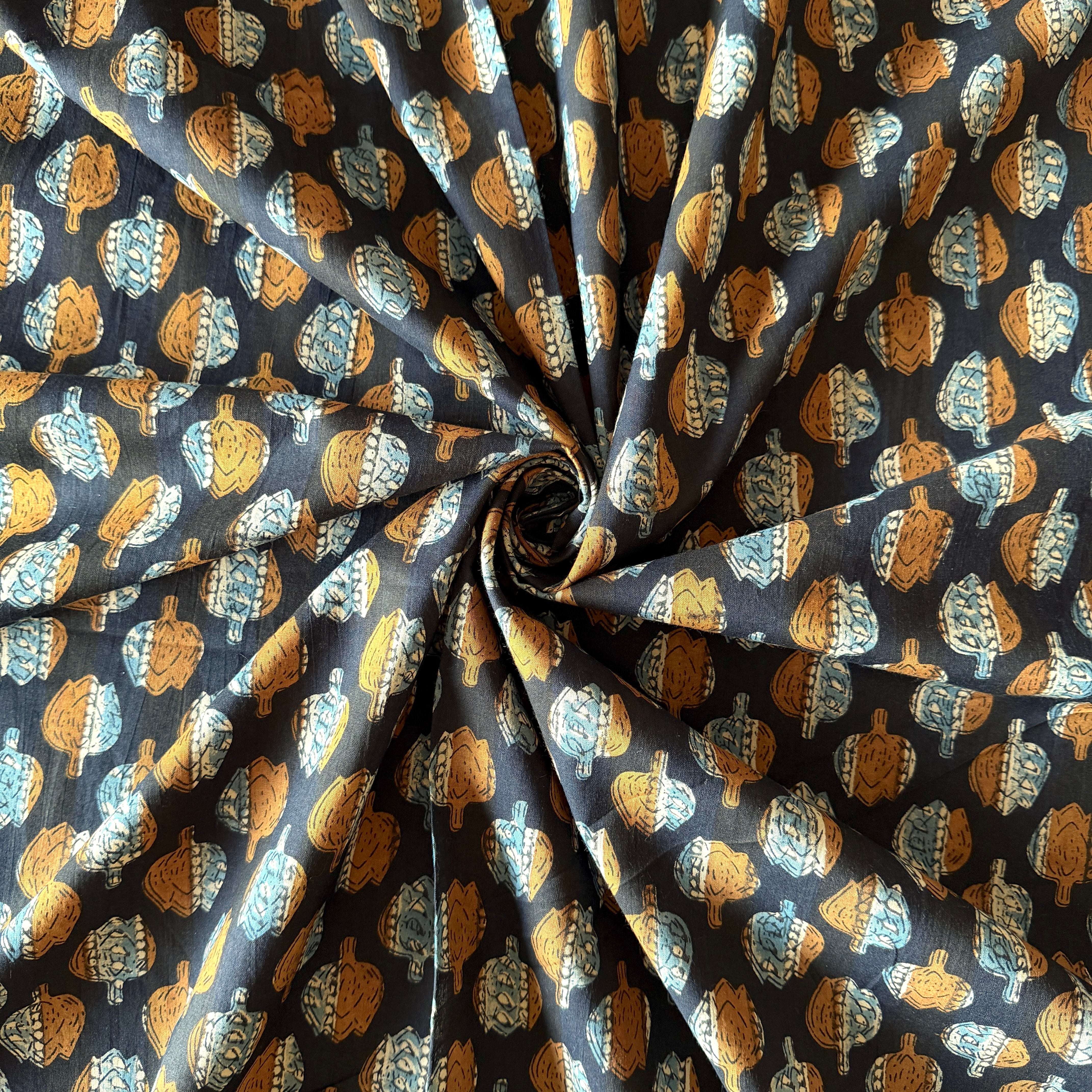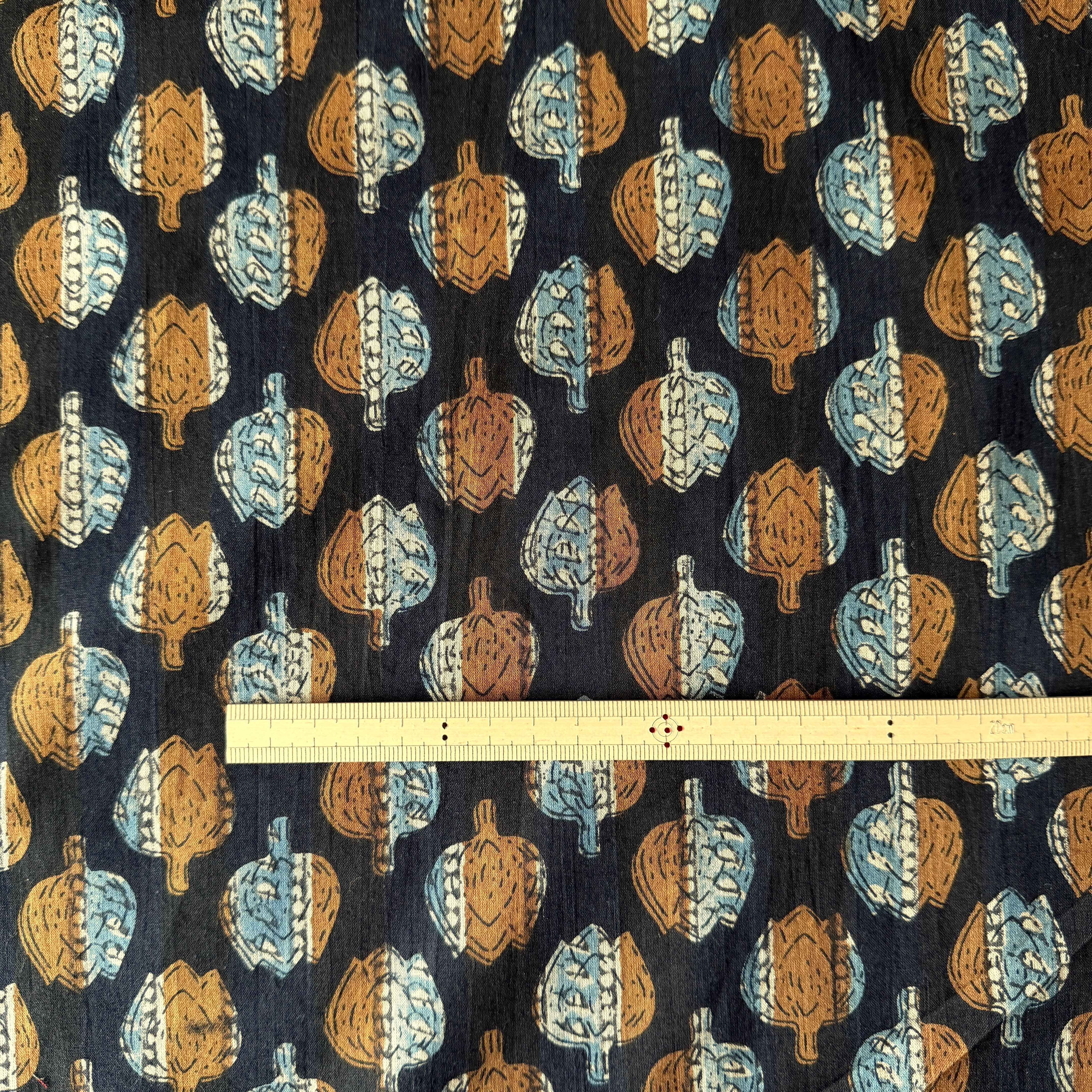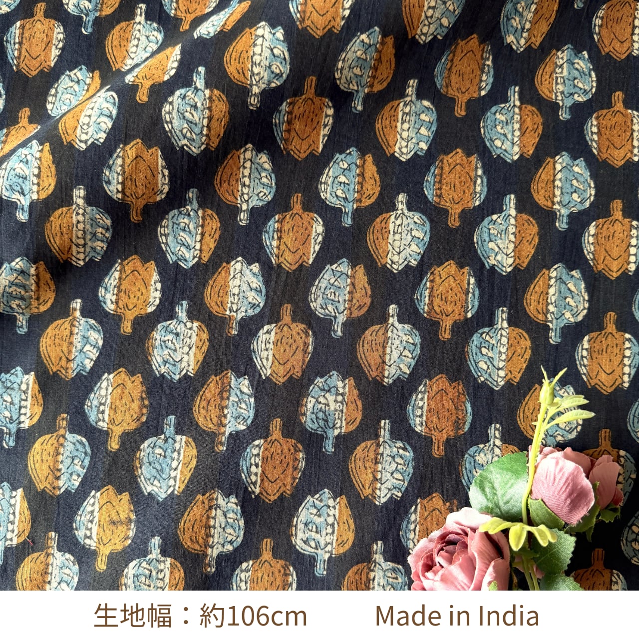 ハンドブロックプリント生地 インド更紗 綿生地 ブラックベース×ブルー&ブラウン 植物モチーフ 薄手コットン JE-260204