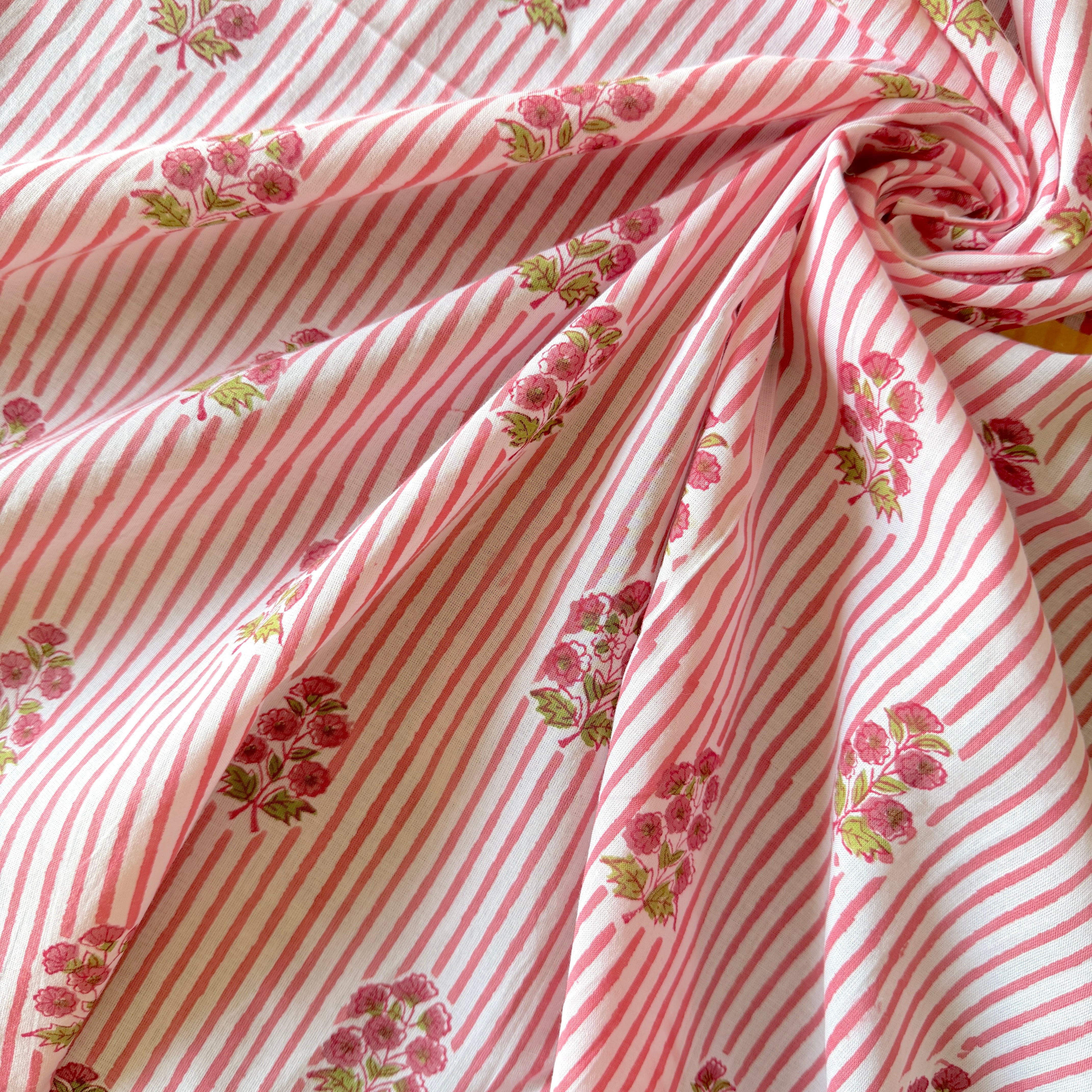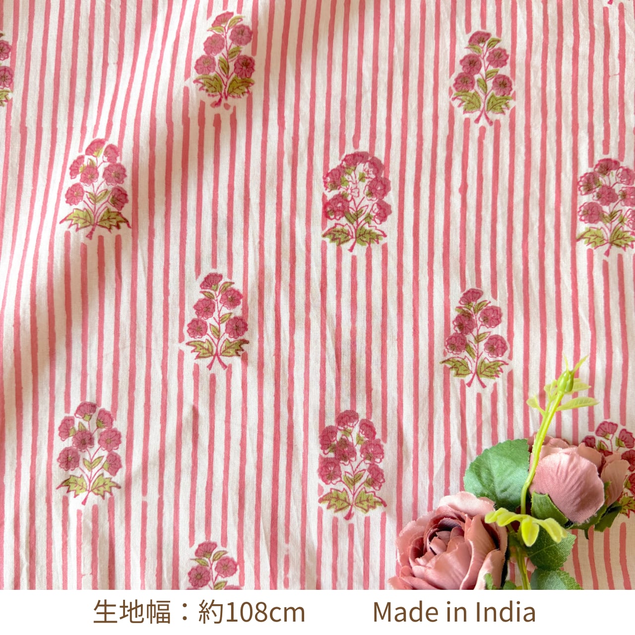 やわらかなピンクのストライプに、可憐な小花が並んだインドのブロックプリント生地です。