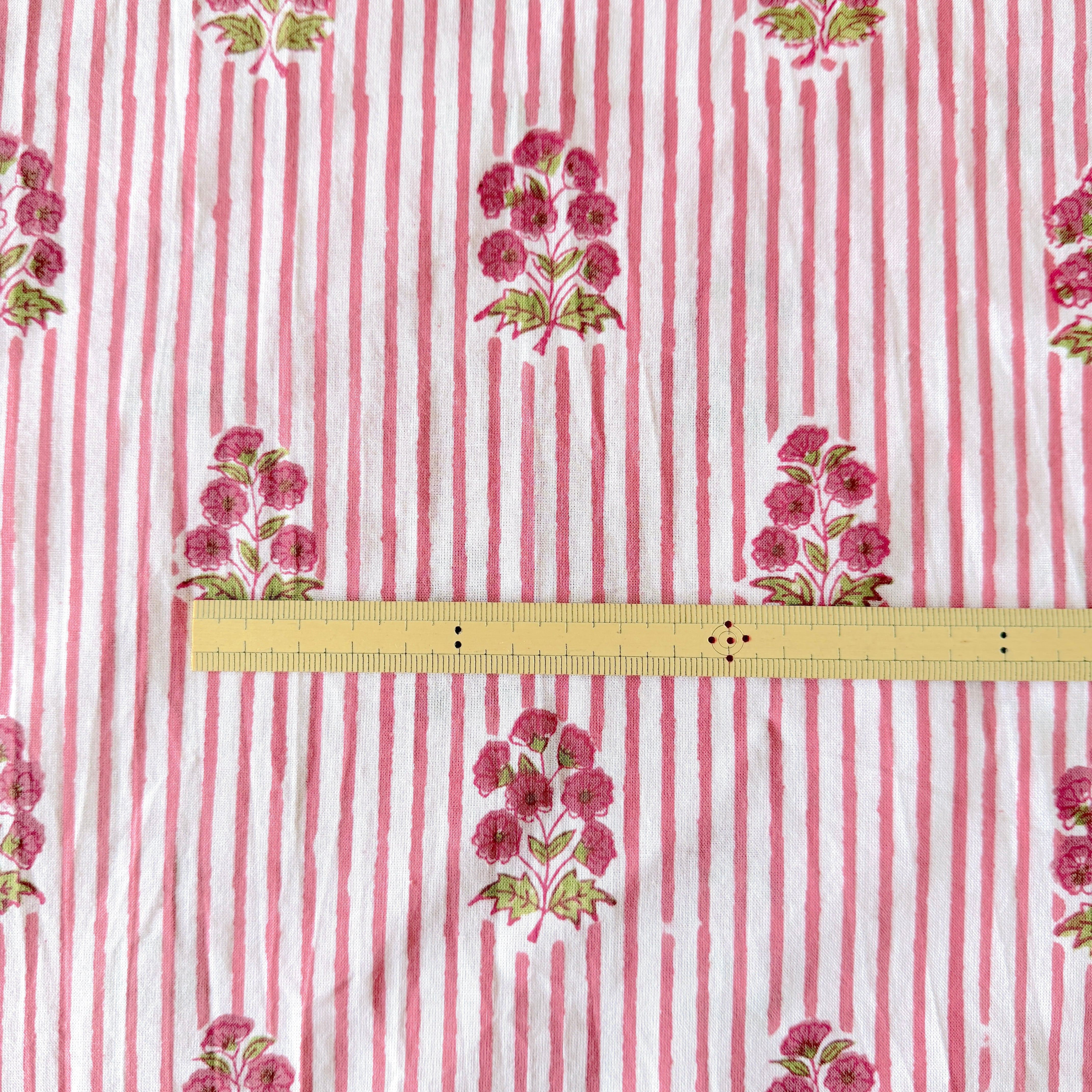 ラスト13点(約1.3m) ハンドブロックプリント生地 インド更紗 綿生地 ピンクストライプ×小花柄 薄手コットン JE-260205