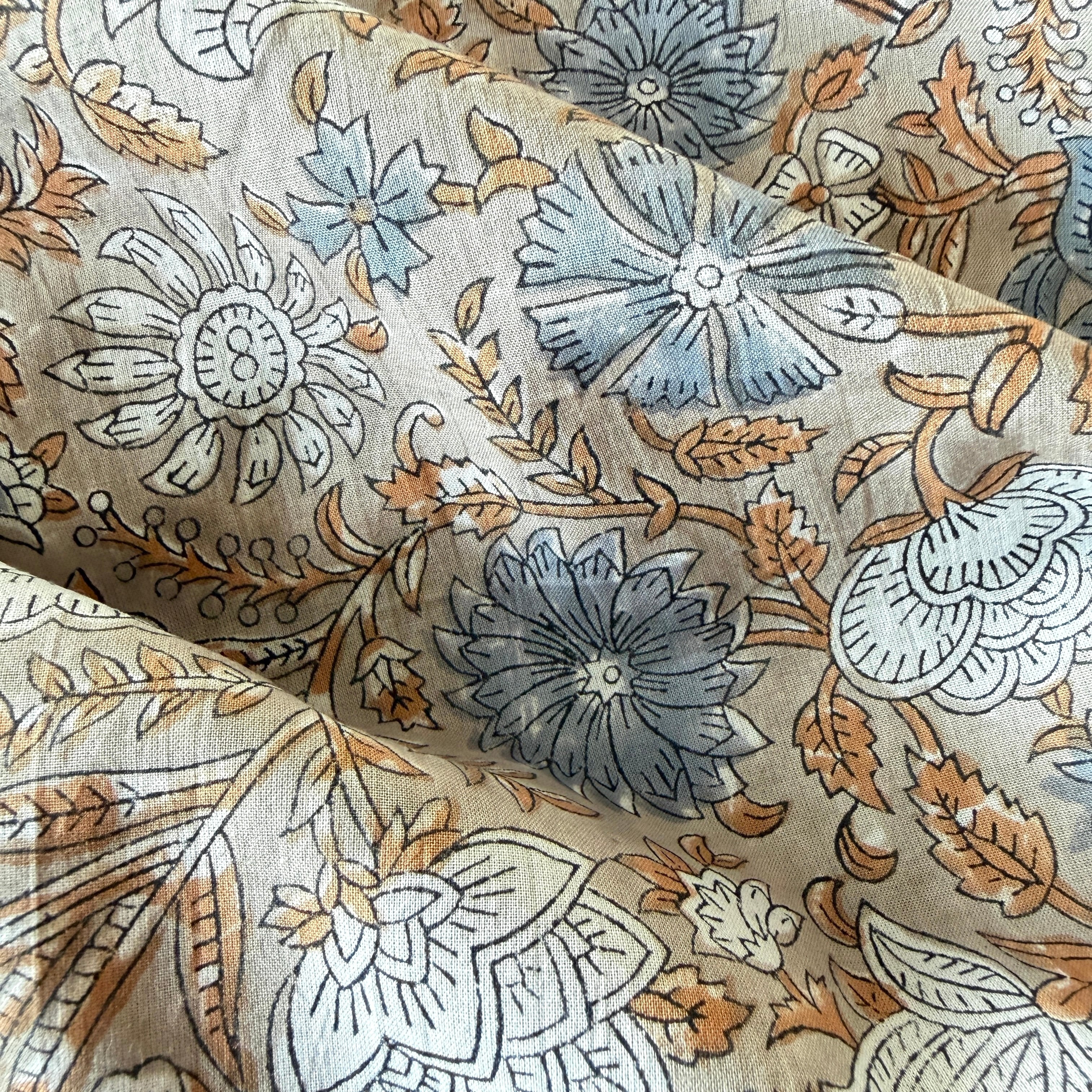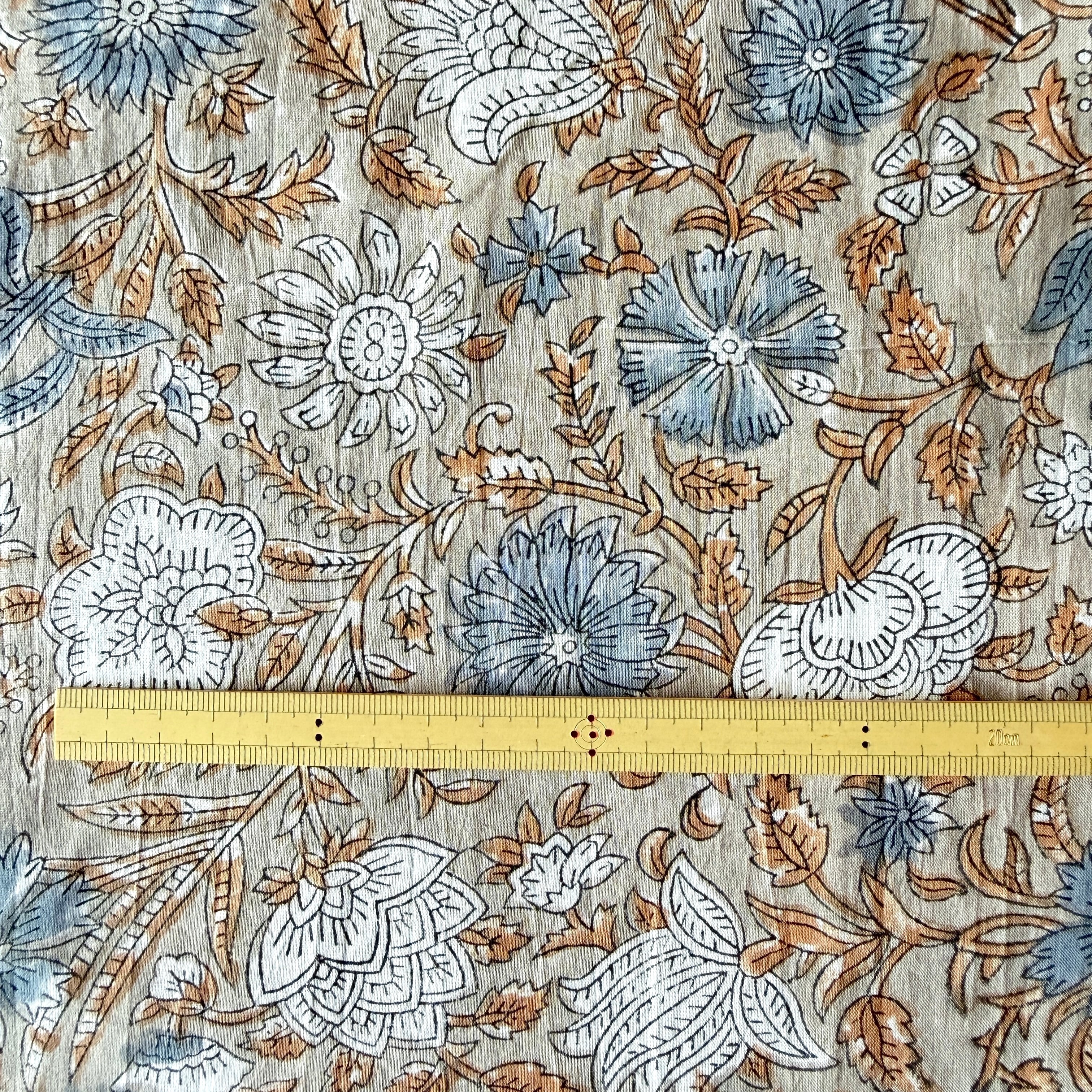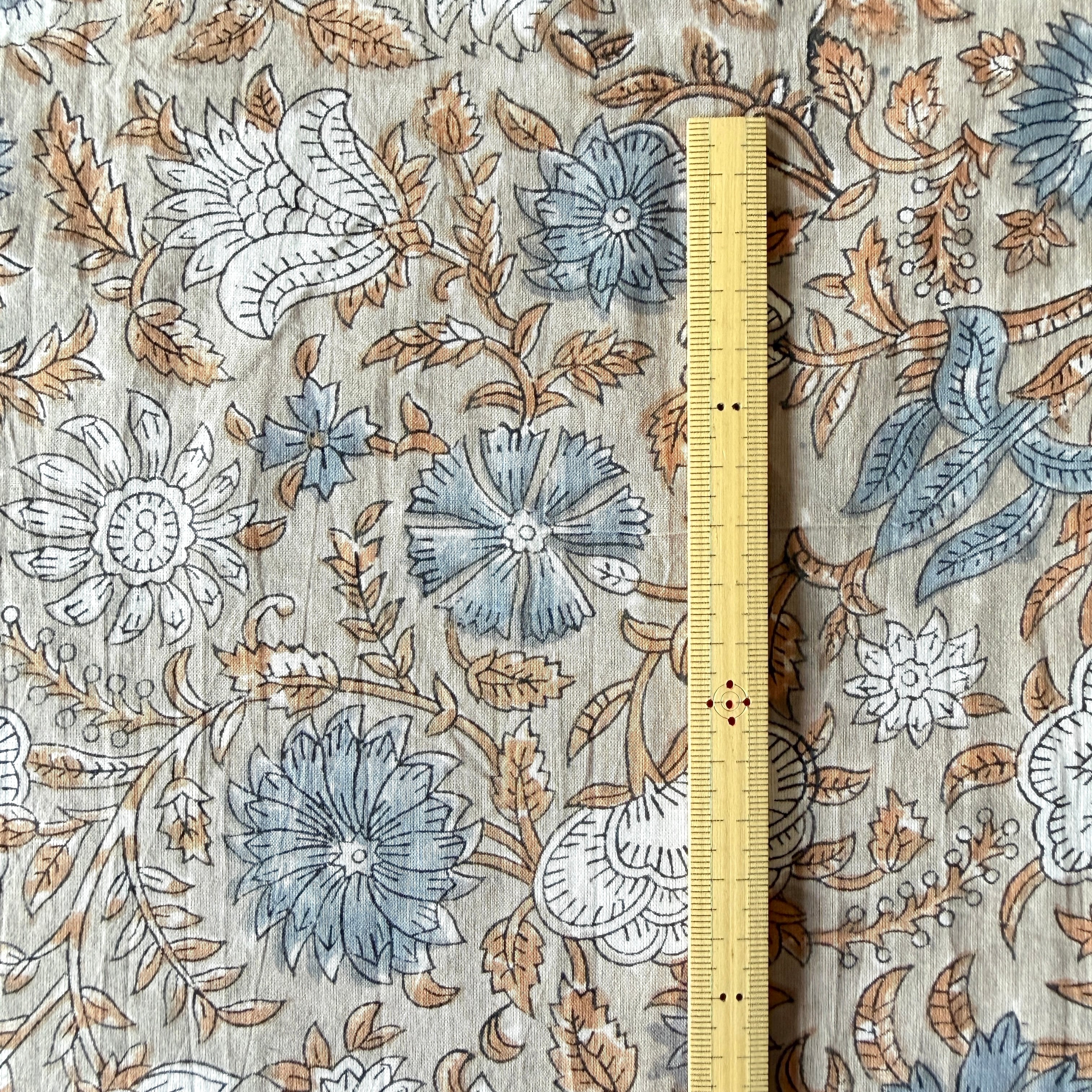 ハンドブロックプリント生地 インド更紗 綿生地 グレーベース スモーキーブルー花柄 薄手コットン GP-26004-sa