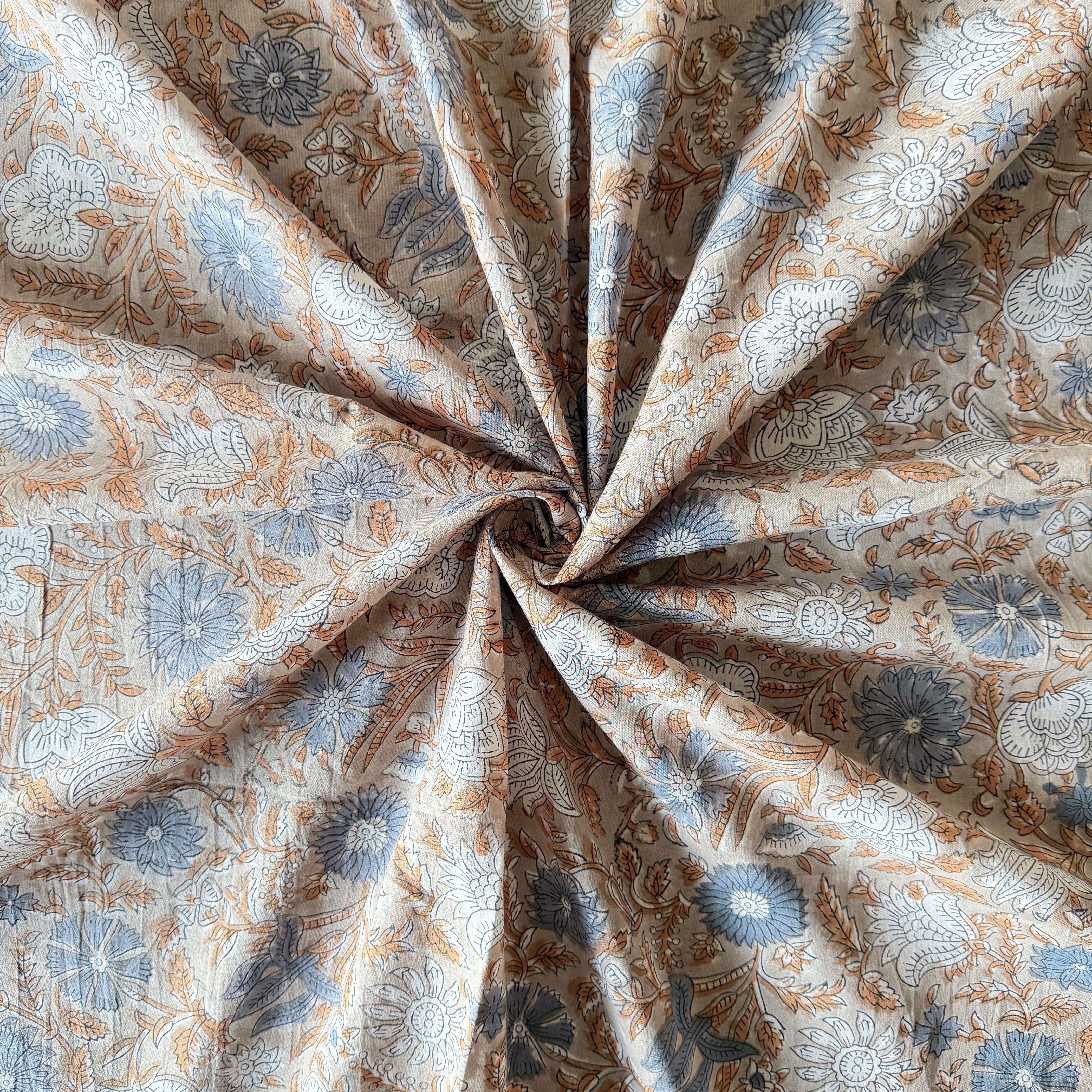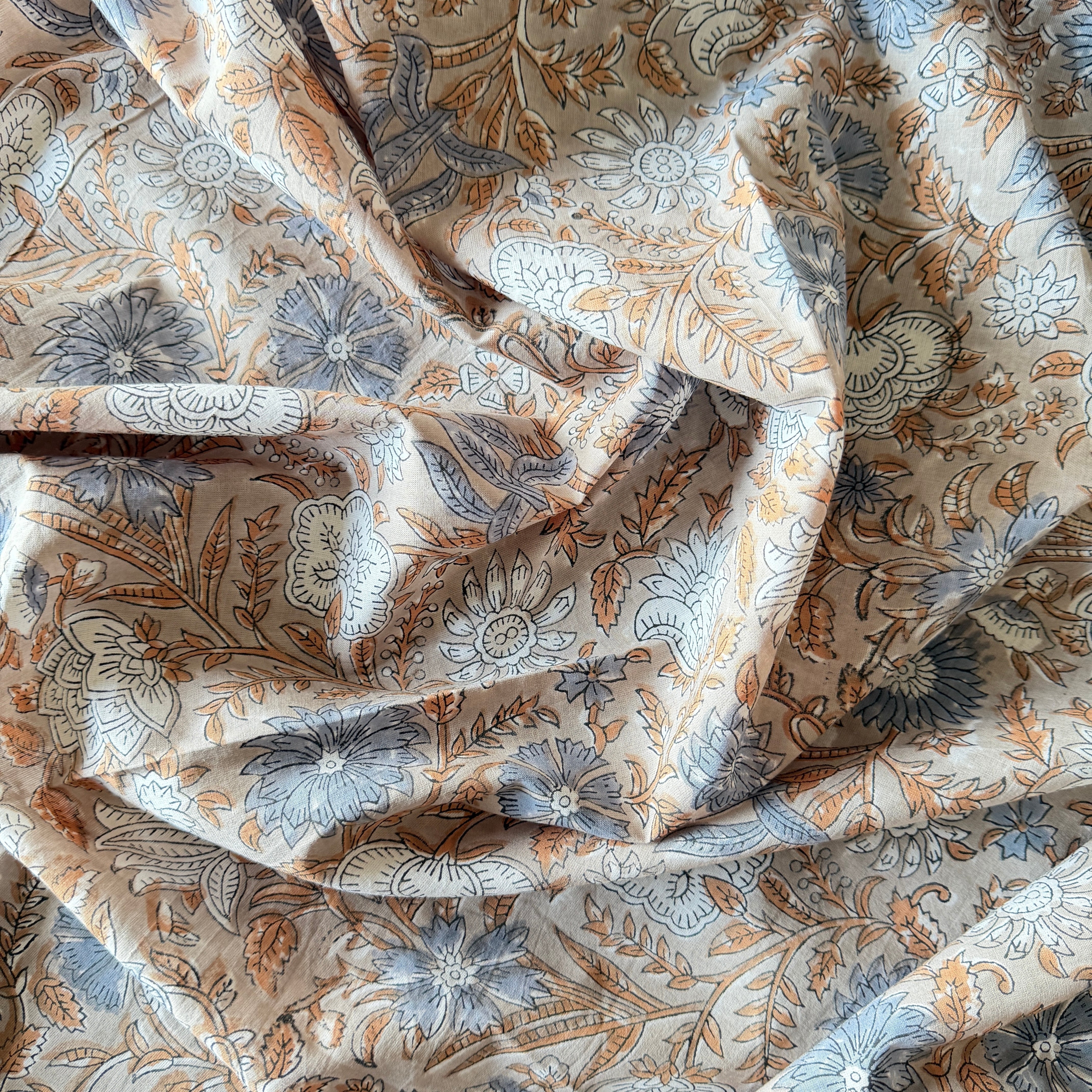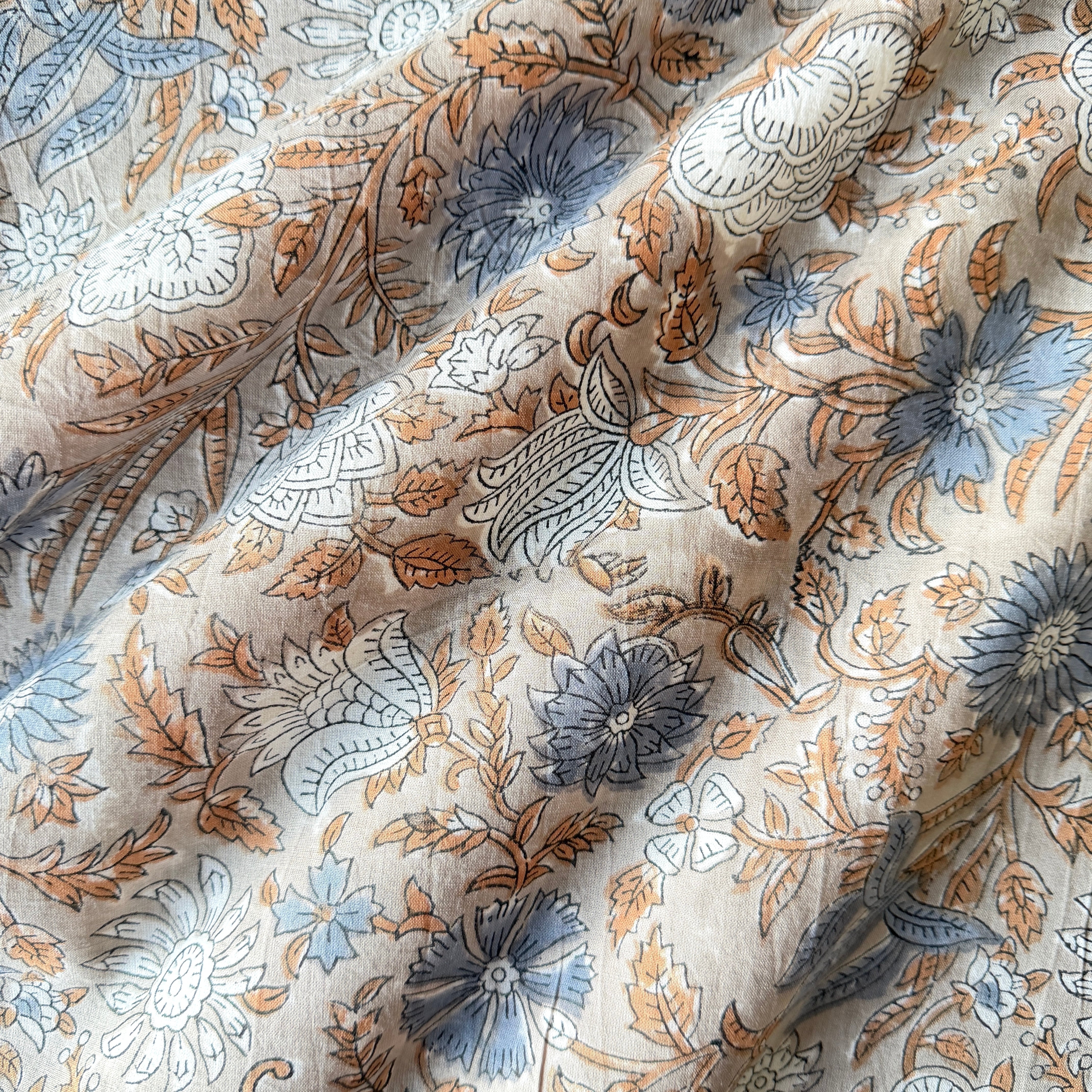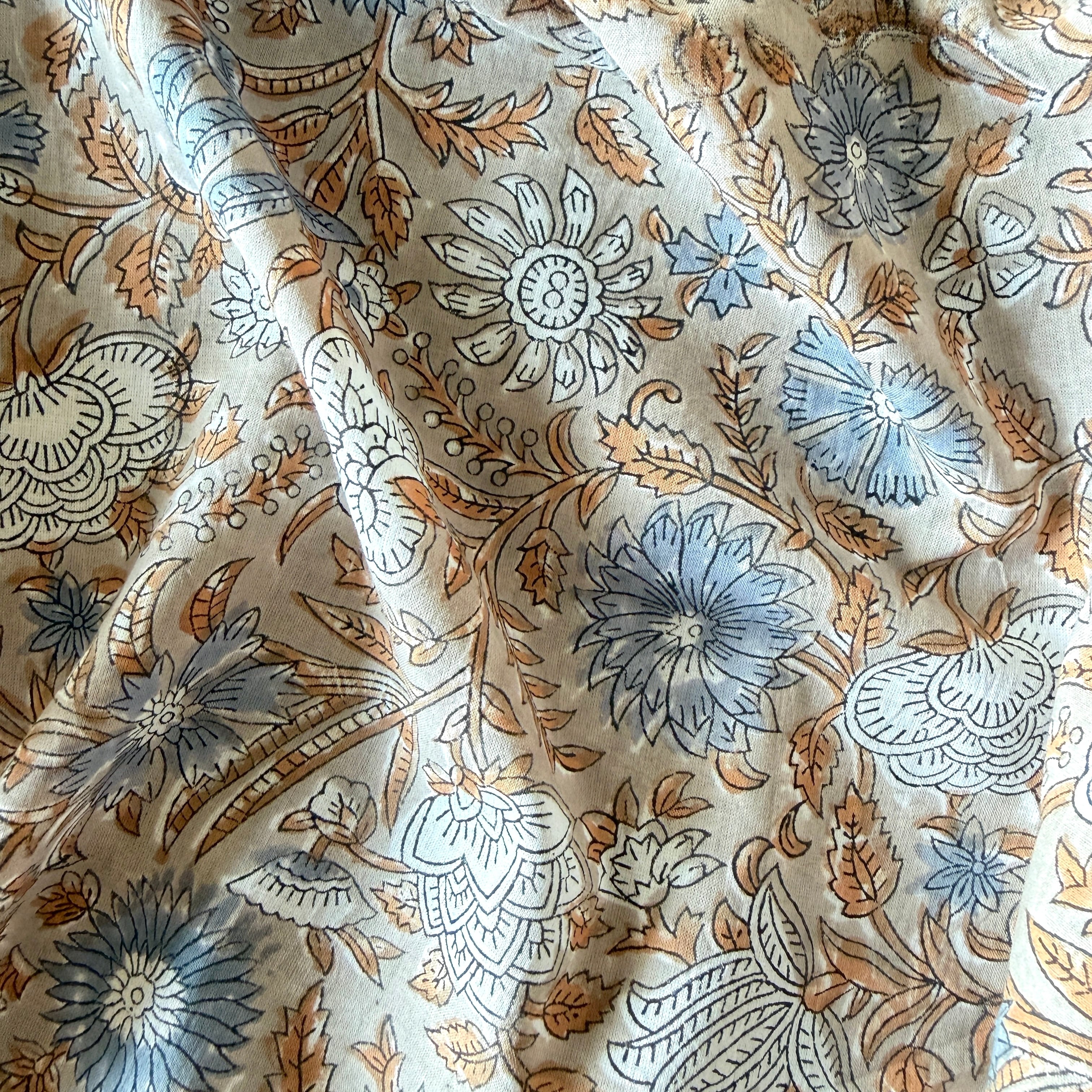 ハンドブロックプリント生地 インド更紗 綿生地 グレーベース スモーキーブルー花柄 薄手コットン GP-26004-sa