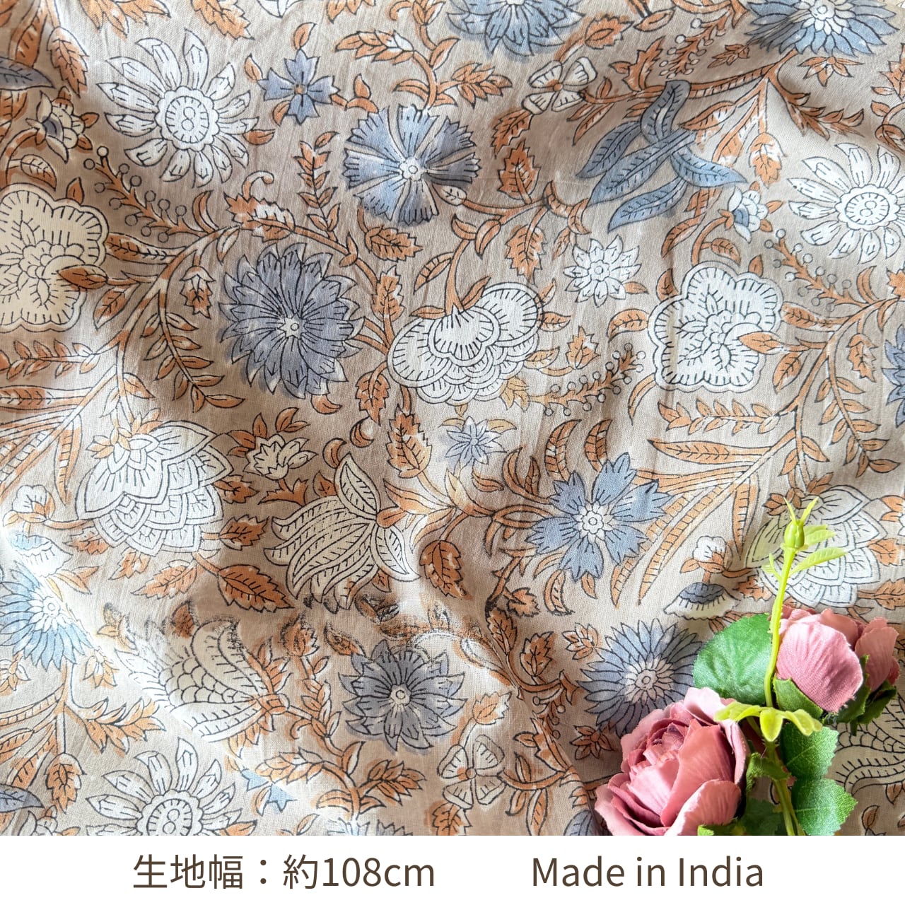 ・ハンドブロックプリント特有のにじみやズレ、かすれや色ムラが見られることがあります。手仕事ならではの表情としてお楽しみいただけますと幸いです。