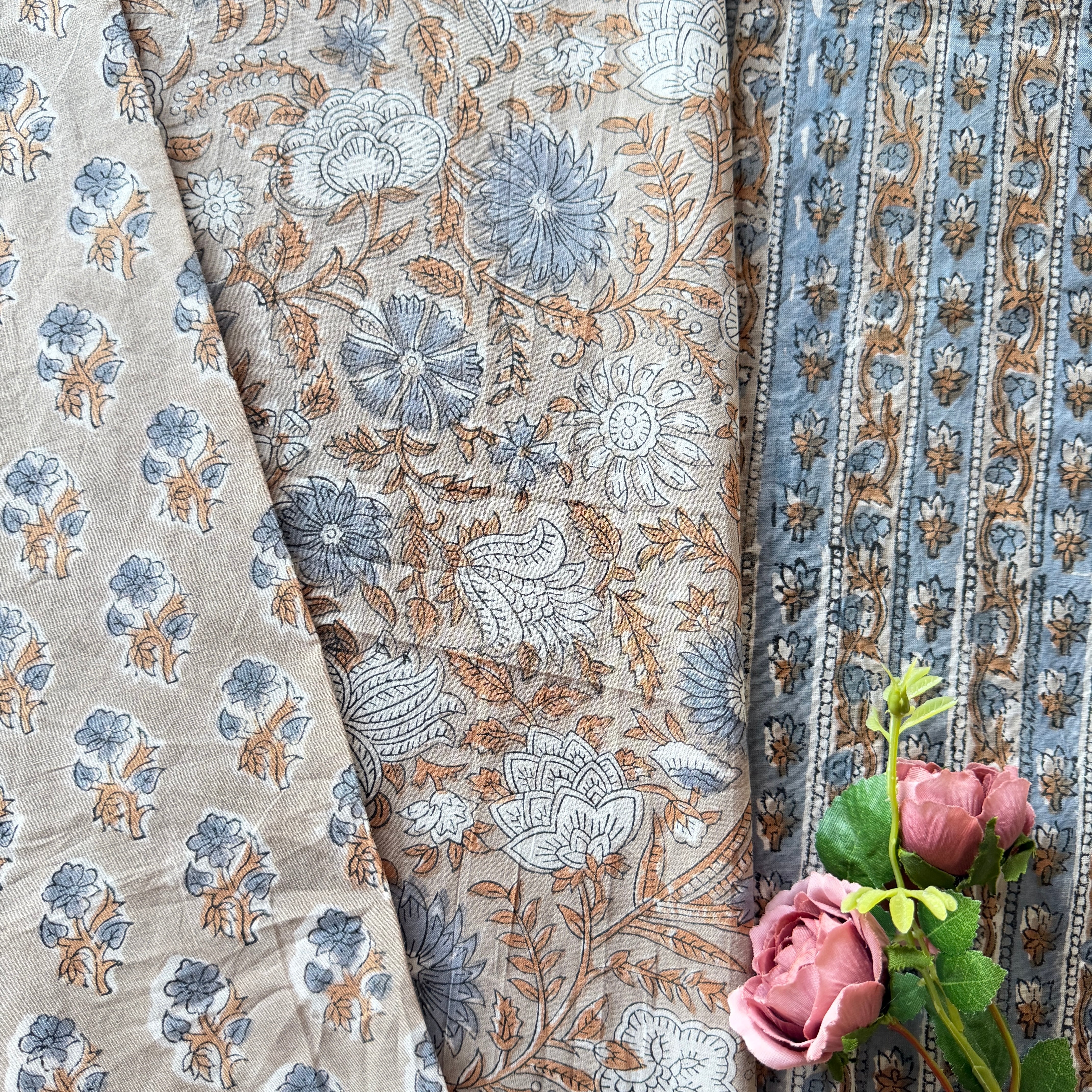 温かみのあるグレーを背景に、落ち着いたブルーグレーの花と白抜きの花が広がるブロックプリント生地です。
