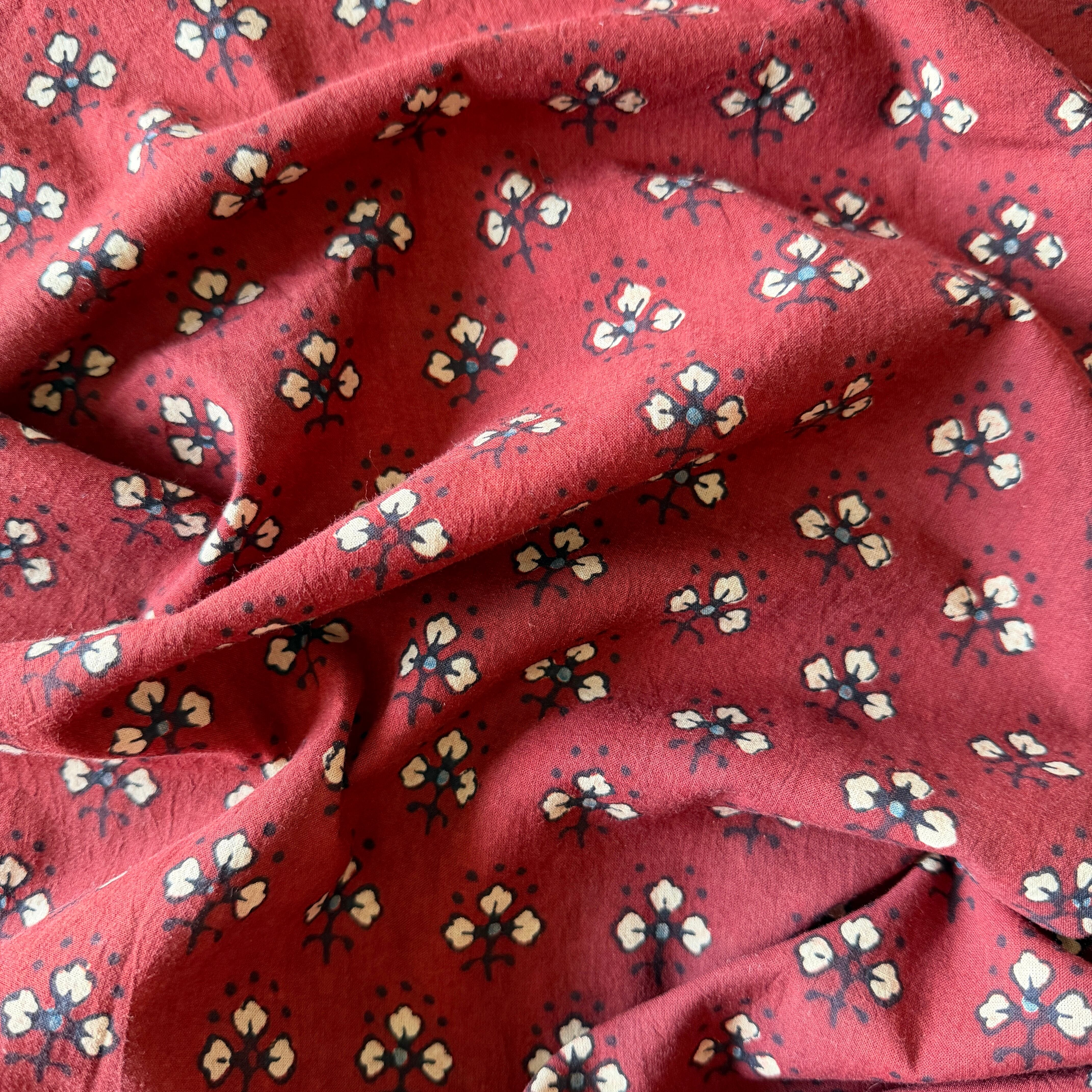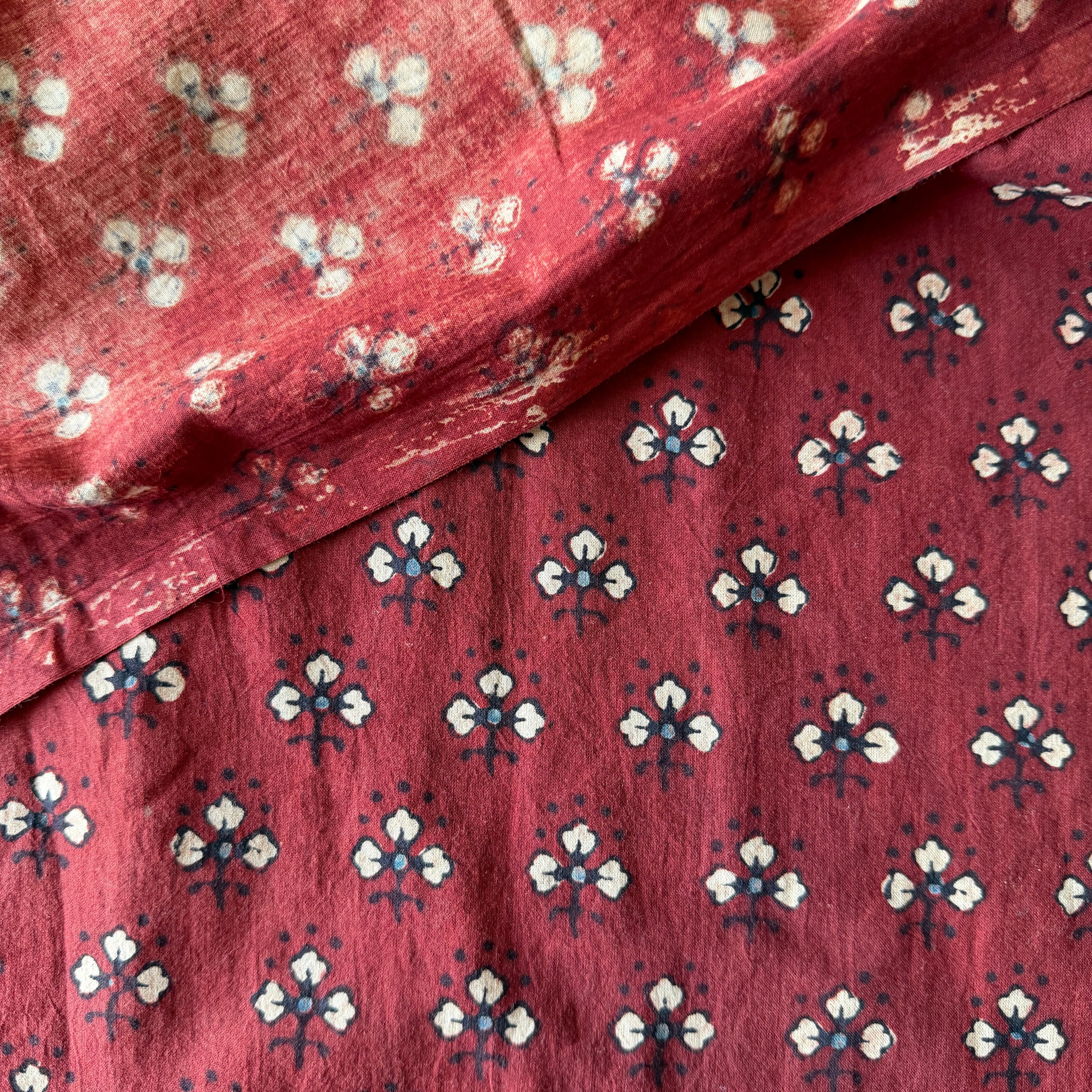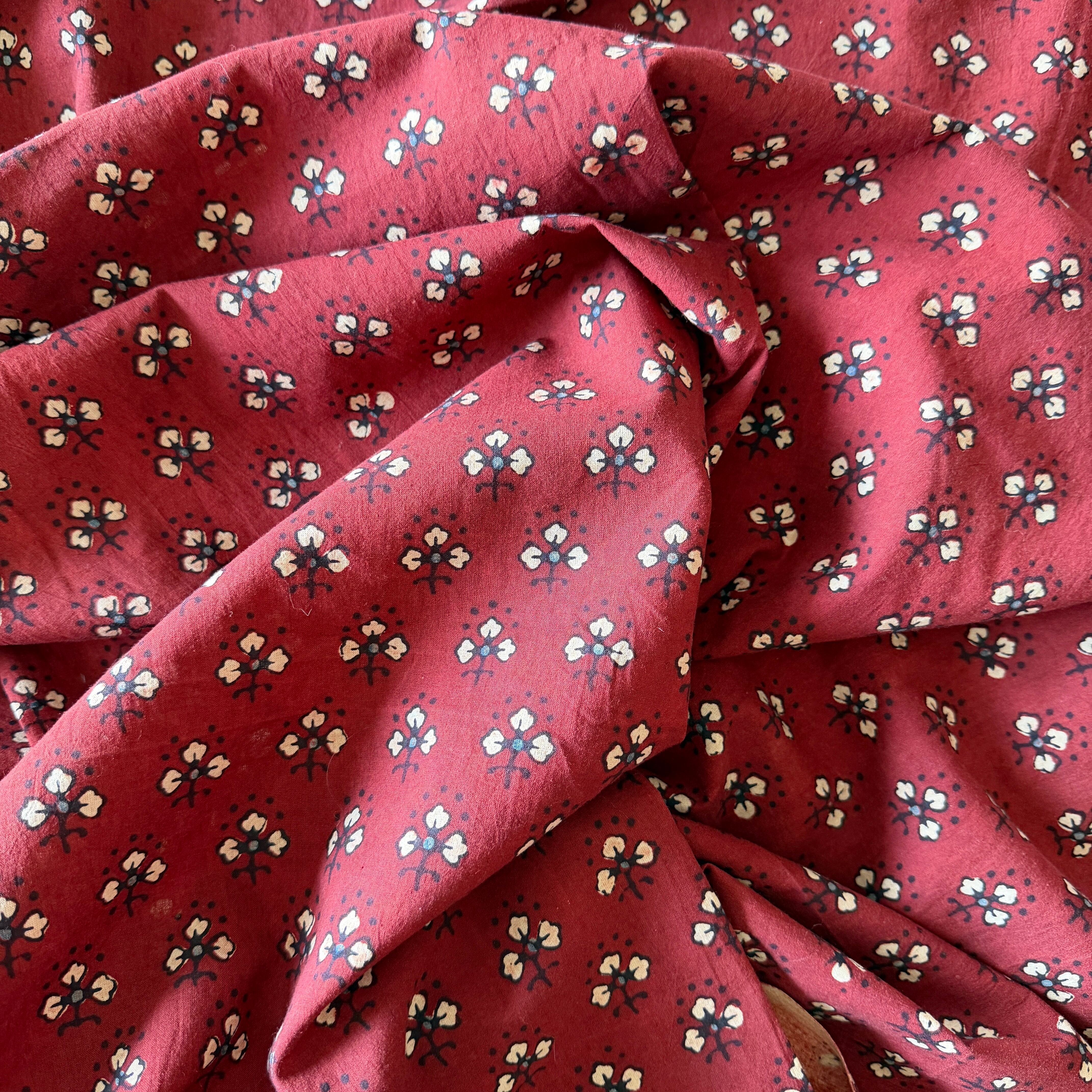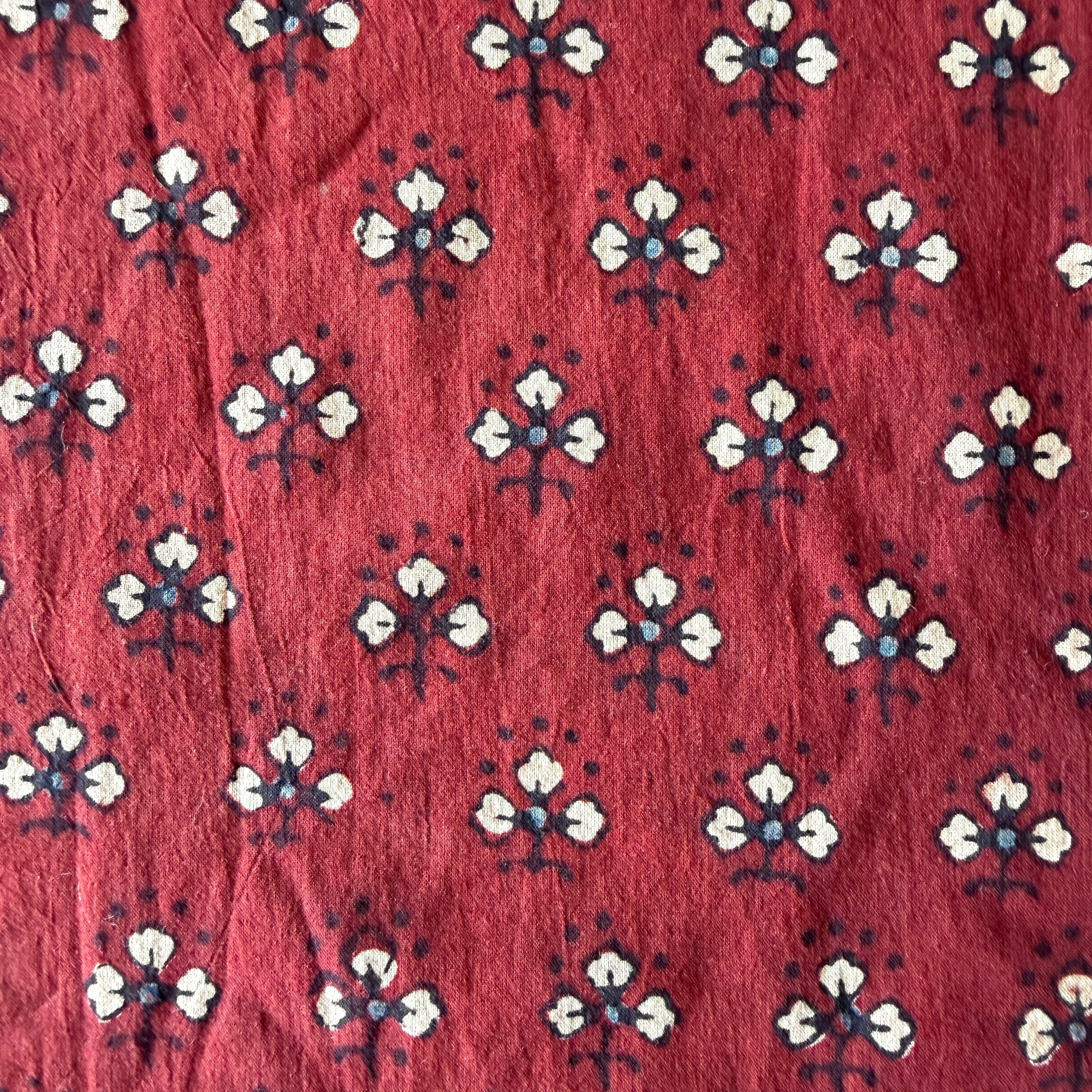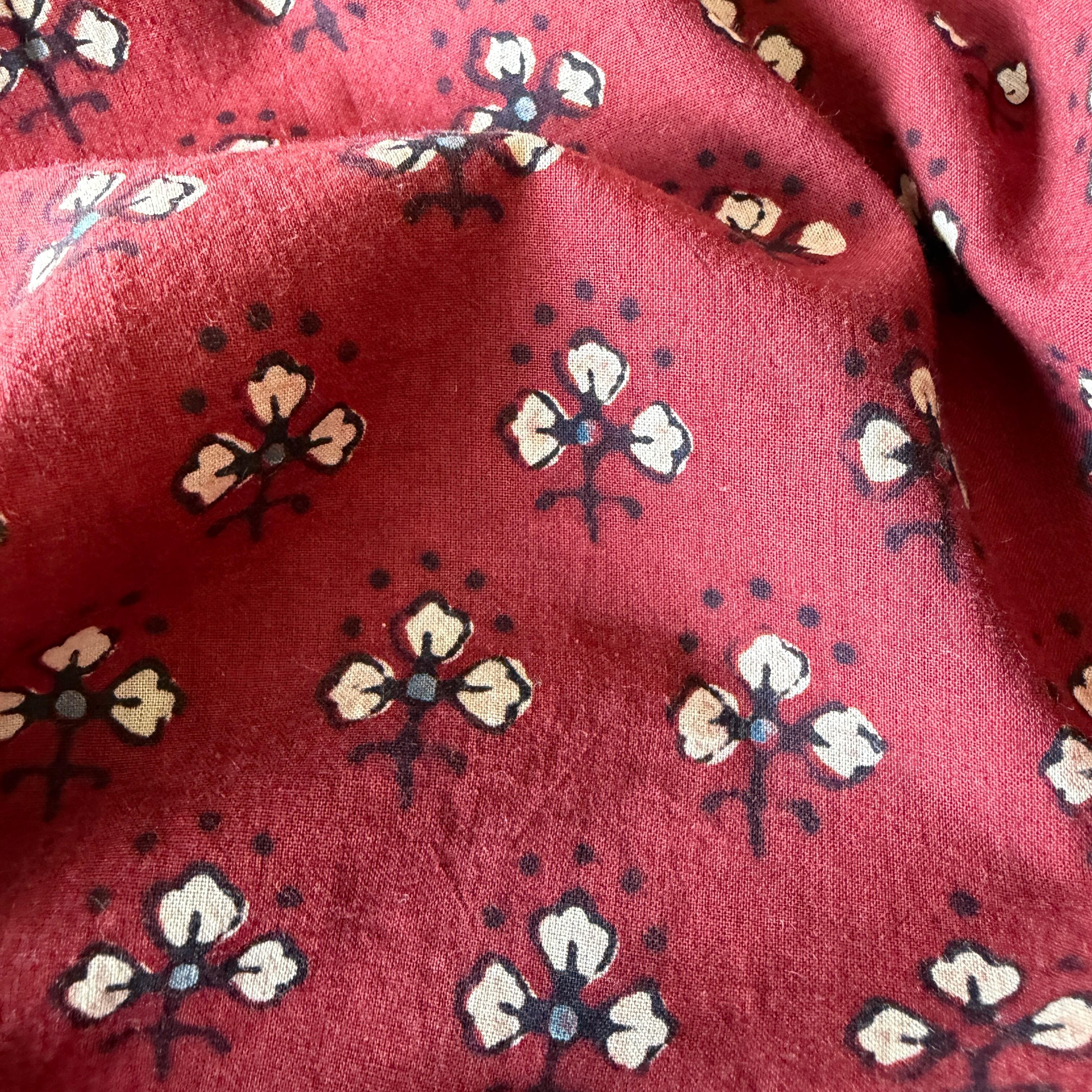 ◾️深みのある赤に、小さな花のようなモチーフが映える。インドのアジュラックプリント生地