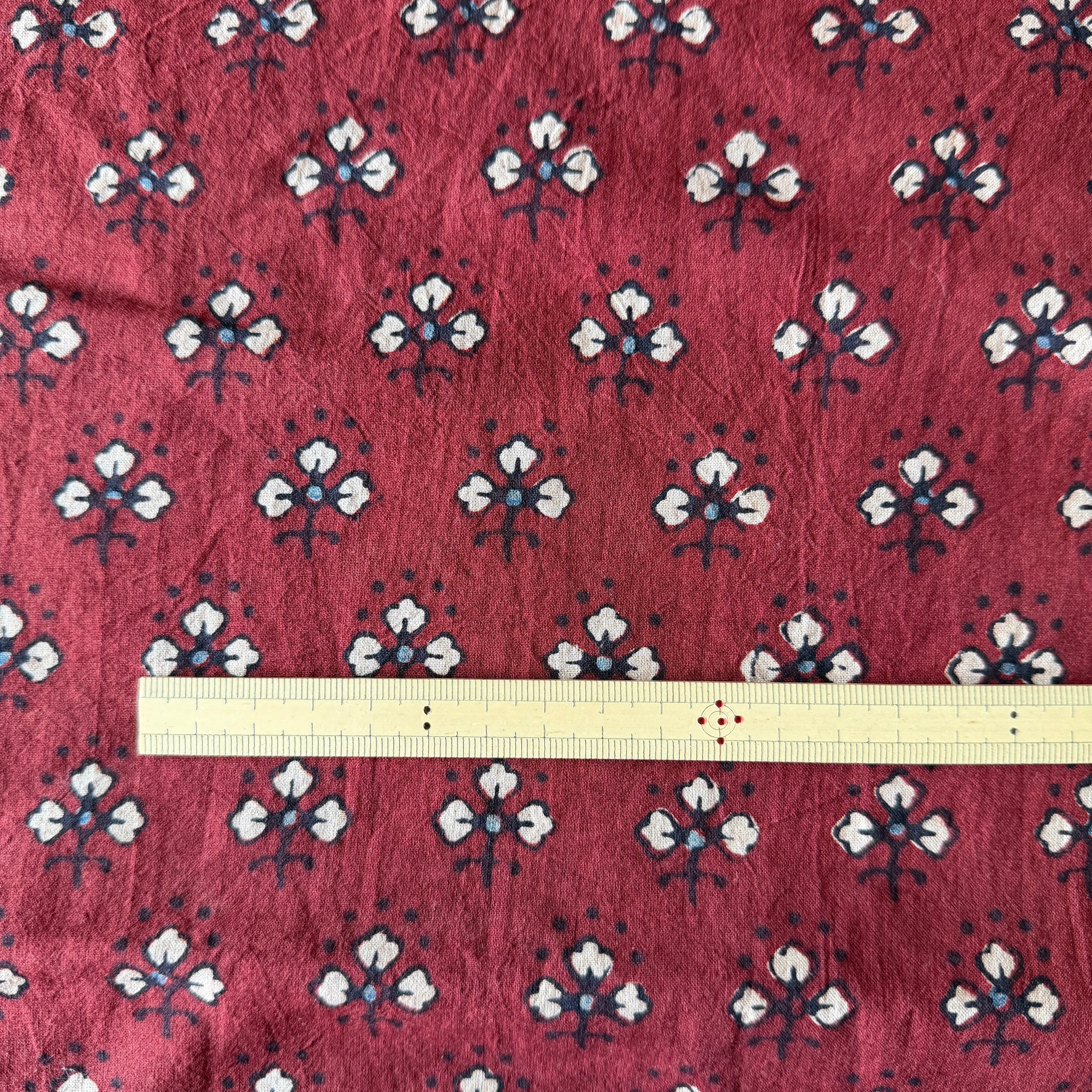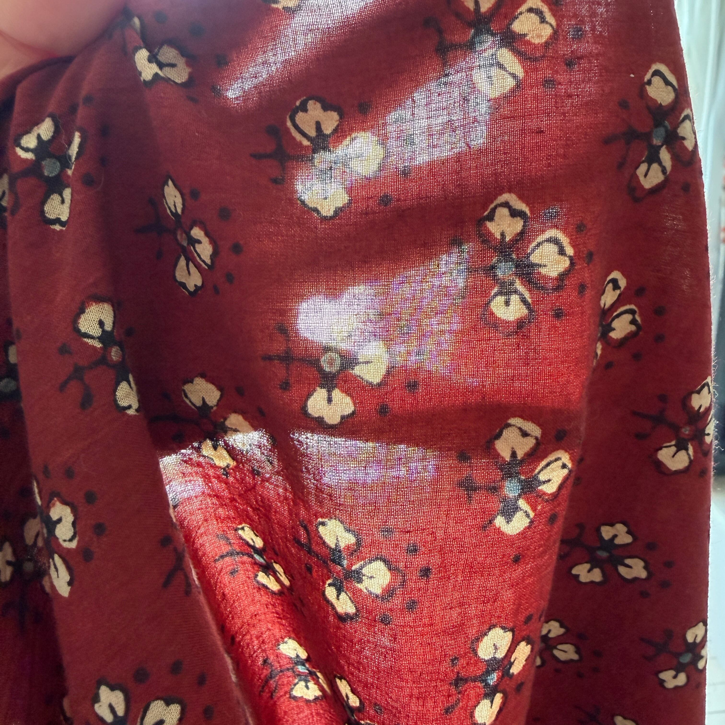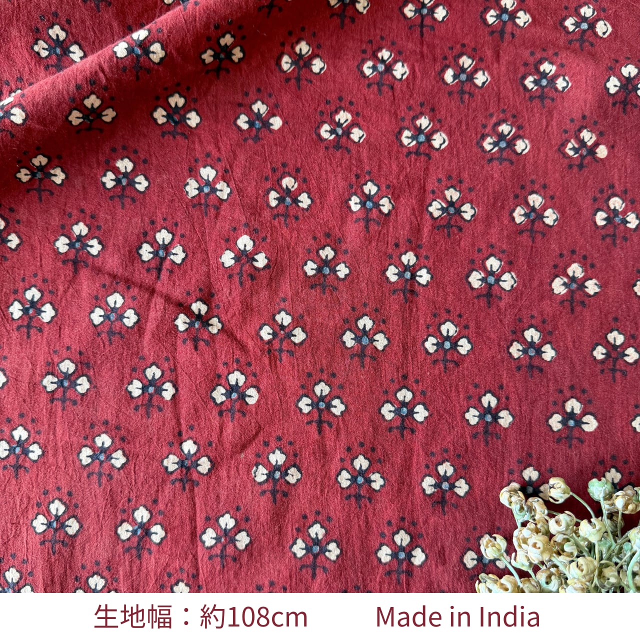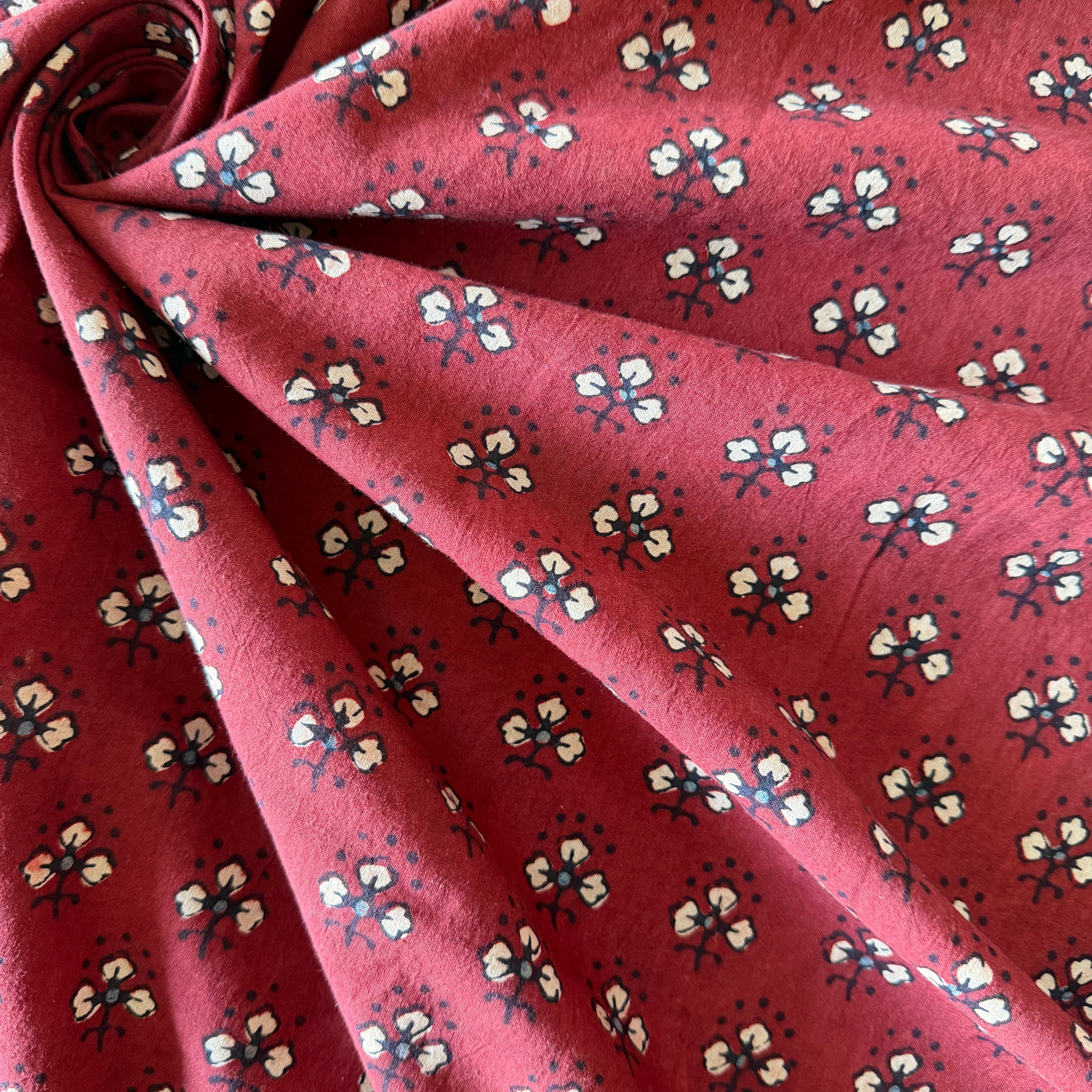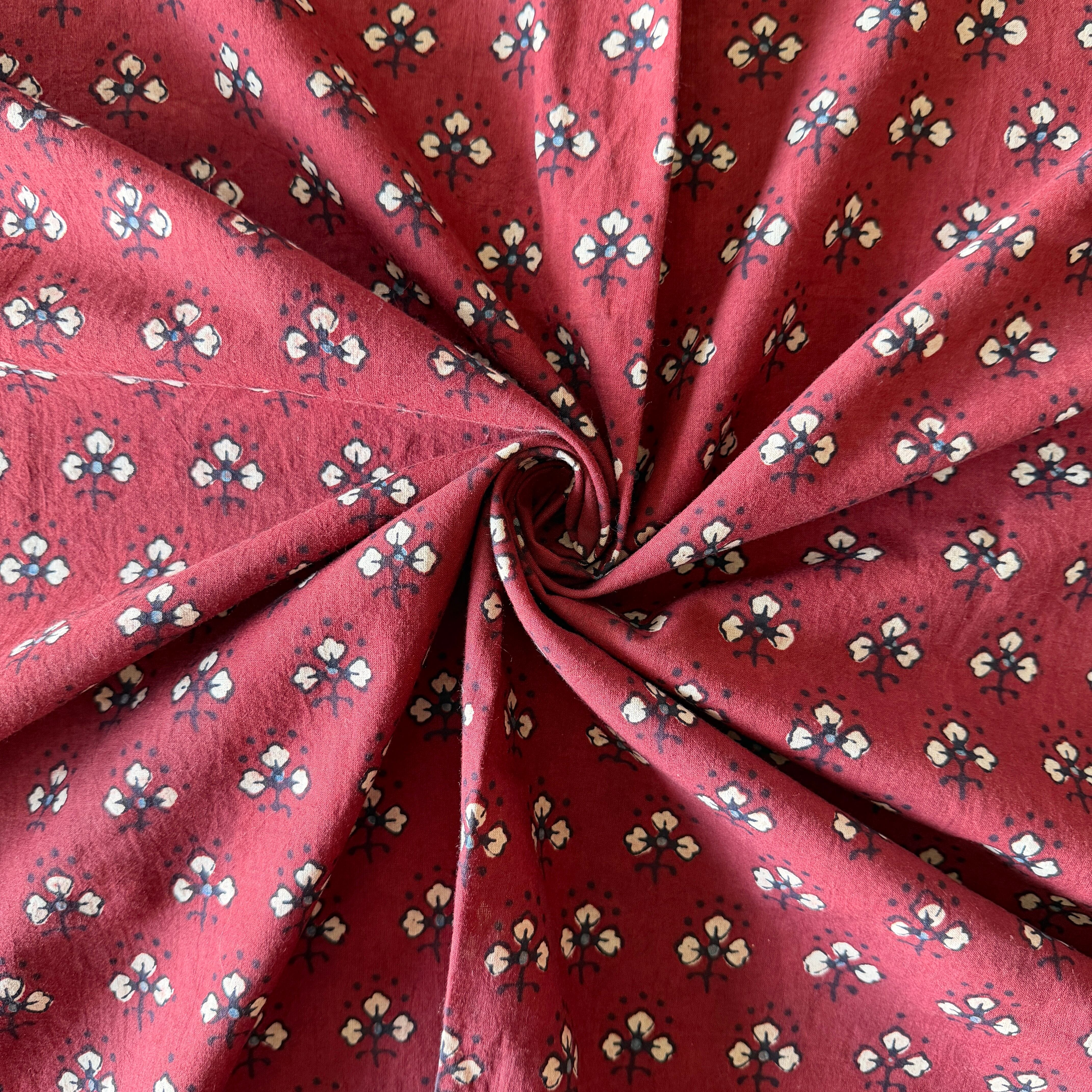 ◾️深みのある赤に、小さな花のようなモチーフが映える。インドのアジュラックプリント生地