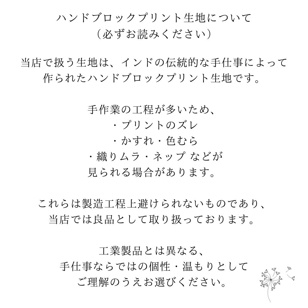 ・ハンドブロックプリント特有のにじみやズレ、かすれや色ムラが見られることがあります。手仕事ならではの表情としてお楽しみいただけますと幸いです。