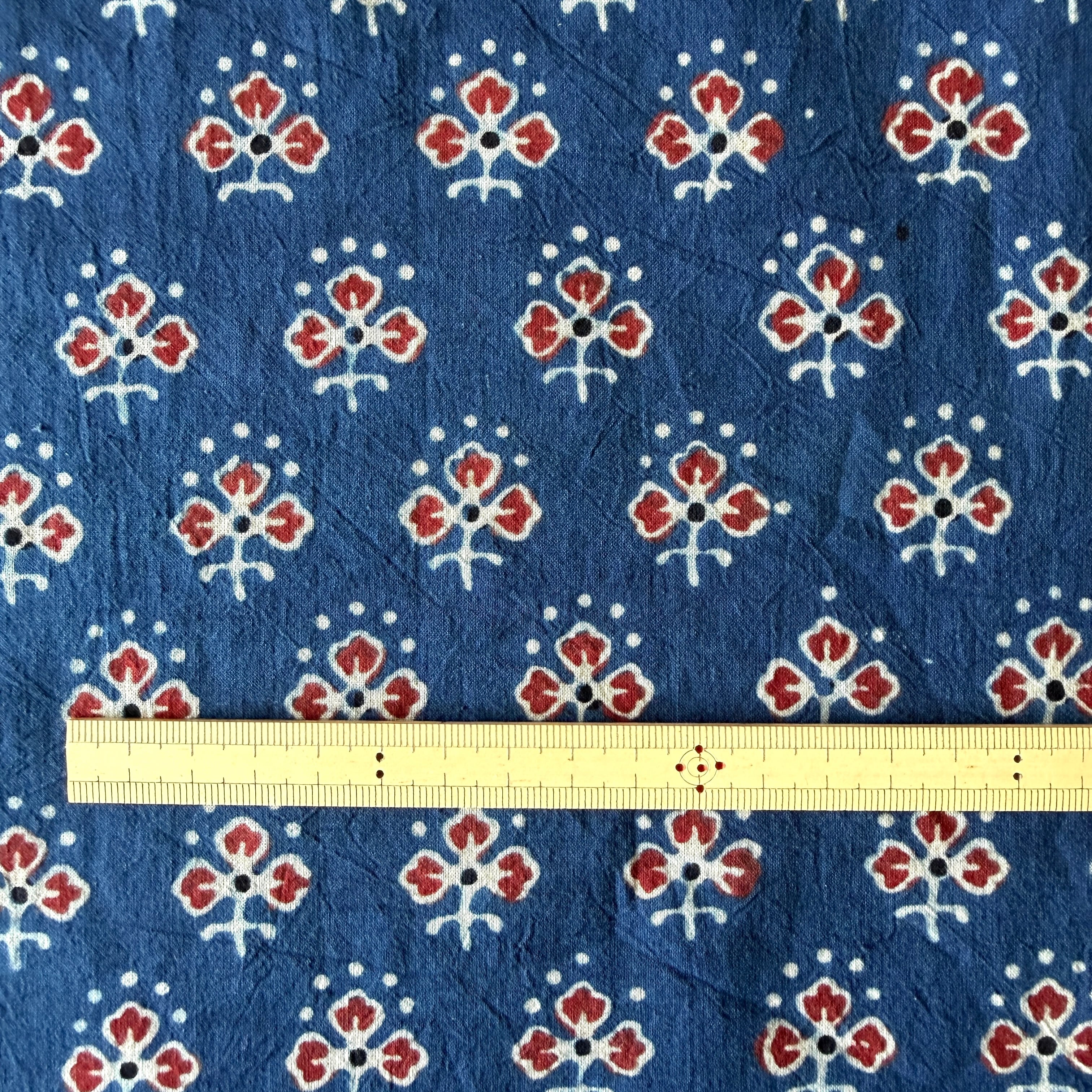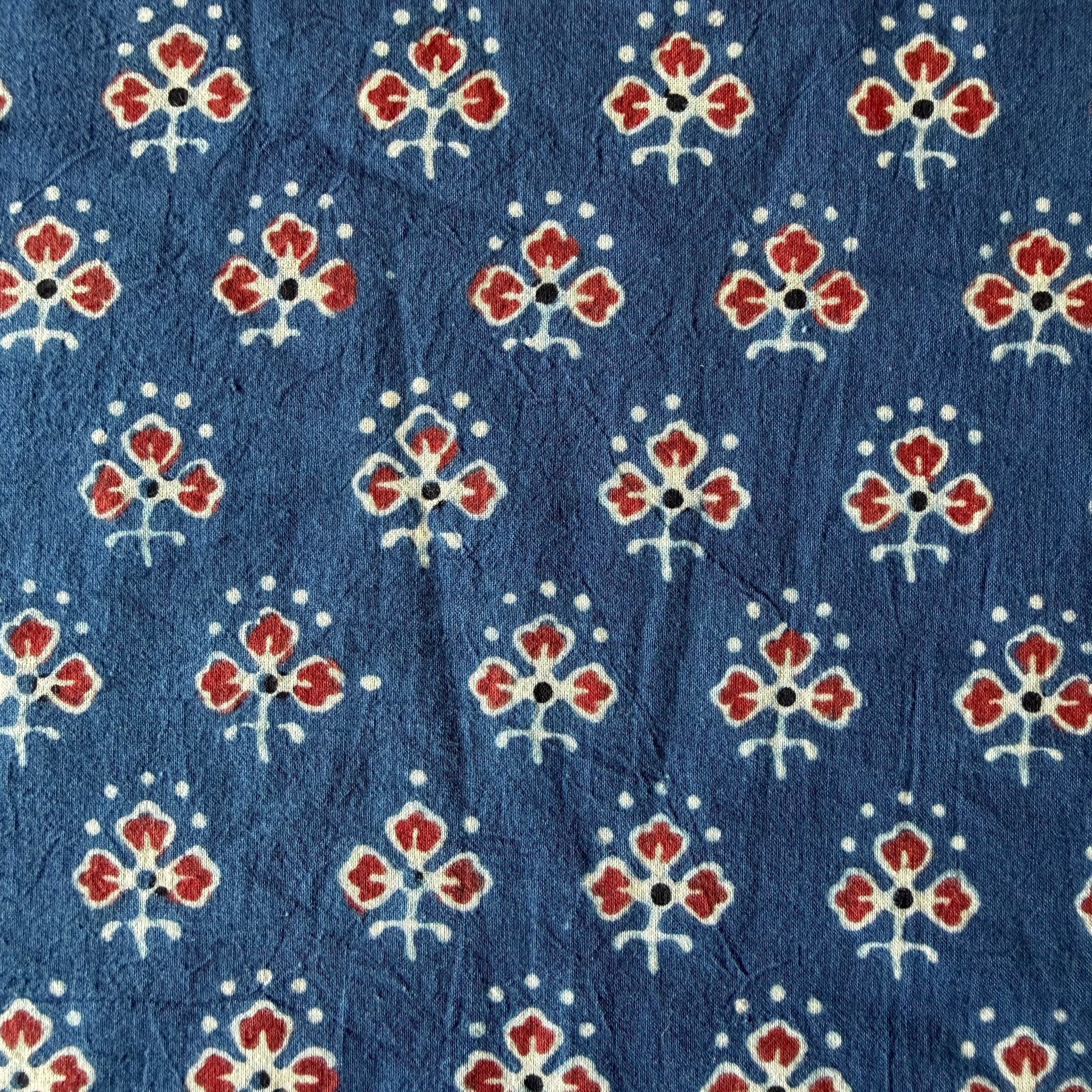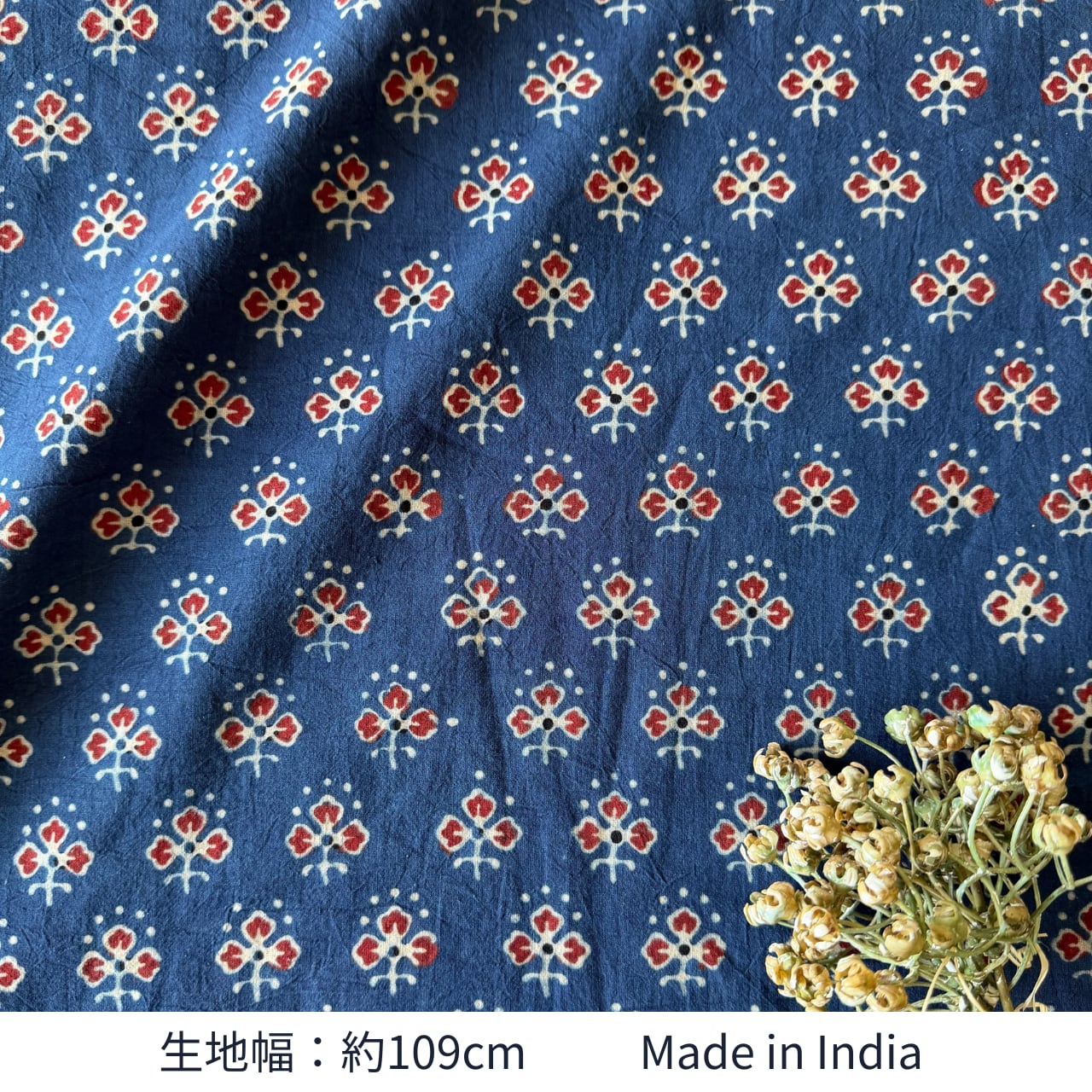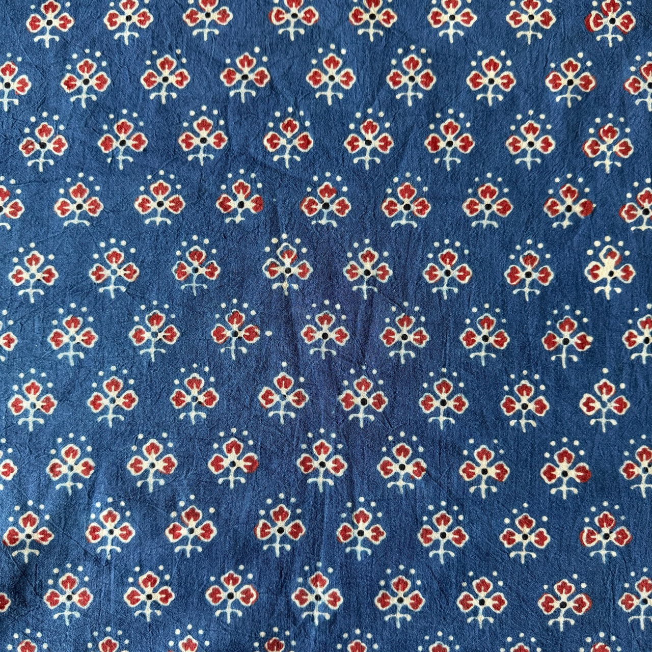 ◾️深みのある青に、小さな花のようなモチーフがやさしく映える。インドのアジュラックプリント生地