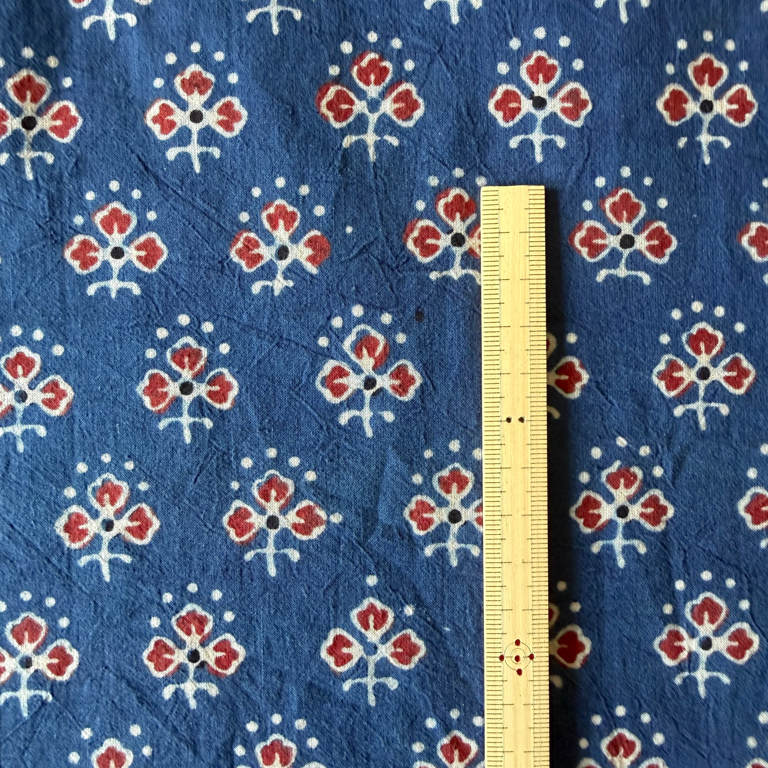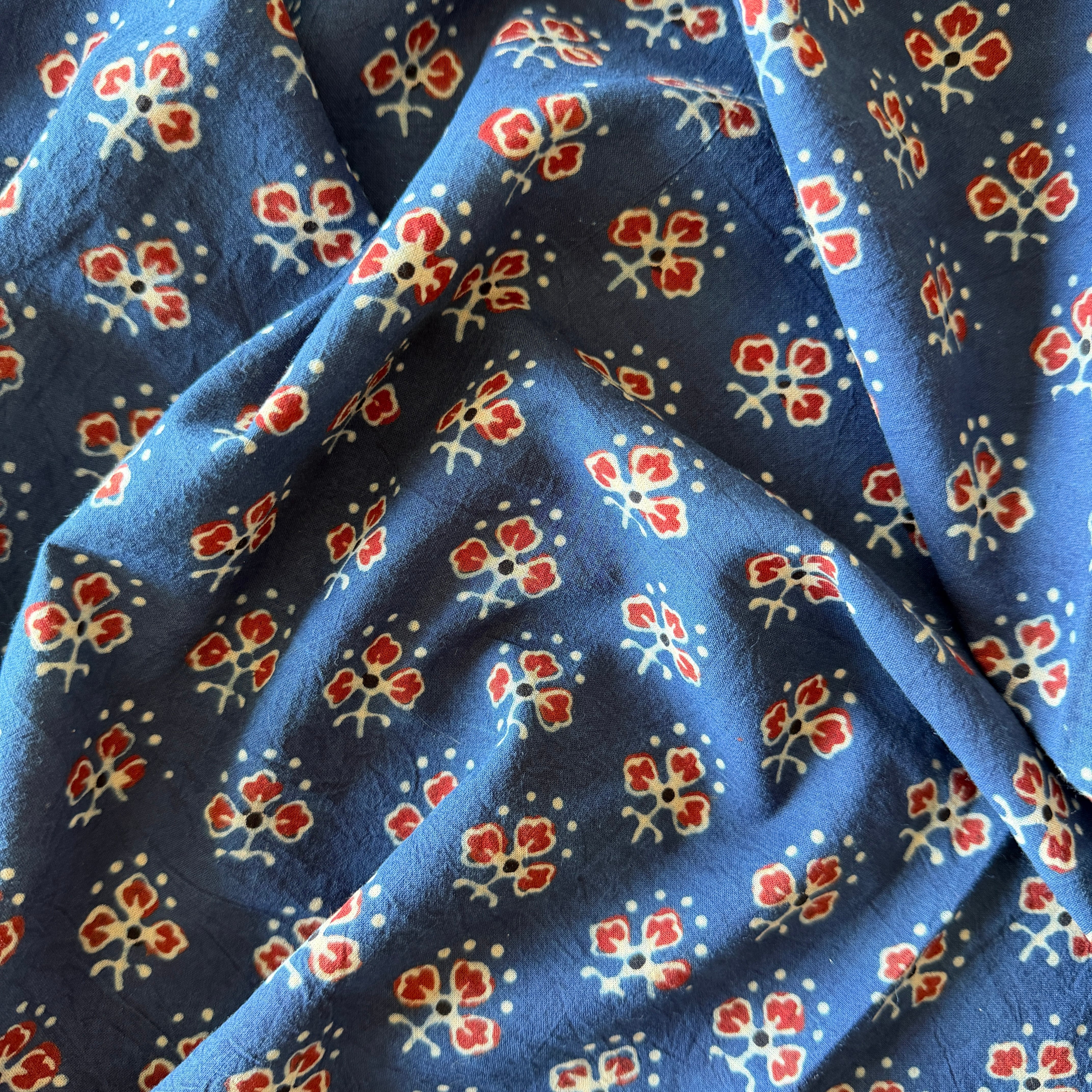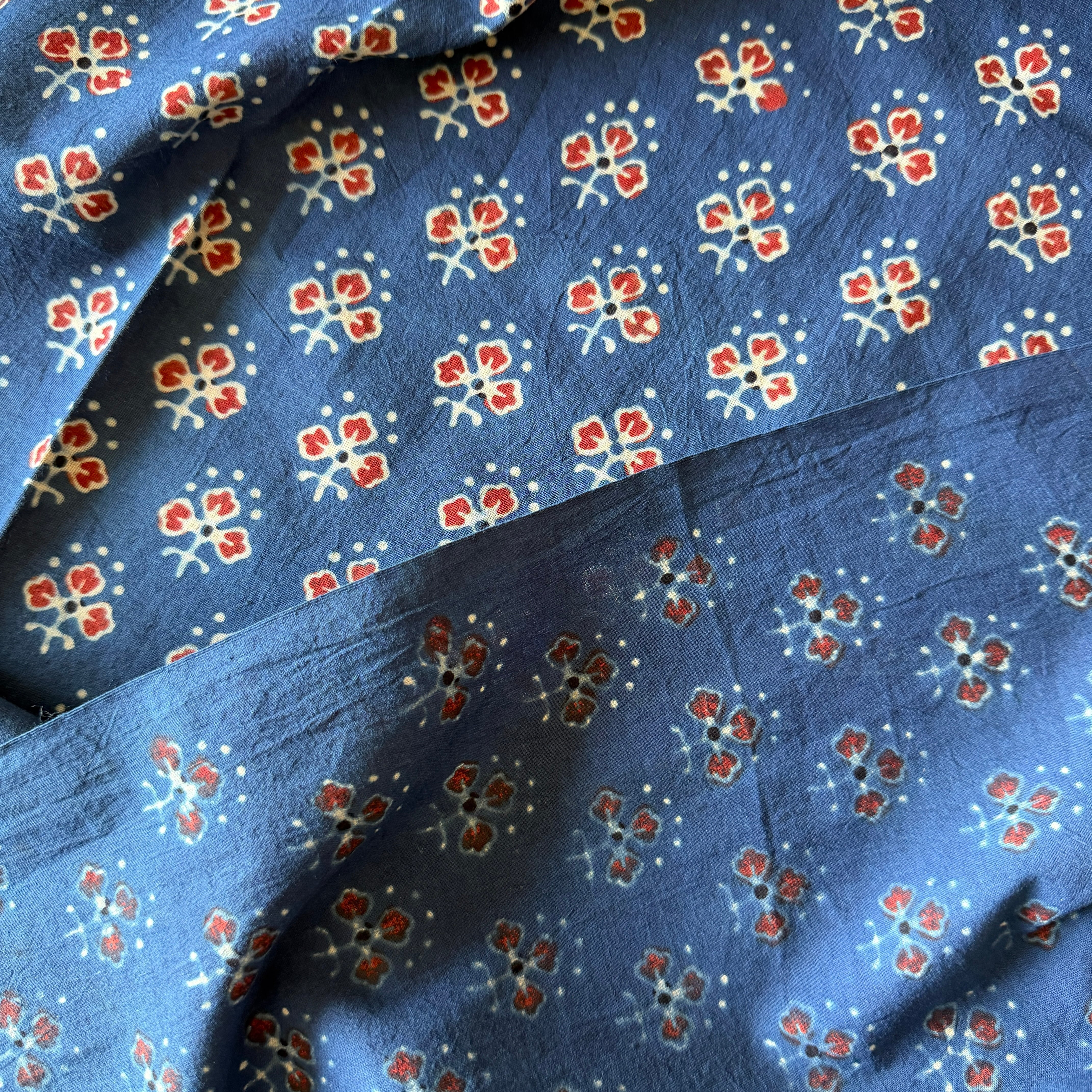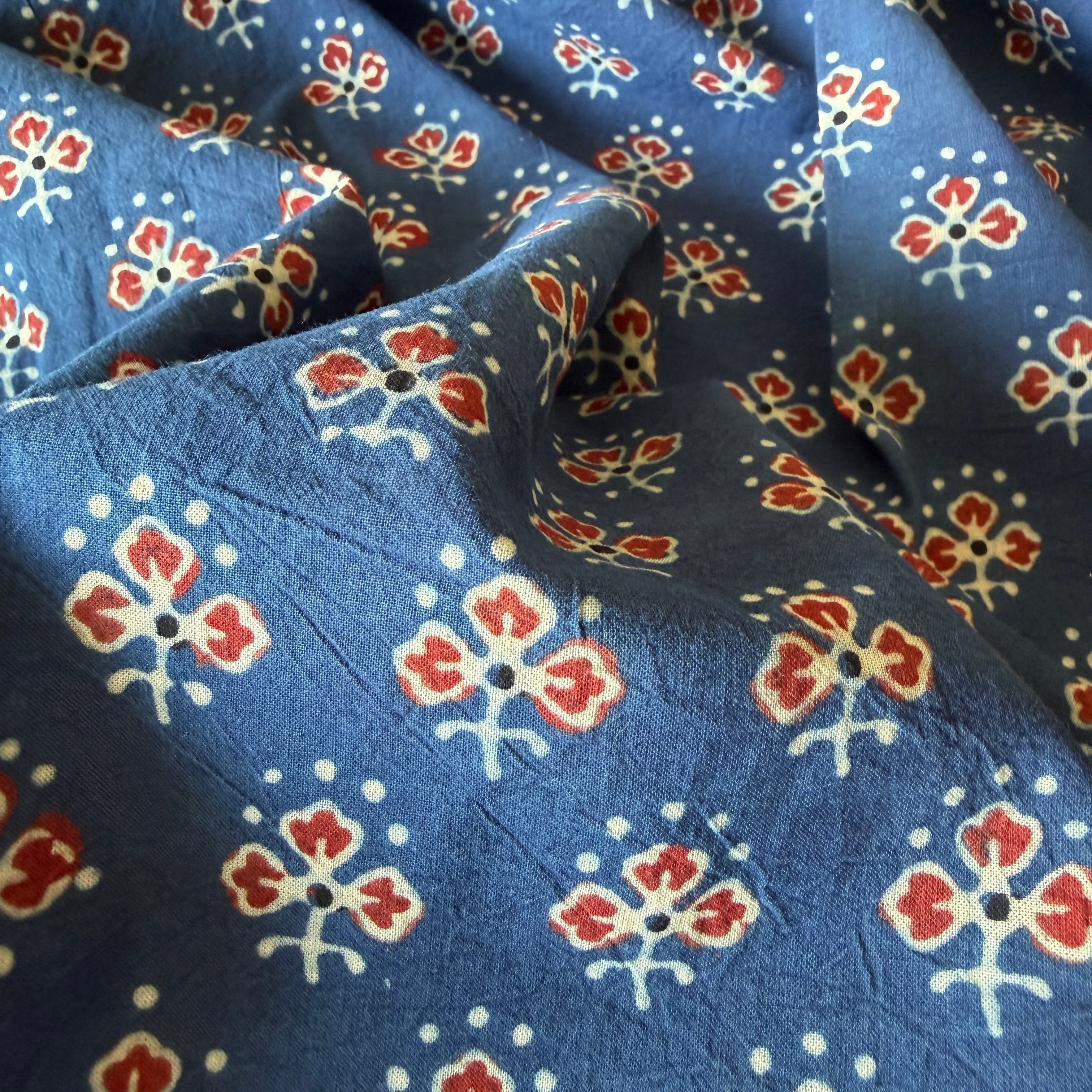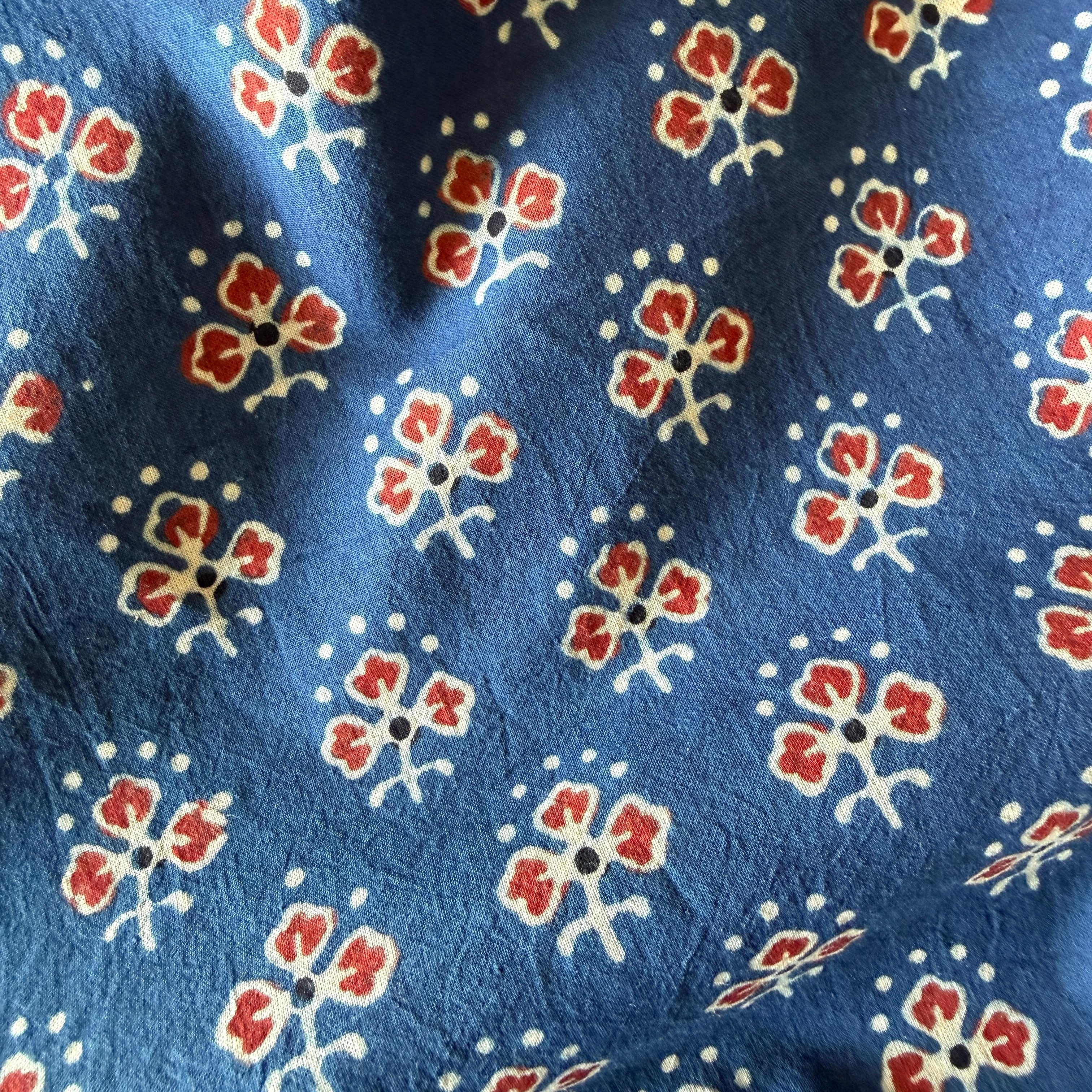 ◾️深みのある青に、小さな花のようなモチーフがやさしく映える。インドのアジュラックプリント生地