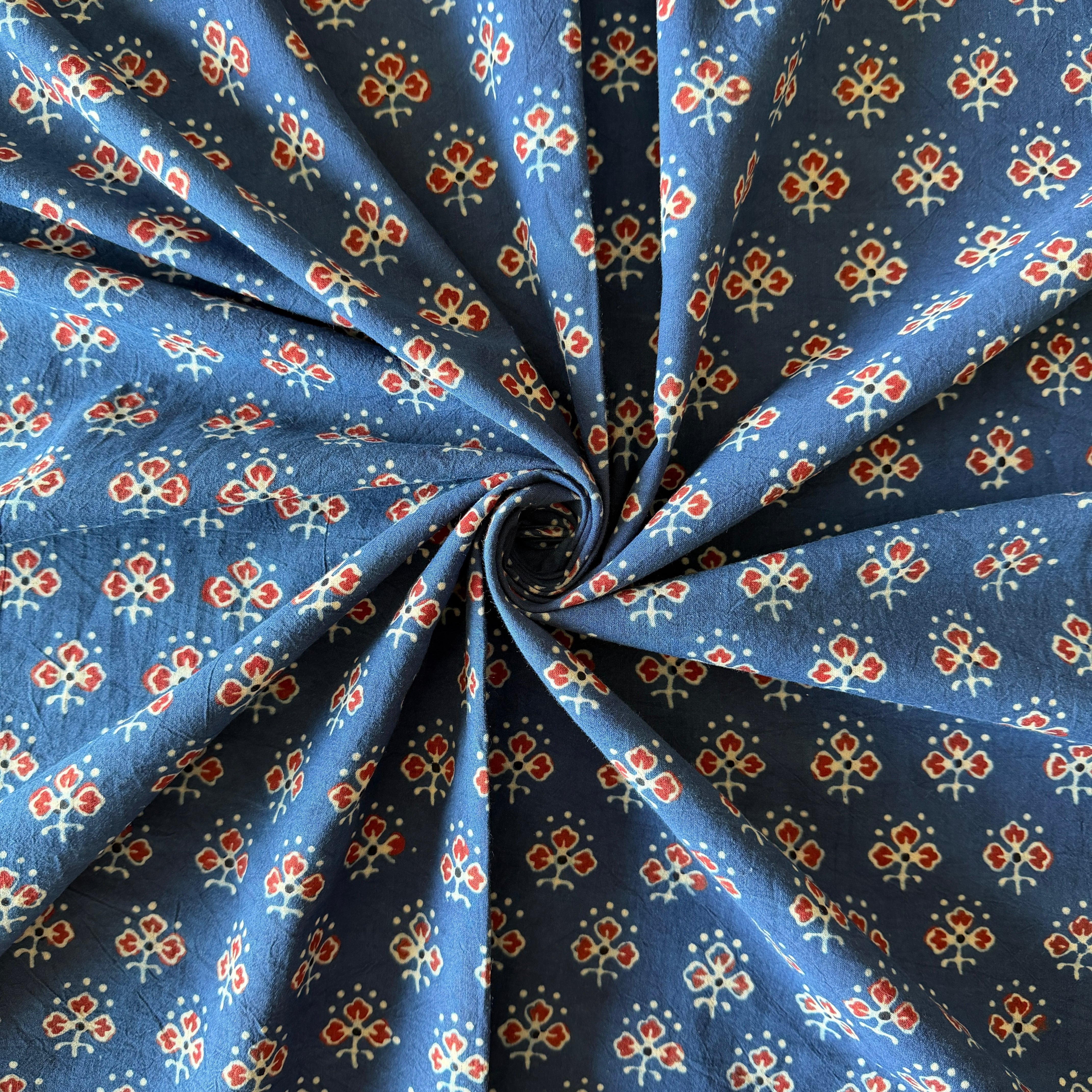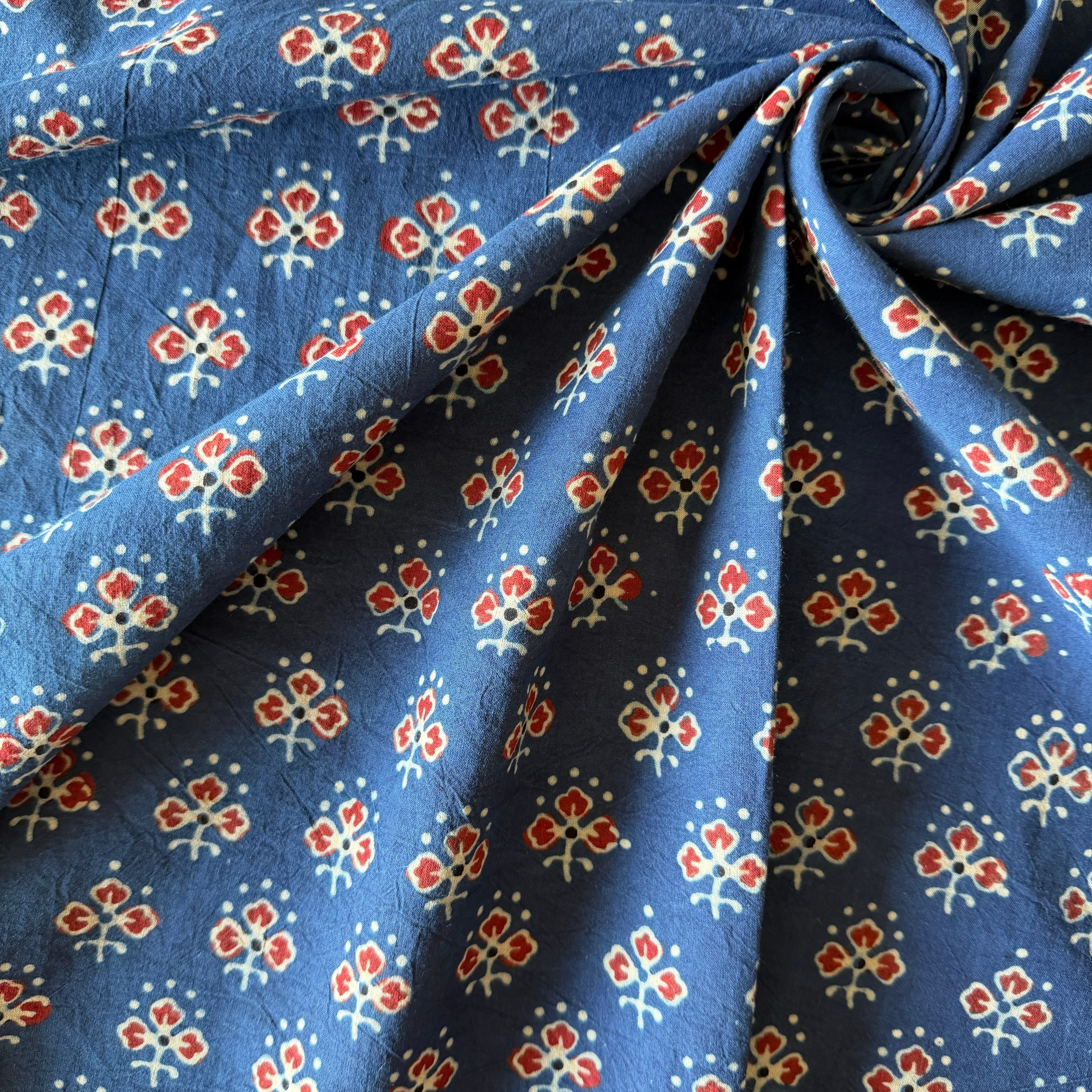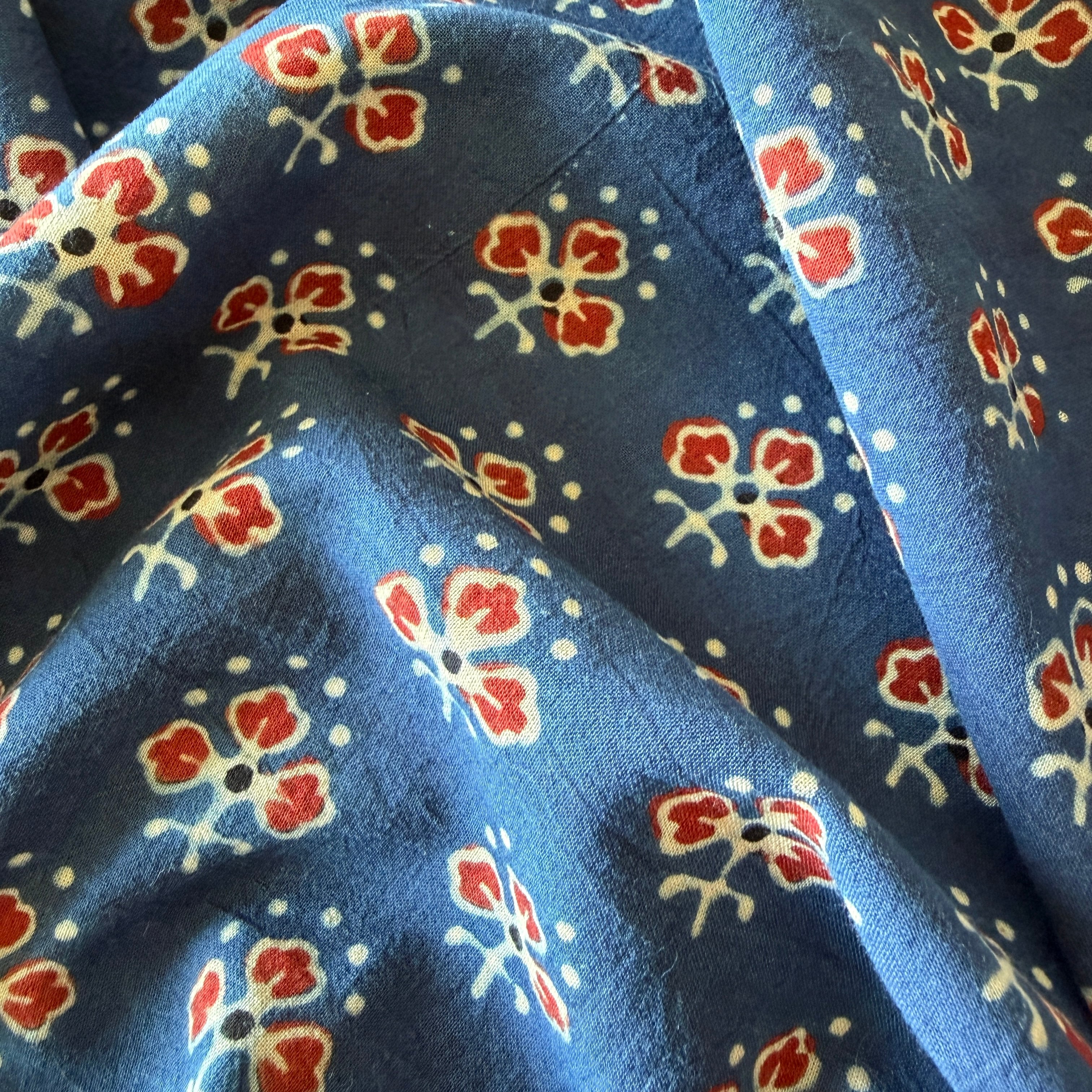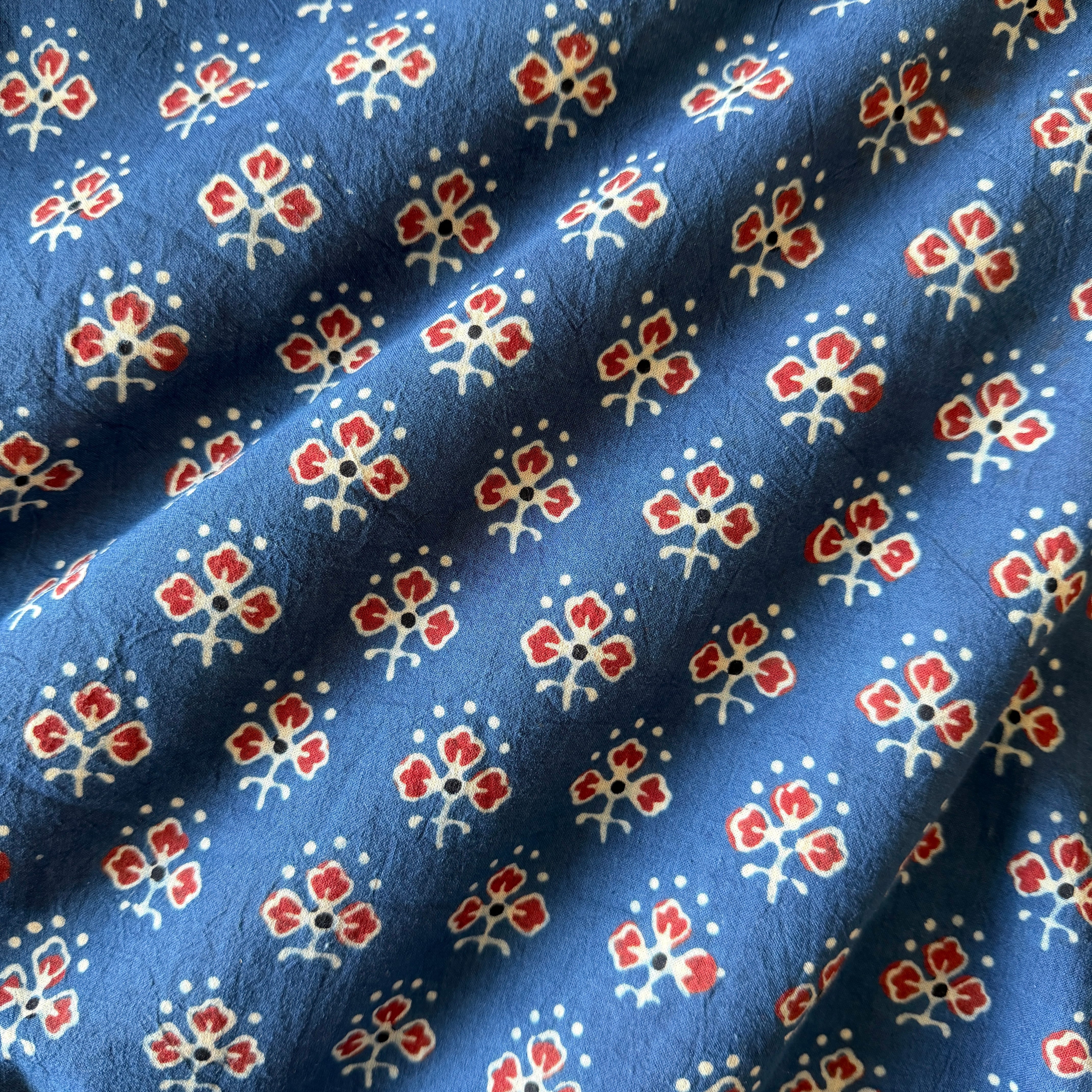 ◾️深みのある青に、小さな花のようなモチーフがやさしく映える。インドのアジュラックプリント生地