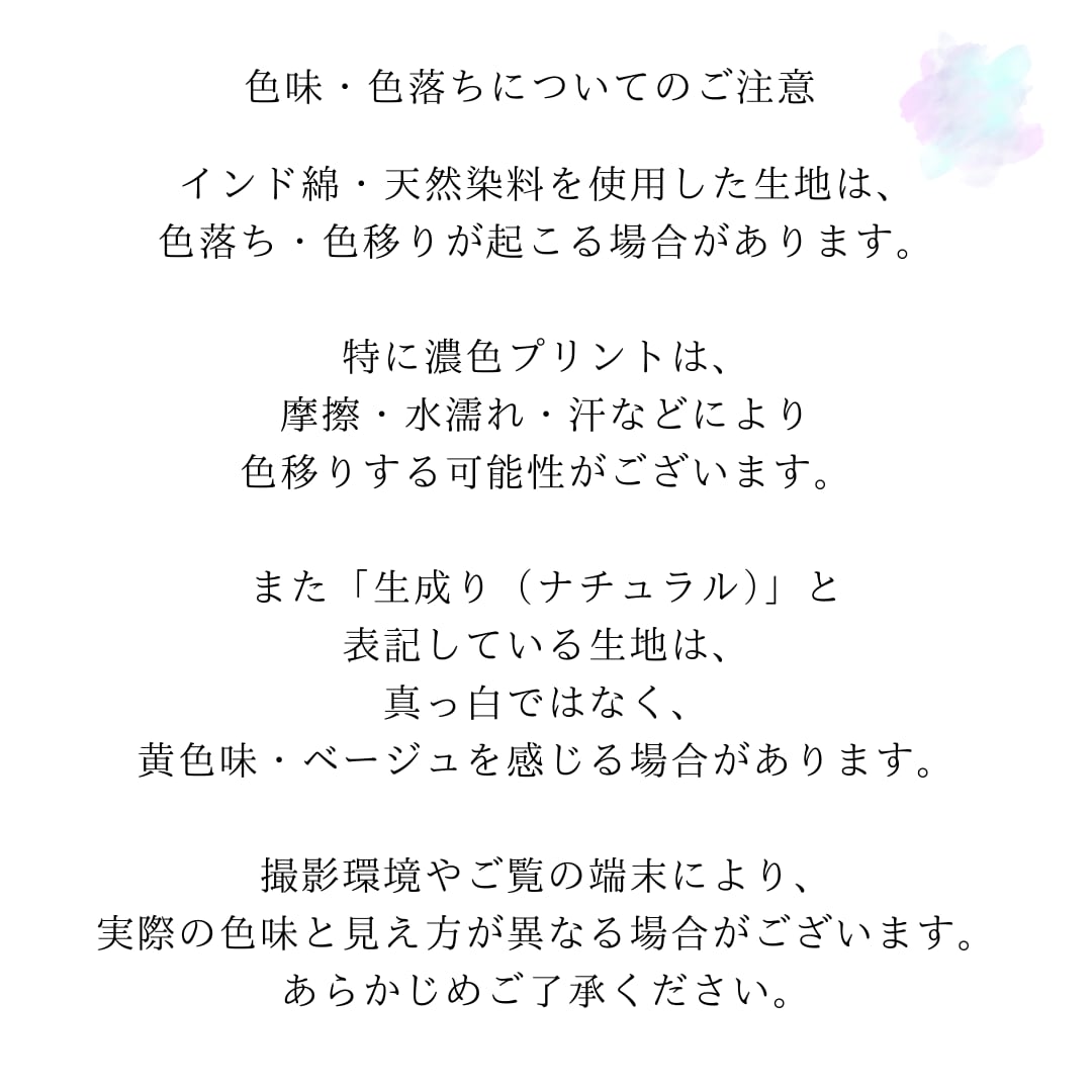 ※こちらの生地は、天然染料を使用した濃色プリントです。お洗濯の際は、単独での取り扱いをおすすめいたします。染料の特性上、摩擦や水濡れにより色移り・色落ちする場合がございます。