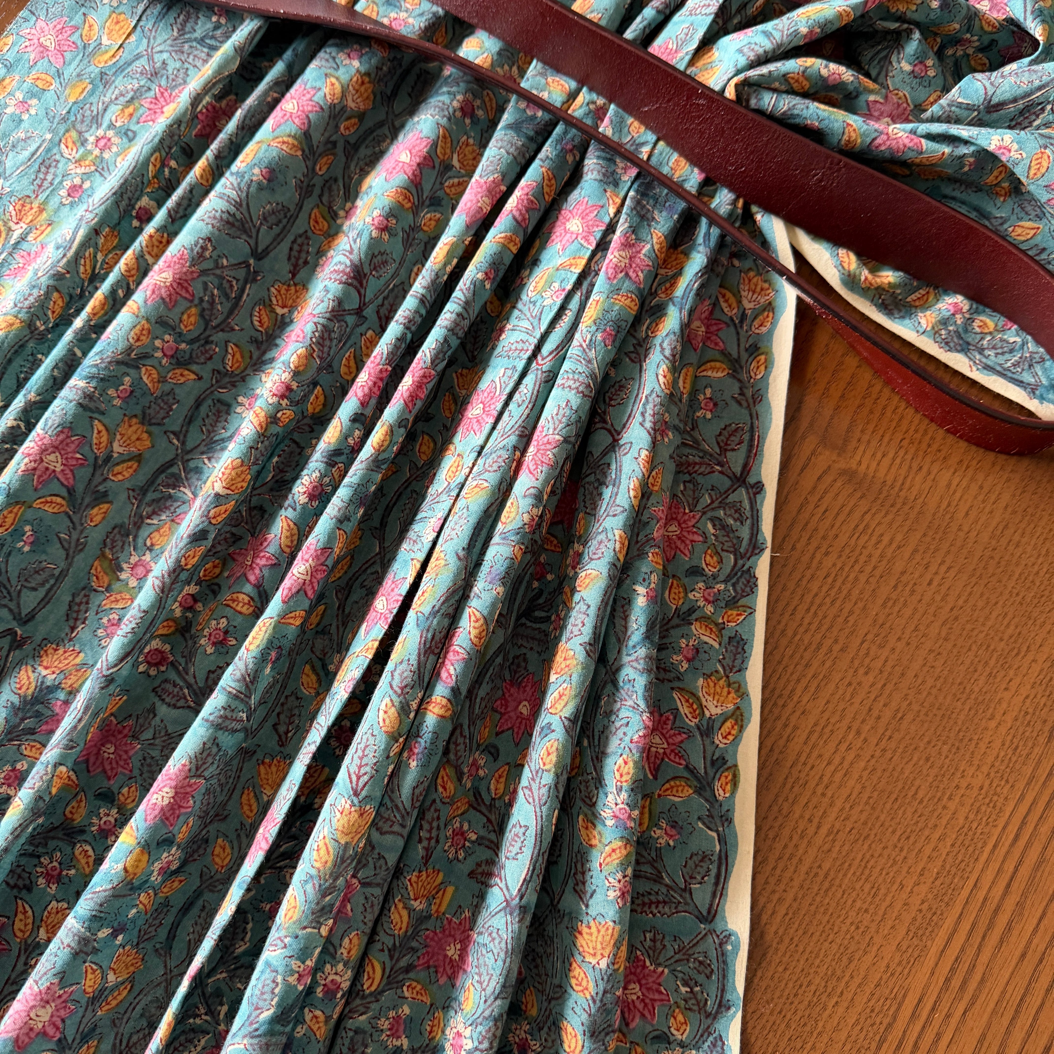 ◾️深みのあるブルーグリーンに、可憐な花々がやさしく咲く。華やかさと落ち着きをあわせ持つインドのブロックプリント生地