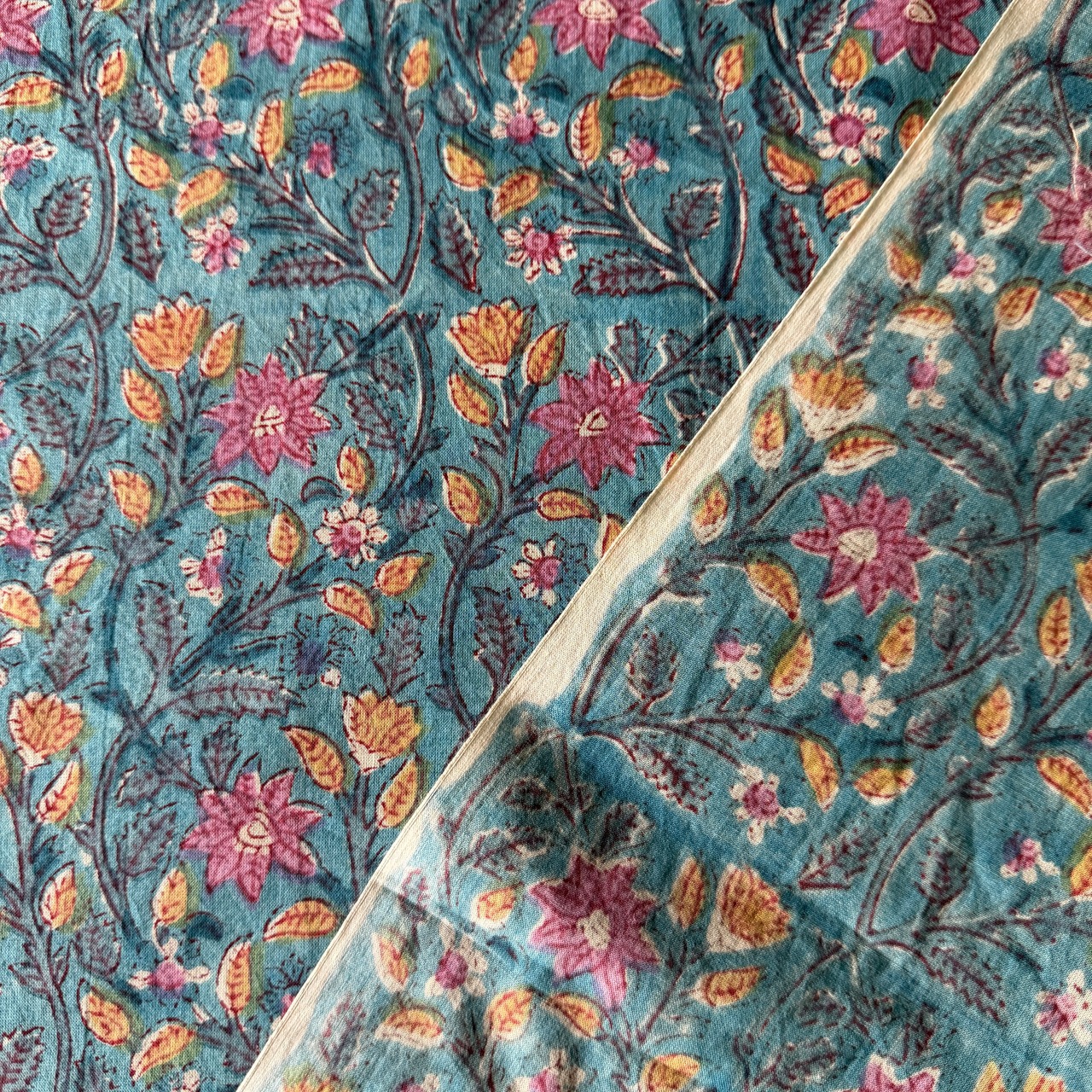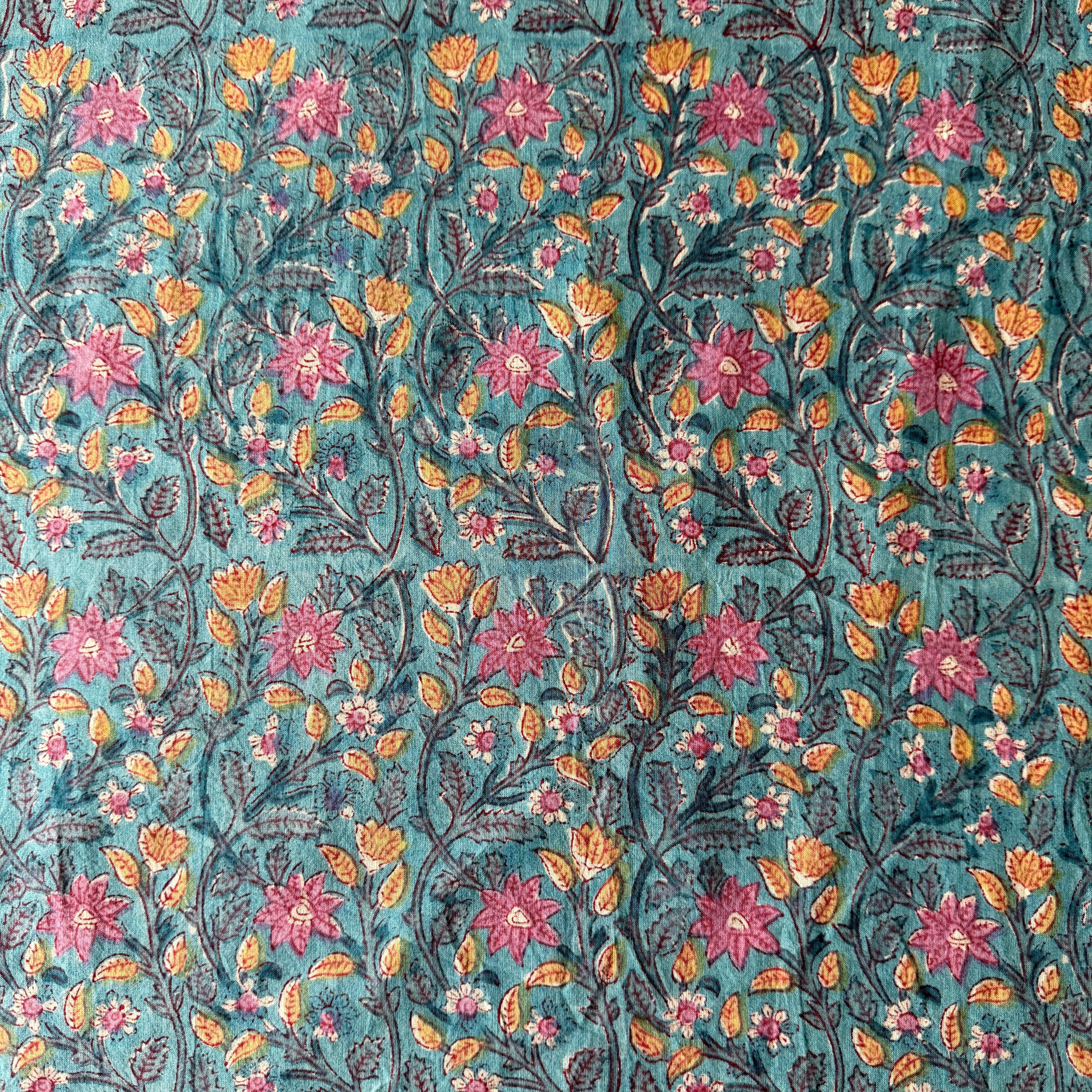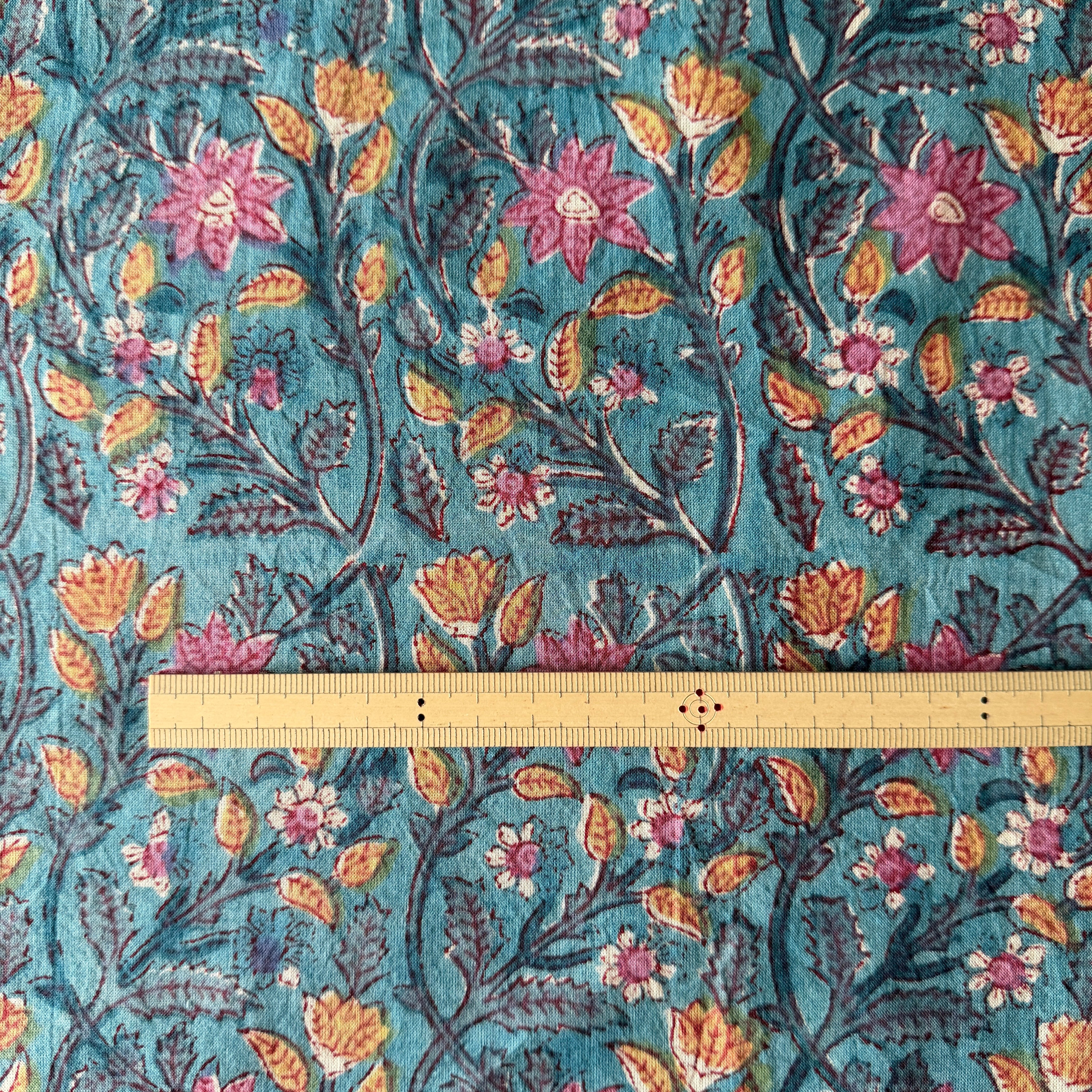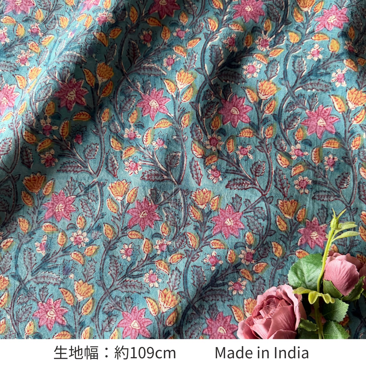 深みのあるブルーグリーンをベースに、ピンクやイエローの花や葉がやさしく散りばめられた、インドのハンドブロックプリント生地です。