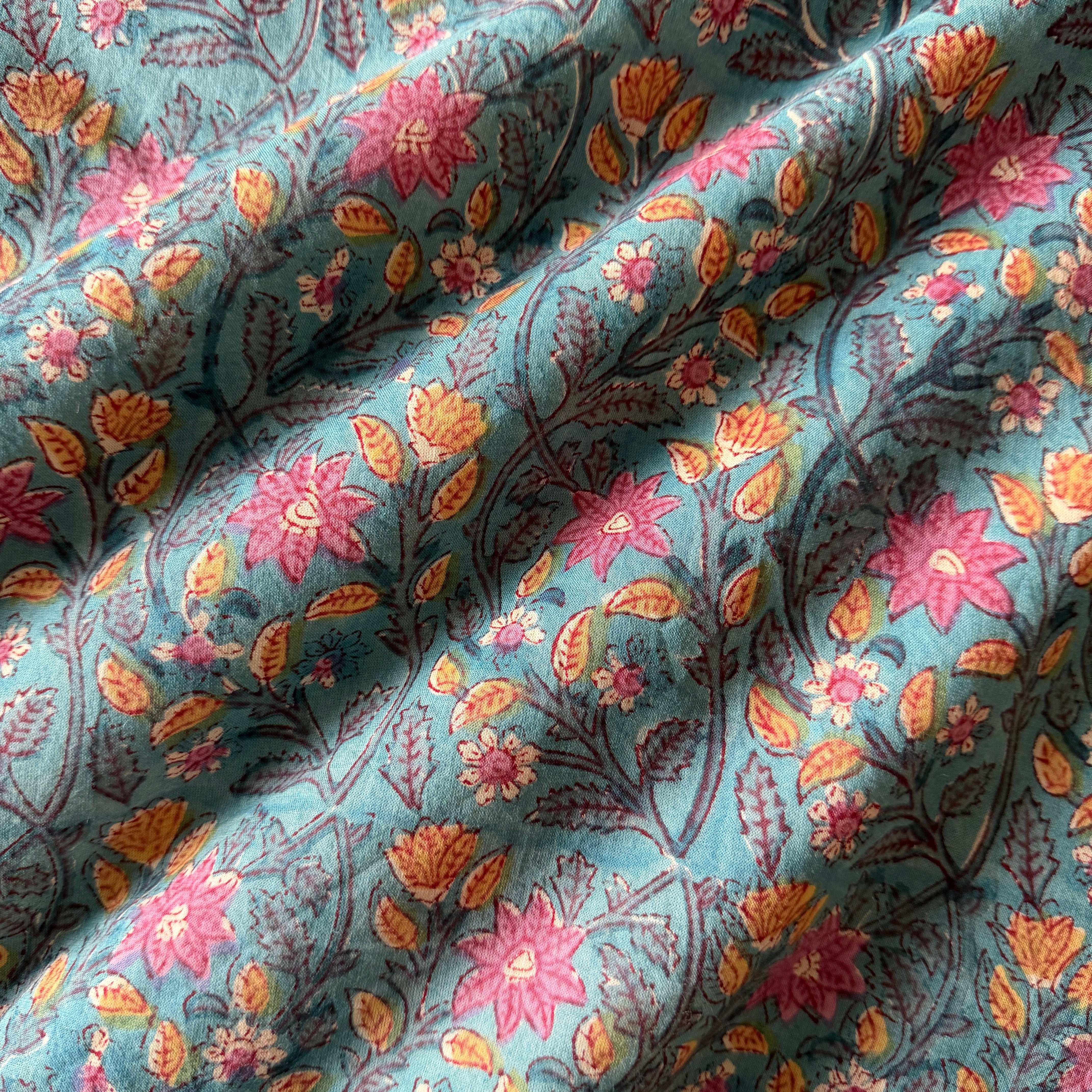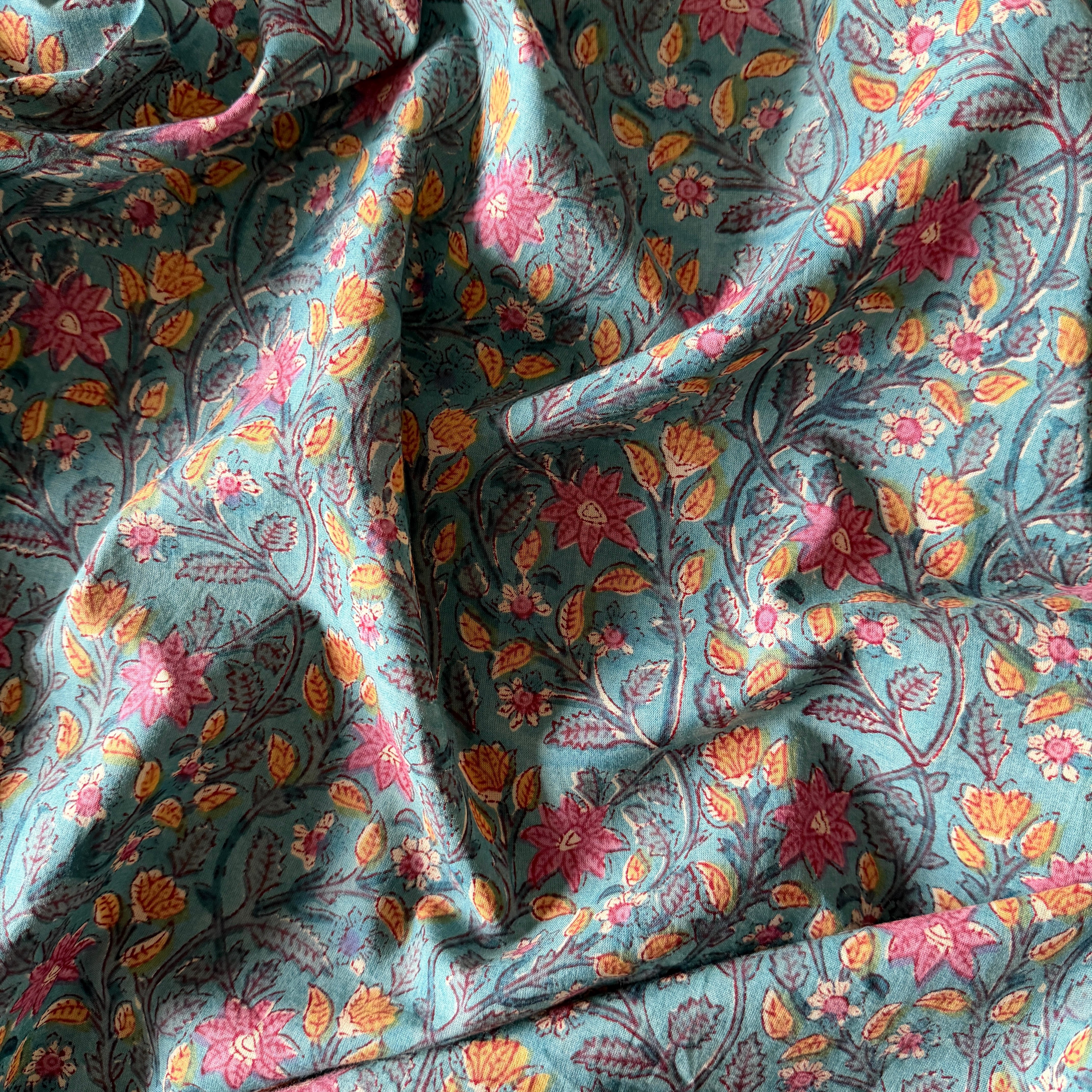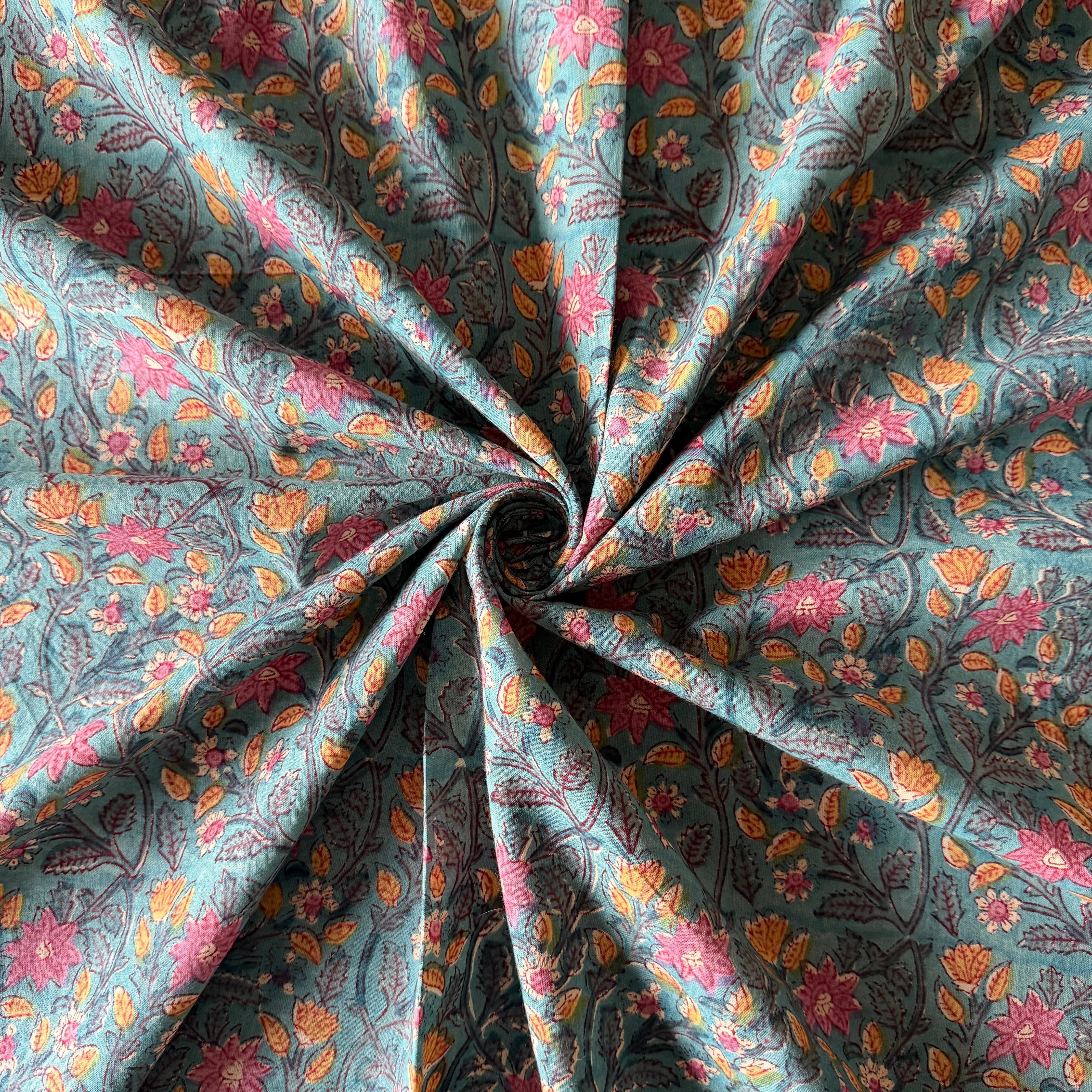 深みのあるブルーグリーンをベースに、ピンクやイエローの花や葉がやさしく散りばめられた、インドのハンドブロックプリント生地です。