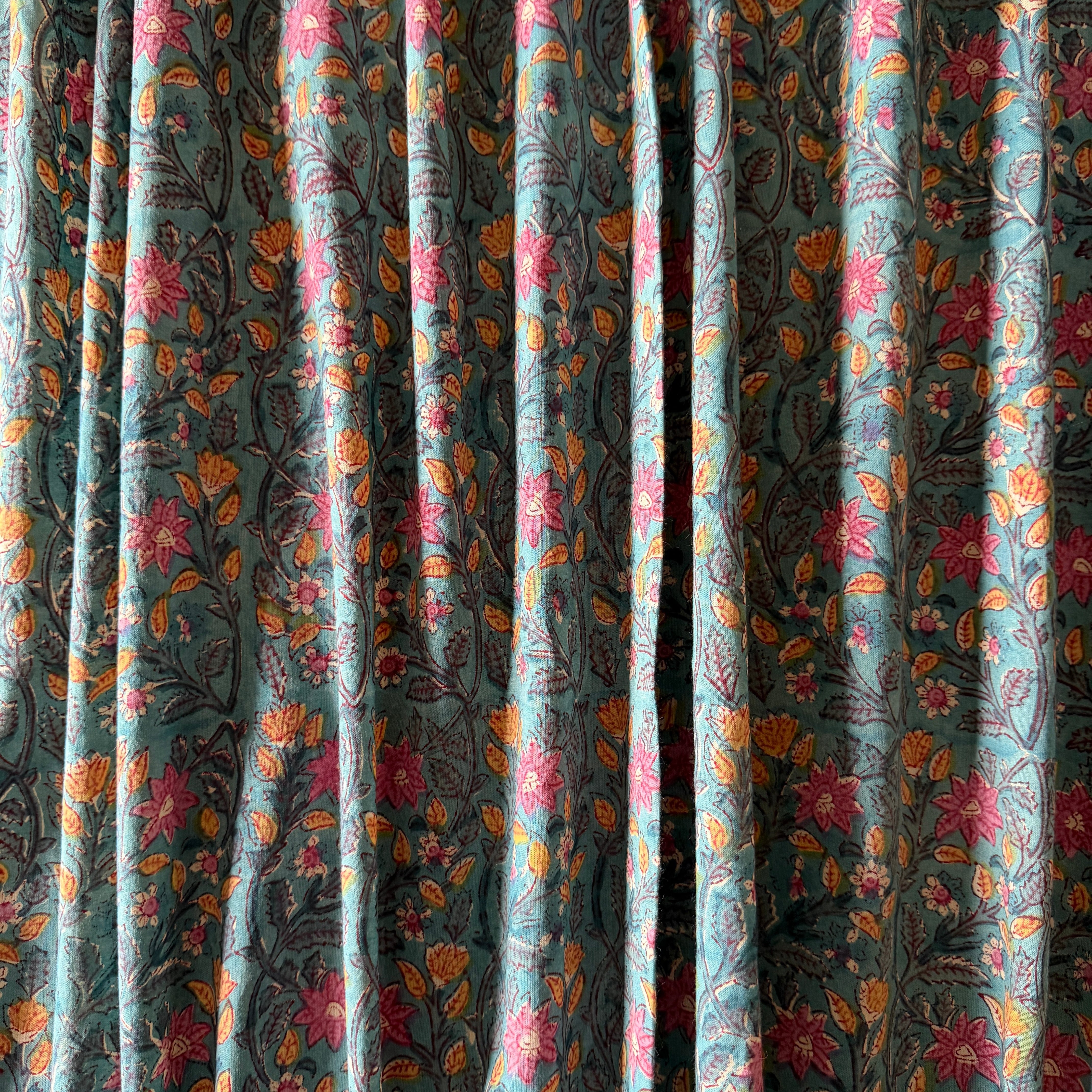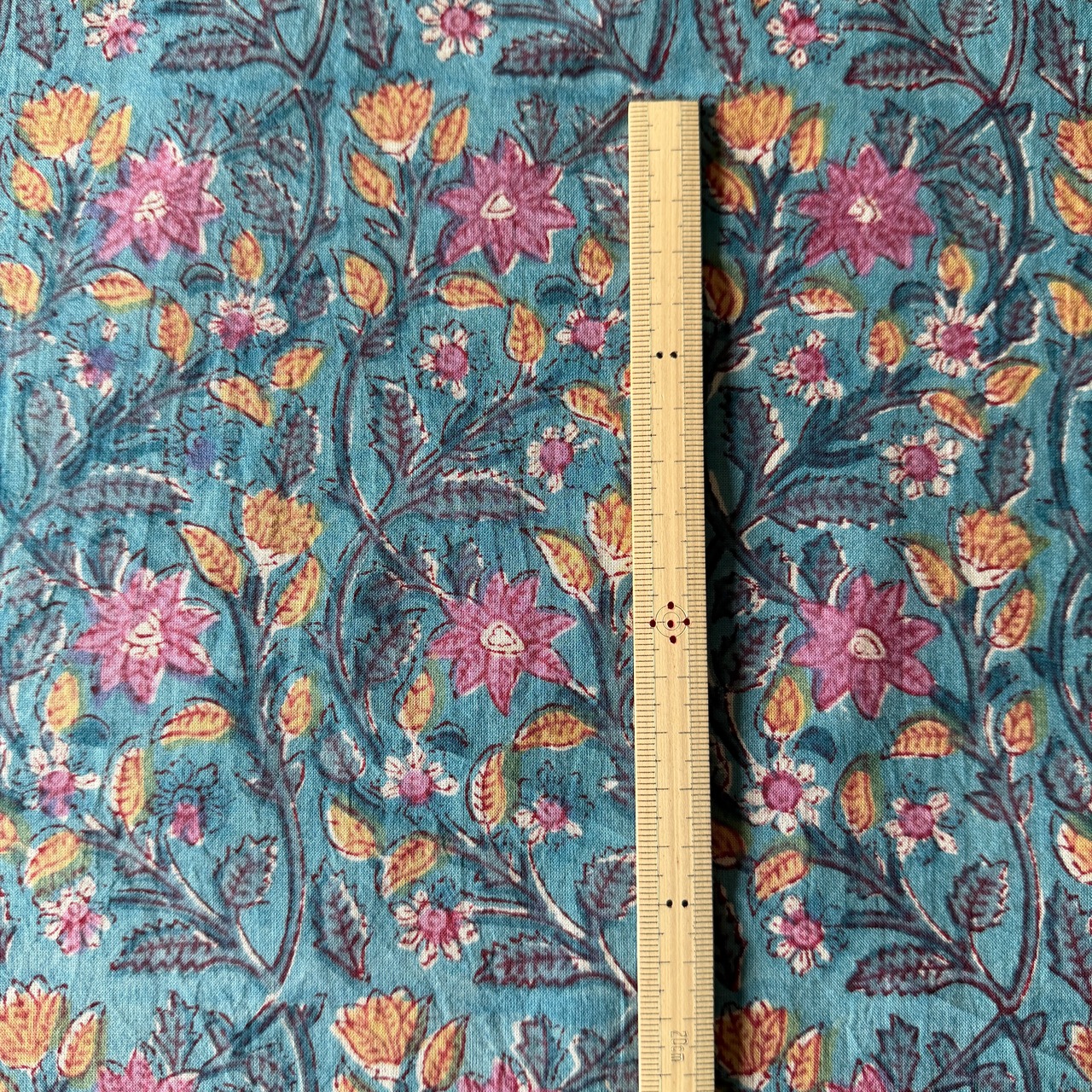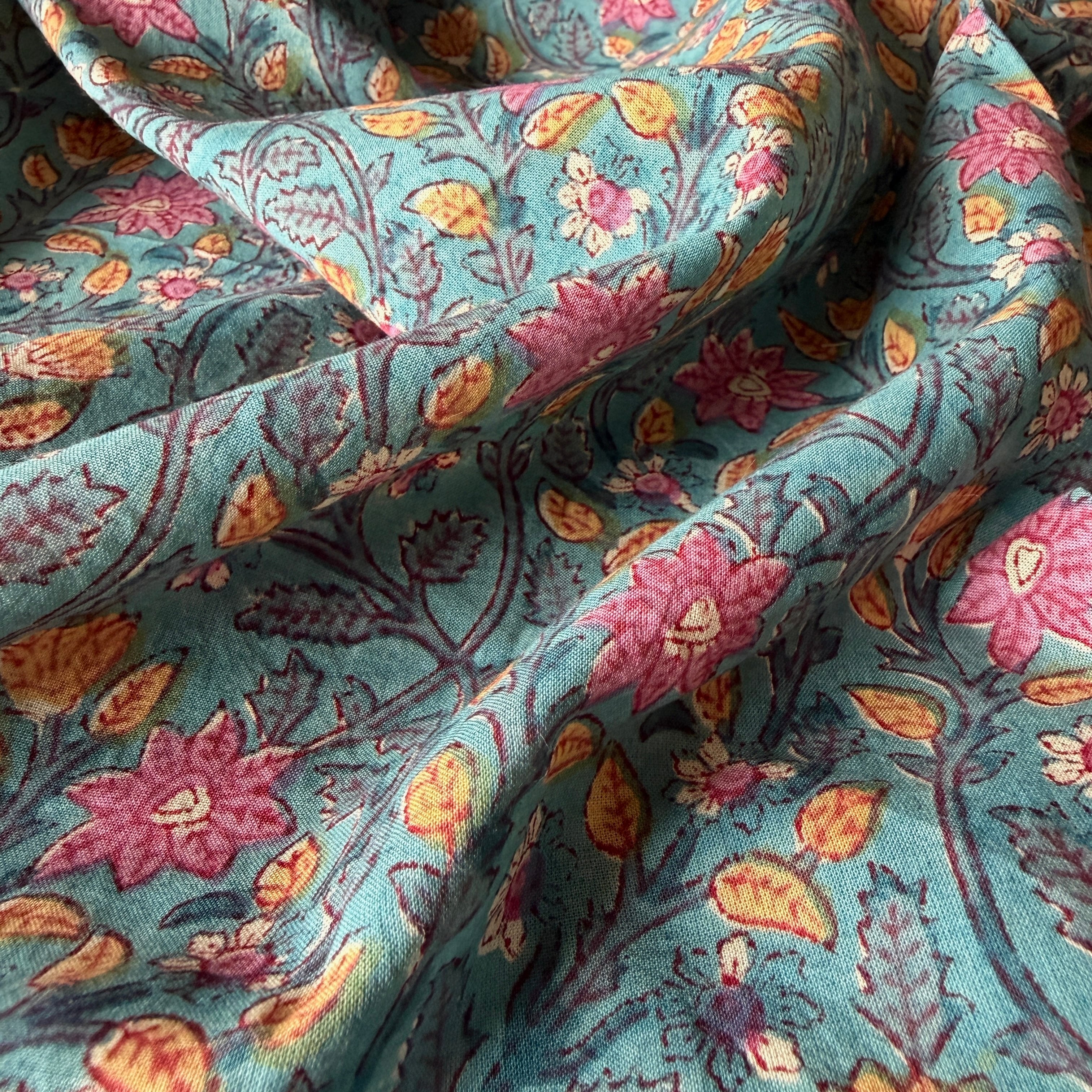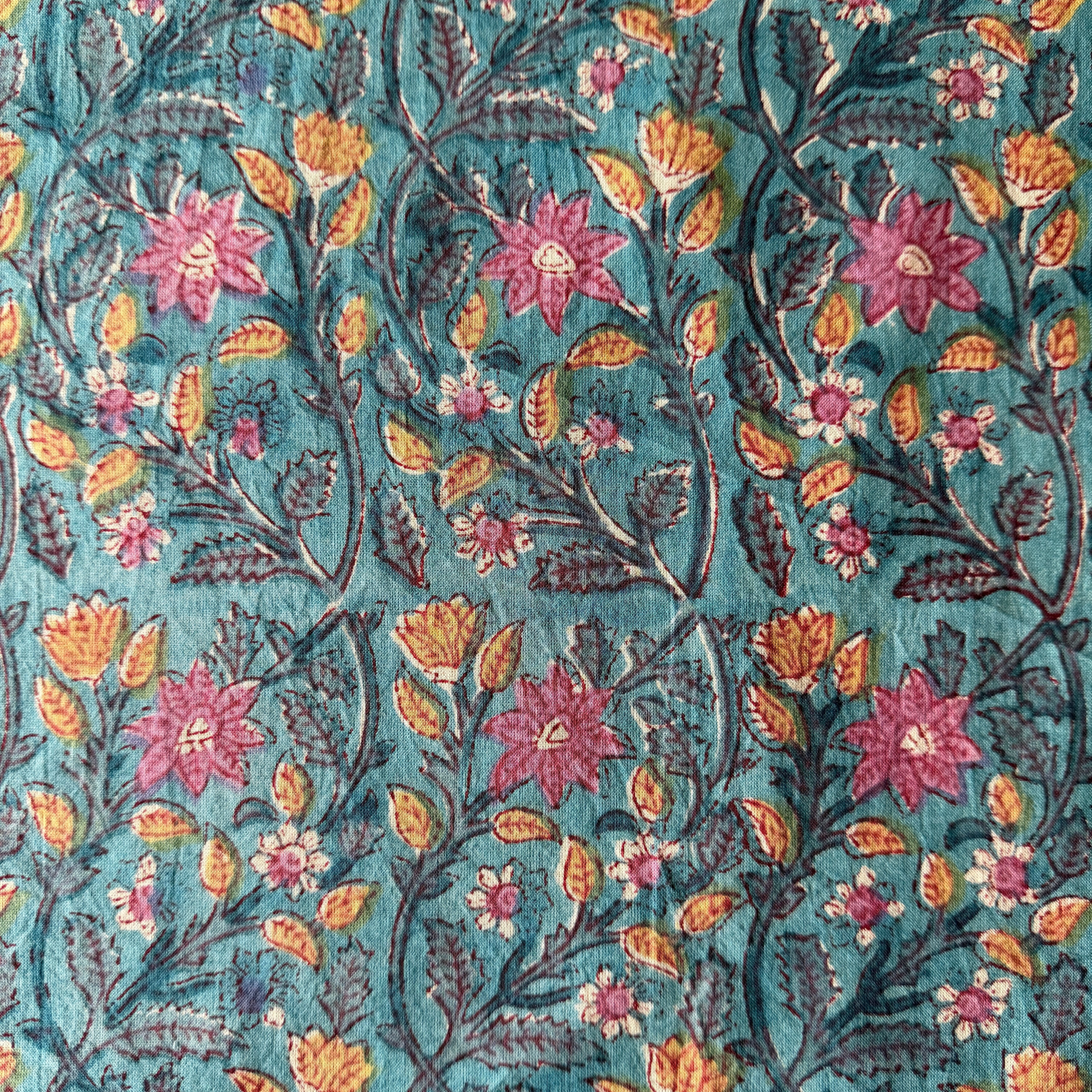 深みのあるブルーグリーンをベースに、ピンクやイエローの花や葉がやさしく散りばめられた、インドのハンドブロックプリント生地です。