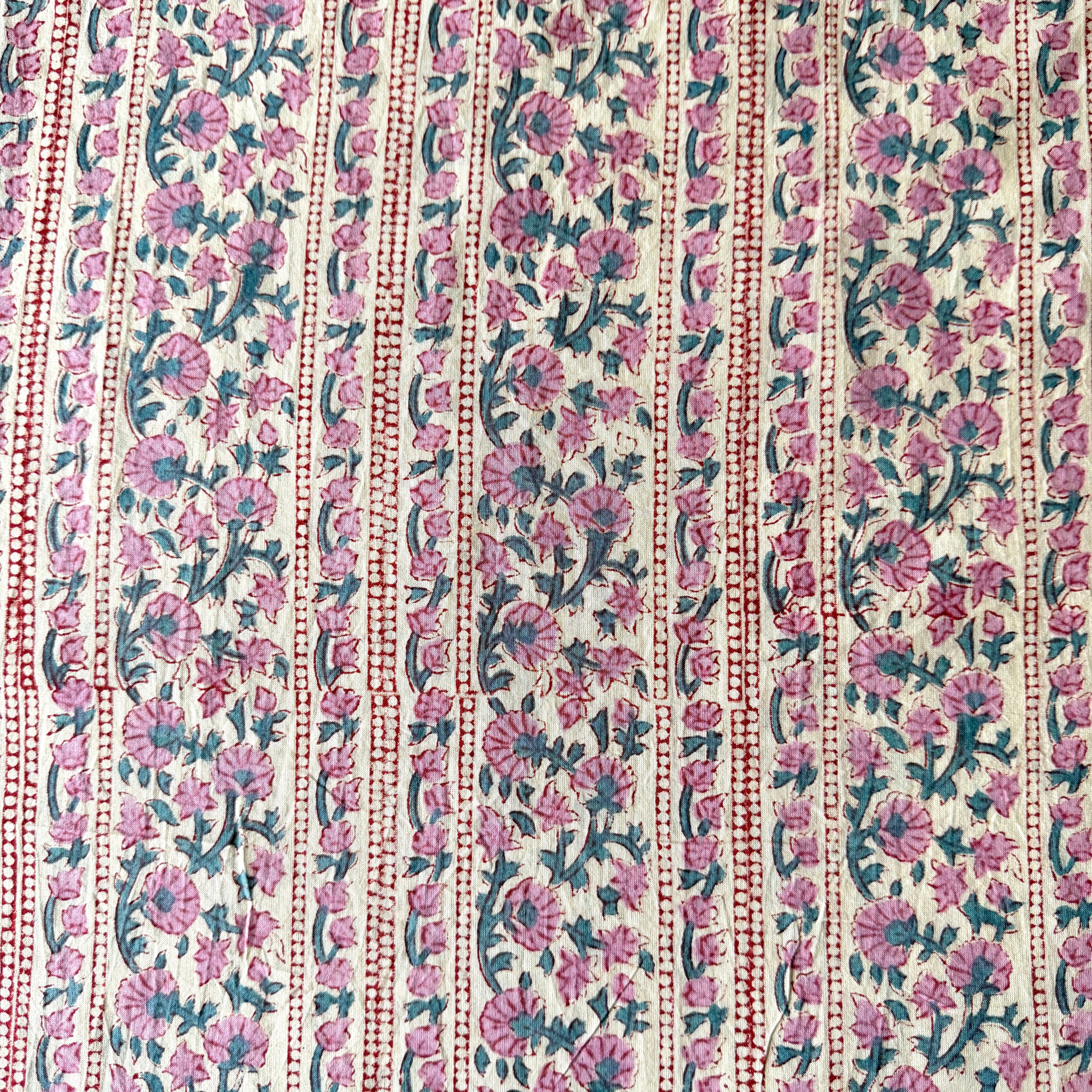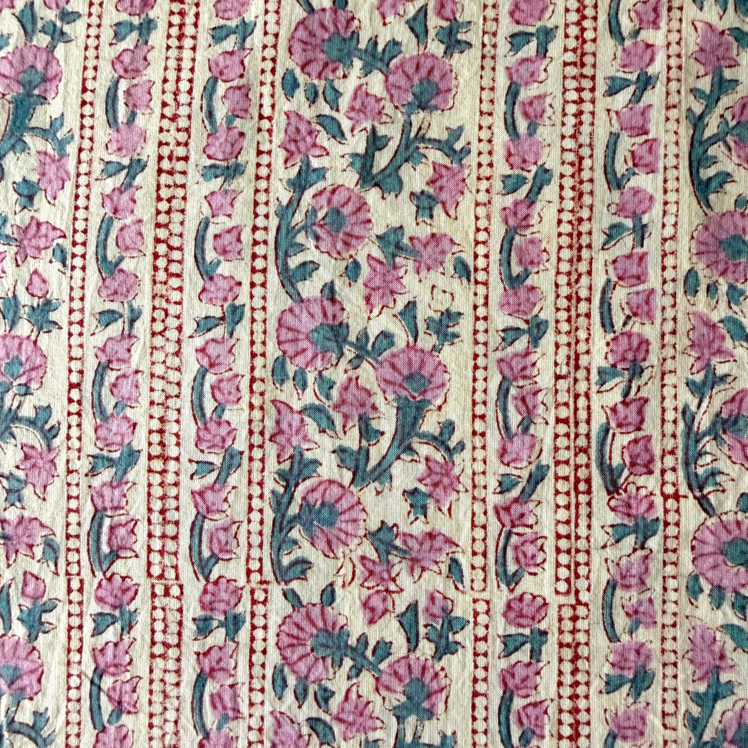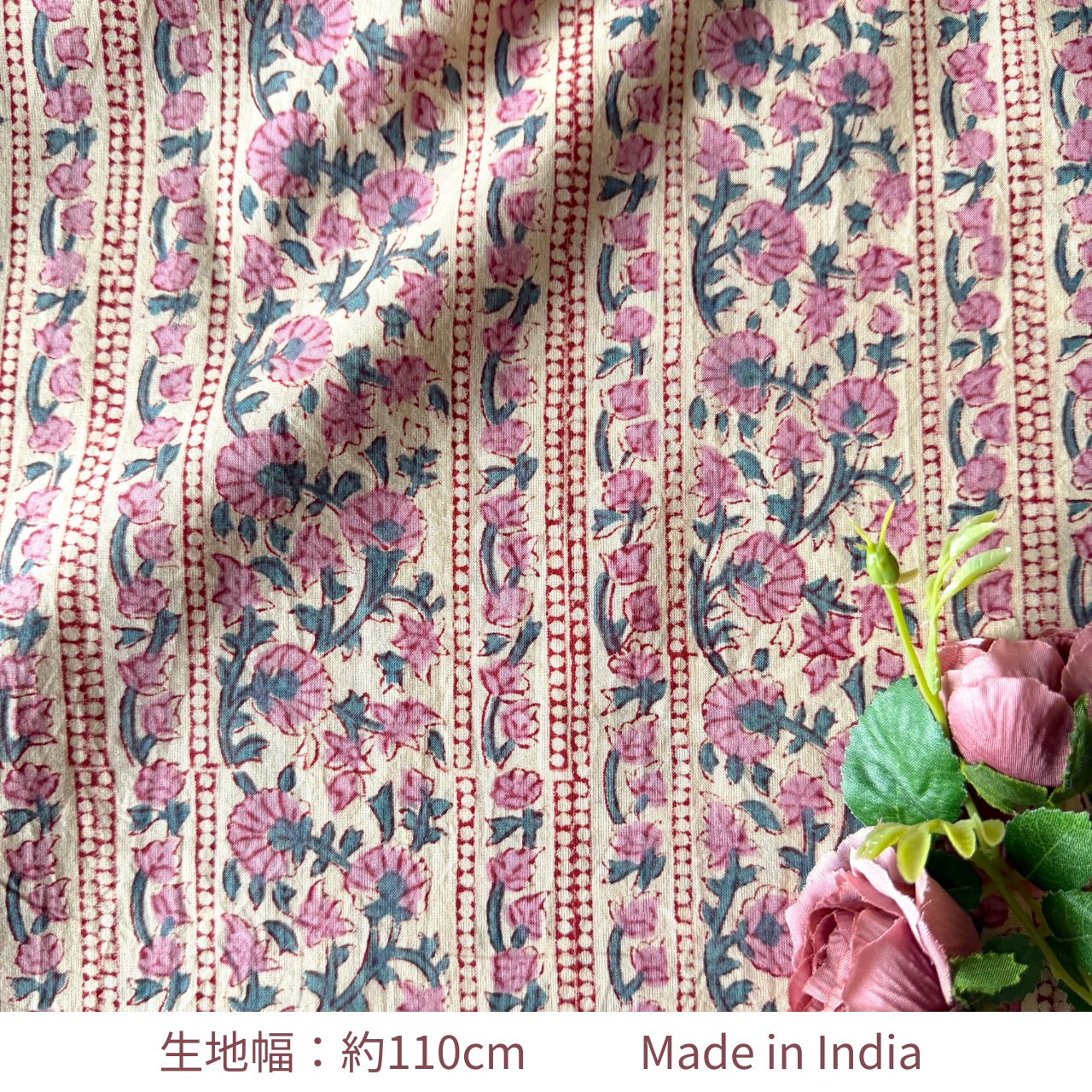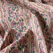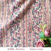 やわらかなオフホワイトやアイボリーのニュアンスを含んだ自然なベースカラーに、くすんだローズピンクの小花が縦に散りばめられた、インドのハンドブロックプリント生地です。