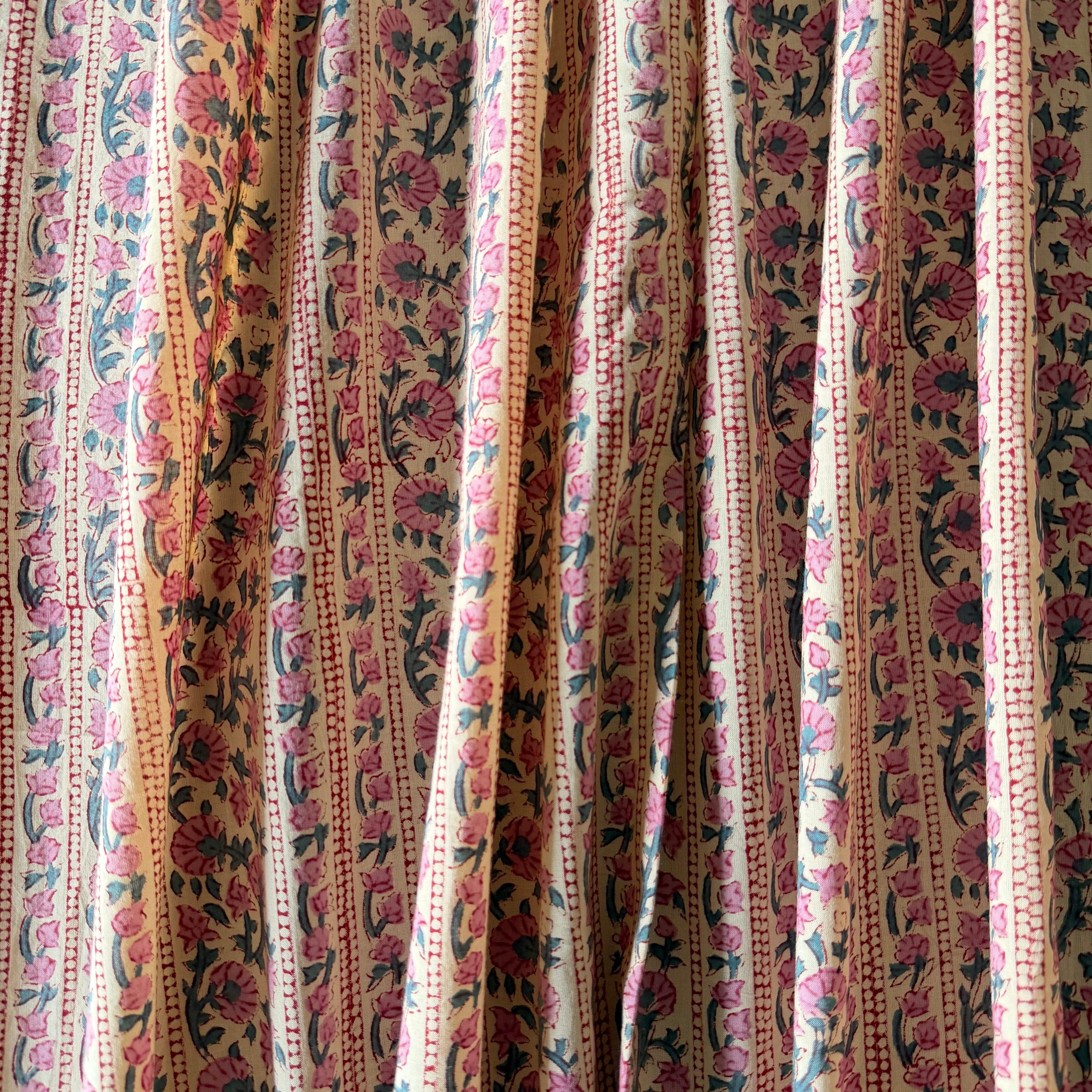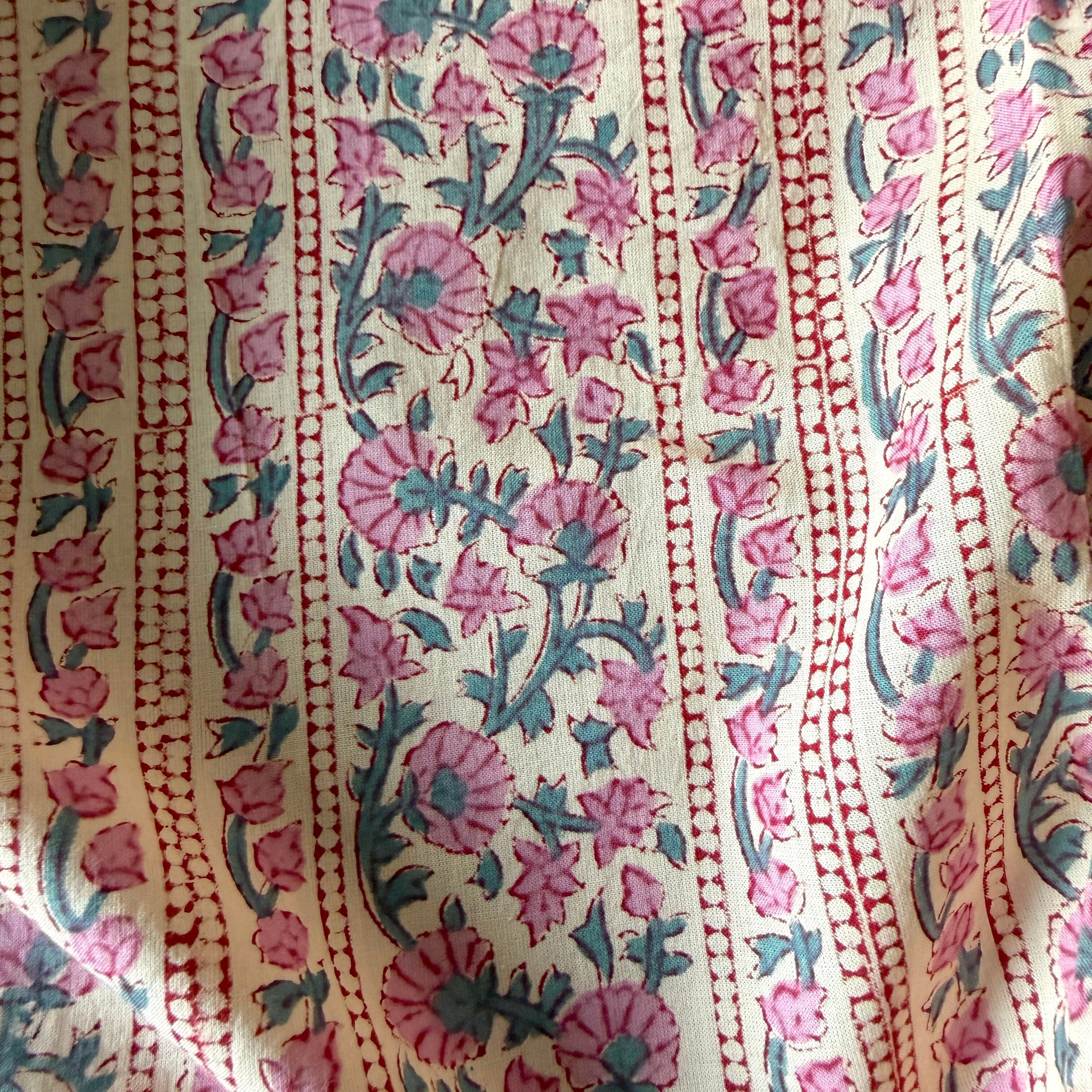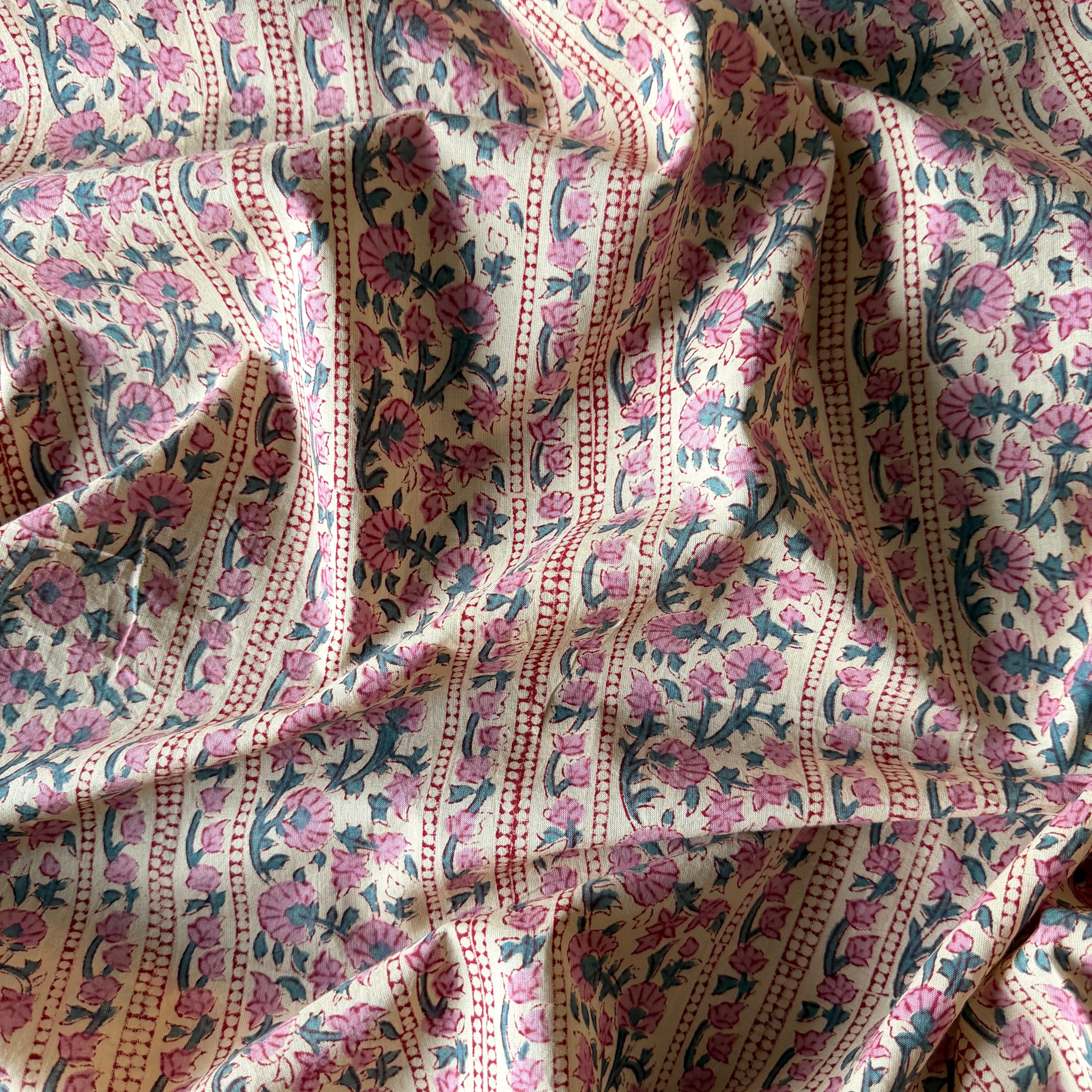 やわらかなオフホワイトやアイボリーのニュアンスを含んだ自然なベースカラーに、くすんだローズピンクの小花が縦に散りばめられた、インドのハンドブロックプリント生地です。