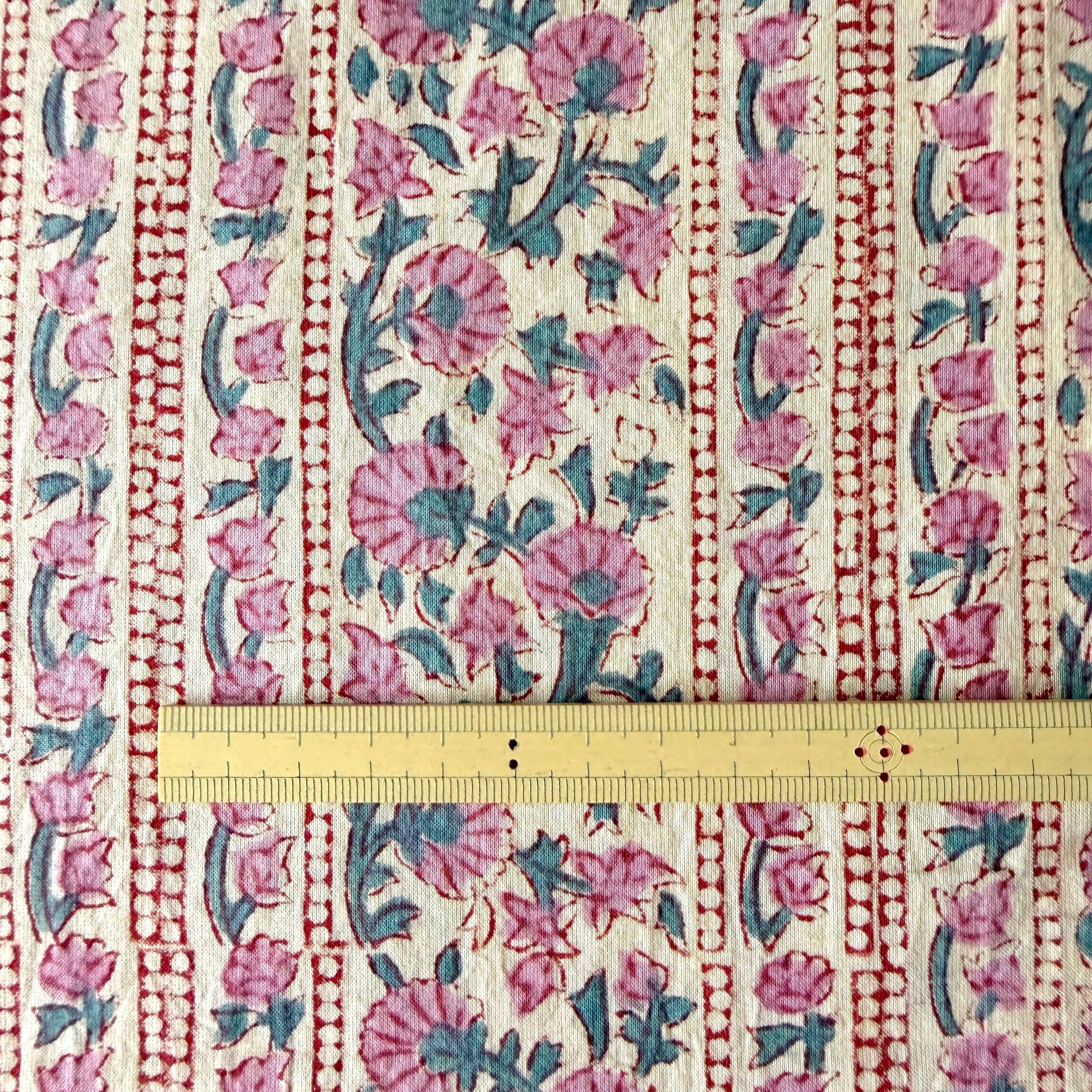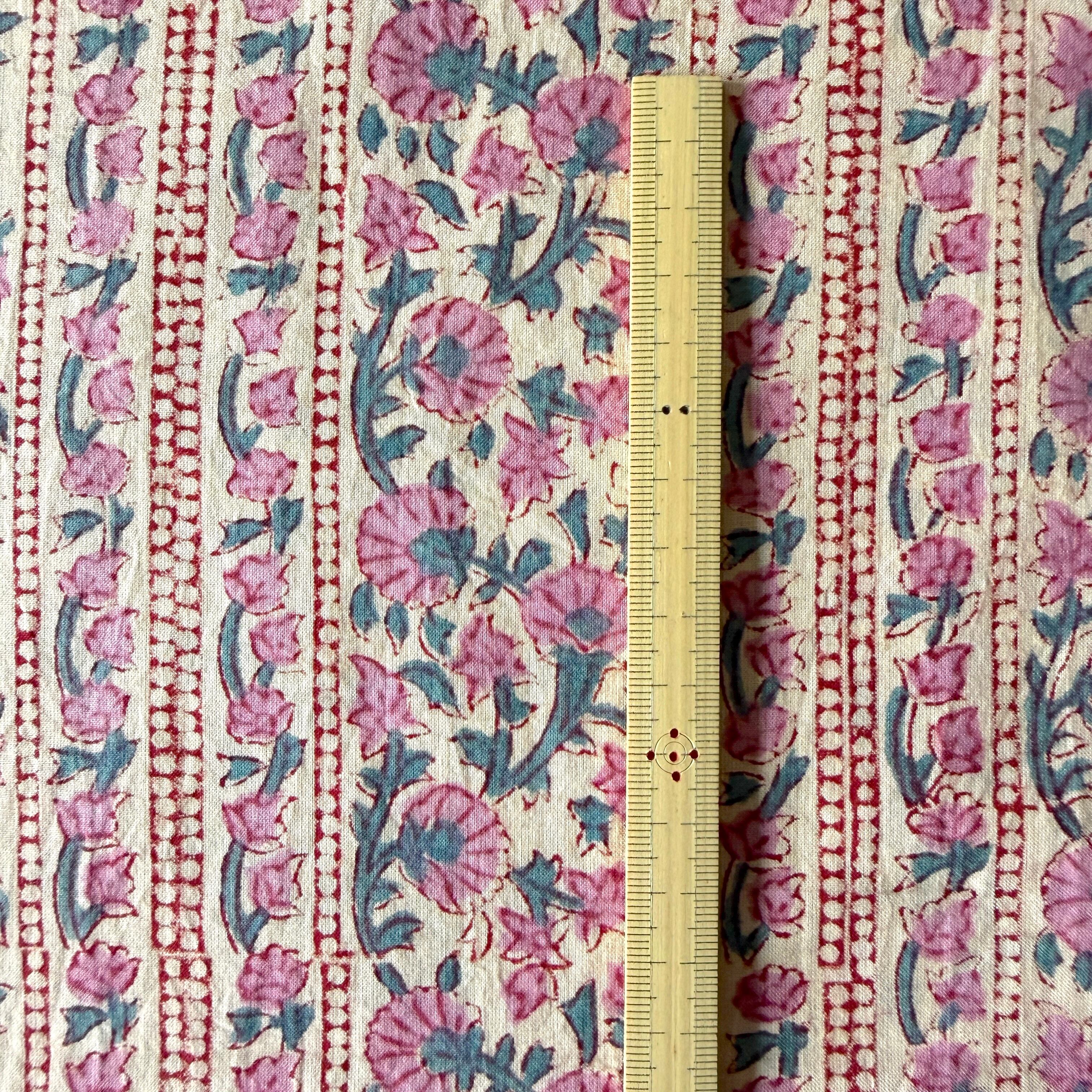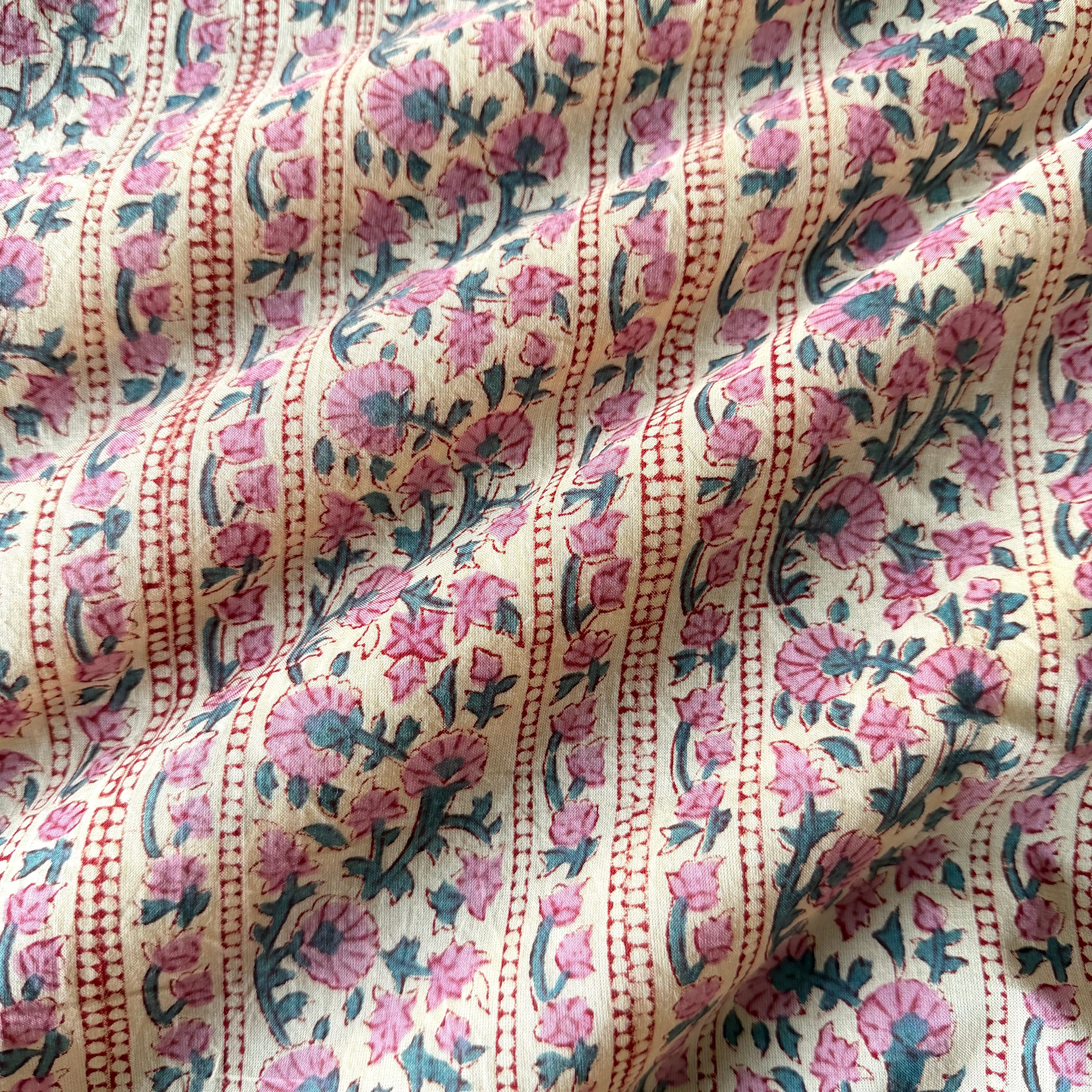 ハンドブロックプリント生地 インド更紗 綿生地 ナチュラルアイボリーベース×くすみピンクの小花ストライプ 薄手コットン JE-260208-sa