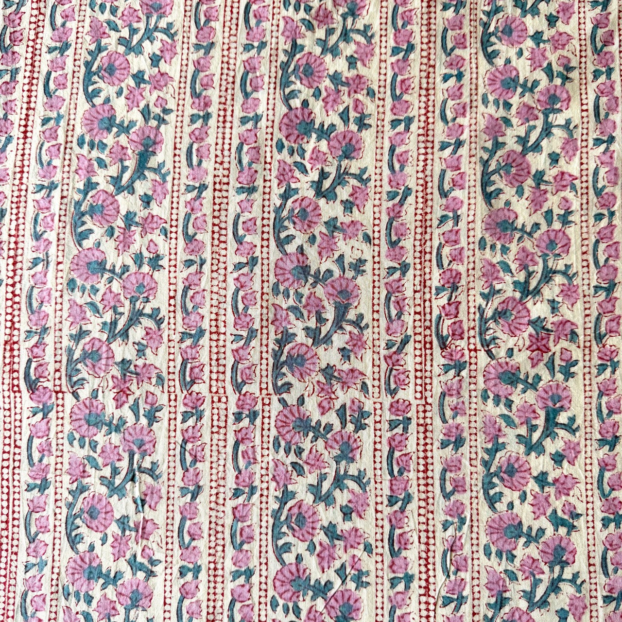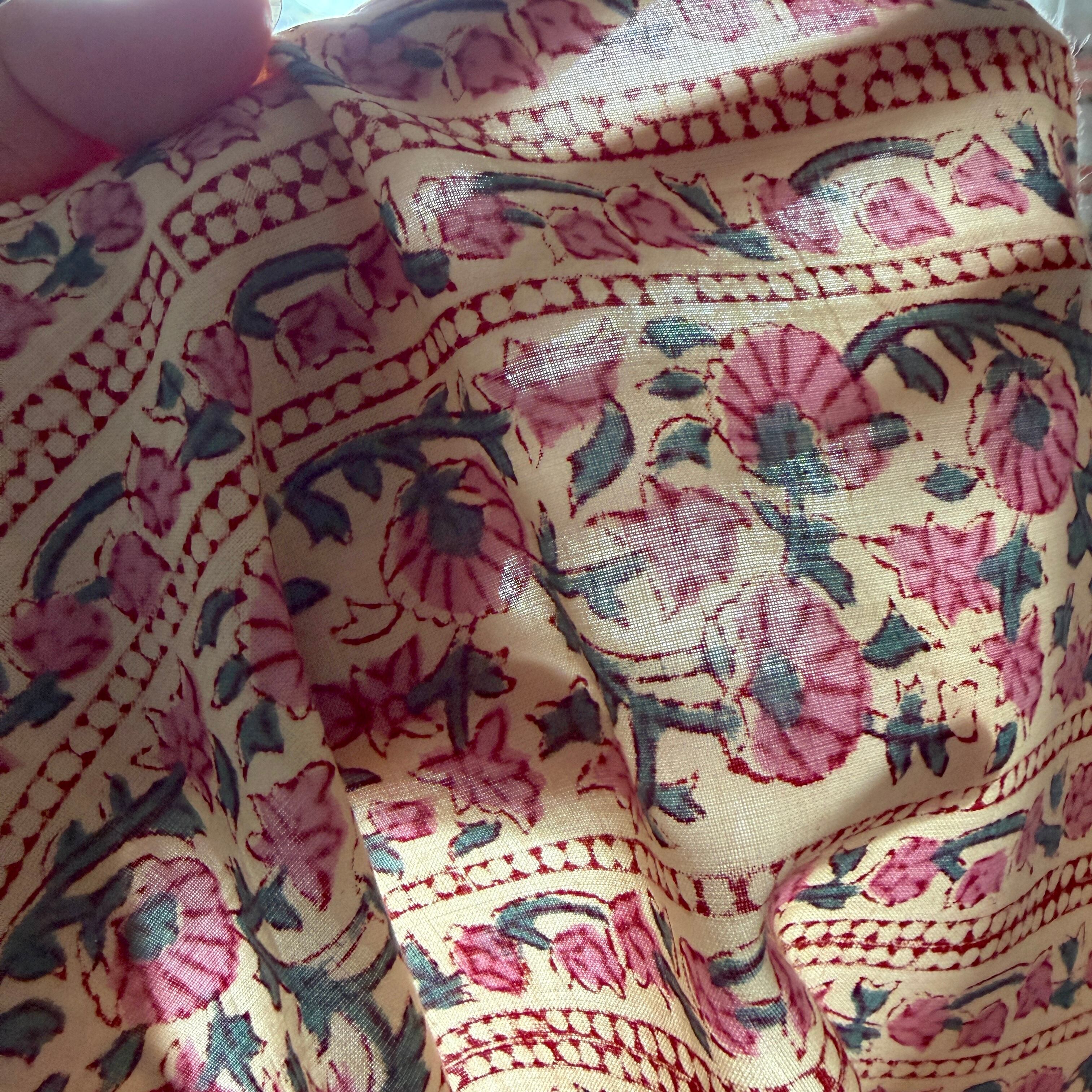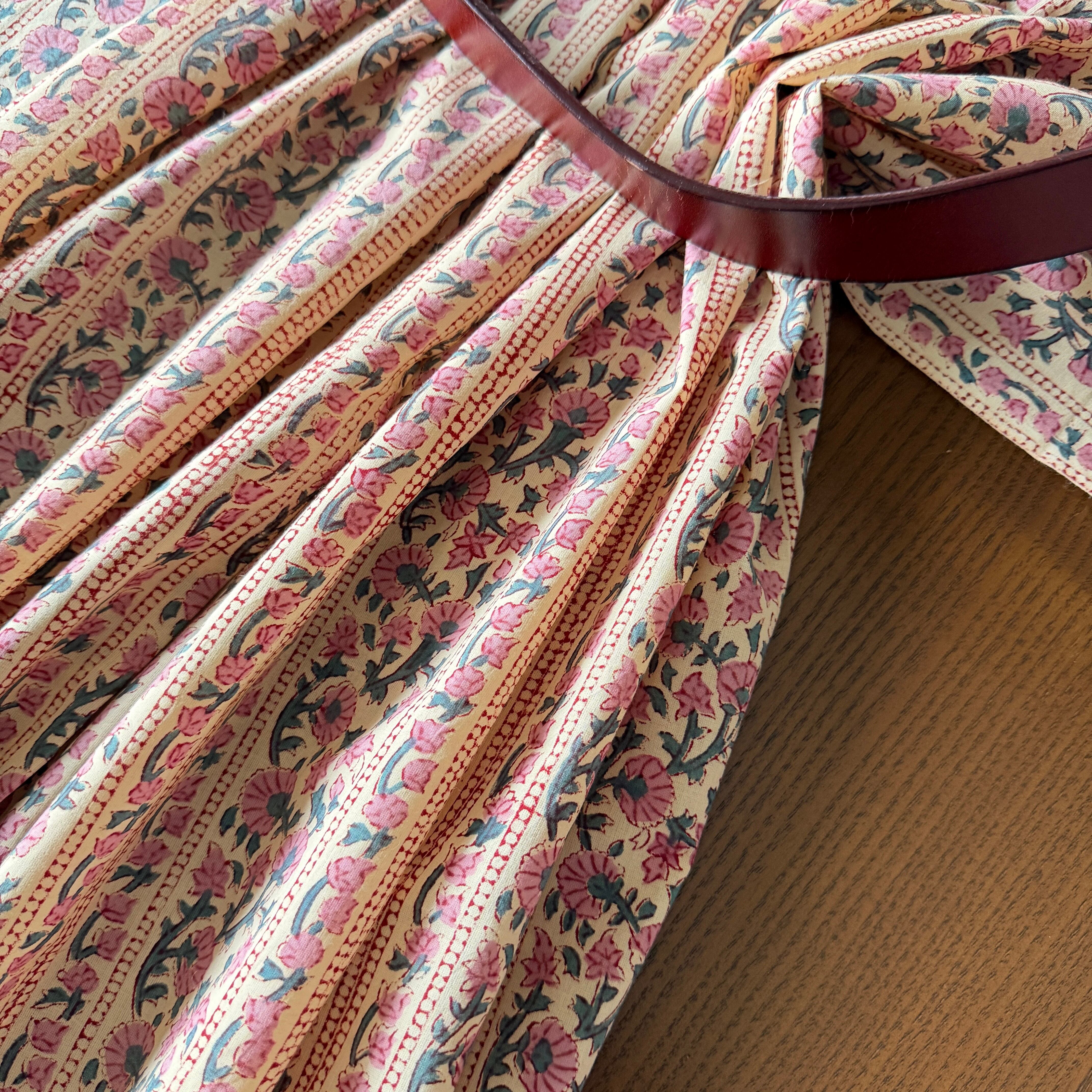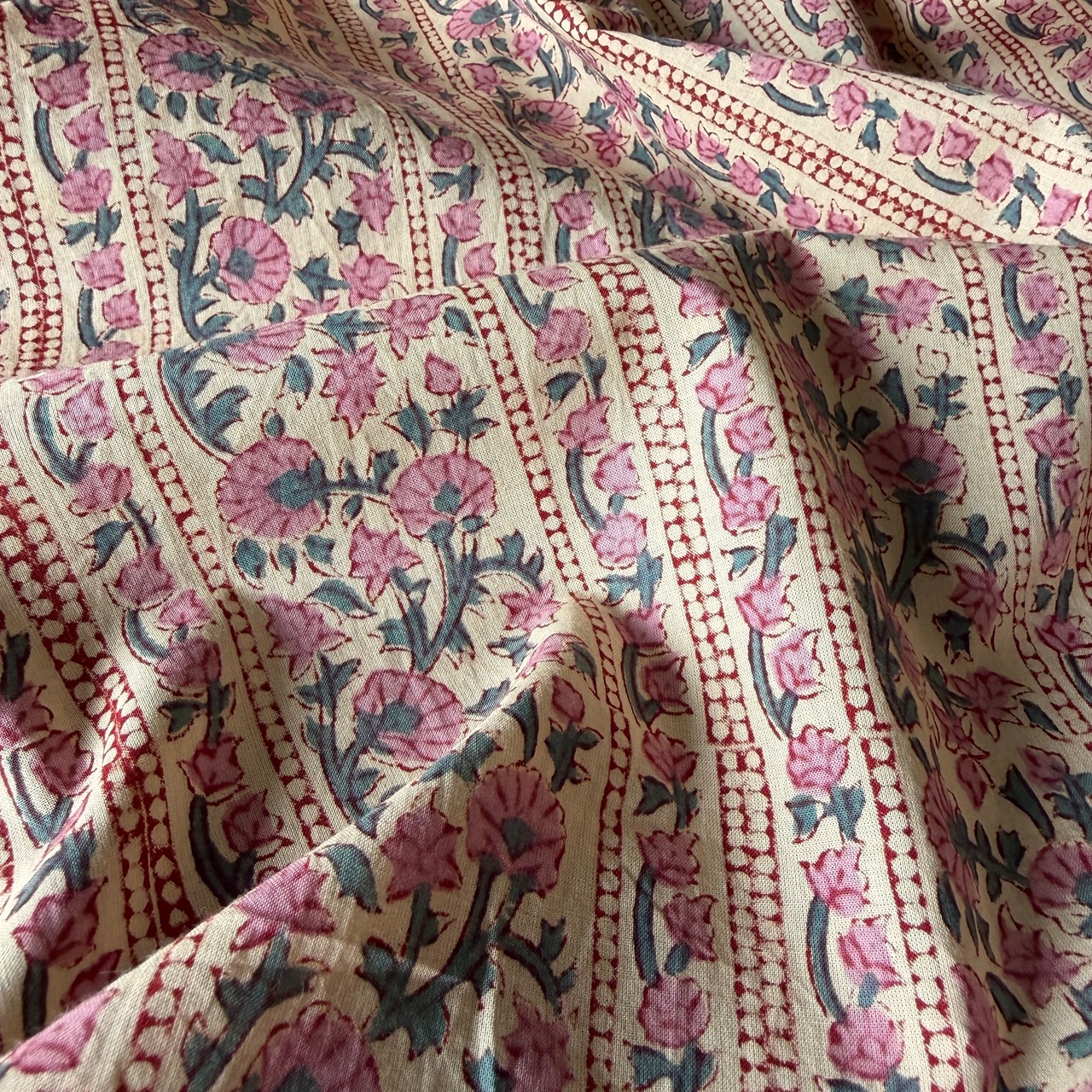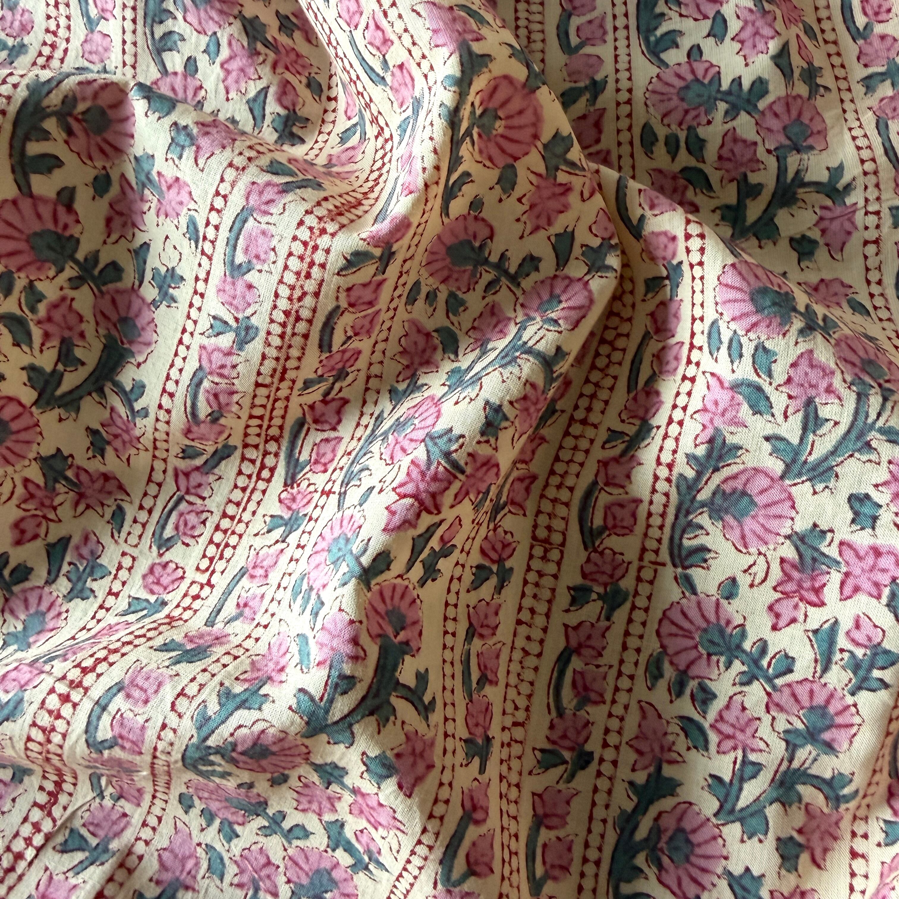 ◾️やわらかなアイボリーに、ローズピンクの小花が静かに咲く。やさしく華やぐインドのブロックプリント生地