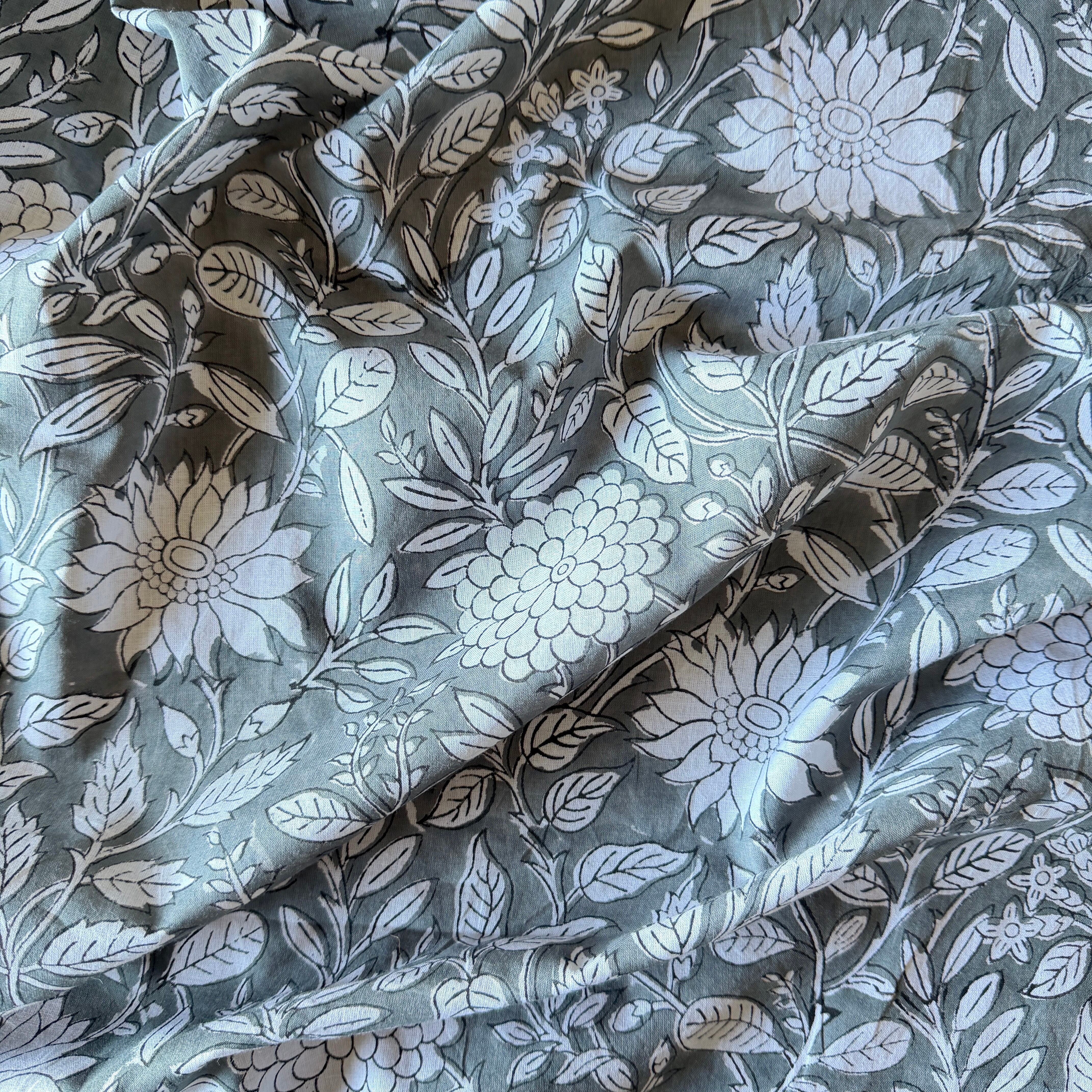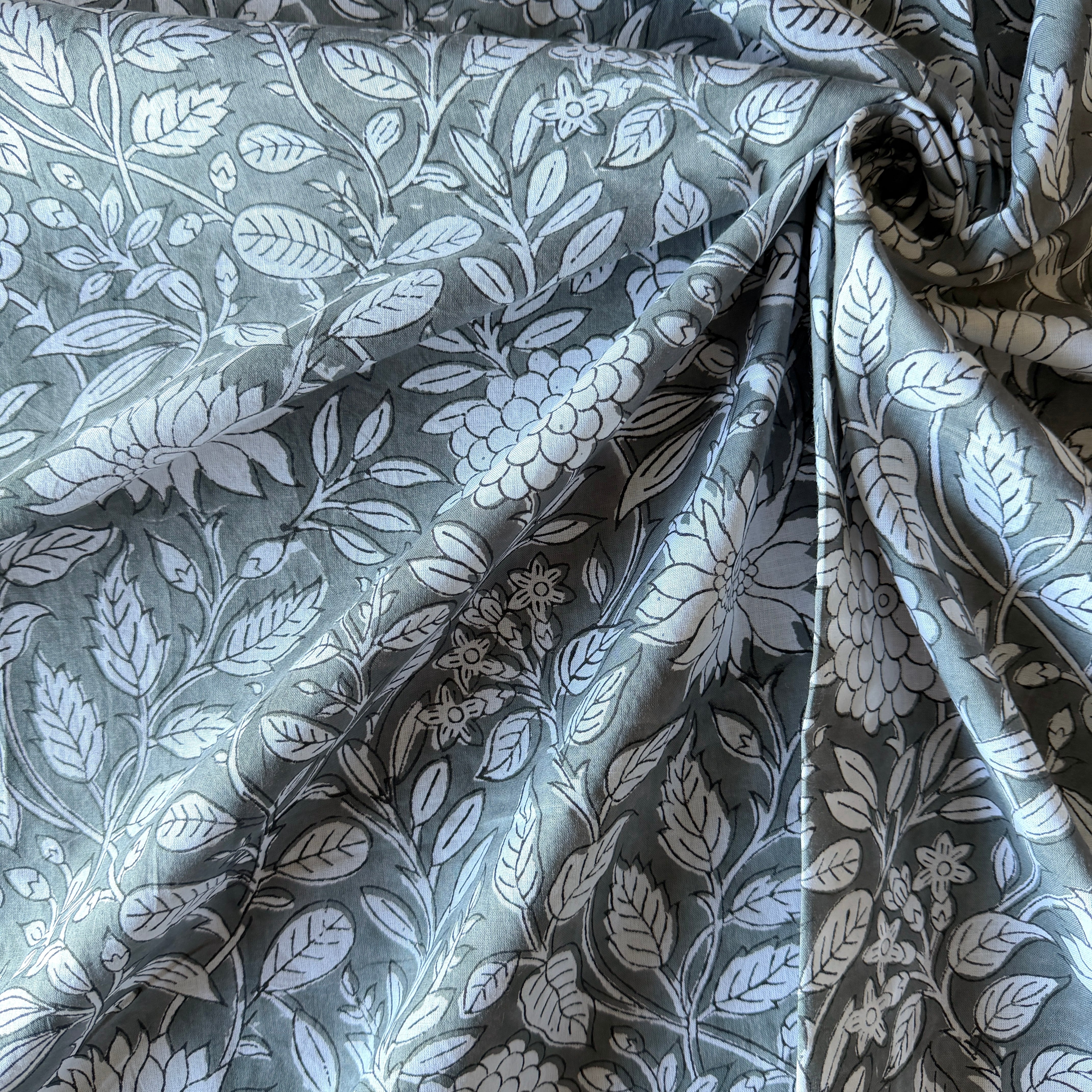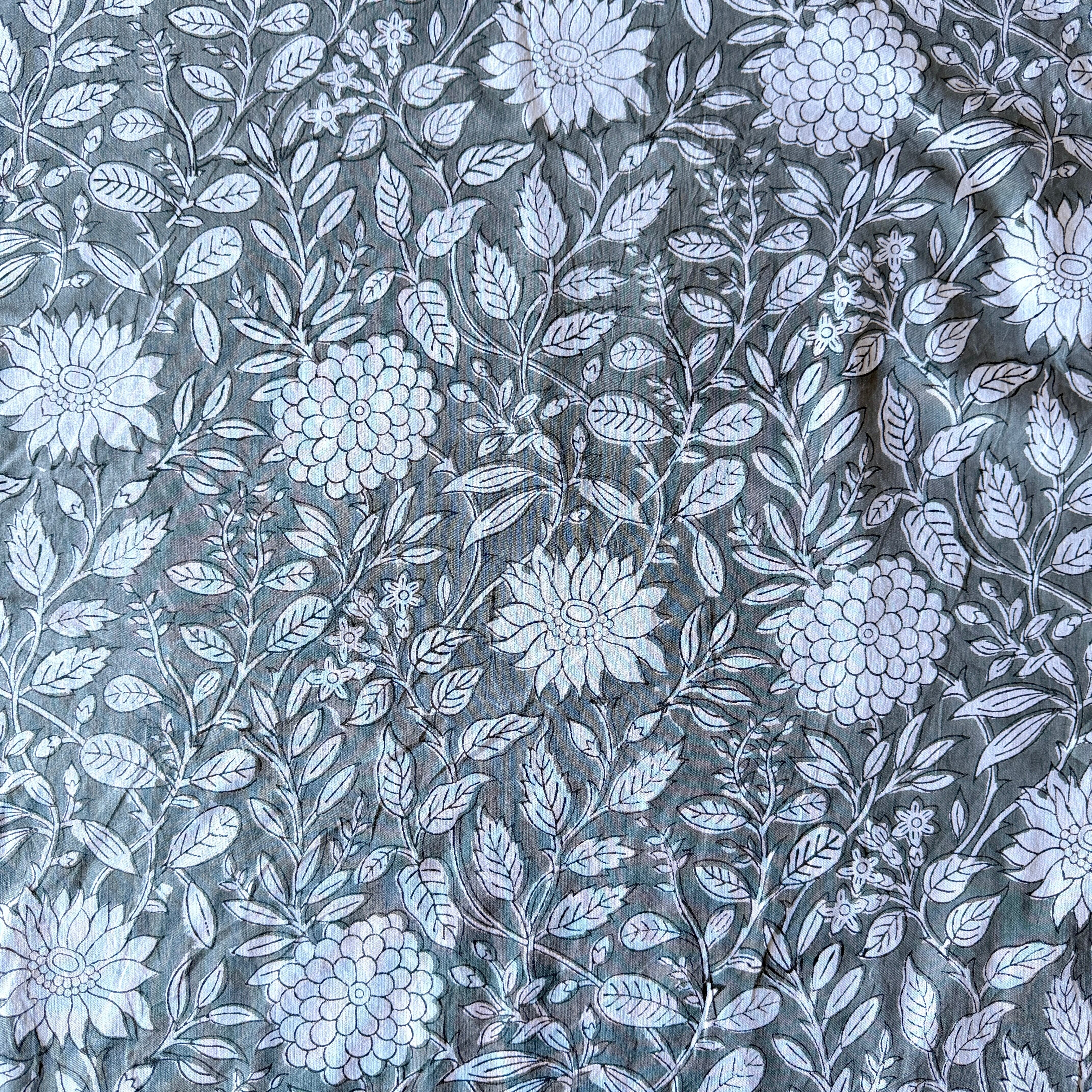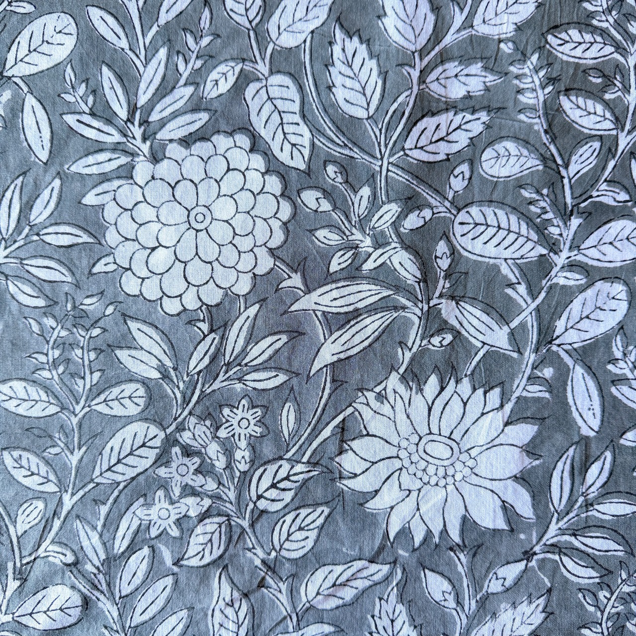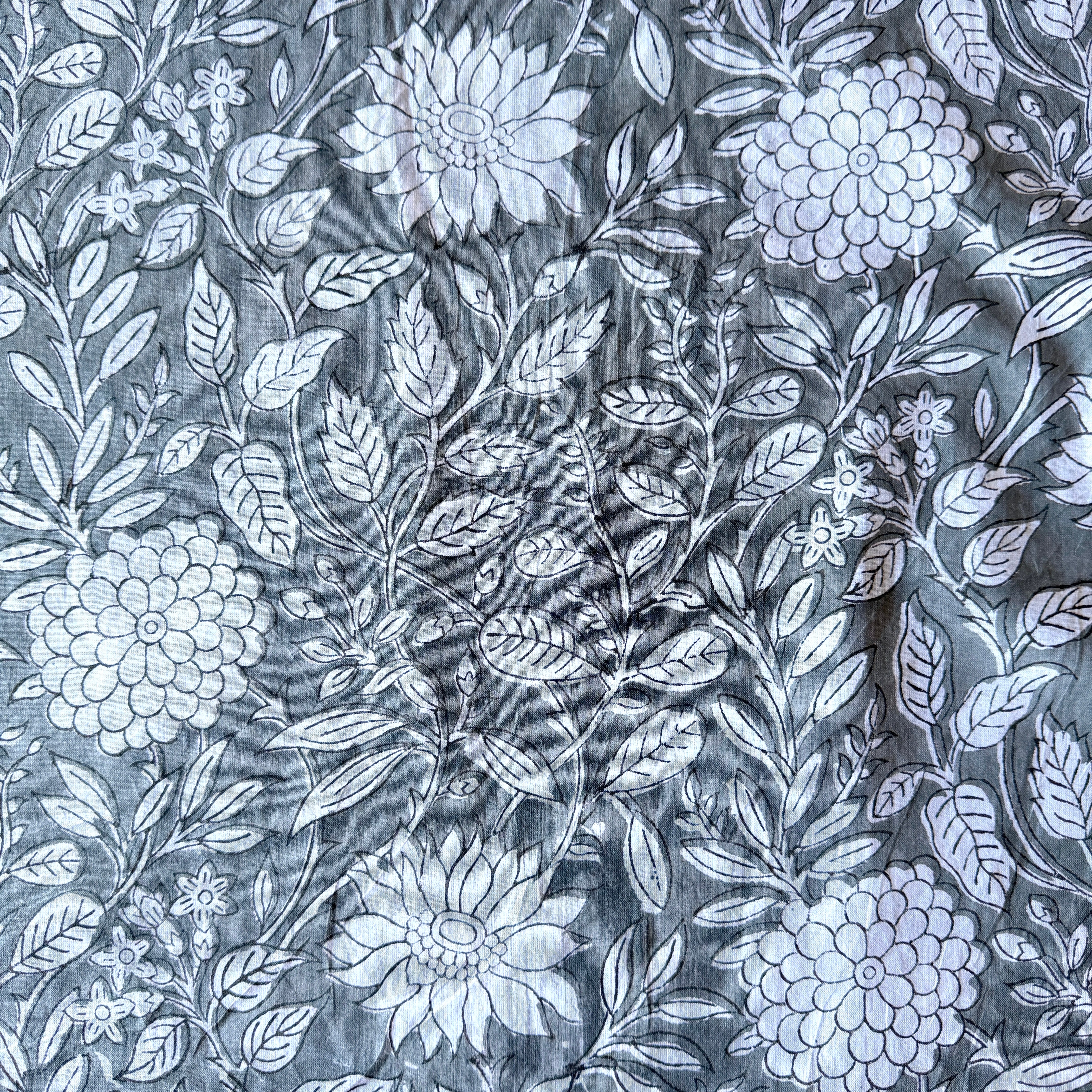 やわらかなグレーをベースに、白抜きの花柄が一面に広がる、インドのハンドブロックプリント生地が入荷しました。