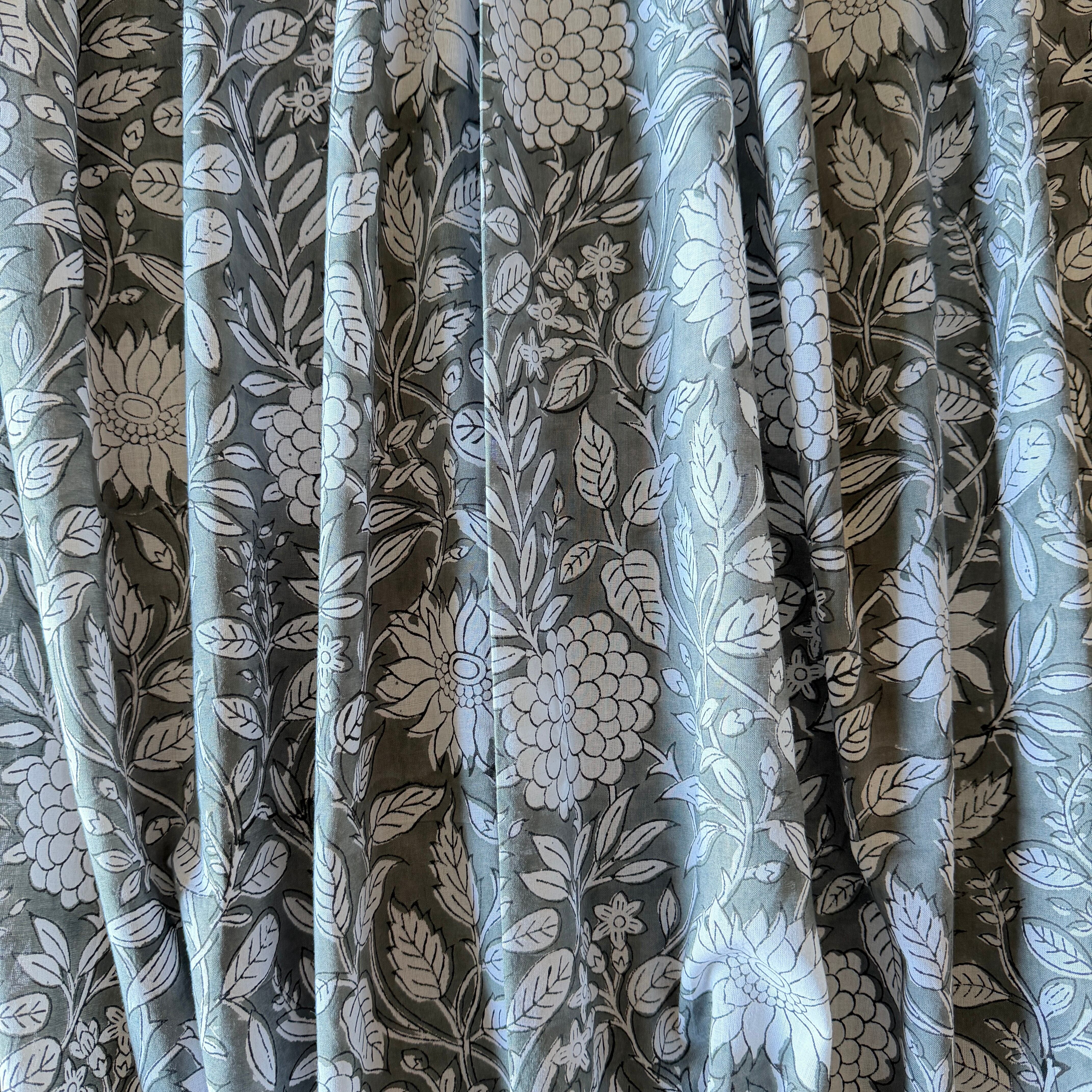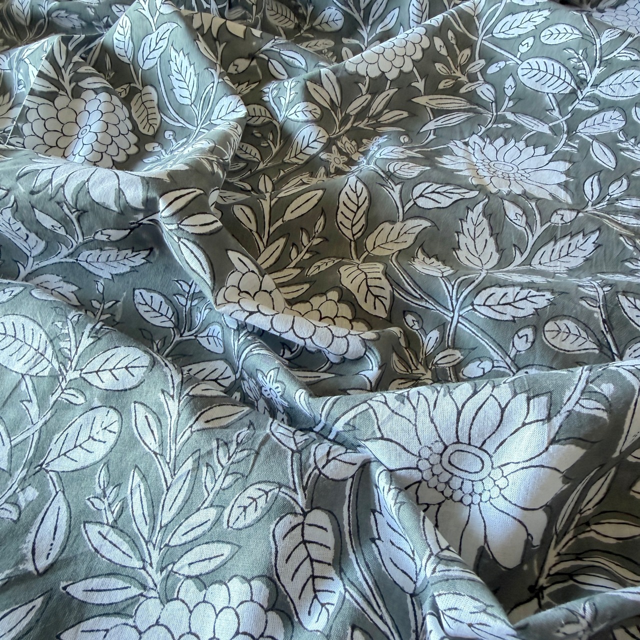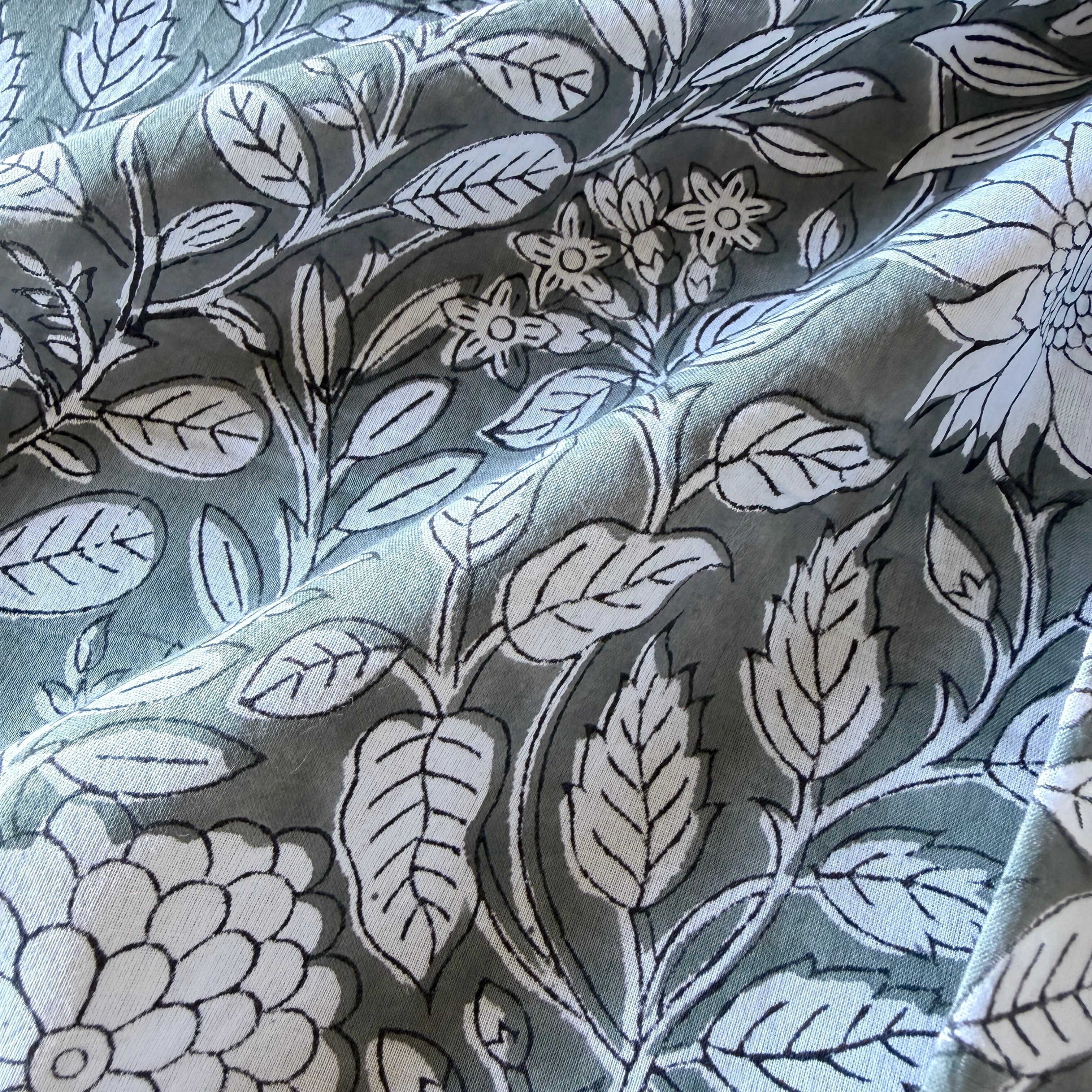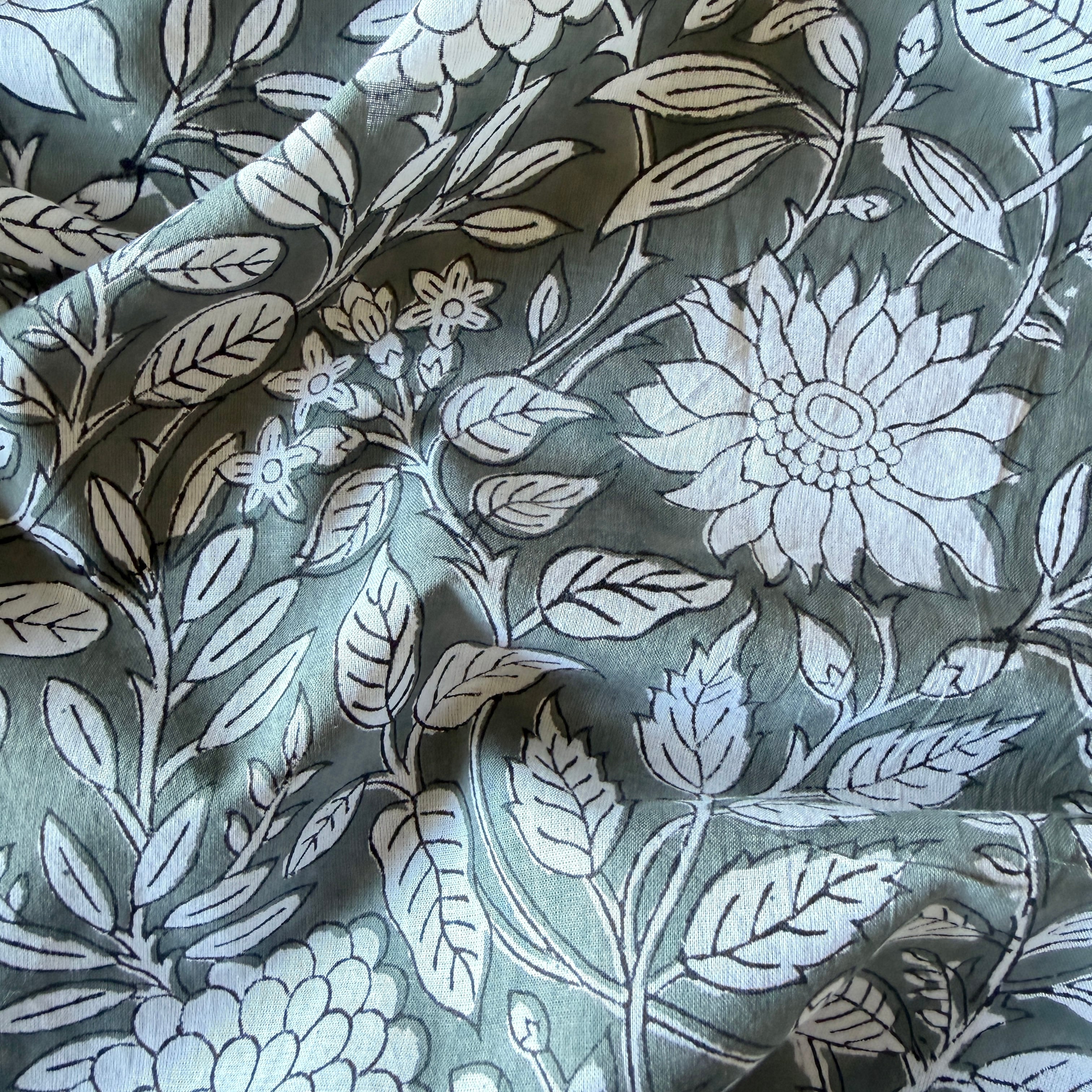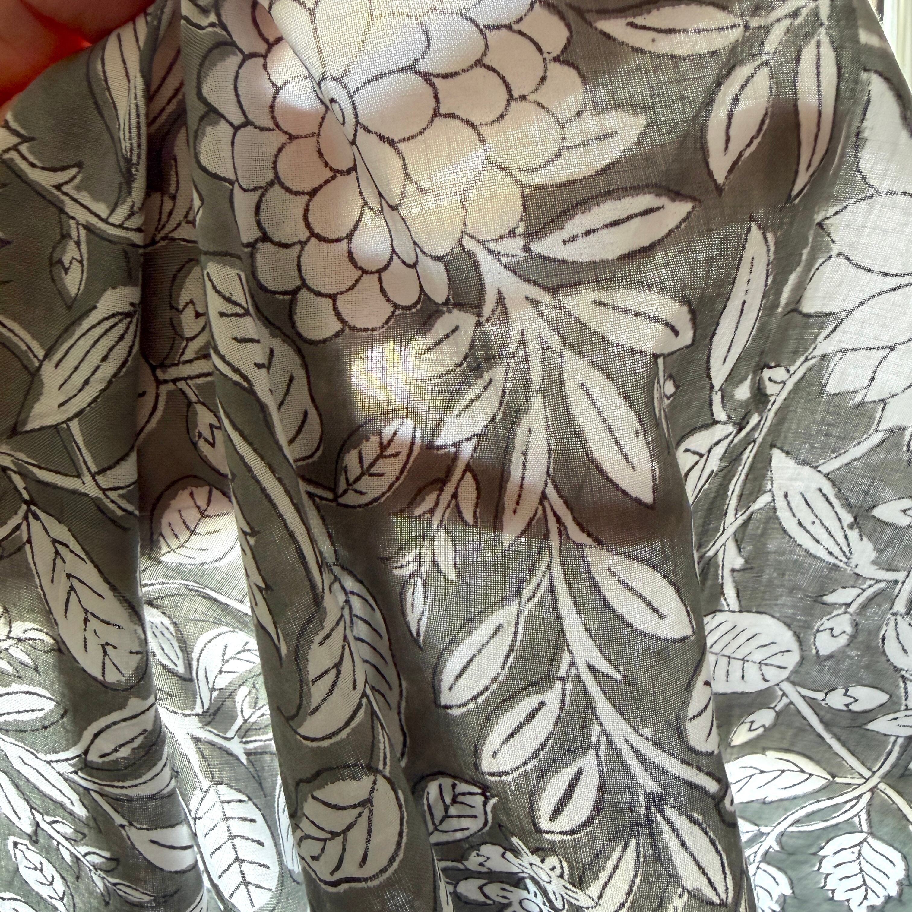 やわらかなグレーをベースに、白抜きの花柄が一面に広がる、インドのハンドブロックプリント生地が入荷しました。