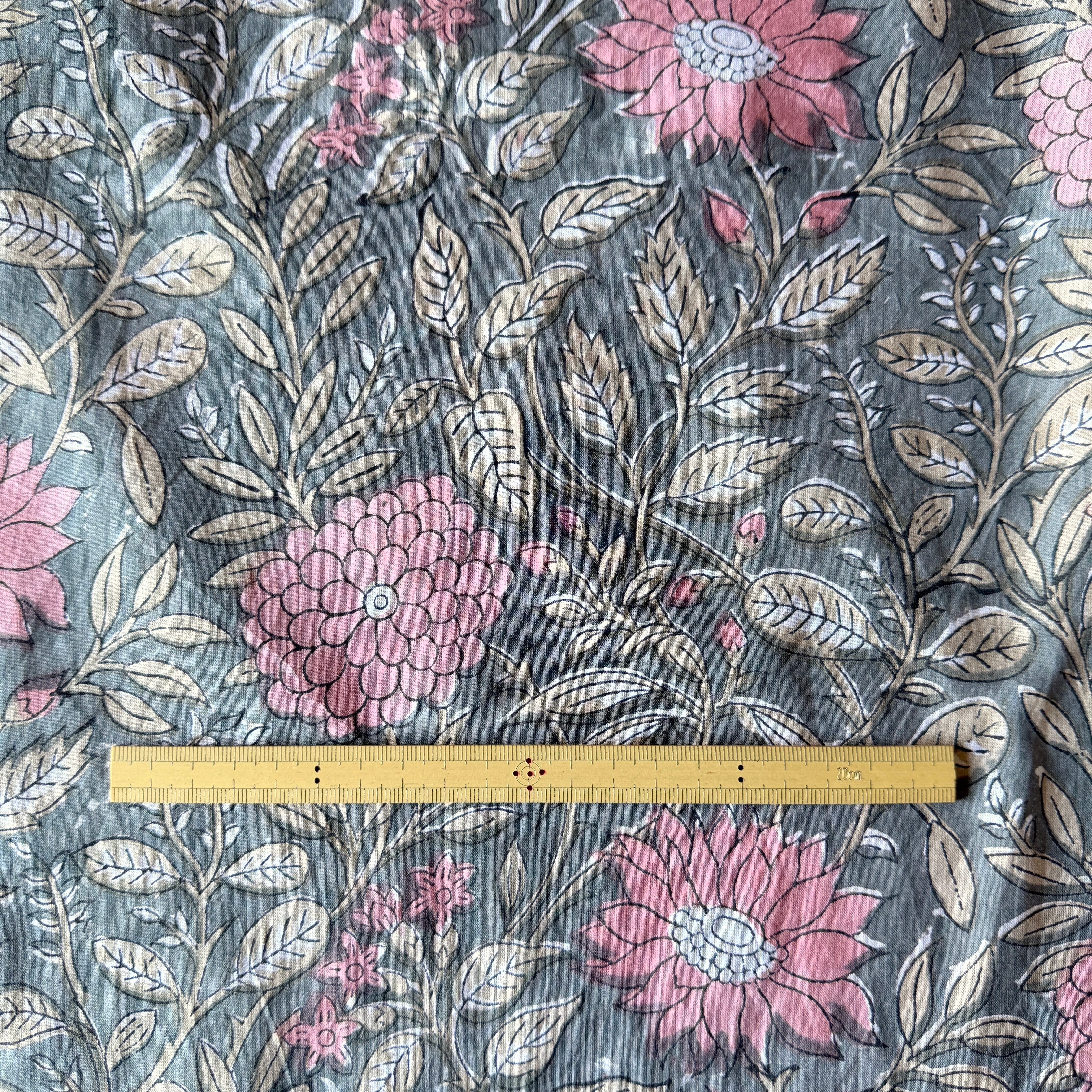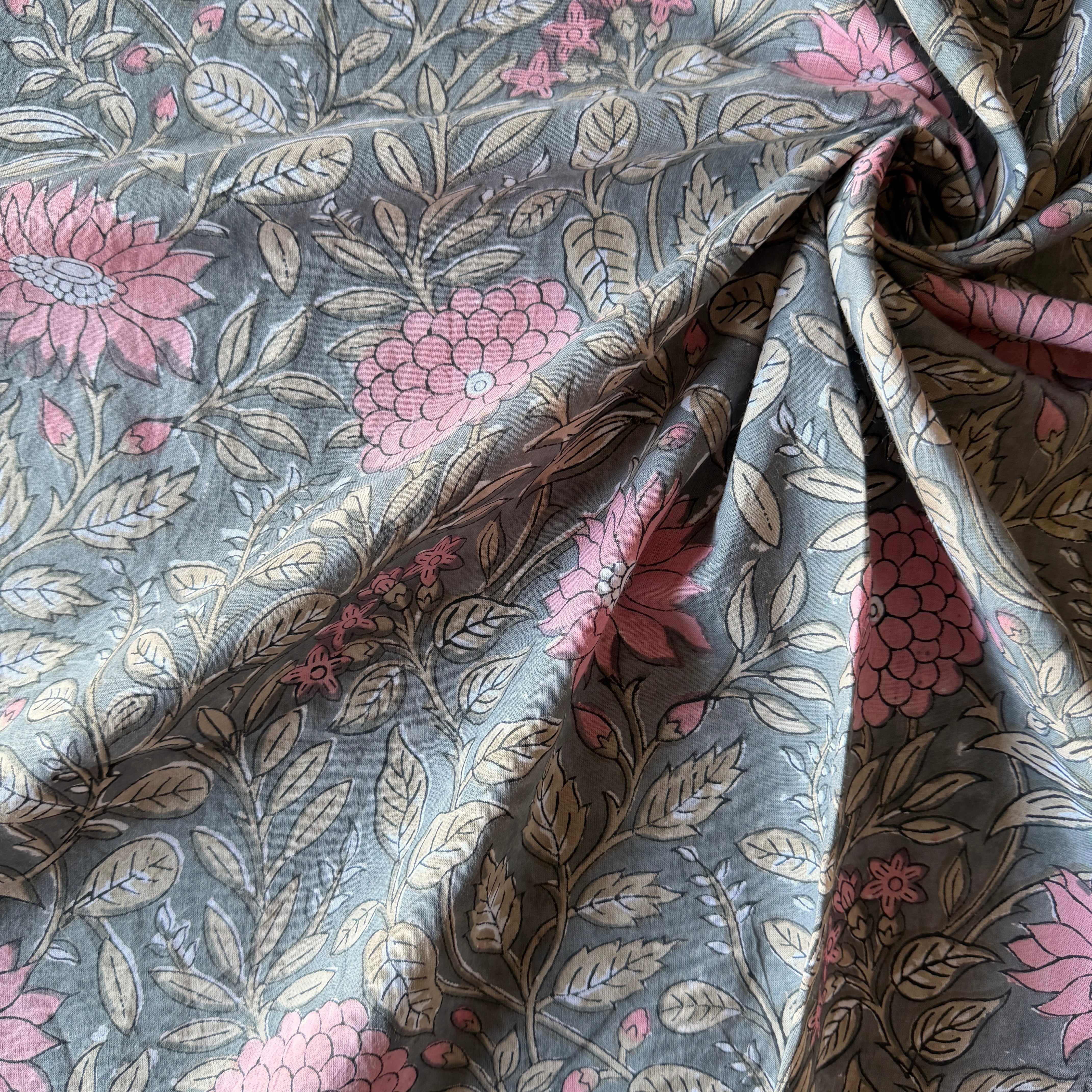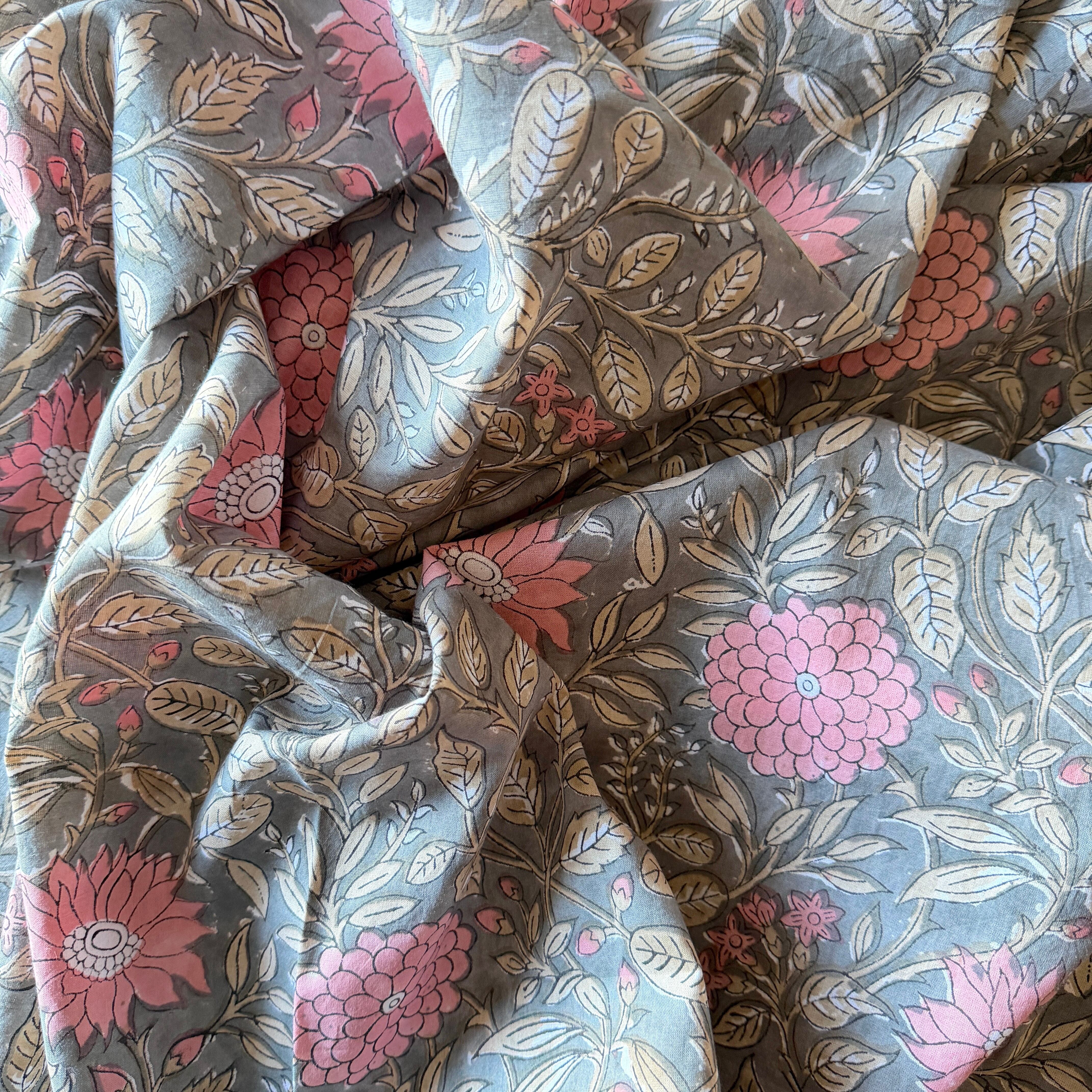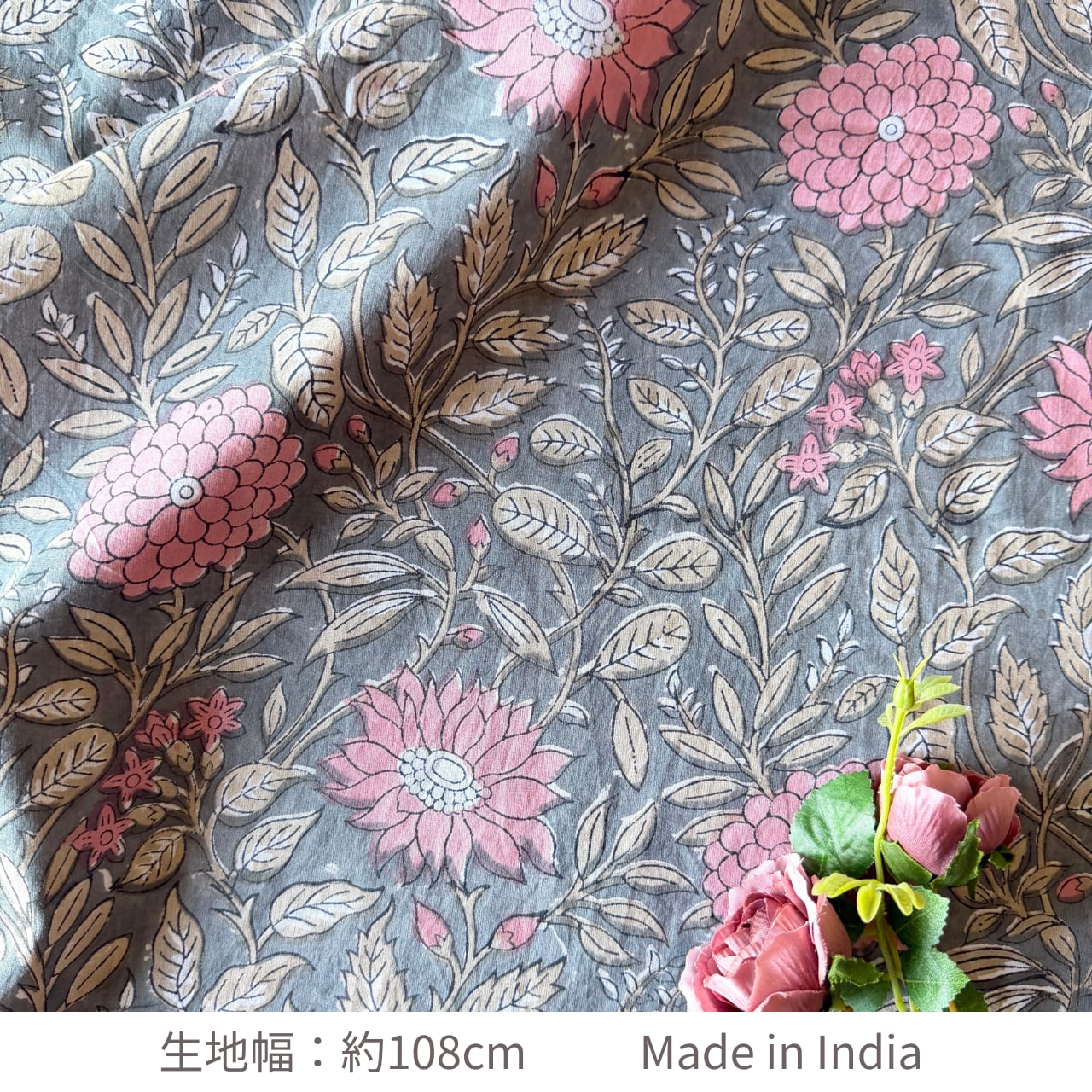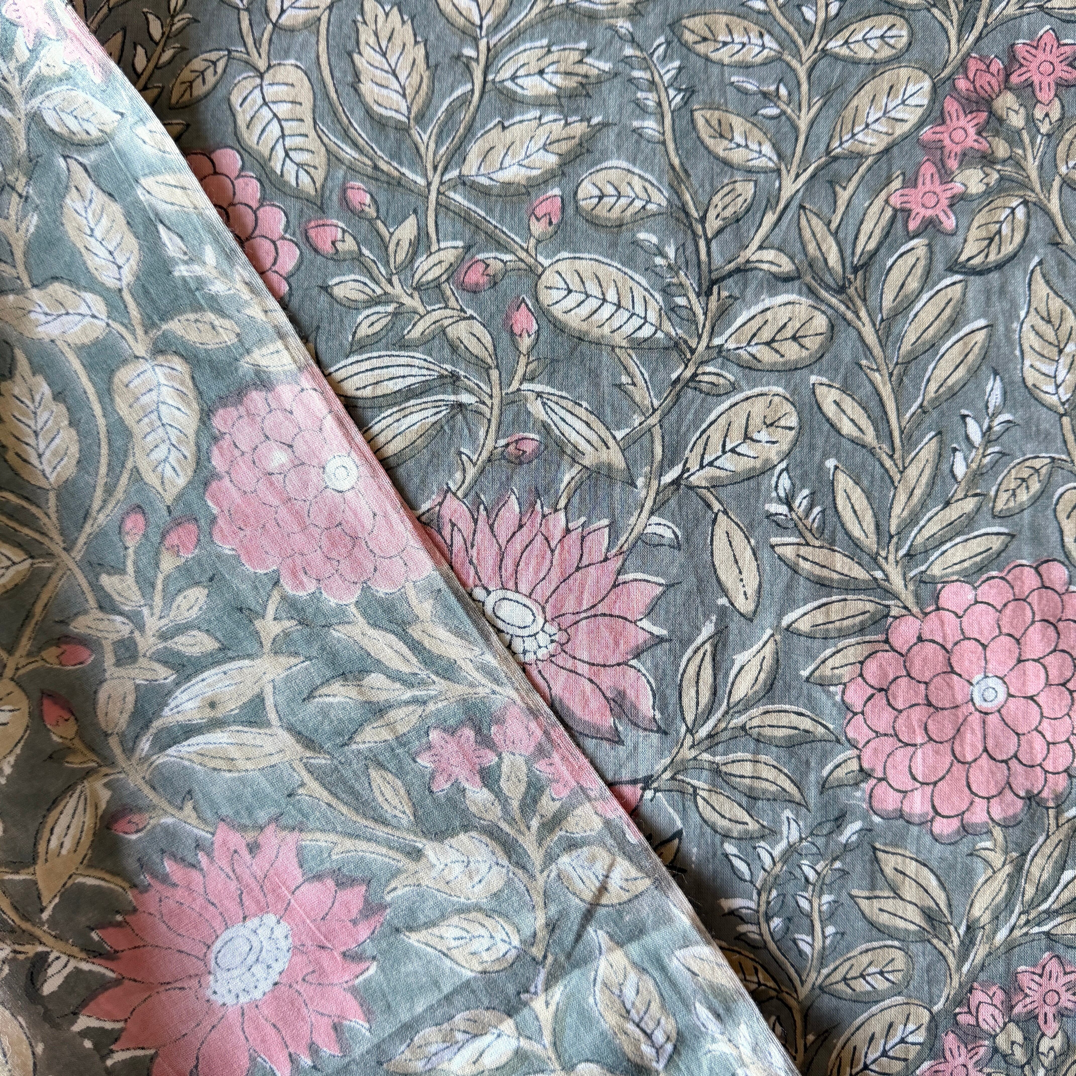 深みのあるグレーをベースに、やわらかなピンクの花々とベージュの葉が広がる、インドのブロックプリント生地が入荷しました。