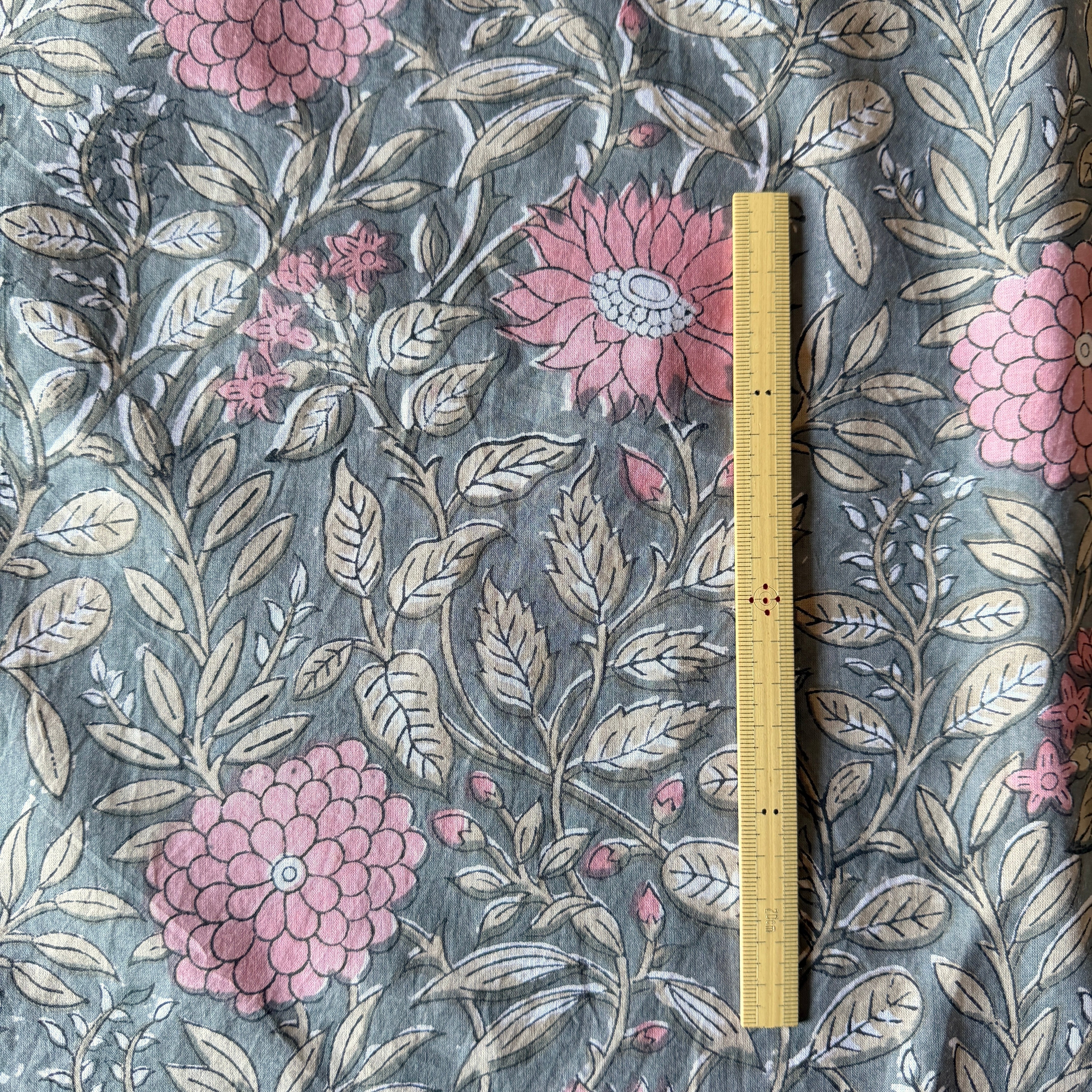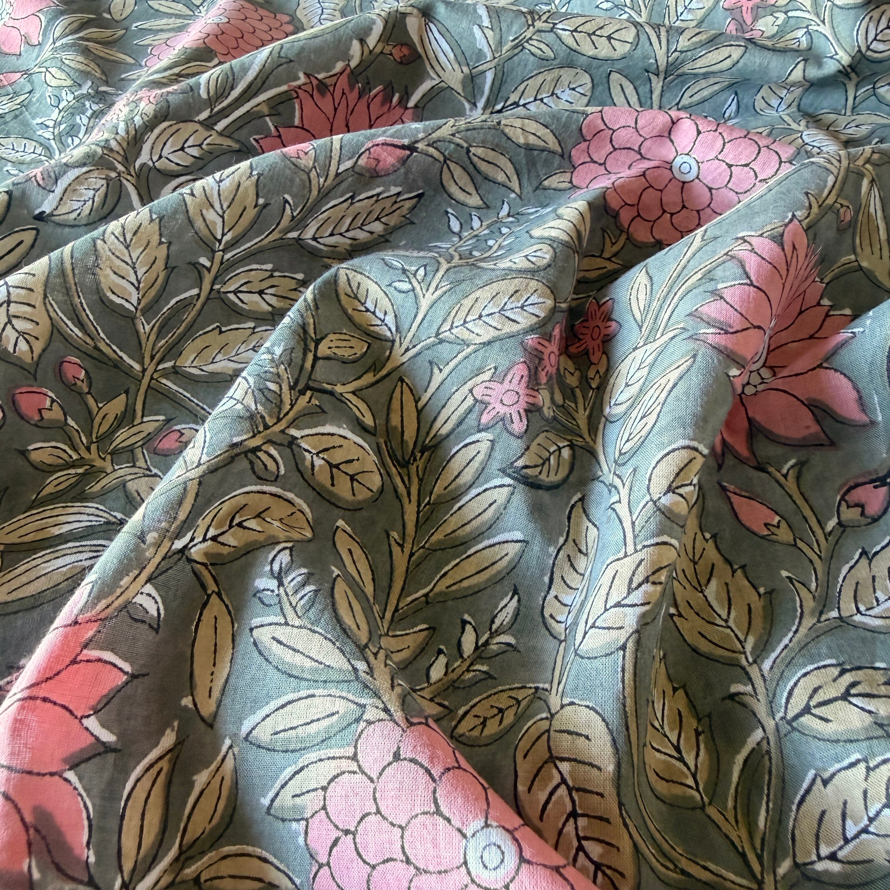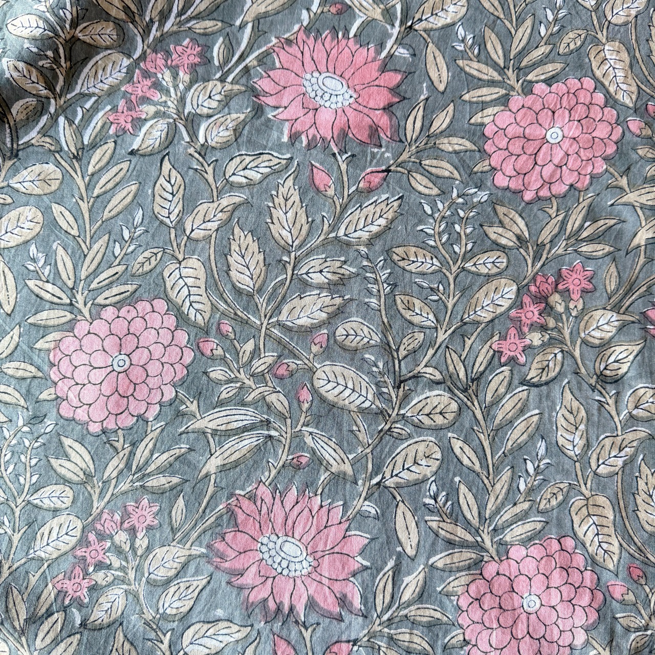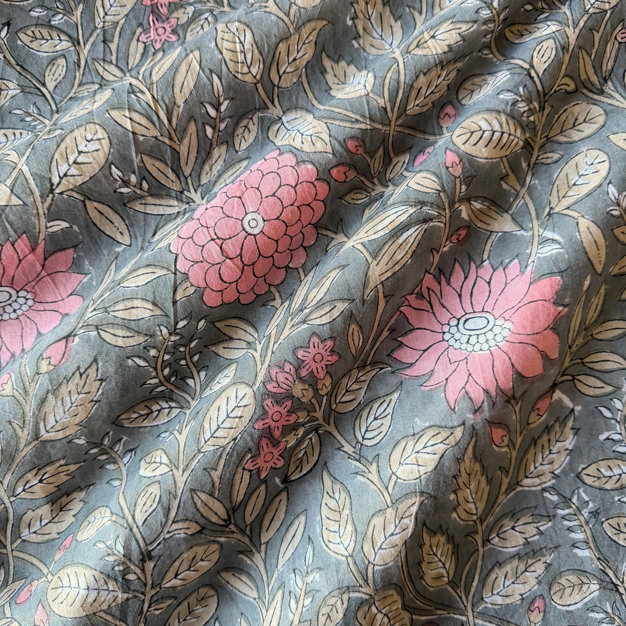深みのあるグレーをベースに、やわらかなピンクの花々とベージュの葉が広がる、インドのブロックプリント生地が入荷しました。