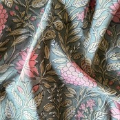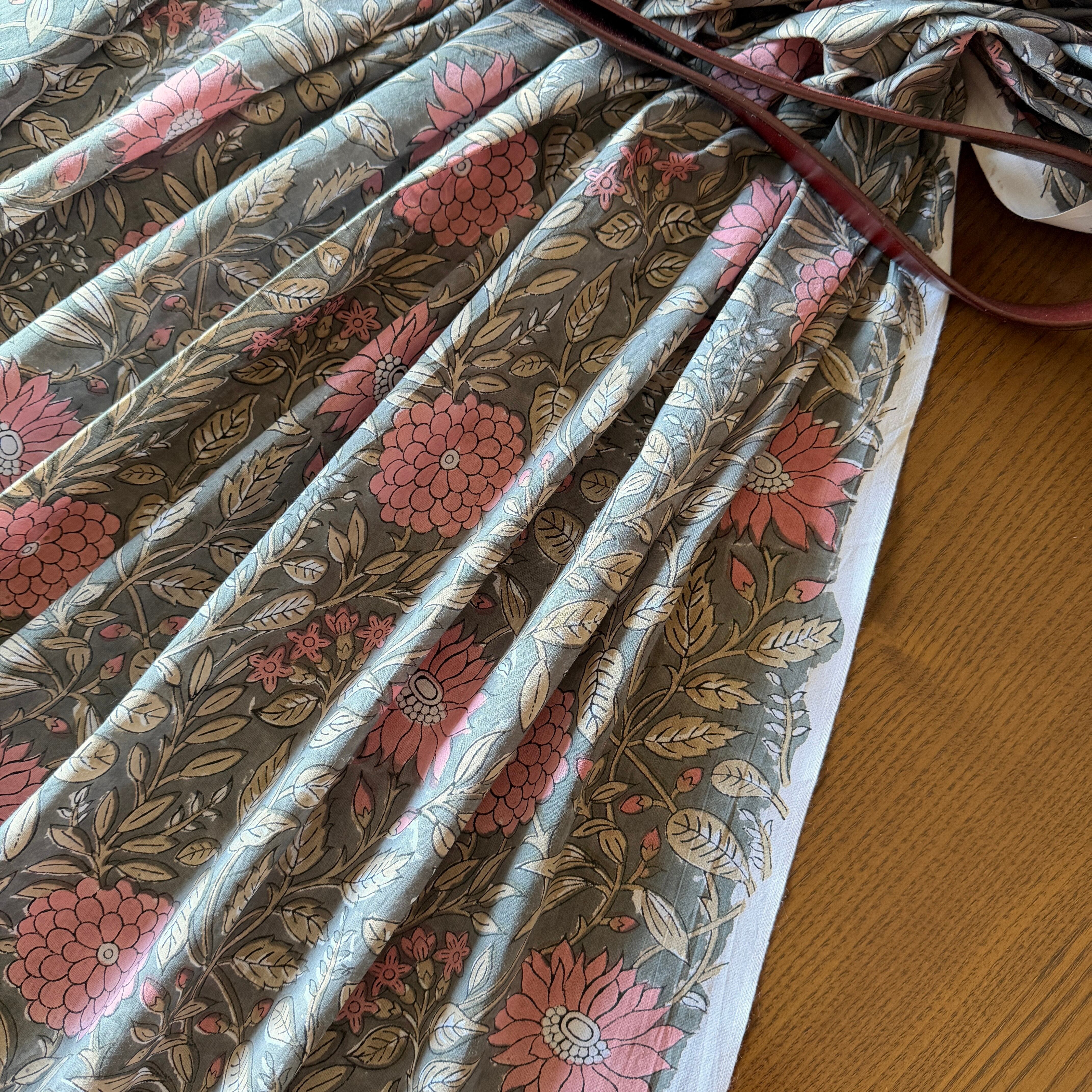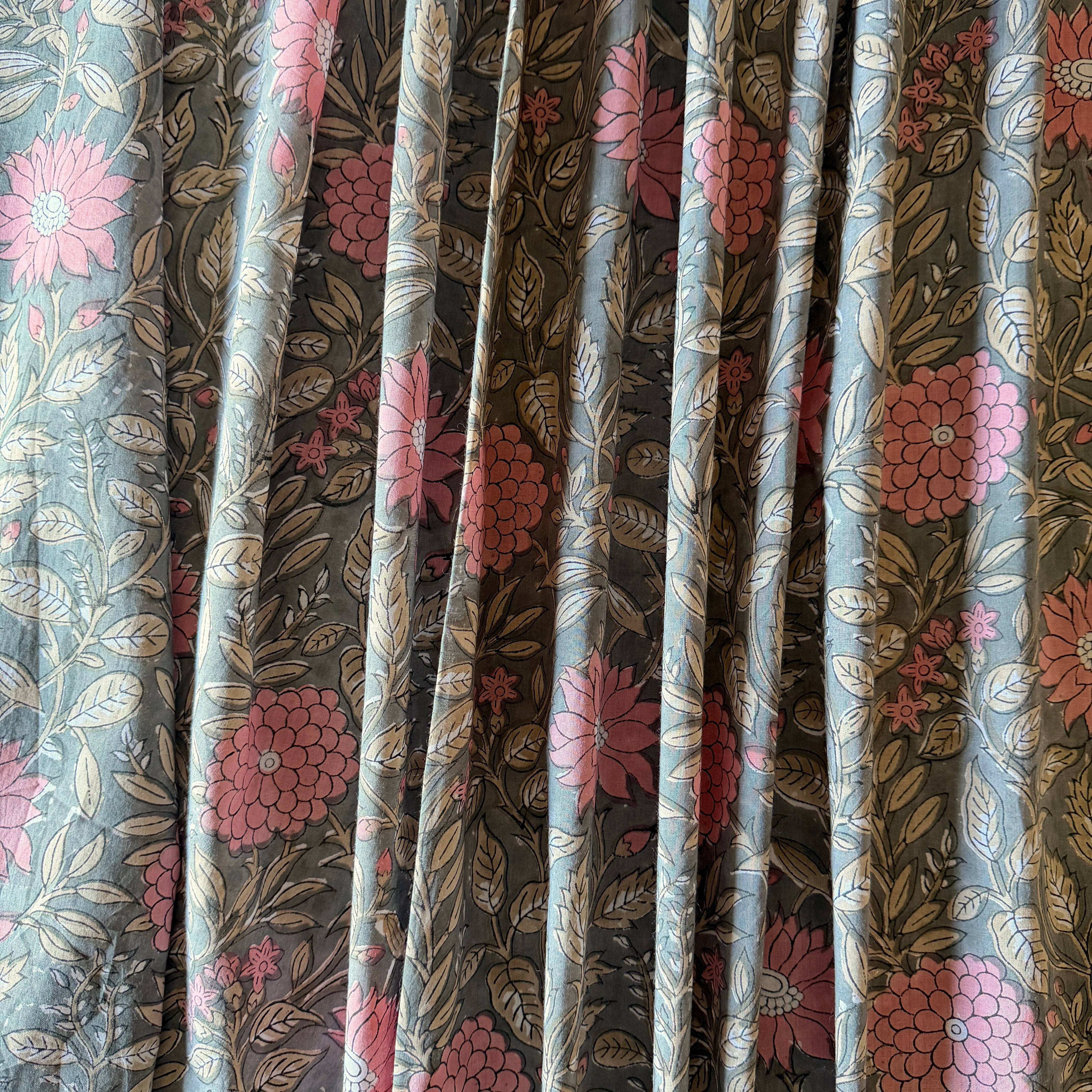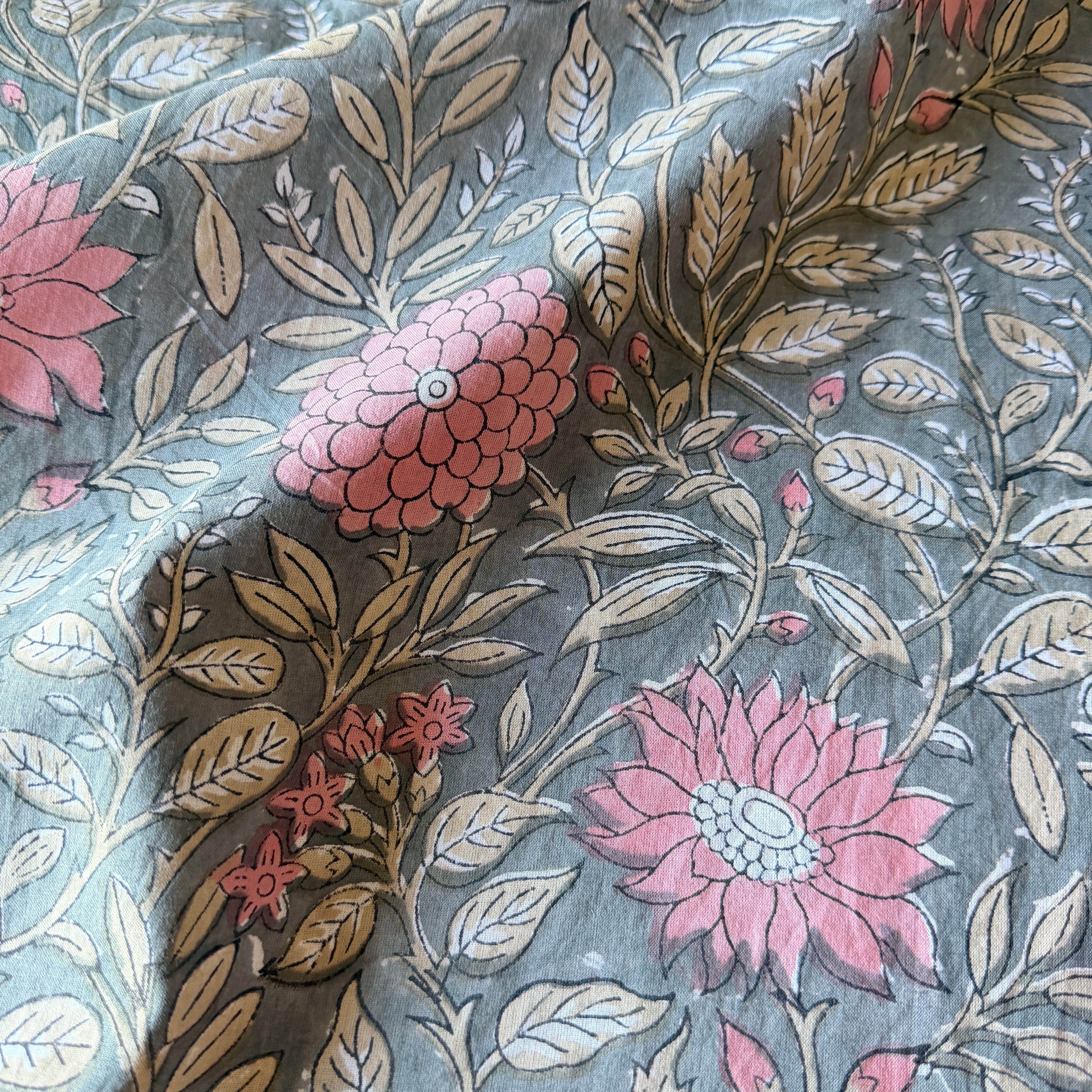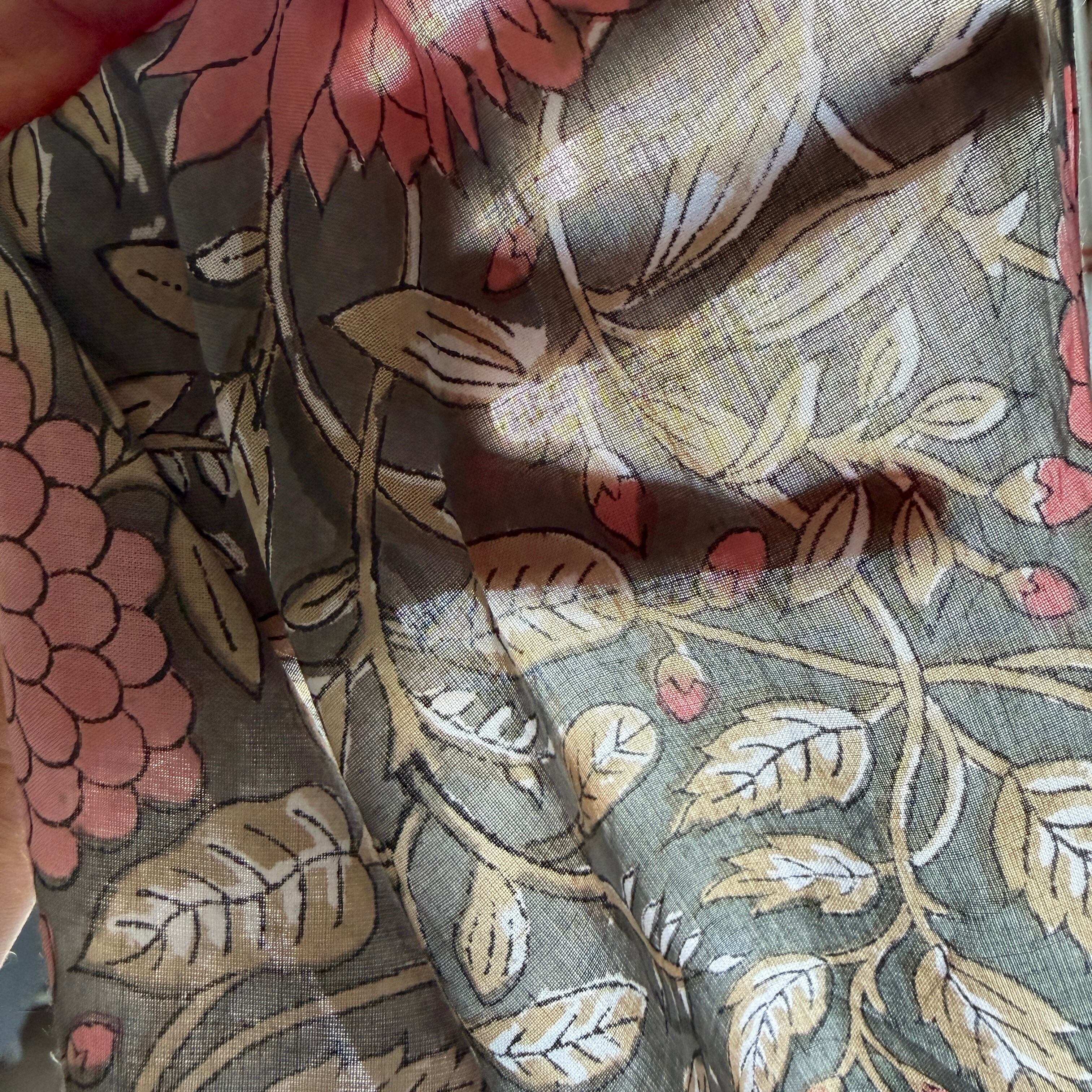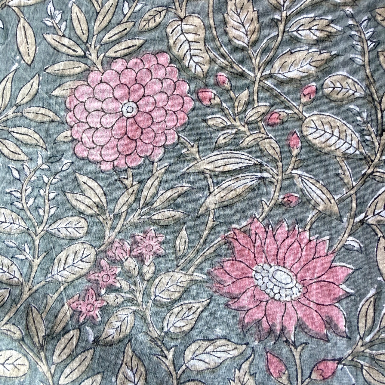 深みのあるグレーをベースに、やわらかなピンクの花々とベージュの葉が広がる、インドのブロックプリント生地が入荷しました。