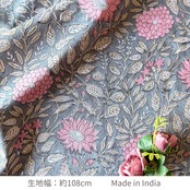 ハンドブロックプリント生地 インド更紗 綿生地 グレーベース×ピンクボタニカル柄 薄手コットン GP-26015-sa