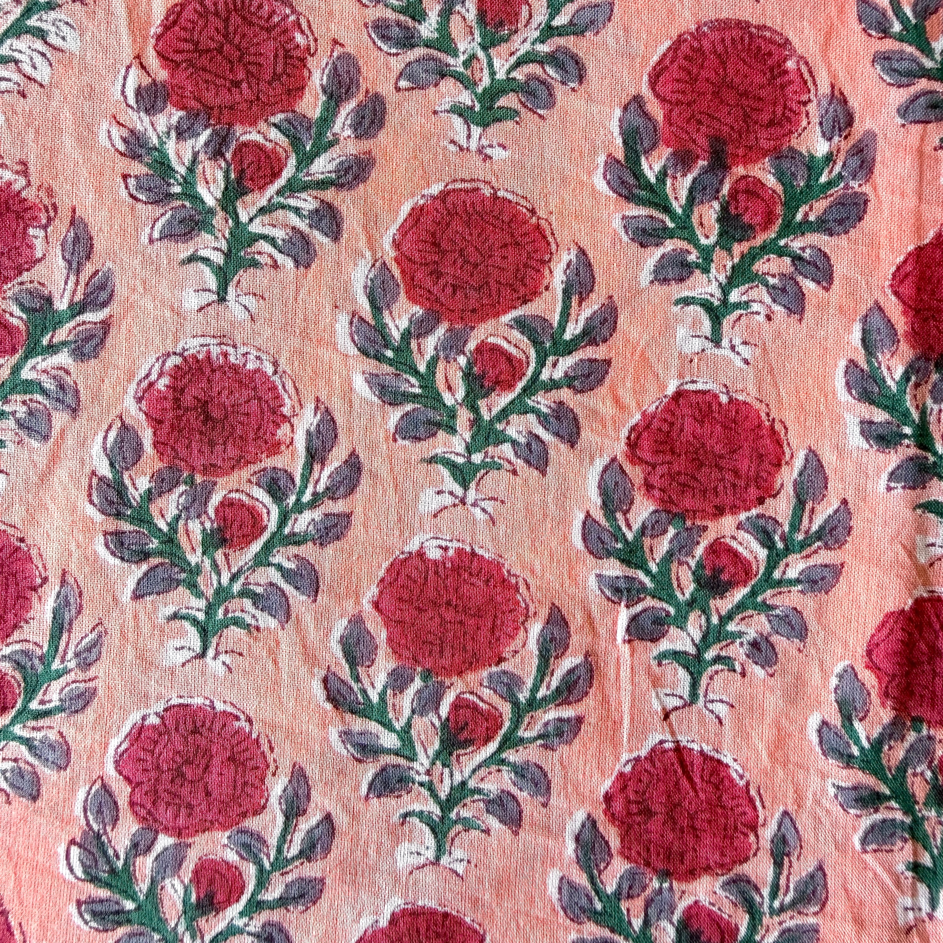 やさしいピーチピンクをベースに、赤いふんわりとした花モチーフが美しく描かれた、上品なブロックプリント生地です。