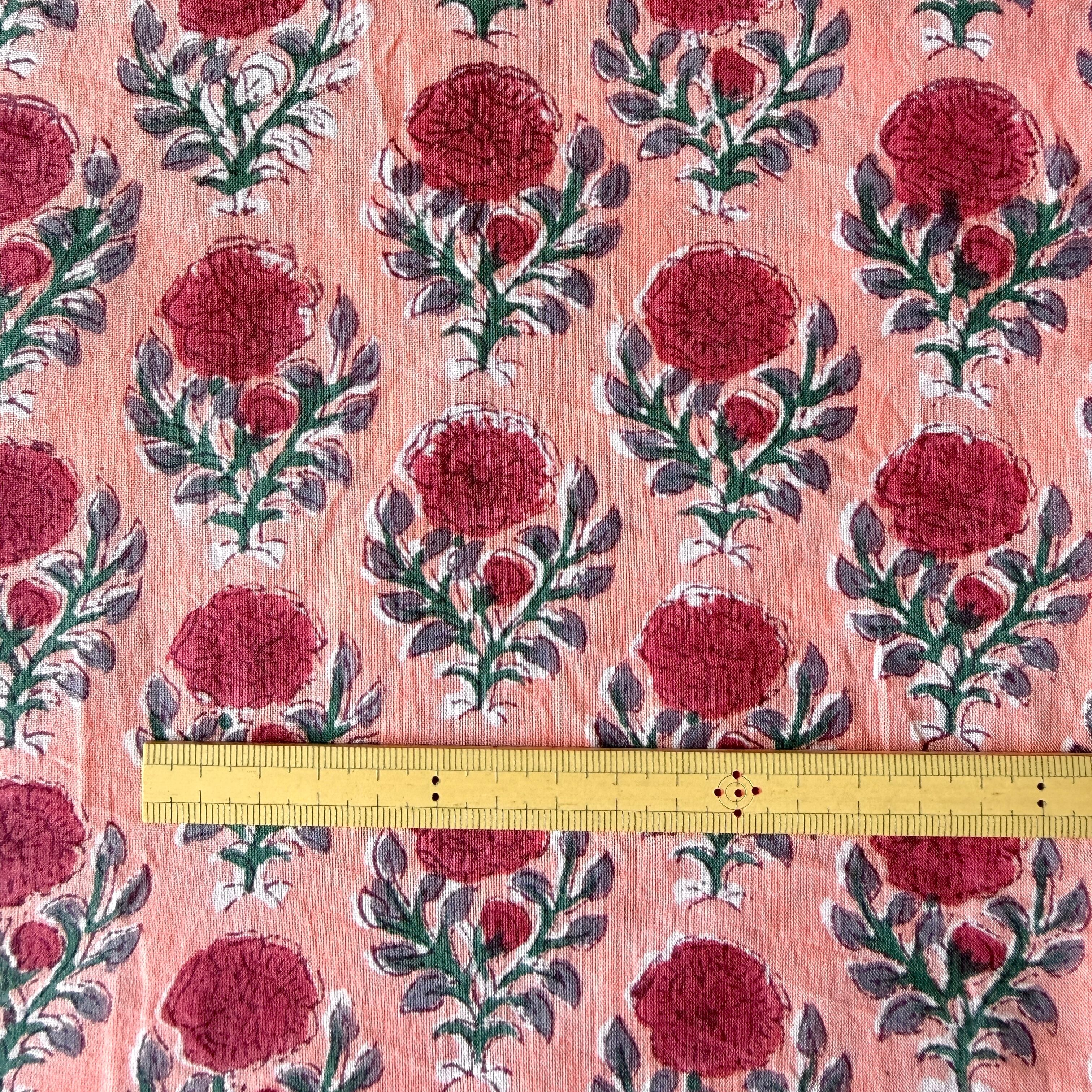 ハンドブロックプリント生地 インド更紗 綿生地 ピーチピンクベース×赤 花柄 薄手コットン JE-260224-sa