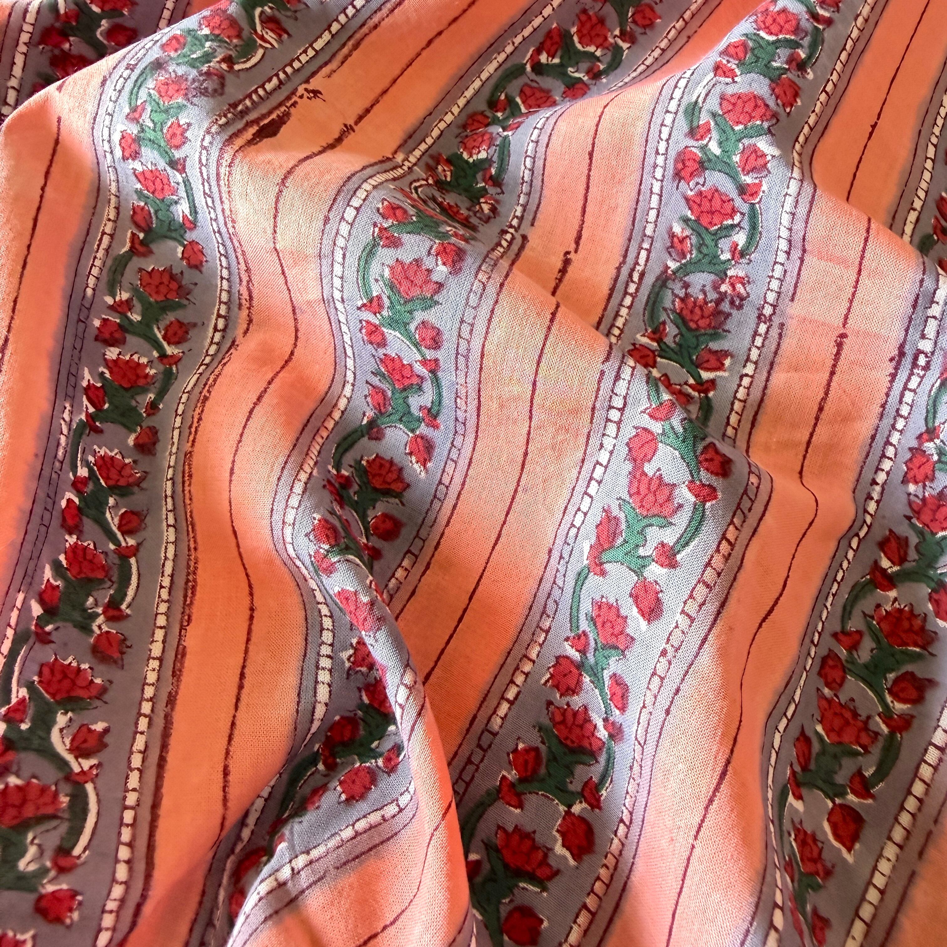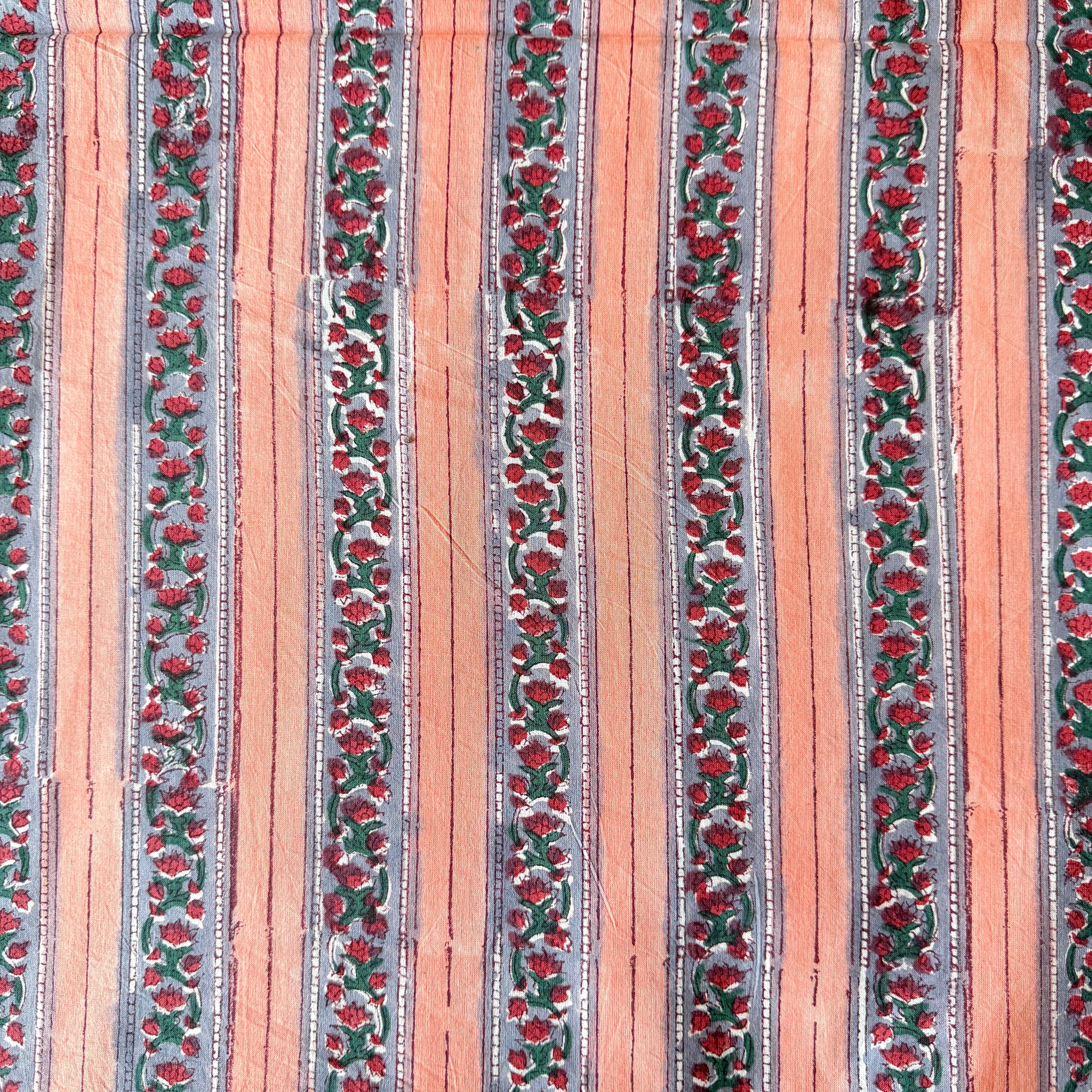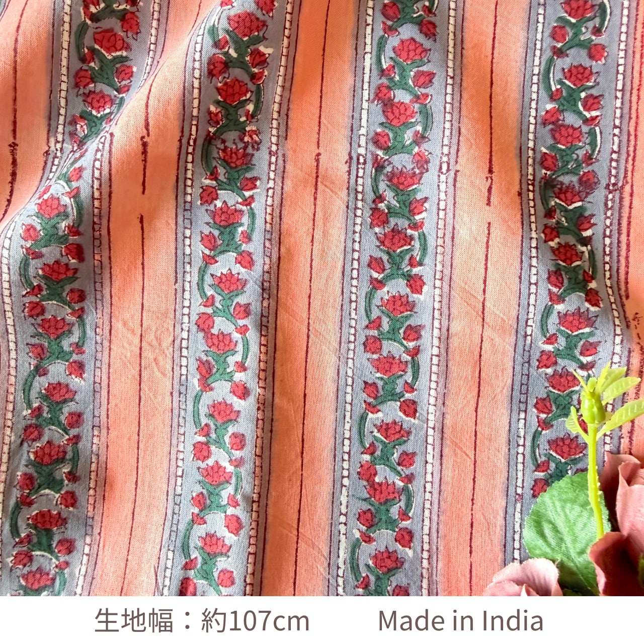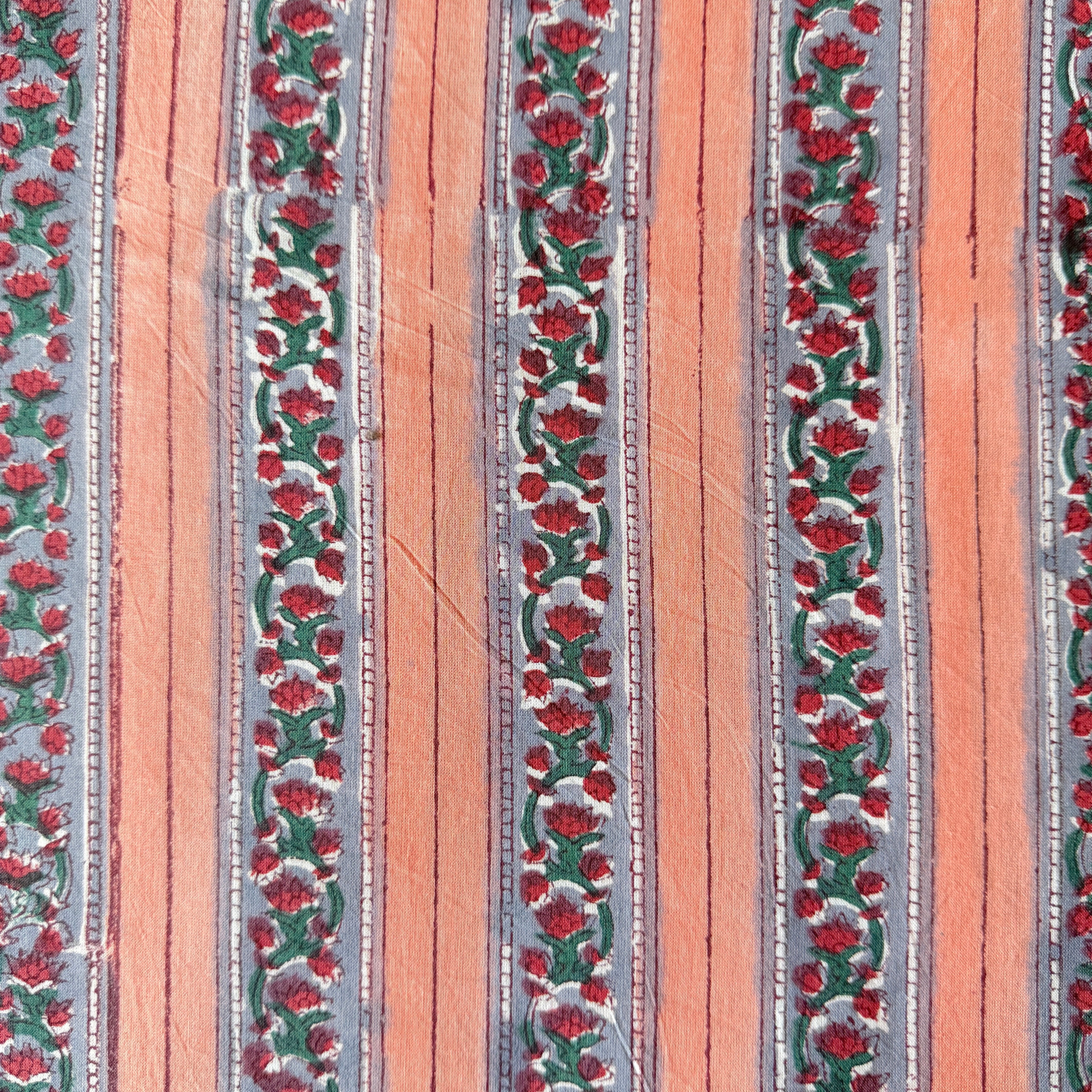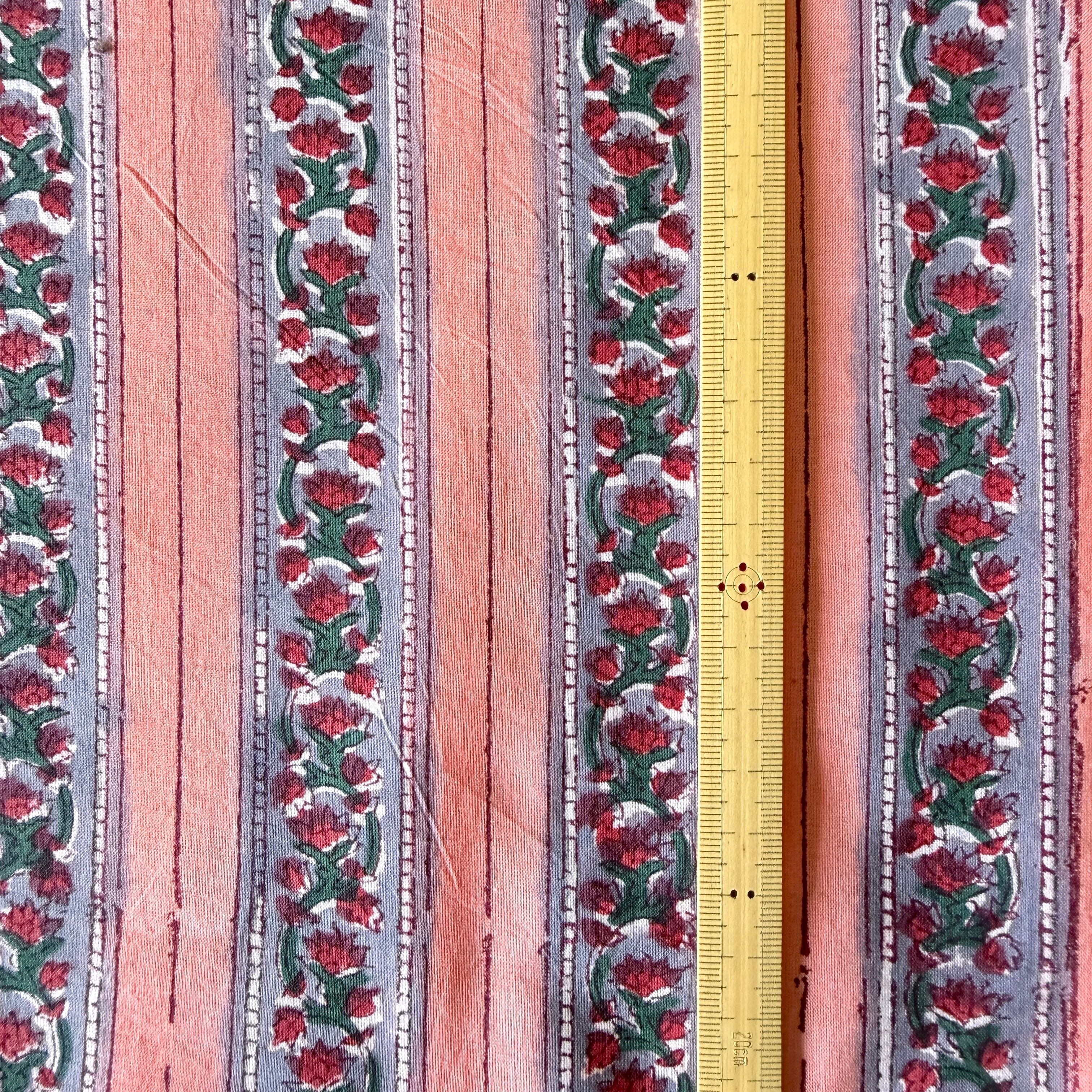 ハンドブロックプリント生地 インド更紗 綿生地 ピーチピンク×グレー 小花ストライプ 薄手コットン JE-260225-sa