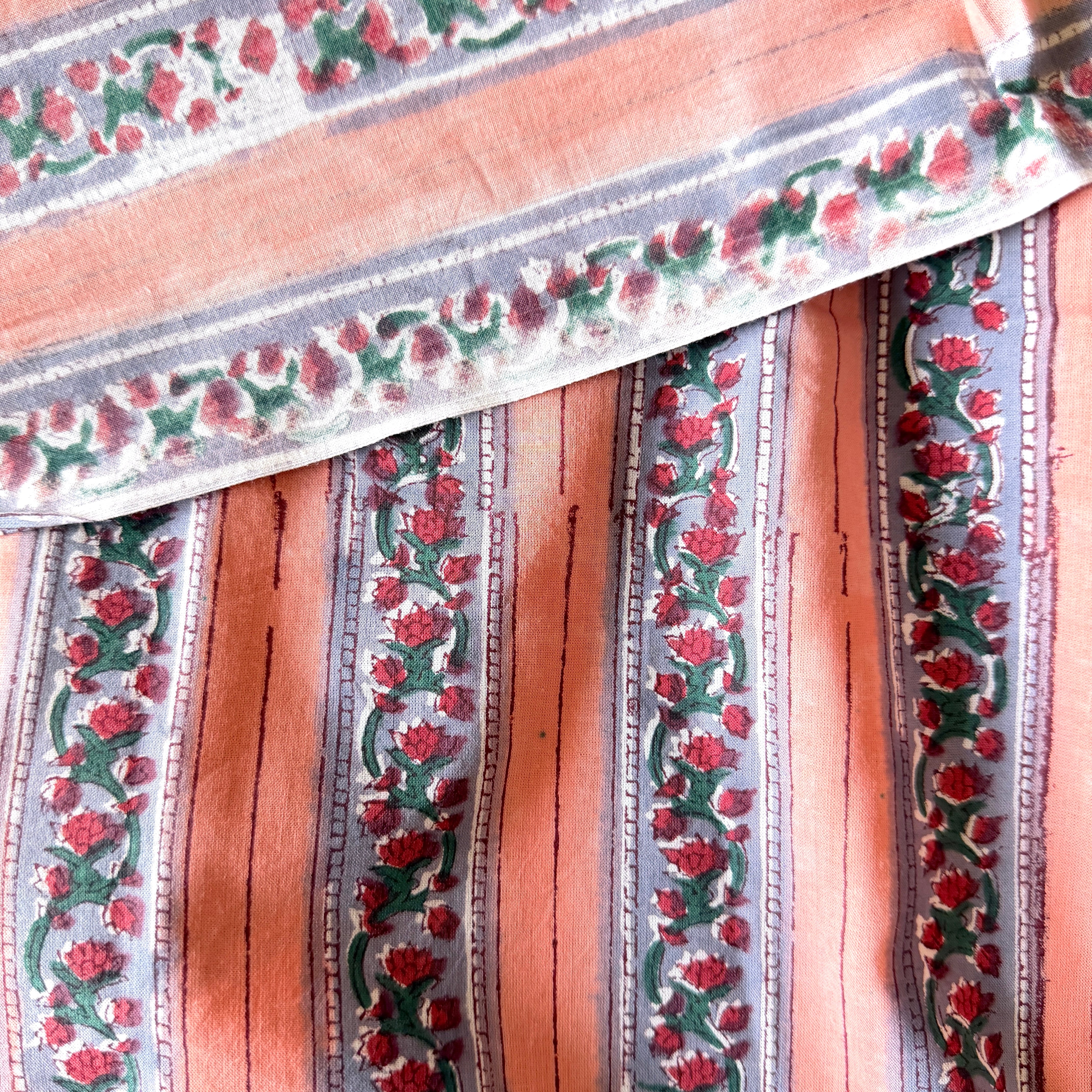 ・ハンドブロックプリント特有のにじみやズレ、かすれや色ムラが見られることがあります。手仕事ならではの表情としてお楽しみいただけますと幸いです。