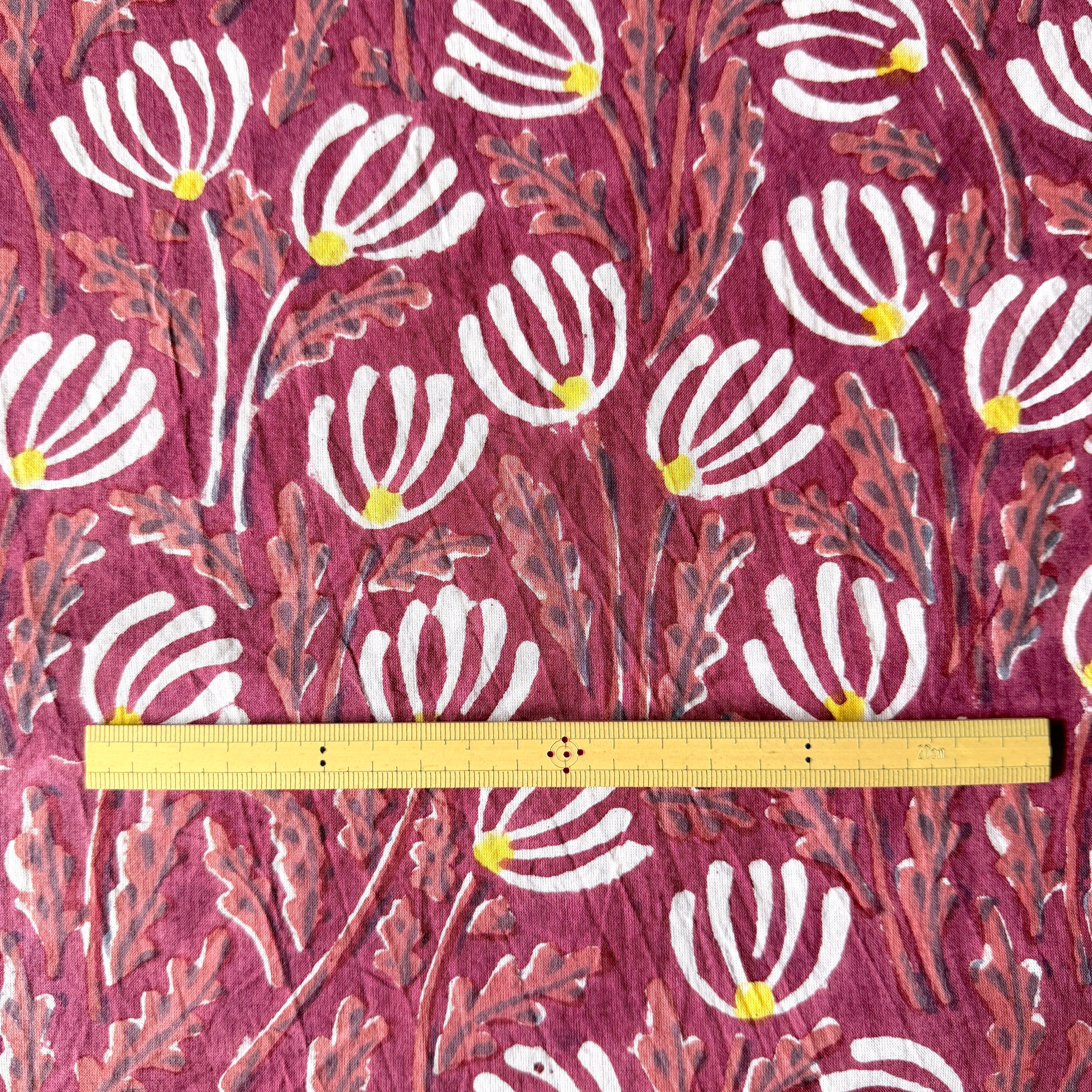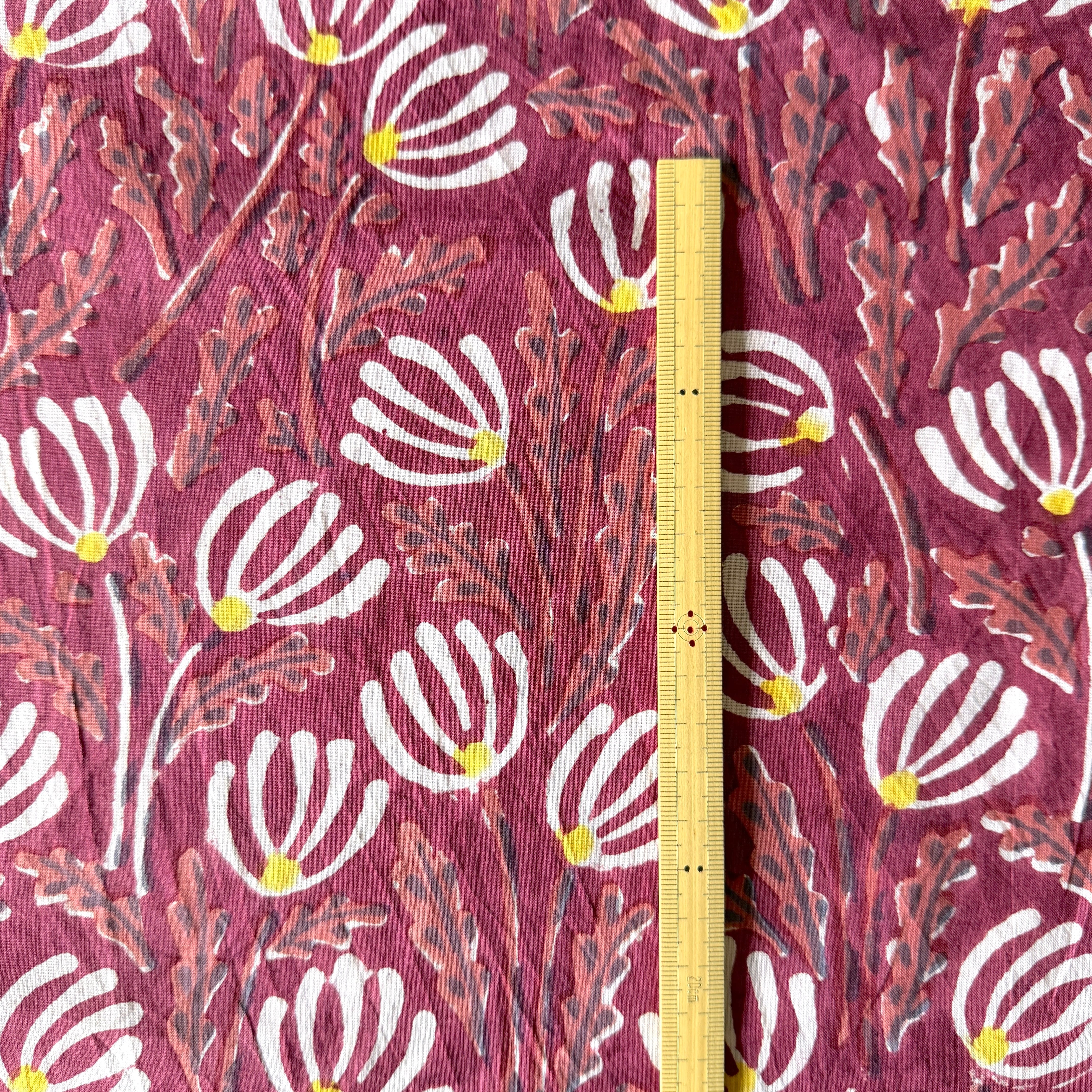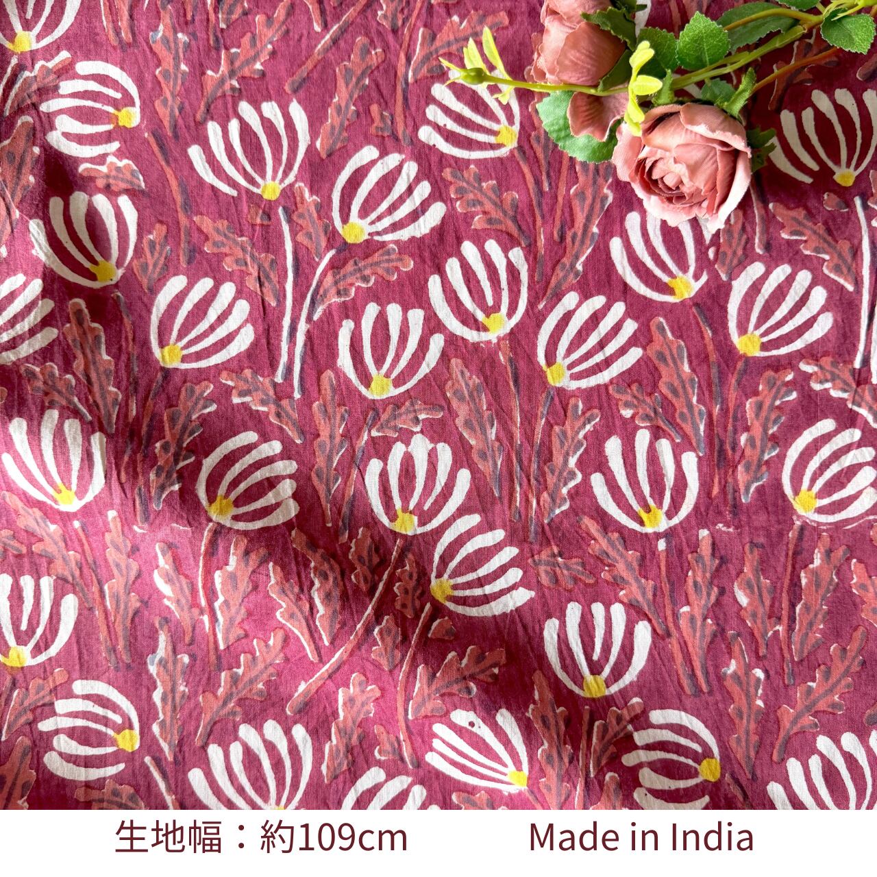 ボルドーピンクのような華やかな色合いをベースに、白いフラワーモチーフがリズムよく並ぶ、インドのハンドブロックプリント生地です。