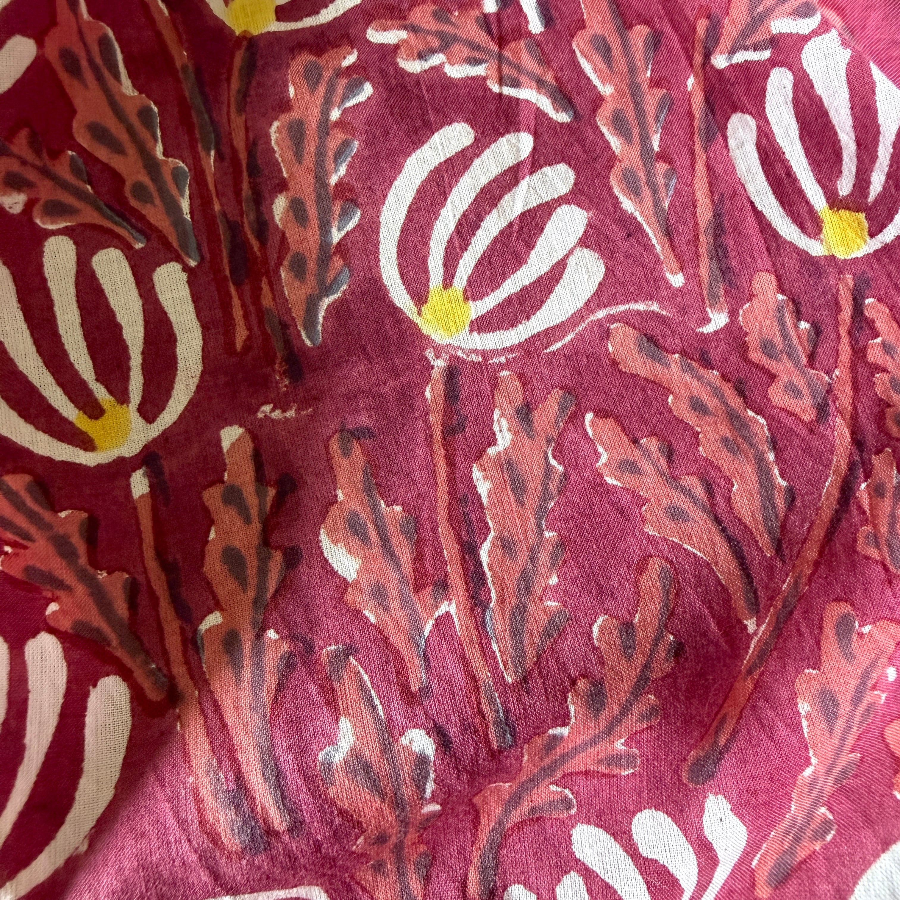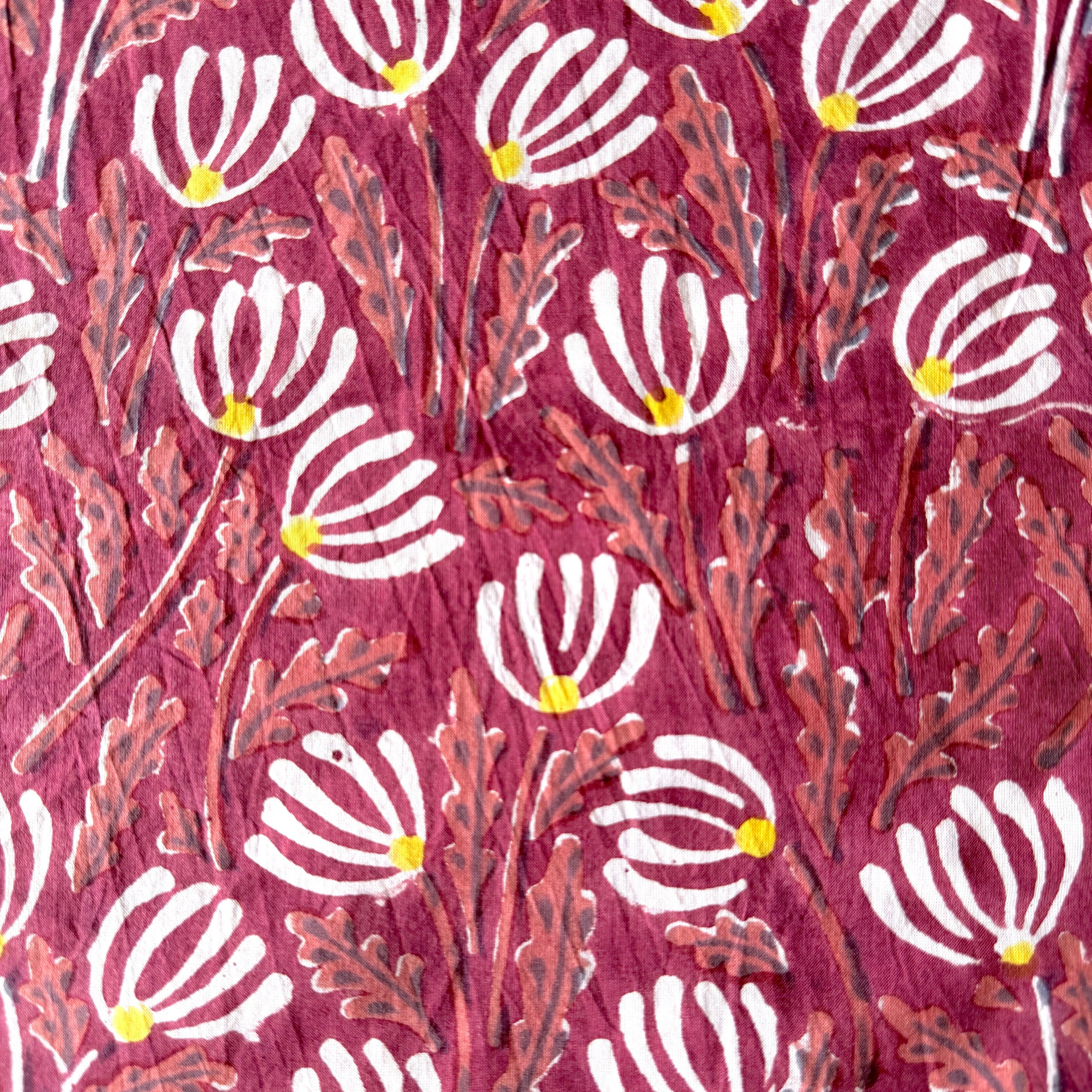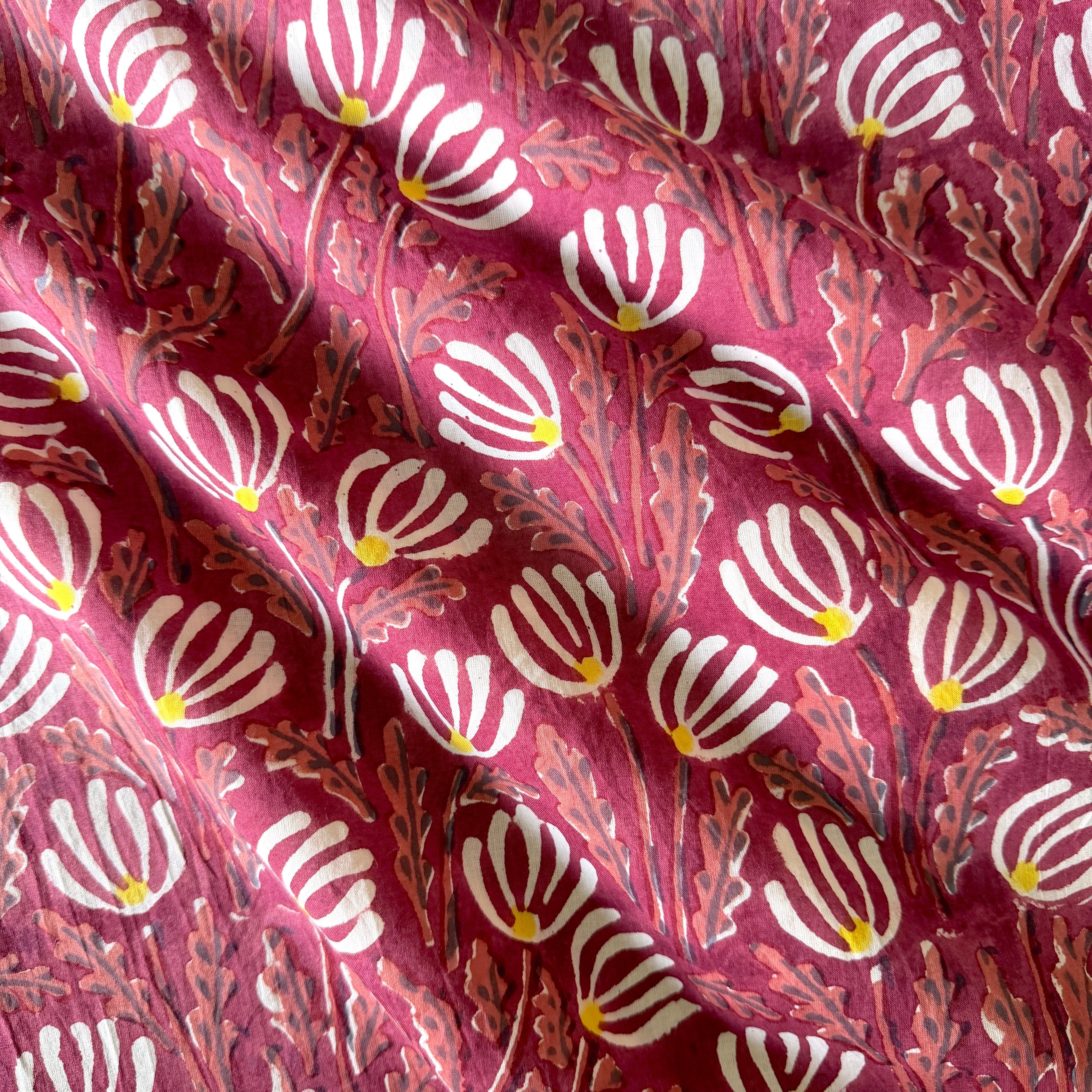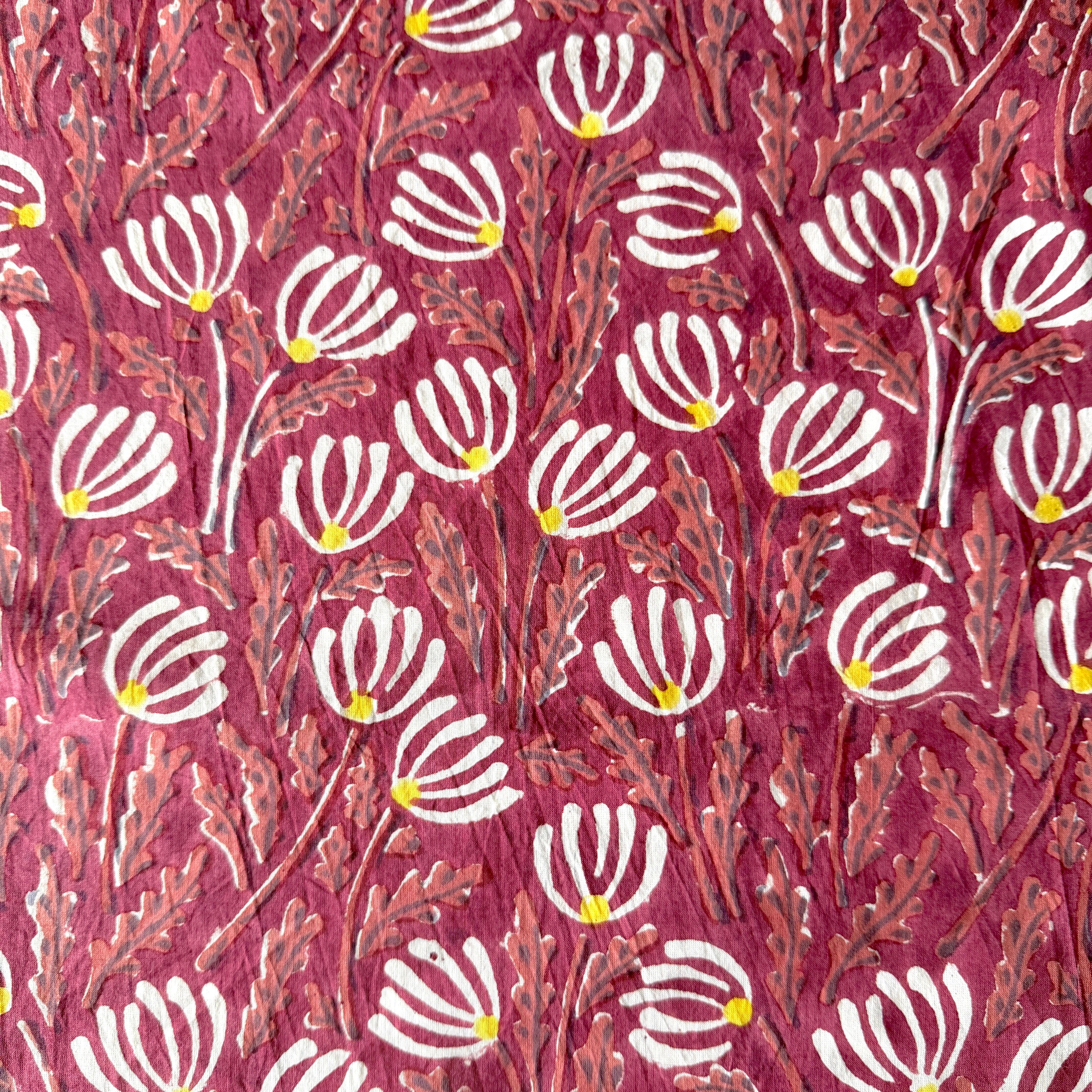 ボルドーピンクのような華やかな色合いをベースに、白いフラワーモチーフがリズムよく並ぶ、インドのハンドブロックプリント生地です。