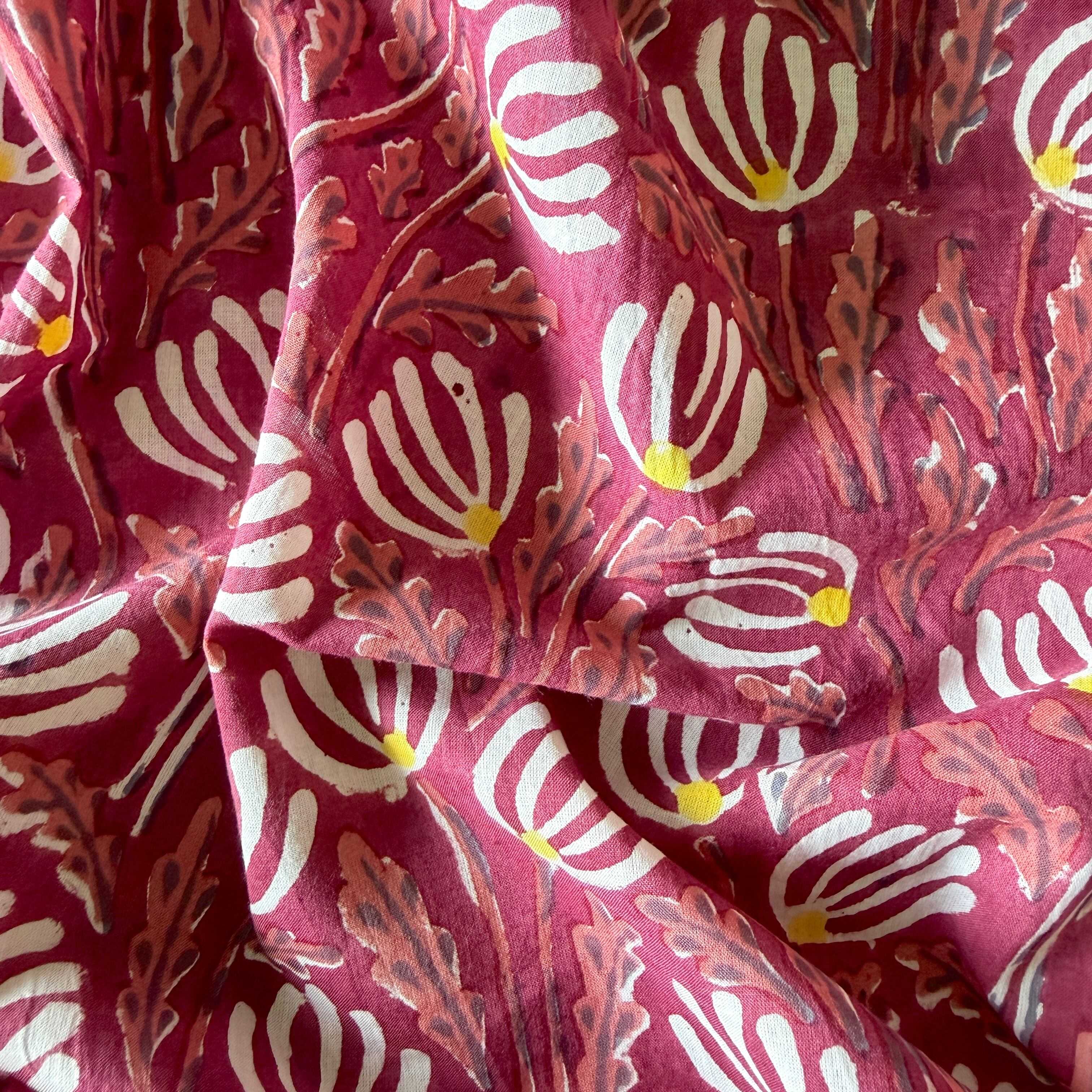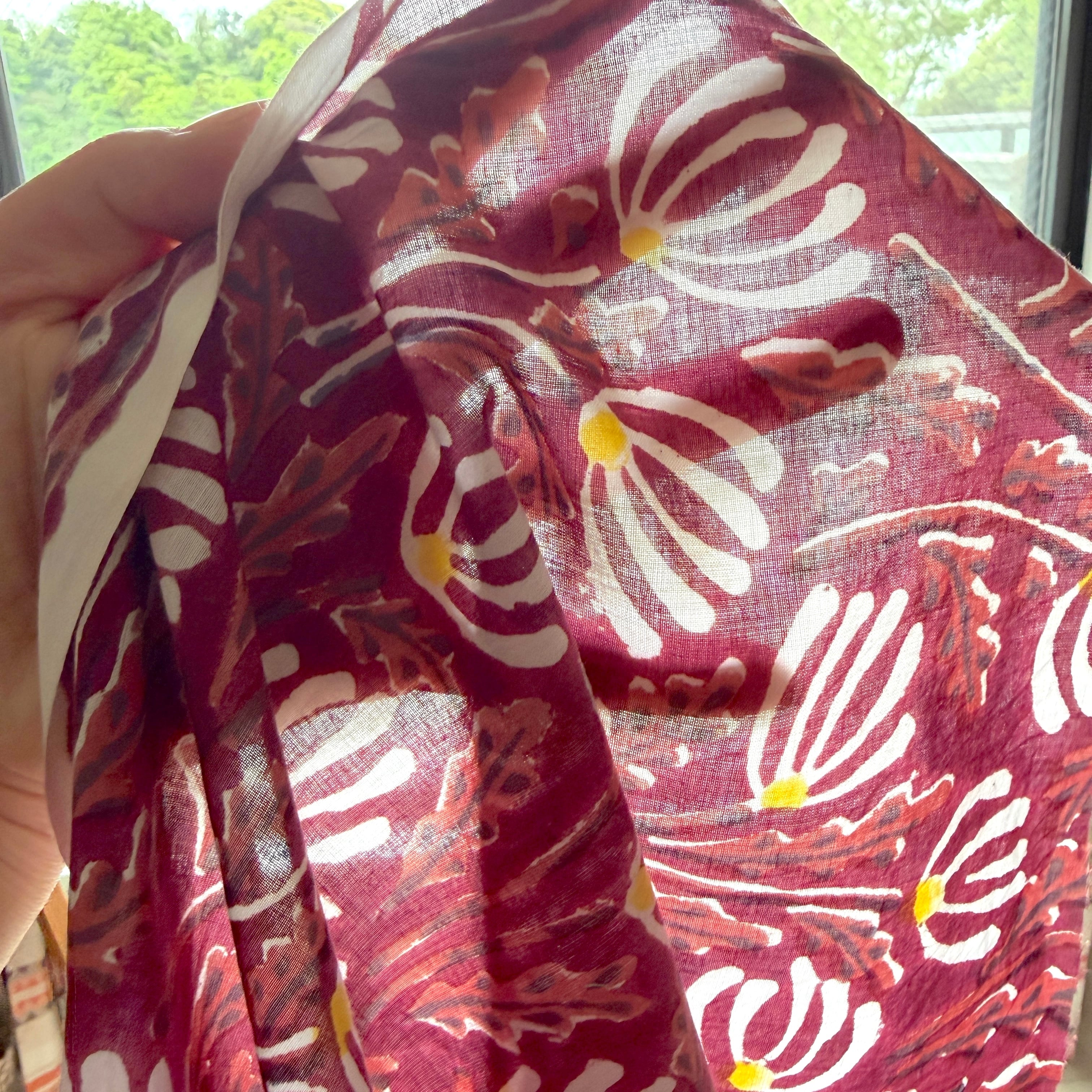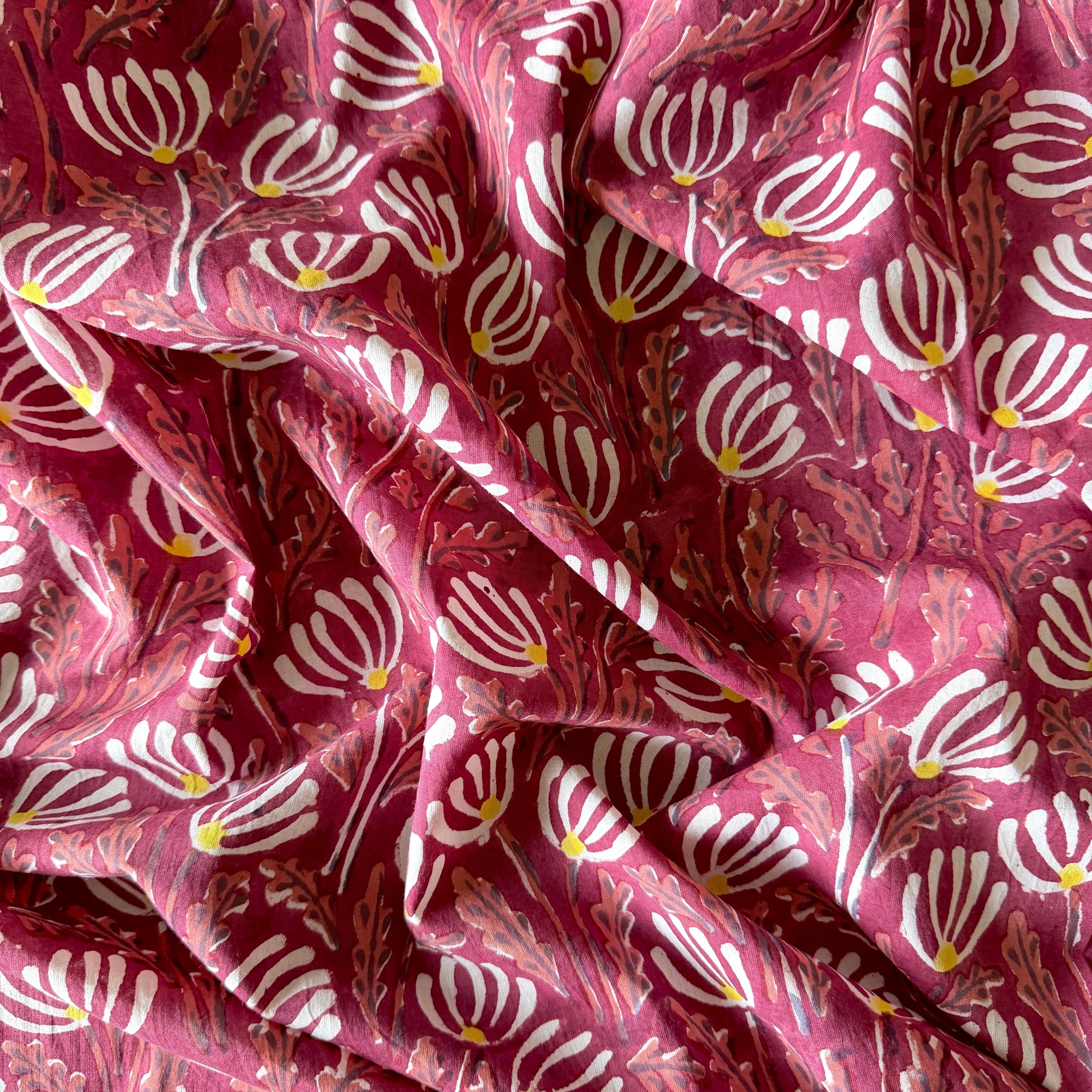 ハンドブロックプリント生地 インド更紗 綿生地 ボルドーピンク×ホワイトフラワー 薄手コットン JE-260222-sa