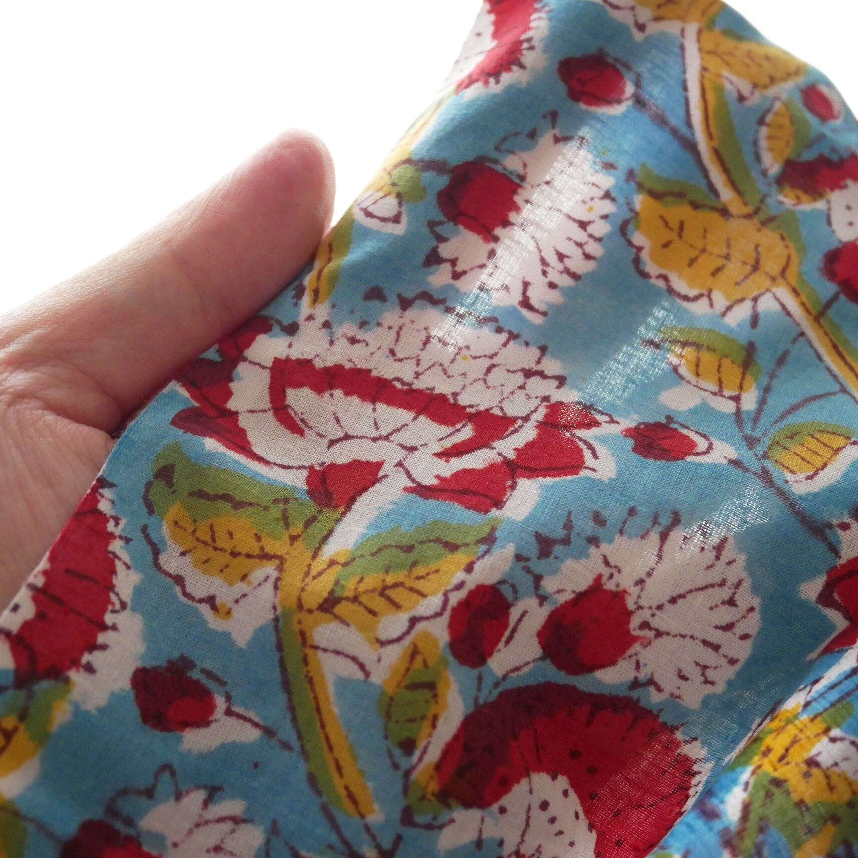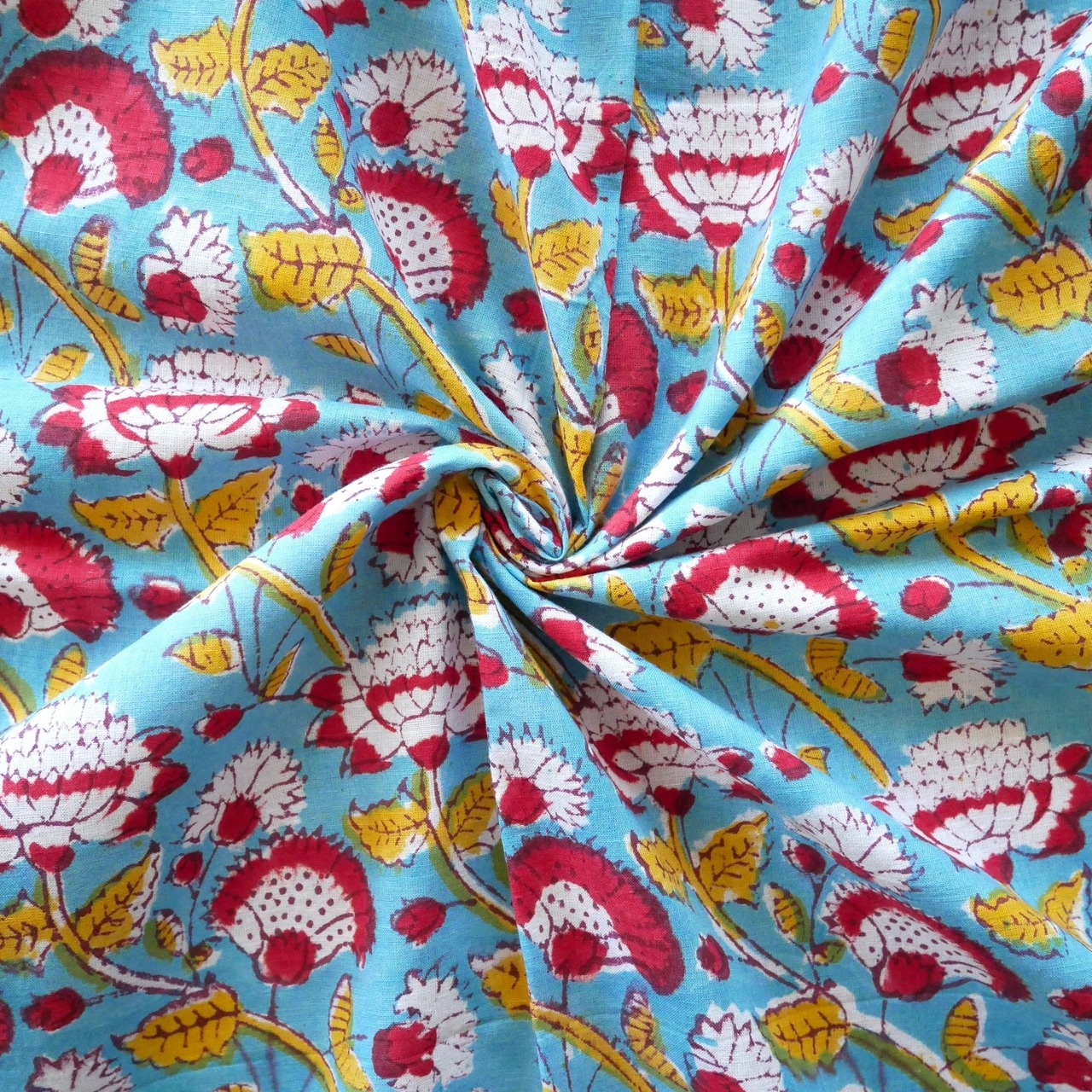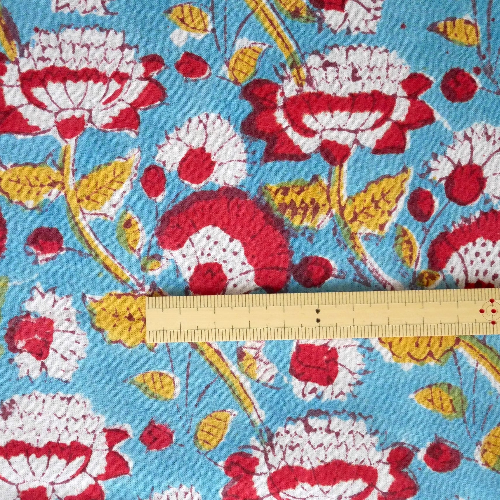 こちらのブロックプリント生地は、鮮やかな水色を背景に、レッドとイエローで描かれた力強いボタニカル柄が印象的なデザインです。